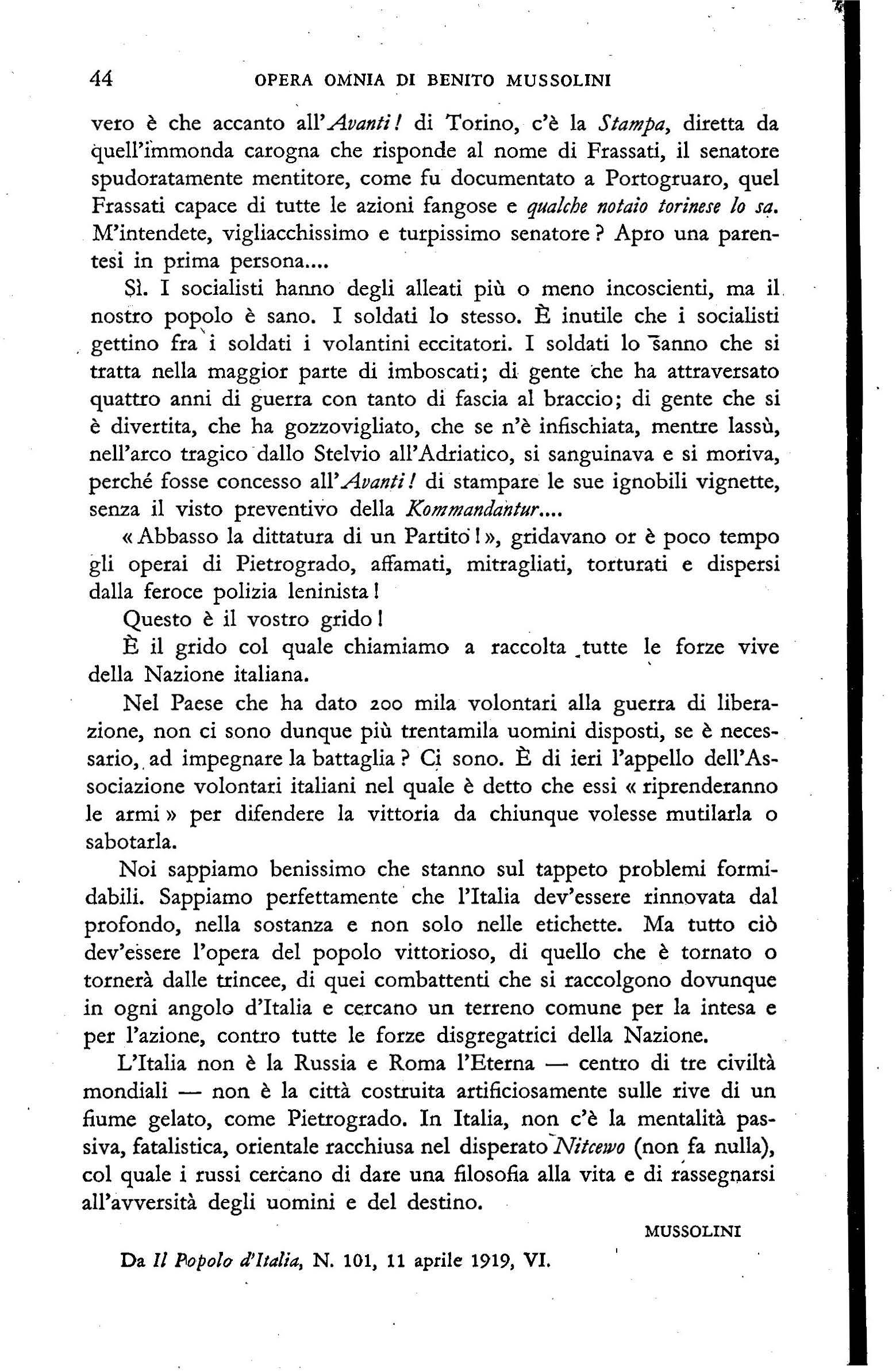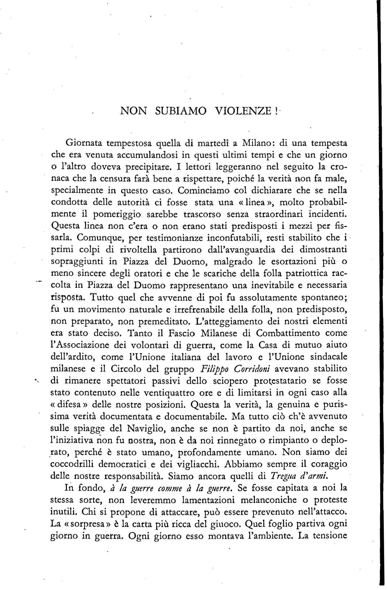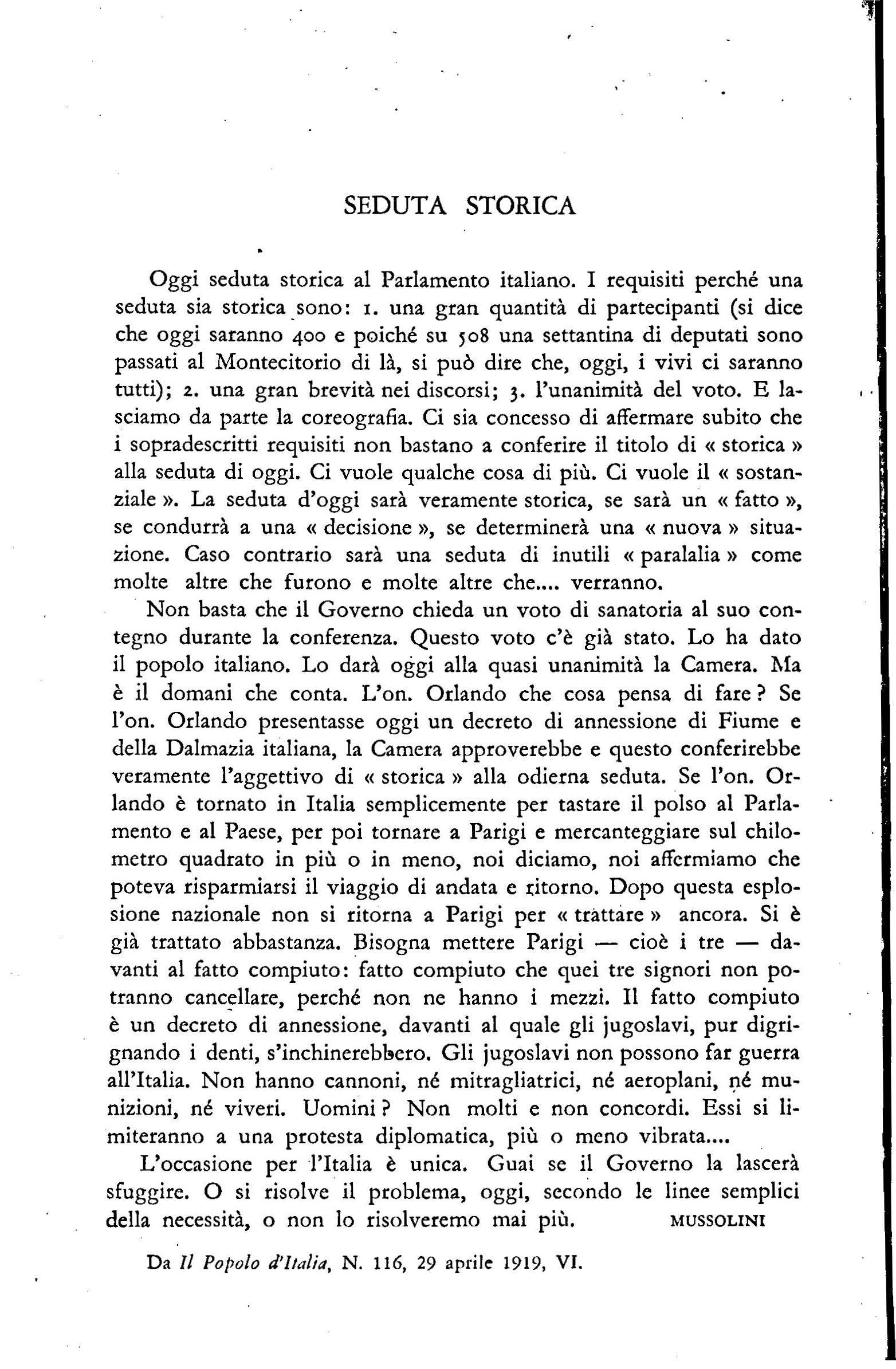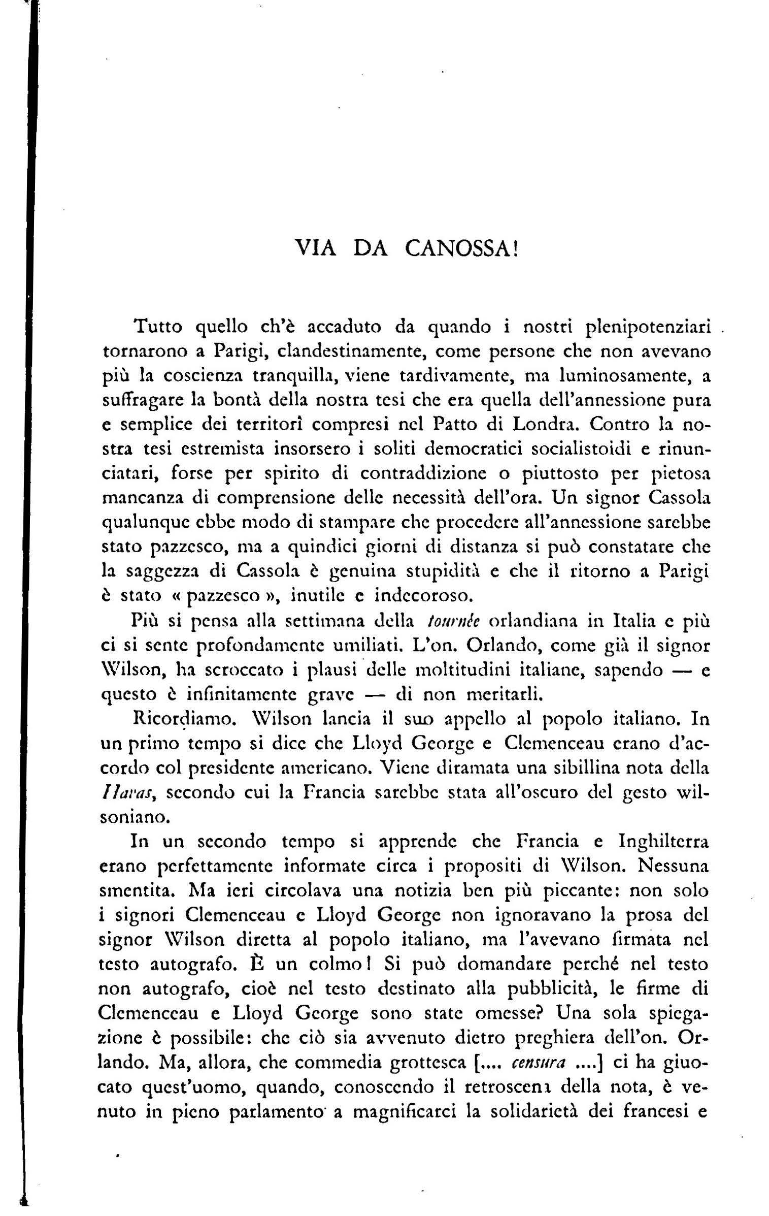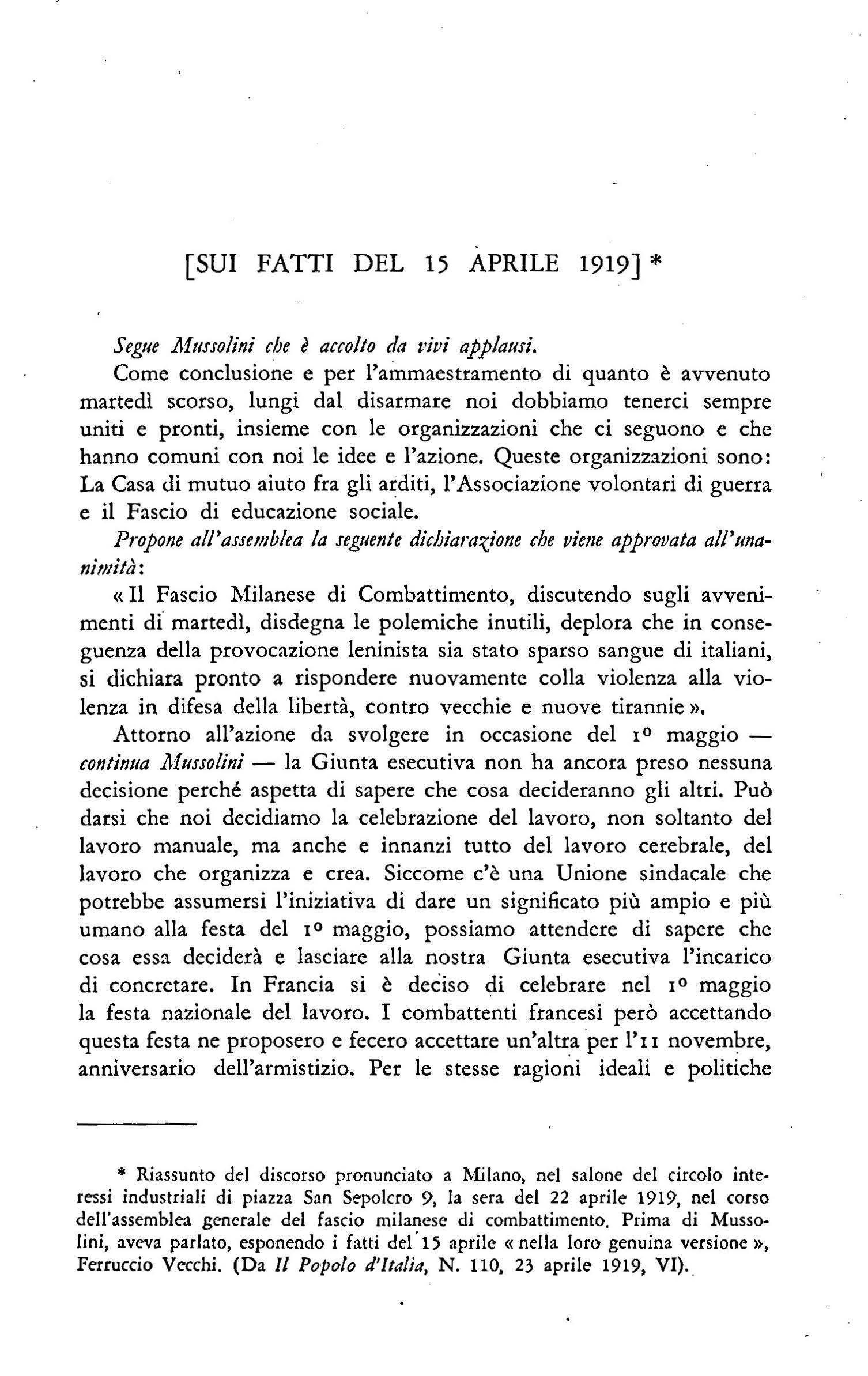 Durante questo peri<Xlo, Mussolini scrive contro il leninismo ( S); sugli avvenimenti ungheresi del 22, 23, 24 mano (10}; su un convegno.sindacalista che si terrà a Milano il 30 marzo ( 12); sulle basi essenziali e sui postulati dei fasci italiani di combattimento, sorti con l'adunata del 23 marzo 1919 (XII , 160; 14, 17, 47, 48, 117); sulle prossime elezioni generali politiche (26); sui manifesti lanciati il 4 aprile dall'unipne socialista italiana, dal partito repubblicano e dal gruppo parlamentare socialista {31, 35); su ll'associazione nazionale dei combattenti ( 37); sulla costitu:zlone, avvenuta a Milano, d i una « commissione provinciale d i avviaÌnento al lavoro» ( 40) ; sullo sciopero generale di Roma del 10 aprile (proclamato dalla camera confederale del lavoro, di t enden.ca bolscevica, col p retesto di una manifestnione proibita per Lenin), che, avversato dalla camera del lavoro, interventista, e da lla maggioranza degli operai, falli sce, gene.rand.o una gra ndiosa dimost razione pat riottica da parte d i tutte Je classi della cittadinanza ( 43, 45); confuta un articolo di Fi lippo Turati (21); p utecipa a varie assemblee del fascio milanese di combattimento ( 25, 52, 73, 105, 11 3, 174, 177) ; ha una breve polemica con· il senatore Alfredo Frassati, direttore della S tampa, nella quale si ritorna a parlare dei fondi che permisero l"uscita del Popolo d ' for{;a e si accenna ad una deposizione notarile fatta. da I da Irene D alser, g ià intima di M ussolini (44, :>S); si occupa delle rivendicazioni i taliane (S 7, 70, 7S); dei fatti di Milano del 13- lS aprile (60, 61, 64, 67, 73); dei congressi socialisti tenutisi a Parigi, Bruxelles e Huderfidd nel · marzoaprile (77); degli avvenimenti del 23-24 aprile: mentre alla conferenza della pace di Parigi continuano ancora le trattative fra le d elegazioni italiana ed all~ata per la risoluzione delle nostre questioni territoriali, il presidente W i lson dirige · un messaggio al popo lo americano nel quale combatte le a.spiiazioni italiane su Fiume e sulla Dalma-zia, d imostra come q ueste regioni devono appartenere alla J ugos lavia e confuta il patto di Londra come non rispondente più alle mutate condizioni dc-I le tcr re circumadriaticbe; l'on Orlando, con una lettera à Clcmenceau e a Lloyd George, annunéia che, in seguito alle dichiarazioni di Wi lson, la delegazione italiana lascia. Parig i ; CJemenccau, rispondendo ad un telegramma inviatogli dall'on. Luzzatti, che chi~e l' appoggio della Francia, af; fenna che nori è all'ora della fi rma della pace che si possono misconoscere gJi obblighi reciproci e che la politica francese non è quella degli stracci di carta; Orlando risponde al messaggio di Wilson; in tutta Italia h~no luogo grandi dimostrazioni di protesta contro i l mcs.saggio del presidente americano; il g overno fra ncese separa formalmente " la propria responsabilità dalriniziativa isolata e spontanea di Wilson ( 80, 82, 8'.'.i, 88, 91) ·