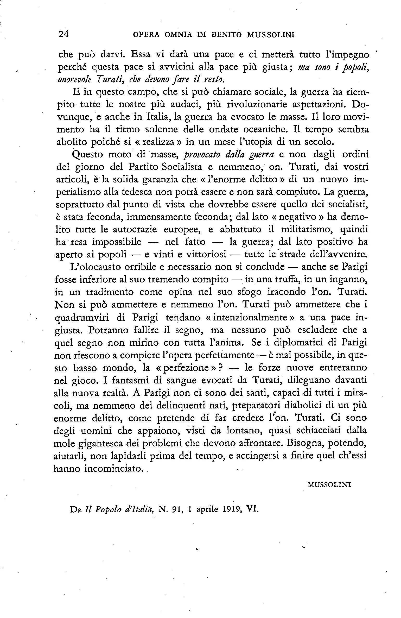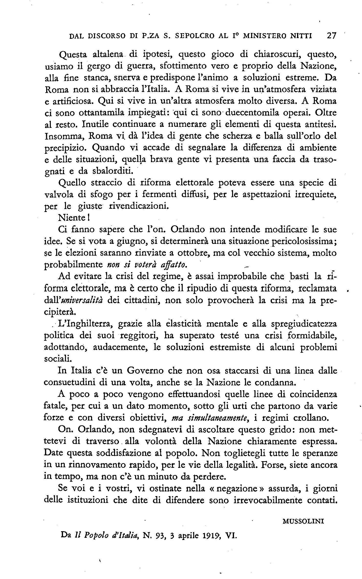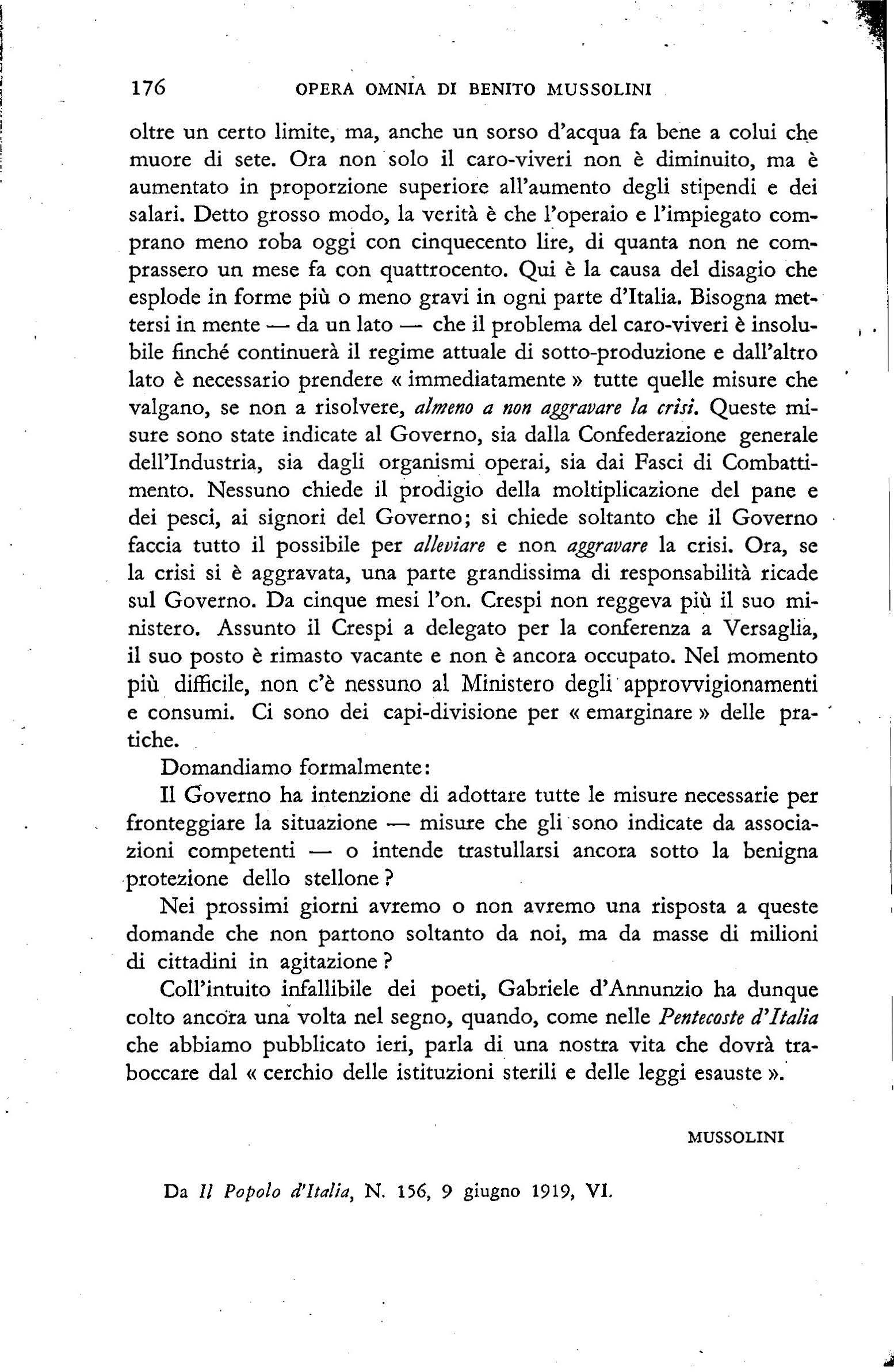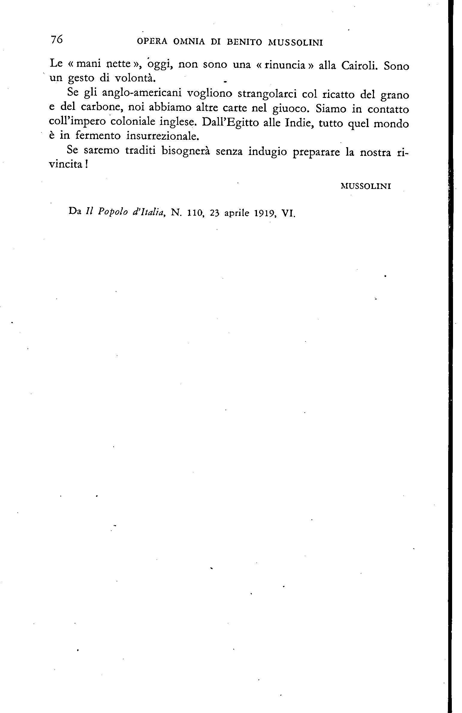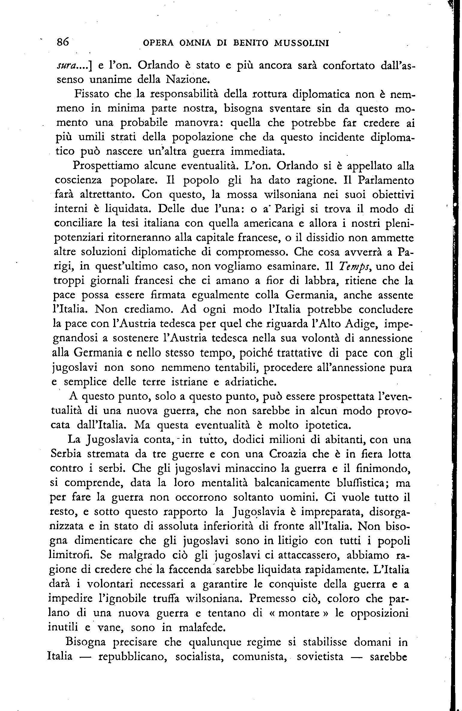 Durante questo peri<Xlo, Mussolini scrive contro il leninismo ( S); sugli avvenimenti ungheresi del 22, 23, 24 mano (10}; su un convegno.sindacalista che si terrà a Milano il 30 marzo ( 12); sulle basi essenziali e sui postulati dei fasci italiani di combattimento, sorti con l'adunata del 23 marzo 1919 (XII , 160; 14, 17, 47, 48, 117); sulle prossime elezioni generali politiche (26); sui manifesti lanciati il 4 aprile dall'unipne socialista italiana, dal partito repubblicano e dal gruppo parlamentare socialista {31, 35); su ll'associazione nazionale dei combattenti ( 37); sulla costitu:zlone, avvenuta a Milano, d i una « commissione provinciale d i avviaÌnento al lavoro» ( 40) ; sullo sciopero generale di Roma del 10 aprile (proclamato dalla camera confederale del lavoro, di t enden.ca bolscevica, col p retesto di una manifestnione proibita per Lenin), che, avversato dalla camera del lavoro, interventista, e da lla maggioranza degli operai, falli sce, gene.rand.o una gra ndiosa dimost razione pat riottica da parte d i tutte Je classi della cittadinanza ( 43, 45); confuta un articolo di Fi lippo Turati (21); p utecipa a varie assemblee del fascio milanese di combattimento ( 25, 52, 73, 105, 11 3, 174, 177) ; ha una breve polemica con· il senatore Alfredo Frassati, direttore della S tampa, nella quale si ritorna a parlare dei fondi che permisero l"uscita del Popolo d ' for{;a e si accenna ad una deposizione notarile fatta. da I da Irene D alser, g ià intima di M ussolini (44, :>S); si occupa delle rivendicazioni i taliane (S 7, 70, 7S); dei fatti di Milano del 13- lS aprile (60, 61, 64, 67, 73); dei congressi socialisti tenutisi a Parigi, Bruxelles e Huderfidd nel · marzoaprile (77); degli avvenimenti del 23-24 aprile: mentre alla conferenza della pace di Parigi continuano ancora le trattative fra le d elegazioni italiana ed all~ata per la risoluzione delle nostre questioni territoriali, il presidente W i lson dirige · un messaggio al popo lo americano nel quale combatte le a.spiiazioni italiane su Fiume e sulla Dalma-zia, d imostra come q ueste regioni devono appartenere alla J ugos lavia e confuta il patto di Londra come non rispondente più alle mutate condizioni dc-I le tcr re circumadriaticbe; l'on Orlando, con una lettera à Clcmenceau e a Lloyd George, annunéia che, in seguito alle dichiarazioni di Wi lson, la delegazione italiana lascia. Parig i ; CJemenccau, rispondendo ad un telegramma inviatogli dall'on. Luzzatti, che chi~e l' appoggio della Francia, af; fenna che nori è all'ora della fi rma della pace che si possono misconoscere gJi obblighi reciproci e che la politica francese non è quella degli stracci di carta; Orlando risponde al messaggio di Wilson; in tutta Italia h~no luogo grandi dimostrazioni di protesta contro i l mcs.saggio del presidente americano; il g overno fra ncese separa formalmente " la propria responsabilità dalriniziativa isolata e spontanea di Wilson ( 80, 82, 8'.'.i, 88, 91) ·