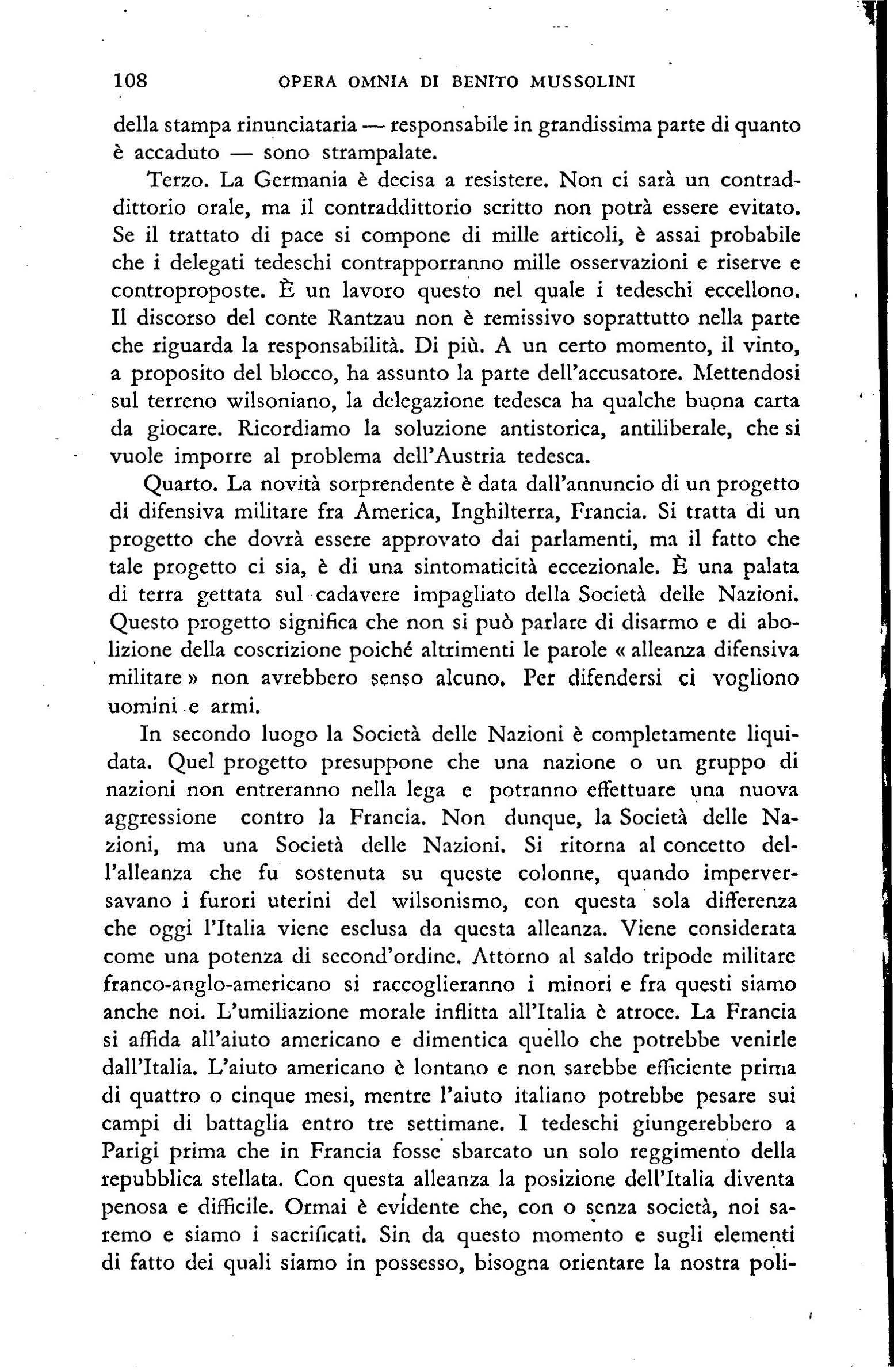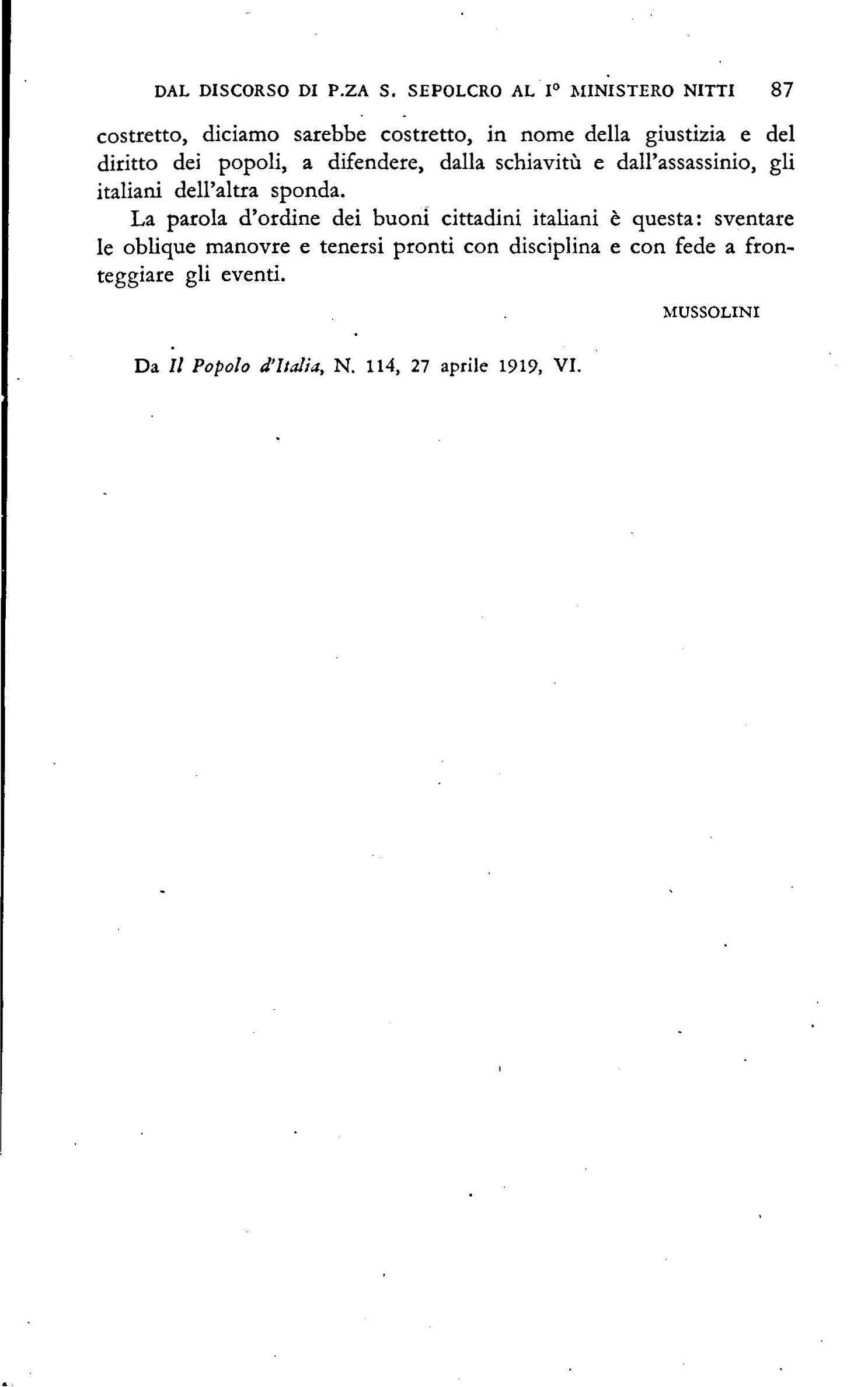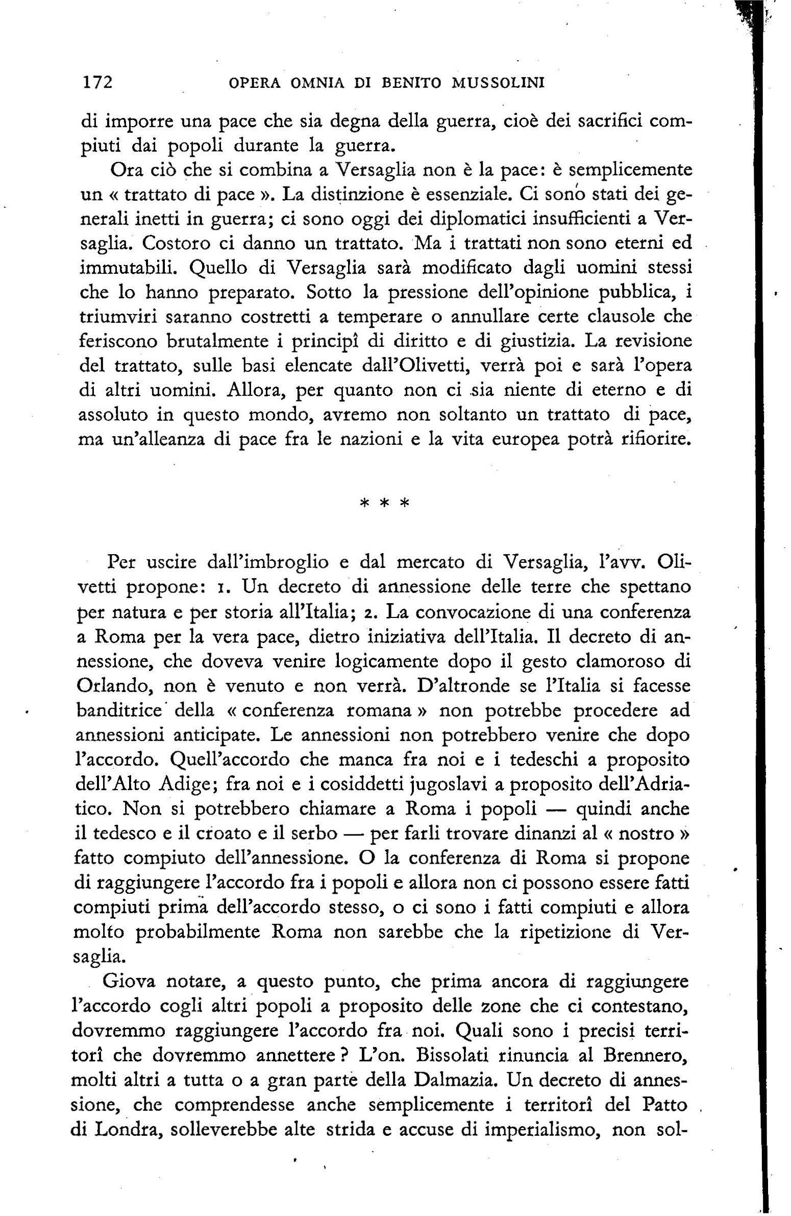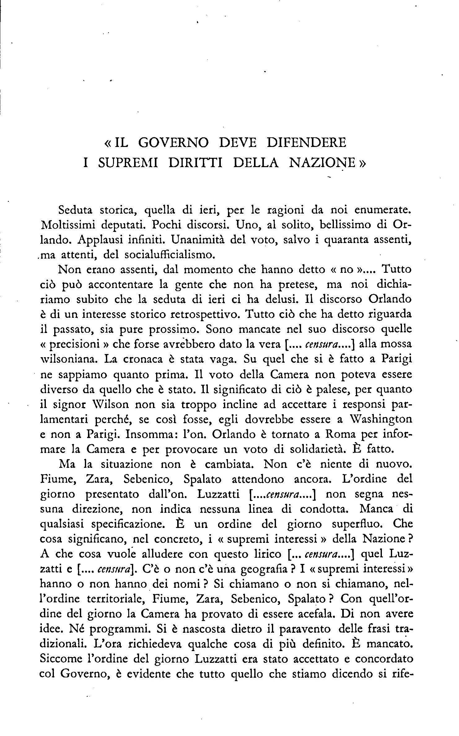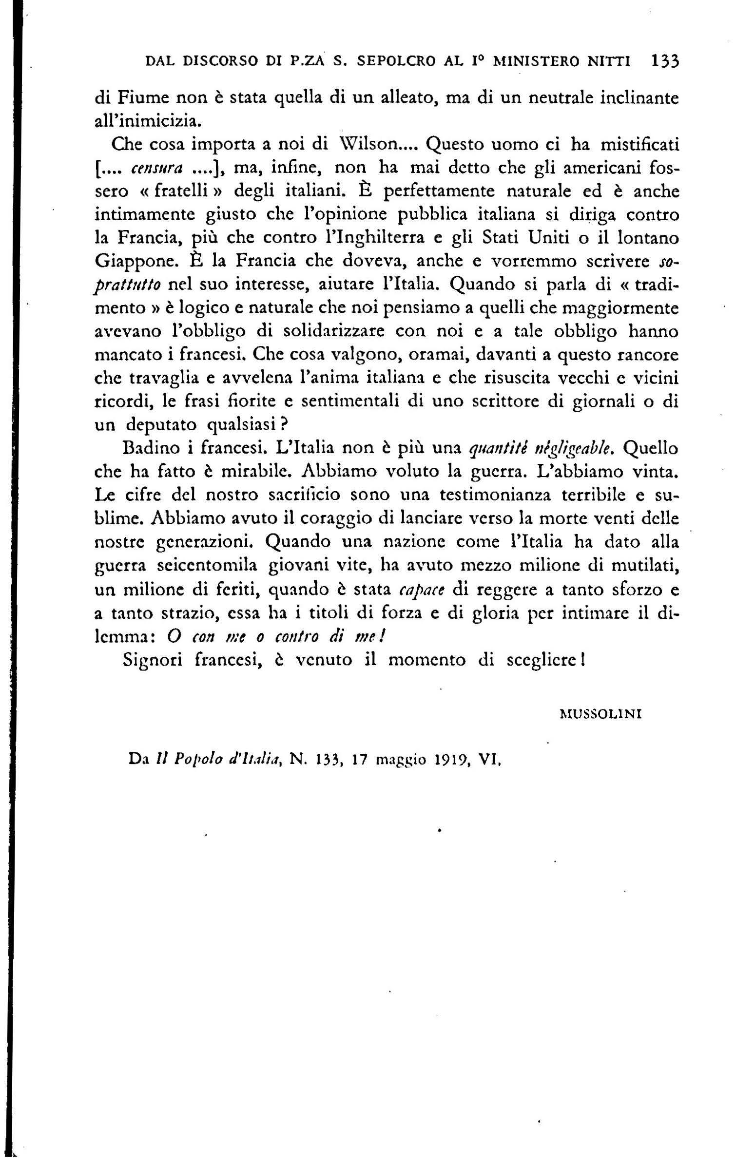 Durante questo peri<Xlo, Mussolini scrive contro il leninismo ( S); sugli avvenimenti ungheresi del 22, 23, 24 mano (10}; su un convegno.sindacalista che si terrà a Milano il 30 marzo ( 12); sulle basi essenziali e sui postulati dei fasci italiani di combattimento, sorti con l'adunata del 23 marzo 1919 (XII , 160; 14, 17, 47, 48, 117); sulle prossime elezioni generali politiche (26); sui manifesti lanciati il 4 aprile dall'unipne socialista italiana, dal partito repubblicano e dal gruppo parlamentare socialista {31, 35); su ll'associazione nazionale dei combattenti ( 37); sulla costitu:zlone, avvenuta a Milano, d i una « commissione provinciale d i avviaÌnento al lavoro» ( 40) ; sullo sciopero generale di Roma del 10 aprile (proclamato dalla camera confederale del lavoro, di t enden.ca bolscevica, col p retesto di una manifestnione proibita per Lenin), che, avversato dalla camera del lavoro, interventista, e da lla maggioranza degli operai, falli sce, gene.rand.o una gra ndiosa dimost razione pat riottica da parte d i tutte Je classi della cittadinanza ( 43, 45); confuta un articolo di Fi lippo Turati (21); p utecipa a varie assemblee del fascio milanese di combattimento ( 25, 52, 73, 105, 11 3, 174, 177) ; ha una breve polemica con· il senatore Alfredo Frassati, direttore della S tampa, nella quale si ritorna a parlare dei fondi che permisero l"uscita del Popolo d ' for{;a e si accenna ad una deposizione notarile fatta. da I da Irene D alser, g ià intima di M ussolini (44, :>S); si occupa delle rivendicazioni i taliane (S 7, 70, 7S); dei fatti di Milano del 13- lS aprile (60, 61, 64, 67, 73); dei congressi socialisti tenutisi a Parigi, Bruxelles e Huderfidd nel · marzoaprile (77); degli avvenimenti del 23-24 aprile: mentre alla conferenza della pace di Parigi continuano ancora le trattative fra le d elegazioni italiana ed all~ata per la risoluzione delle nostre questioni territoriali, il presidente W i lson dirige · un messaggio al popo lo americano nel quale combatte le a.spiiazioni italiane su Fiume e sulla Dalma-zia, d imostra come q ueste regioni devono appartenere alla J ugos lavia e confuta il patto di Londra come non rispondente più alle mutate condizioni dc-I le tcr re circumadriaticbe; l'on Orlando, con una lettera à Clcmenceau e a Lloyd George, annunéia che, in seguito alle dichiarazioni di Wi lson, la delegazione italiana lascia. Parig i ; CJemenccau, rispondendo ad un telegramma inviatogli dall'on. Luzzatti, che chi~e l' appoggio della Francia, af; fenna che nori è all'ora della fi rma della pace che si possono misconoscere gJi obblighi reciproci e che la politica francese non è quella degli stracci di carta; Orlando risponde al messaggio di Wilson; in tutta Italia h~no luogo grandi dimostrazioni di protesta contro i l mcs.saggio del presidente americano; il g overno fra ncese separa formalmente " la propria responsabilità dalriniziativa isolata e spontanea di Wilson ( 80, 82, 8'.'.i, 88, 91) ·