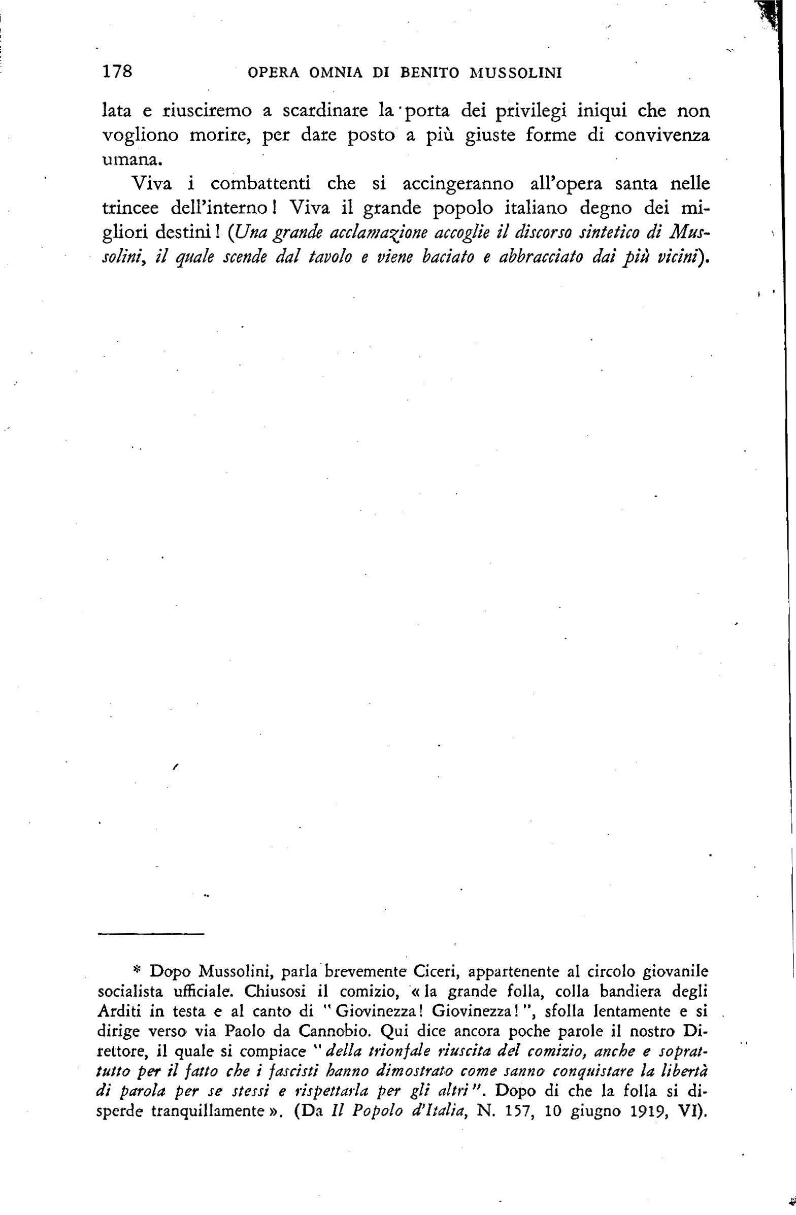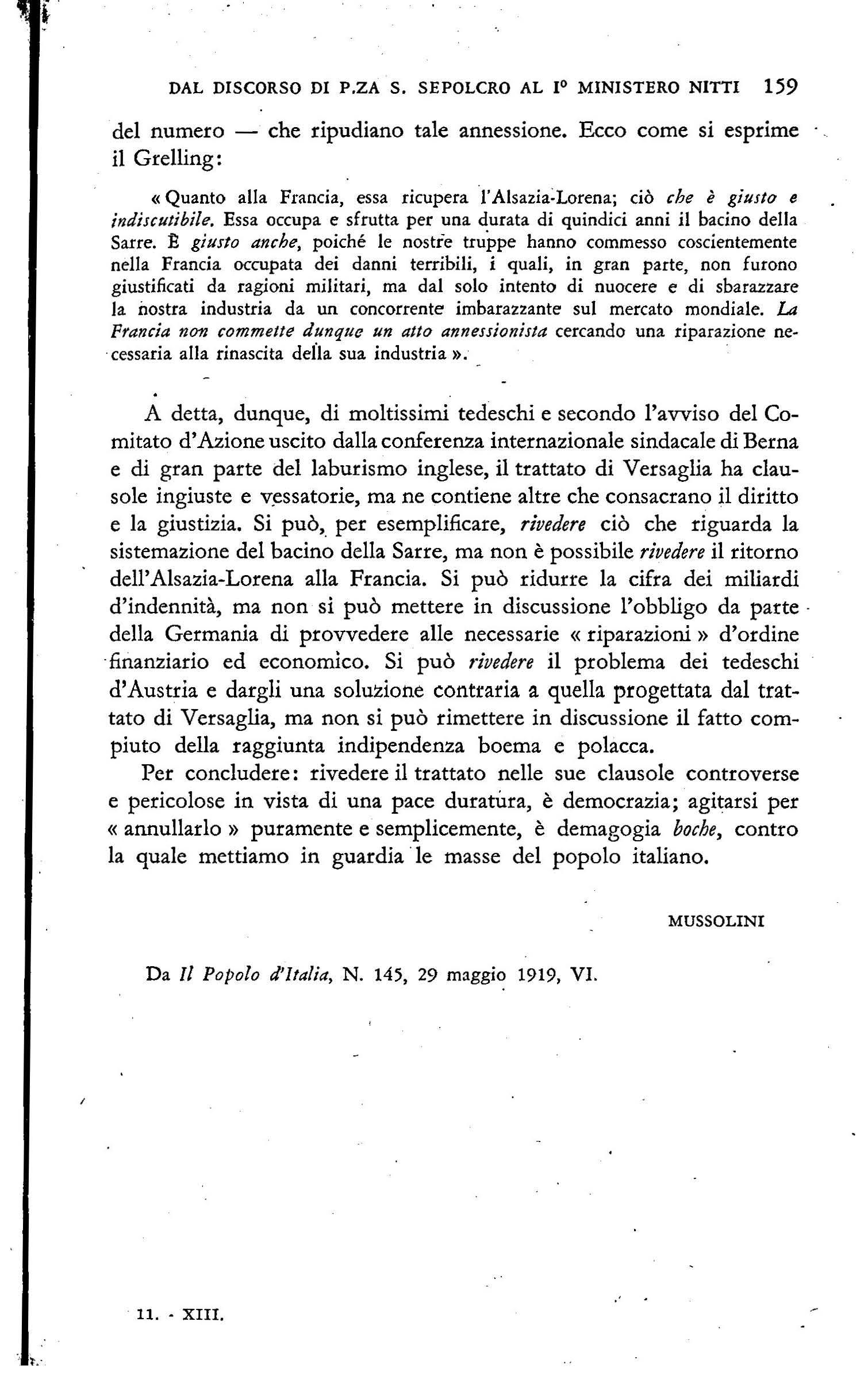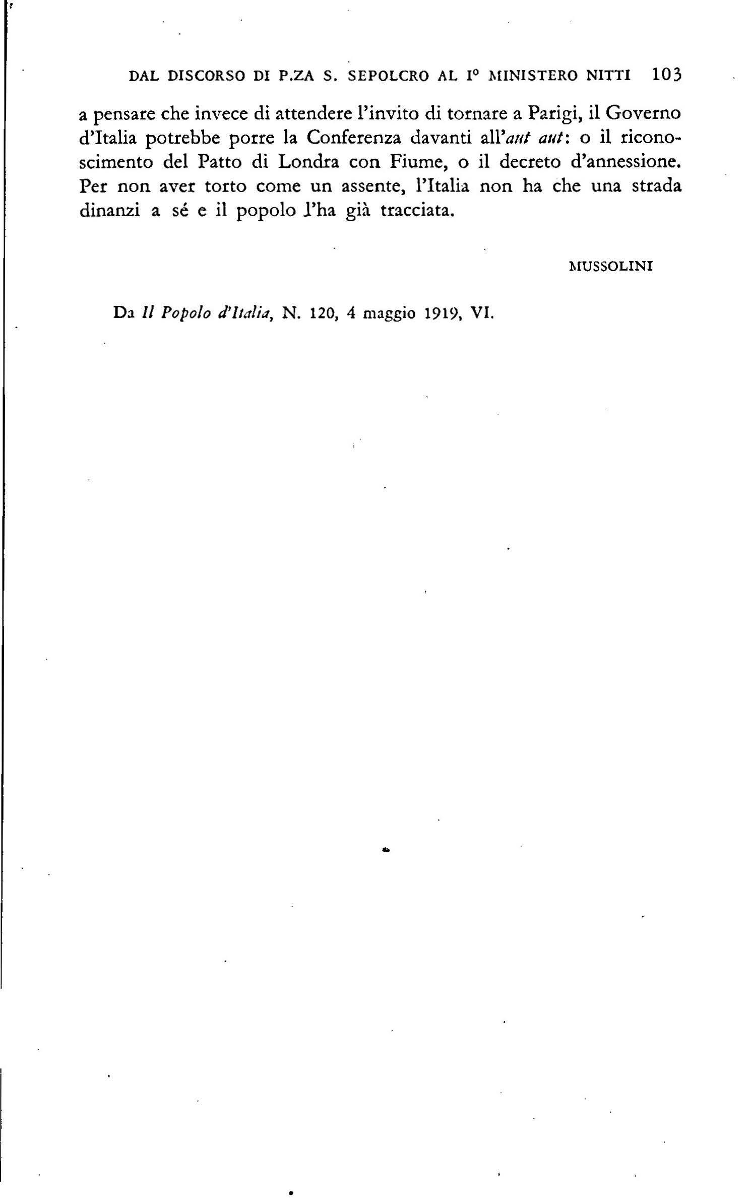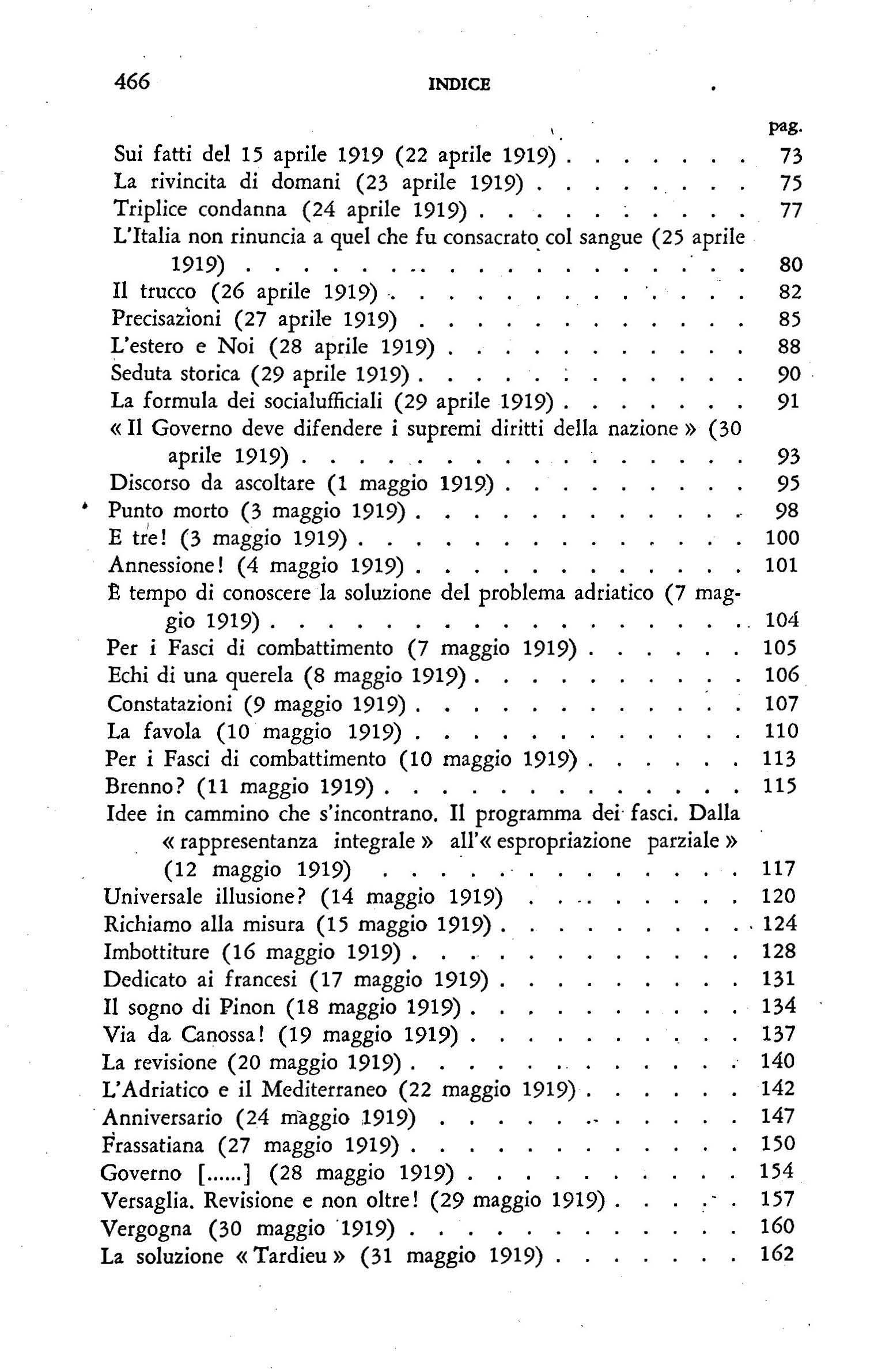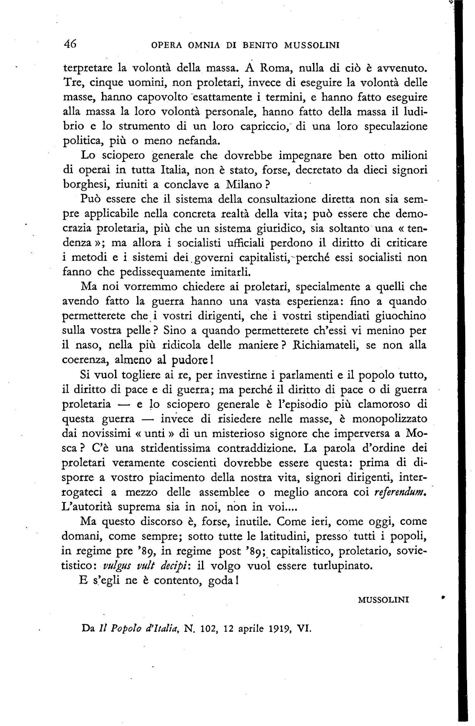 Durante questo peri<Xlo, Mussolini scrive contro il leninismo ( S); sugli avvenimenti ungheresi del 22, 23, 24 mano (10}; su un convegno.sindacalista che si terrà a Milano il 30 marzo ( 12); sulle basi essenziali e sui postulati dei fasci italiani di combattimento, sorti con l'adunata del 23 marzo 1919 (XII , 160; 14, 17, 47, 48, 117); sulle prossime elezioni generali politiche (26); sui manifesti lanciati il 4 aprile dall'unipne socialista italiana, dal partito repubblicano e dal gruppo parlamentare socialista {31, 35); su ll'associazione nazionale dei combattenti ( 37); sulla costitu:zlone, avvenuta a Milano, d i una « commissione provinciale d i avviaÌnento al lavoro» ( 40) ; sullo sciopero generale di Roma del 10 aprile (proclamato dalla camera confederale del lavoro, di t enden.ca bolscevica, col p retesto di una manifestnione proibita per Lenin), che, avversato dalla camera del lavoro, interventista, e da lla maggioranza degli operai, falli sce, gene.rand.o una gra ndiosa dimost razione pat riottica da parte d i tutte Je classi della cittadinanza ( 43, 45); confuta un articolo di Fi lippo Turati (21); p utecipa a varie assemblee del fascio milanese di combattimento ( 25, 52, 73, 105, 11 3, 174, 177) ; ha una breve polemica con· il senatore Alfredo Frassati, direttore della S tampa, nella quale si ritorna a parlare dei fondi che permisero l"uscita del Popolo d ' for{;a e si accenna ad una deposizione notarile fatta. da I da Irene D alser, g ià intima di M ussolini (44, :>S); si occupa delle rivendicazioni i taliane (S 7, 70, 7S); dei fatti di Milano del 13- lS aprile (60, 61, 64, 67, 73); dei congressi socialisti tenutisi a Parigi, Bruxelles e Huderfidd nel · marzoaprile (77); degli avvenimenti del 23-24 aprile: mentre alla conferenza della pace di Parigi continuano ancora le trattative fra le d elegazioni italiana ed all~ata per la risoluzione delle nostre questioni territoriali, il presidente W i lson dirige · un messaggio al popo lo americano nel quale combatte le a.spiiazioni italiane su Fiume e sulla Dalma-zia, d imostra come q ueste regioni devono appartenere alla J ugos lavia e confuta il patto di Londra come non rispondente più alle mutate condizioni dc-I le tcr re circumadriaticbe; l'on Orlando, con una lettera à Clcmenceau e a Lloyd George, annunéia che, in seguito alle dichiarazioni di Wi lson, la delegazione italiana lascia. Parig i ; CJemenccau, rispondendo ad un telegramma inviatogli dall'on. Luzzatti, che chi~e l' appoggio della Francia, af; fenna che nori è all'ora della fi rma della pace che si possono misconoscere gJi obblighi reciproci e che la politica francese non è quella degli stracci di carta; Orlando risponde al messaggio di Wilson; in tutta Italia h~no luogo grandi dimostrazioni di protesta contro i l mcs.saggio del presidente americano; il g overno fra ncese separa formalmente " la propria responsabilità dalriniziativa isolata e spontanea di Wilson ( 80, 82, 8'.'.i, 88, 91) ·