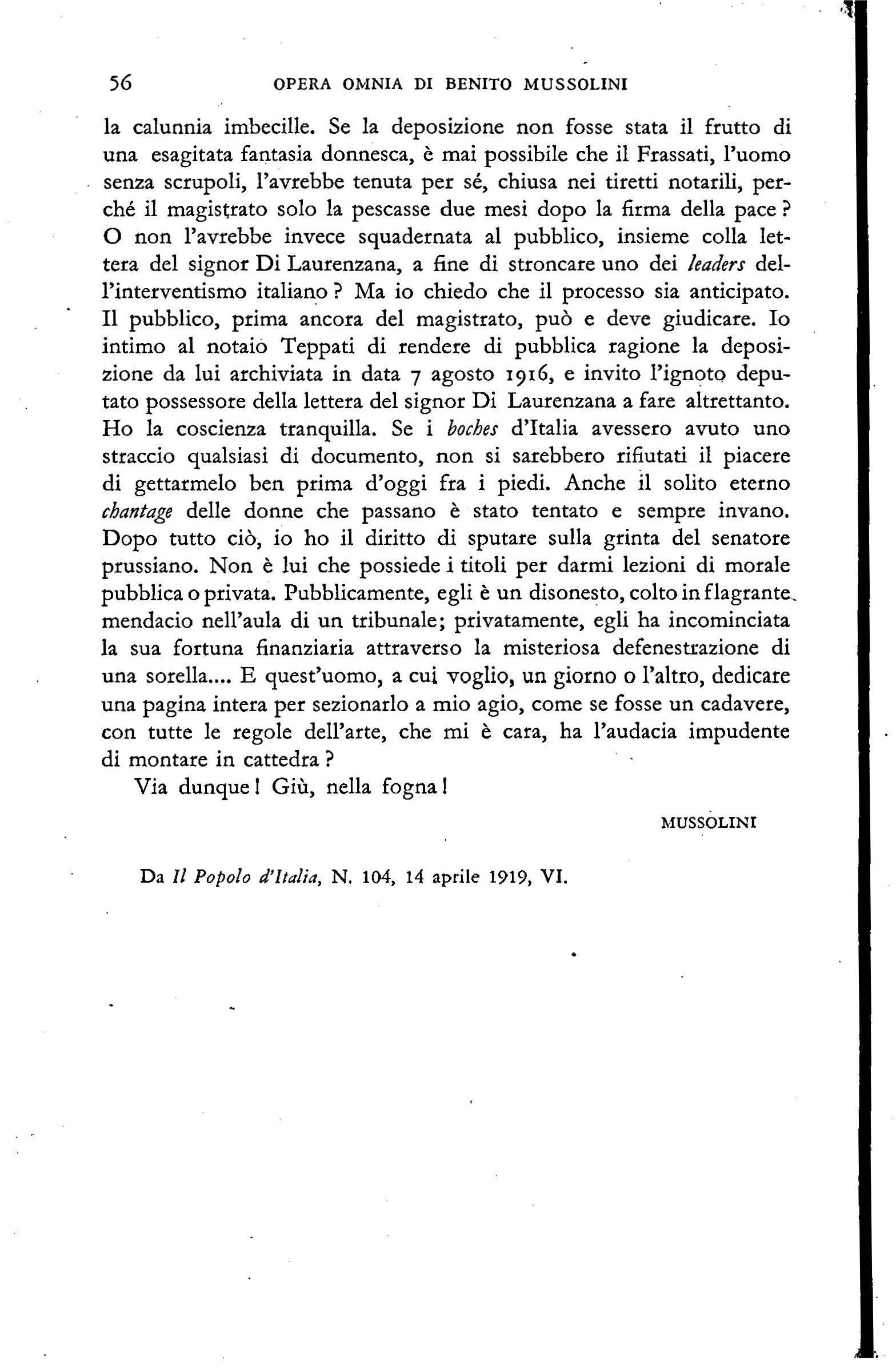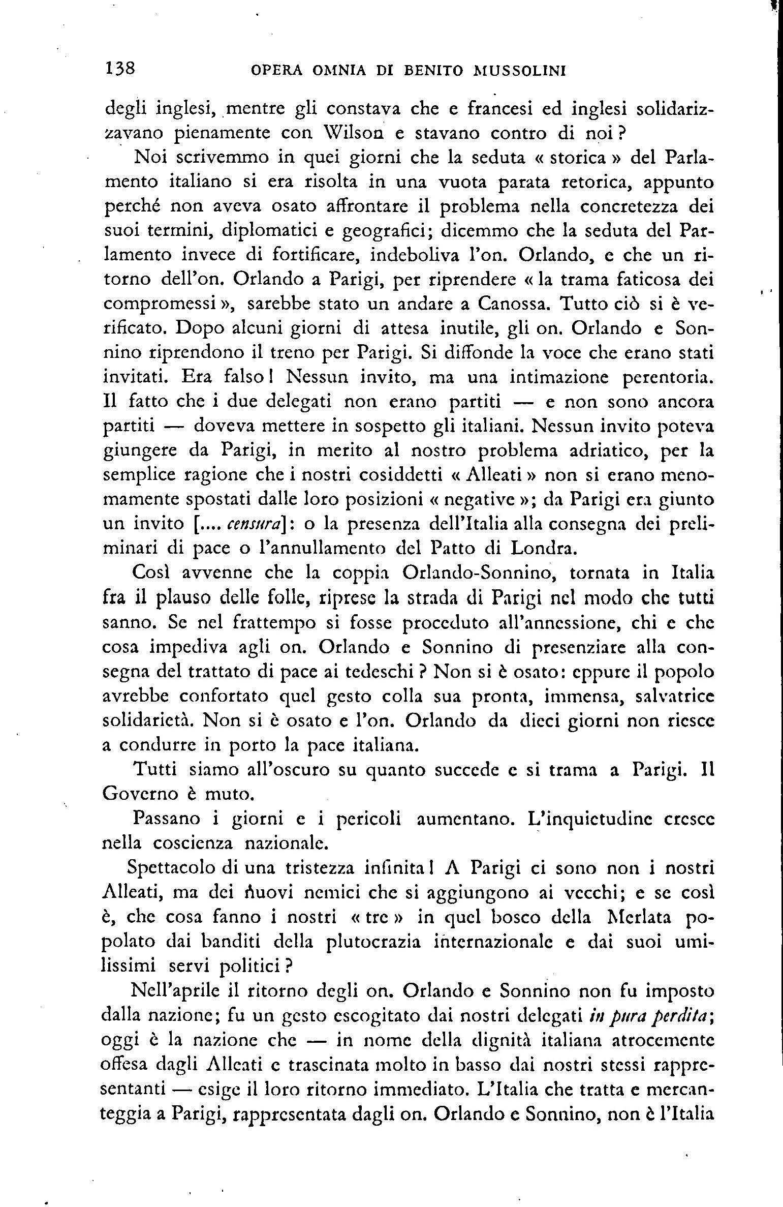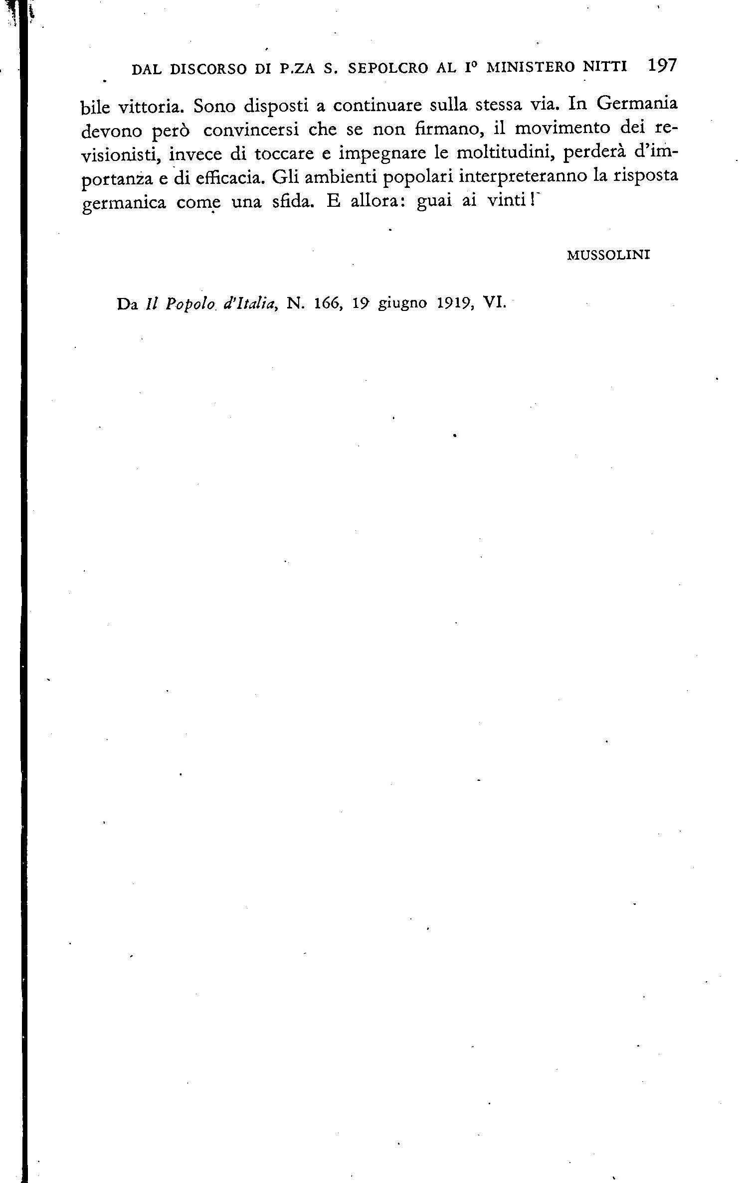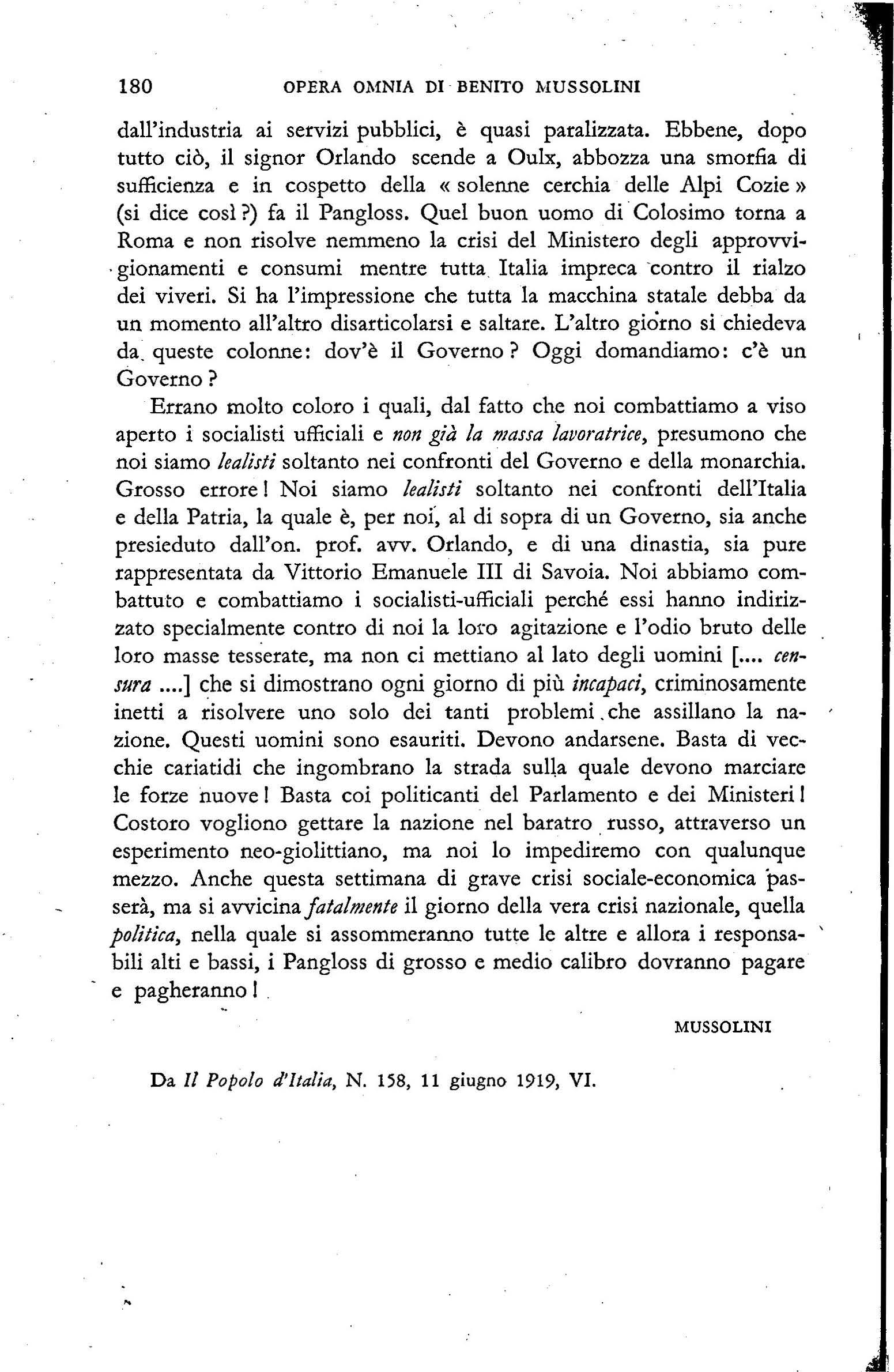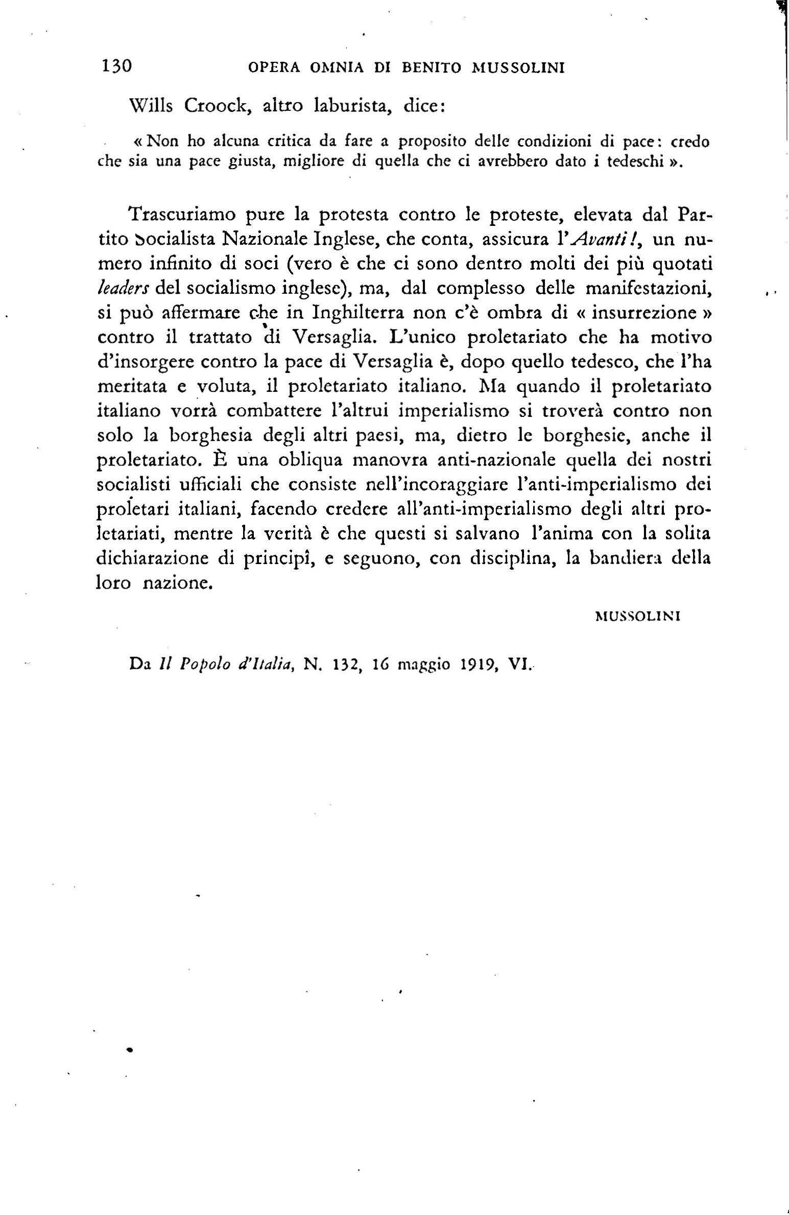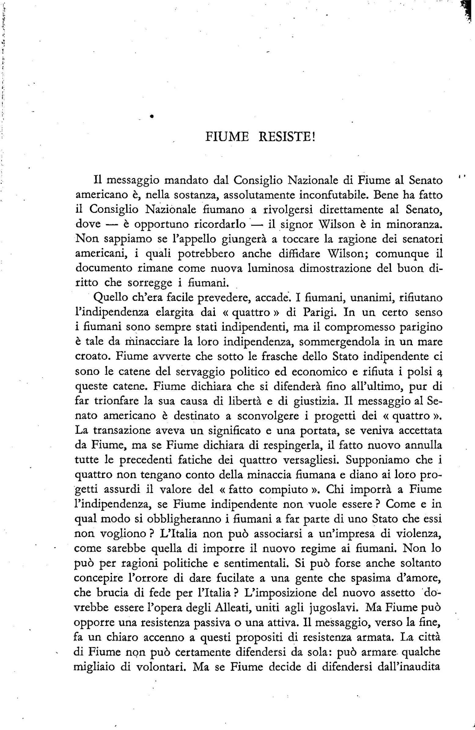 Durante questo peri<Xlo, Mussolini scrive contro il leninismo ( S); sugli avvenimenti ungheresi del 22, 23, 24 mano (10}; su un convegno.sindacalista che si terrà a Milano il 30 marzo ( 12); sulle basi essenziali e sui postulati dei fasci italiani di combattimento, sorti con l'adunata del 23 marzo 1919 (XII , 160; 14, 17, 47, 48, 117); sulle prossime elezioni generali politiche (26); sui manifesti lanciati il 4 aprile dall'unipne socialista italiana, dal partito repubblicano e dal gruppo parlamentare socialista {31, 35); su ll'associazione nazionale dei combattenti ( 37); sulla costitu:zlone, avvenuta a Milano, d i una « commissione provinciale d i avviaÌnento al lavoro» ( 40) ; sullo sciopero generale di Roma del 10 aprile (proclamato dalla camera confederale del lavoro, di t enden.ca bolscevica, col p retesto di una manifestnione proibita per Lenin), che, avversato dalla camera del lavoro, interventista, e da lla maggioranza degli operai, falli sce, gene.rand.o una gra ndiosa dimost razione pat riottica da parte d i tutte Je classi della cittadinanza ( 43, 45); confuta un articolo di Fi lippo Turati (21); p utecipa a varie assemblee del fascio milanese di combattimento ( 25, 52, 73, 105, 11 3, 174, 177) ; ha una breve polemica con· il senatore Alfredo Frassati, direttore della S tampa, nella quale si ritorna a parlare dei fondi che permisero l"uscita del Popolo d ' for{;a e si accenna ad una deposizione notarile fatta. da I da Irene D alser, g ià intima di M ussolini (44, :>S); si occupa delle rivendicazioni i taliane (S 7, 70, 7S); dei fatti di Milano del 13- lS aprile (60, 61, 64, 67, 73); dei congressi socialisti tenutisi a Parigi, Bruxelles e Huderfidd nel · marzoaprile (77); degli avvenimenti del 23-24 aprile: mentre alla conferenza della pace di Parigi continuano ancora le trattative fra le d elegazioni italiana ed all~ata per la risoluzione delle nostre questioni territoriali, il presidente W i lson dirige · un messaggio al popo lo americano nel quale combatte le a.spiiazioni italiane su Fiume e sulla Dalma-zia, d imostra come q ueste regioni devono appartenere alla J ugos lavia e confuta il patto di Londra come non rispondente più alle mutate condizioni dc-I le tcr re circumadriaticbe; l'on Orlando, con una lettera à Clcmenceau e a Lloyd George, annunéia che, in seguito alle dichiarazioni di Wi lson, la delegazione italiana lascia. Parig i ; CJemenccau, rispondendo ad un telegramma inviatogli dall'on. Luzzatti, che chi~e l' appoggio della Francia, af; fenna che nori è all'ora della fi rma della pace che si possono misconoscere gJi obblighi reciproci e che la politica francese non è quella degli stracci di carta; Orlando risponde al messaggio di Wilson; in tutta Italia h~no luogo grandi dimostrazioni di protesta contro i l mcs.saggio del presidente americano; il g overno fra ncese separa formalmente " la propria responsabilità dalriniziativa isolata e spontanea di Wilson ( 80, 82, 8'.'.i, 88, 91) ·