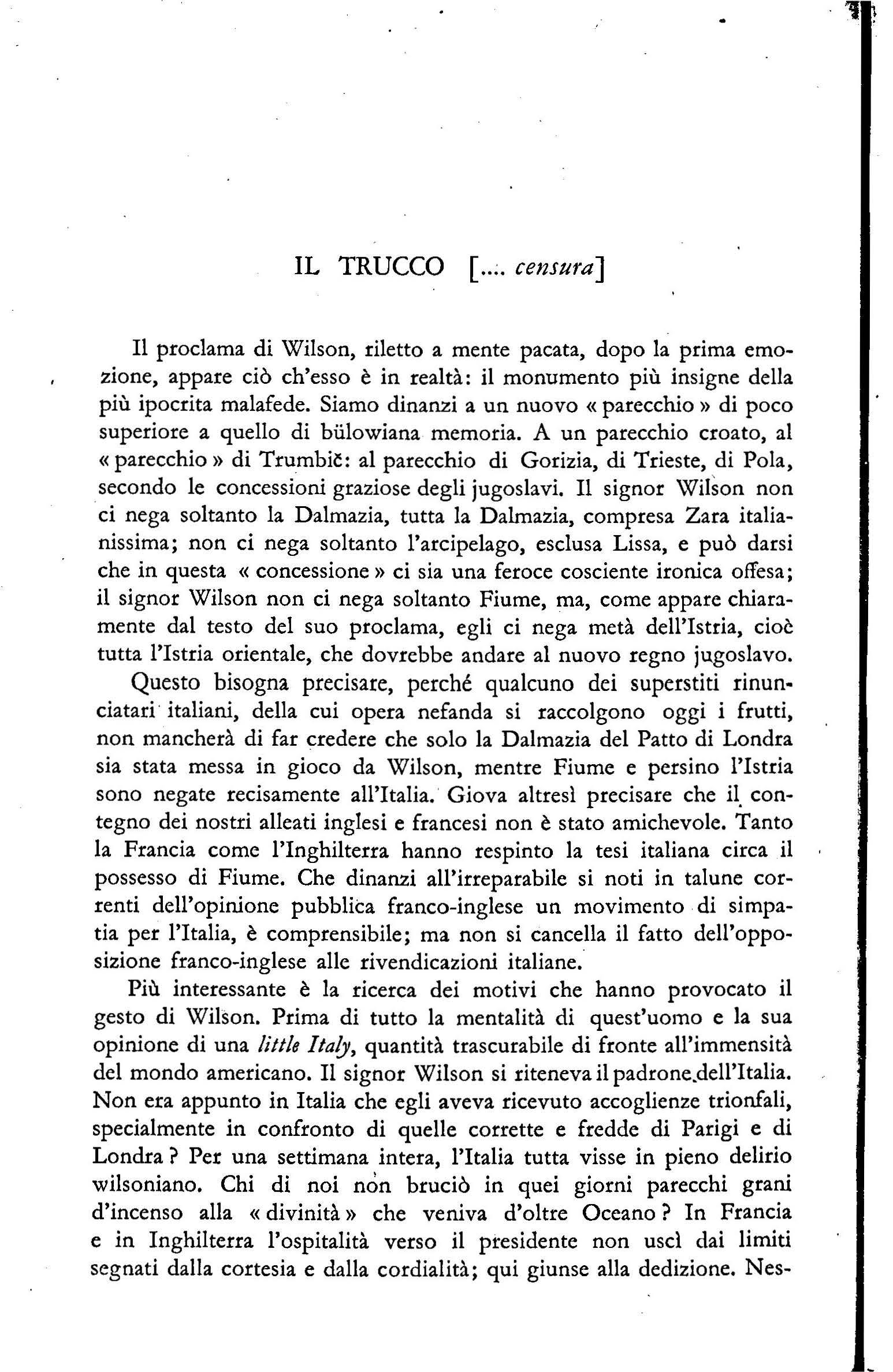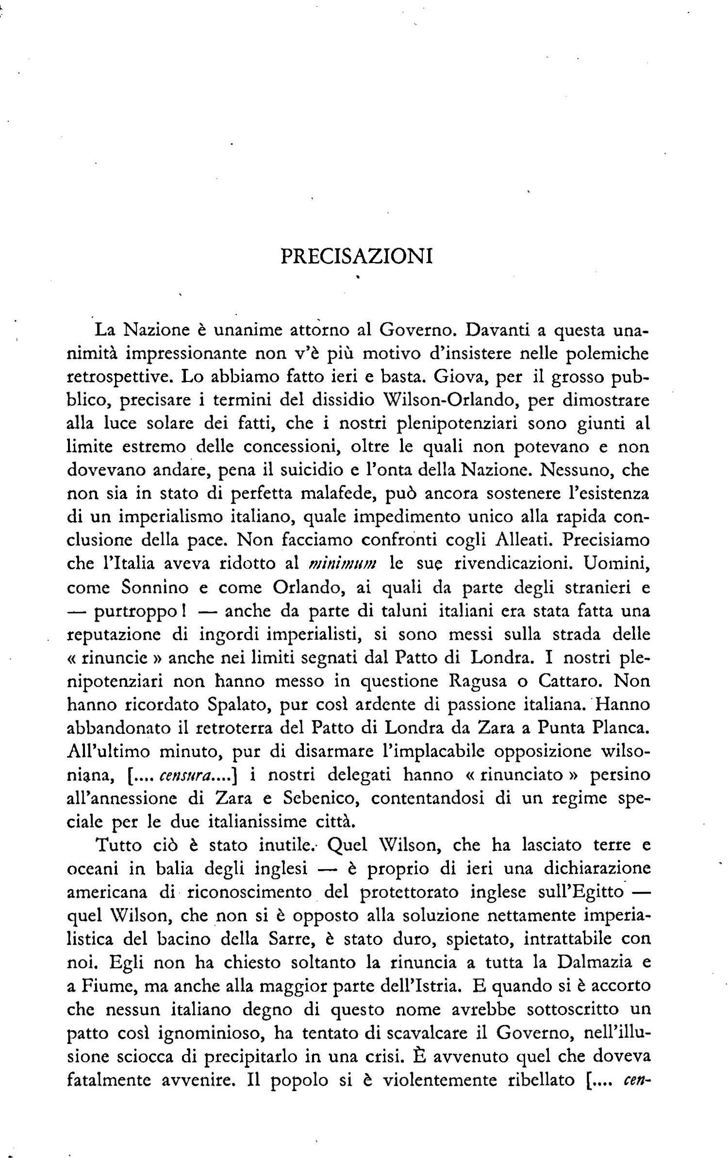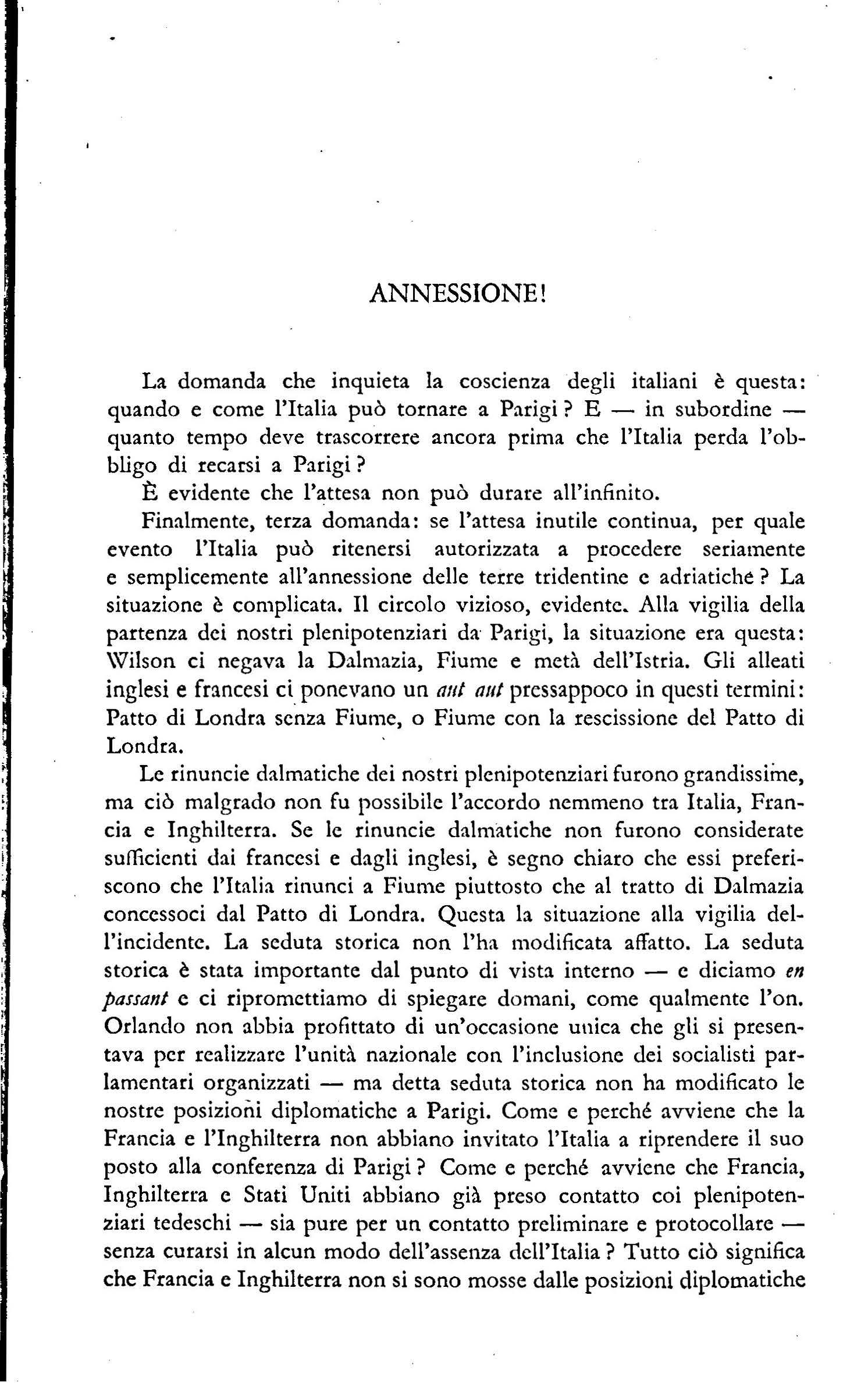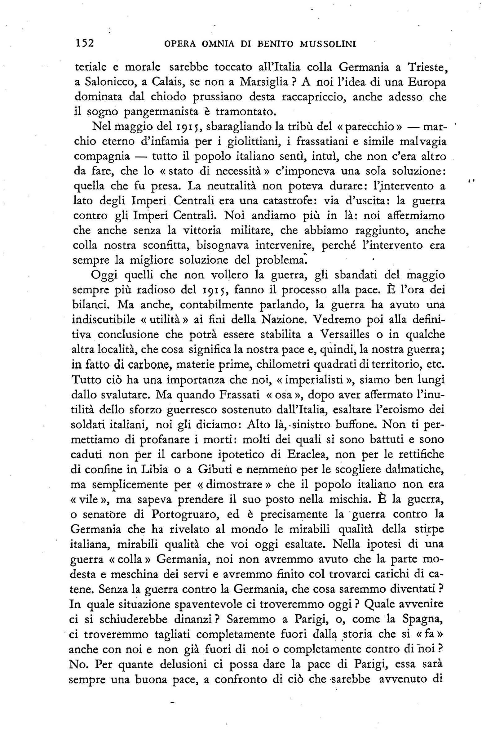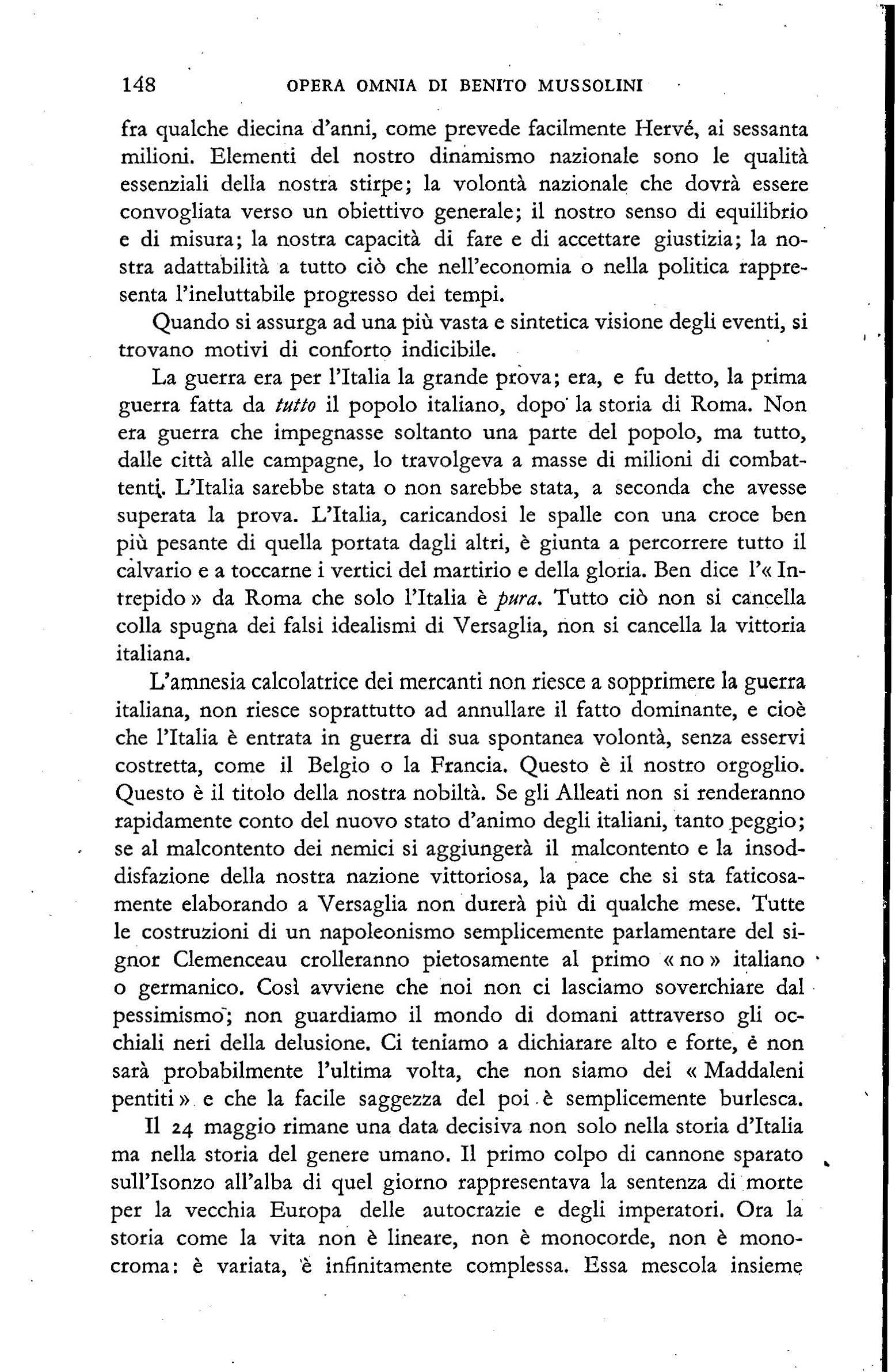 Durante questo peri<Xlo, Mussolini scrive contro il leninismo ( S); sugli avvenimenti ungheresi del 22, 23, 24 mano (10}; su un convegno.sindacalista che si terrà a Milano il 30 marzo ( 12); sulle basi essenziali e sui postulati dei fasci italiani di combattimento, sorti con l'adunata del 23 marzo 1919 (XII , 160; 14, 17, 47, 48, 117); sulle prossime elezioni generali politiche (26); sui manifesti lanciati il 4 aprile dall'unipne socialista italiana, dal partito repubblicano e dal gruppo parlamentare socialista {31, 35); su ll'associazione nazionale dei combattenti ( 37); sulla costitu:zlone, avvenuta a Milano, d i una « commissione provinciale d i avviaÌnento al lavoro» ( 40) ; sullo sciopero generale di Roma del 10 aprile (proclamato dalla camera confederale del lavoro, di t enden.ca bolscevica, col p retesto di una manifestnione proibita per Lenin), che, avversato dalla camera del lavoro, interventista, e da lla maggioranza degli operai, falli sce, gene.rand.o una gra ndiosa dimost razione pat riottica da parte d i tutte Je classi della cittadinanza ( 43, 45); confuta un articolo di Fi lippo Turati (21); p utecipa a varie assemblee del fascio milanese di combattimento ( 25, 52, 73, 105, 11 3, 174, 177) ; ha una breve polemica con· il senatore Alfredo Frassati, direttore della S tampa, nella quale si ritorna a parlare dei fondi che permisero l"uscita del Popolo d ' for{;a e si accenna ad una deposizione notarile fatta. da I da Irene D alser, g ià intima di M ussolini (44, :>S); si occupa delle rivendicazioni i taliane (S 7, 70, 7S); dei fatti di Milano del 13- lS aprile (60, 61, 64, 67, 73); dei congressi socialisti tenutisi a Parigi, Bruxelles e Huderfidd nel · marzoaprile (77); degli avvenimenti del 23-24 aprile: mentre alla conferenza della pace di Parigi continuano ancora le trattative fra le d elegazioni italiana ed all~ata per la risoluzione delle nostre questioni territoriali, il presidente W i lson dirige · un messaggio al popo lo americano nel quale combatte le a.spiiazioni italiane su Fiume e sulla Dalma-zia, d imostra come q ueste regioni devono appartenere alla J ugos lavia e confuta il patto di Londra come non rispondente più alle mutate condizioni dc-I le tcr re circumadriaticbe; l'on Orlando, con una lettera à Clcmenceau e a Lloyd George, annunéia che, in seguito alle dichiarazioni di Wi lson, la delegazione italiana lascia. Parig i ; CJemenccau, rispondendo ad un telegramma inviatogli dall'on. Luzzatti, che chi~e l' appoggio della Francia, af; fenna che nori è all'ora della fi rma della pace che si possono misconoscere gJi obblighi reciproci e che la politica francese non è quella degli stracci di carta; Orlando risponde al messaggio di Wilson; in tutta Italia h~no luogo grandi dimostrazioni di protesta contro i l mcs.saggio del presidente americano; il g overno fra ncese separa formalmente " la propria responsabilità dalriniziativa isolata e spontanea di Wilson ( 80, 82, 8'.'.i, 88, 91) ·