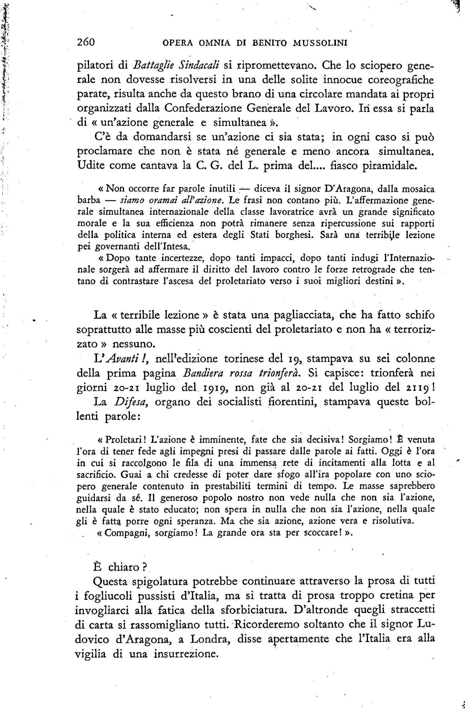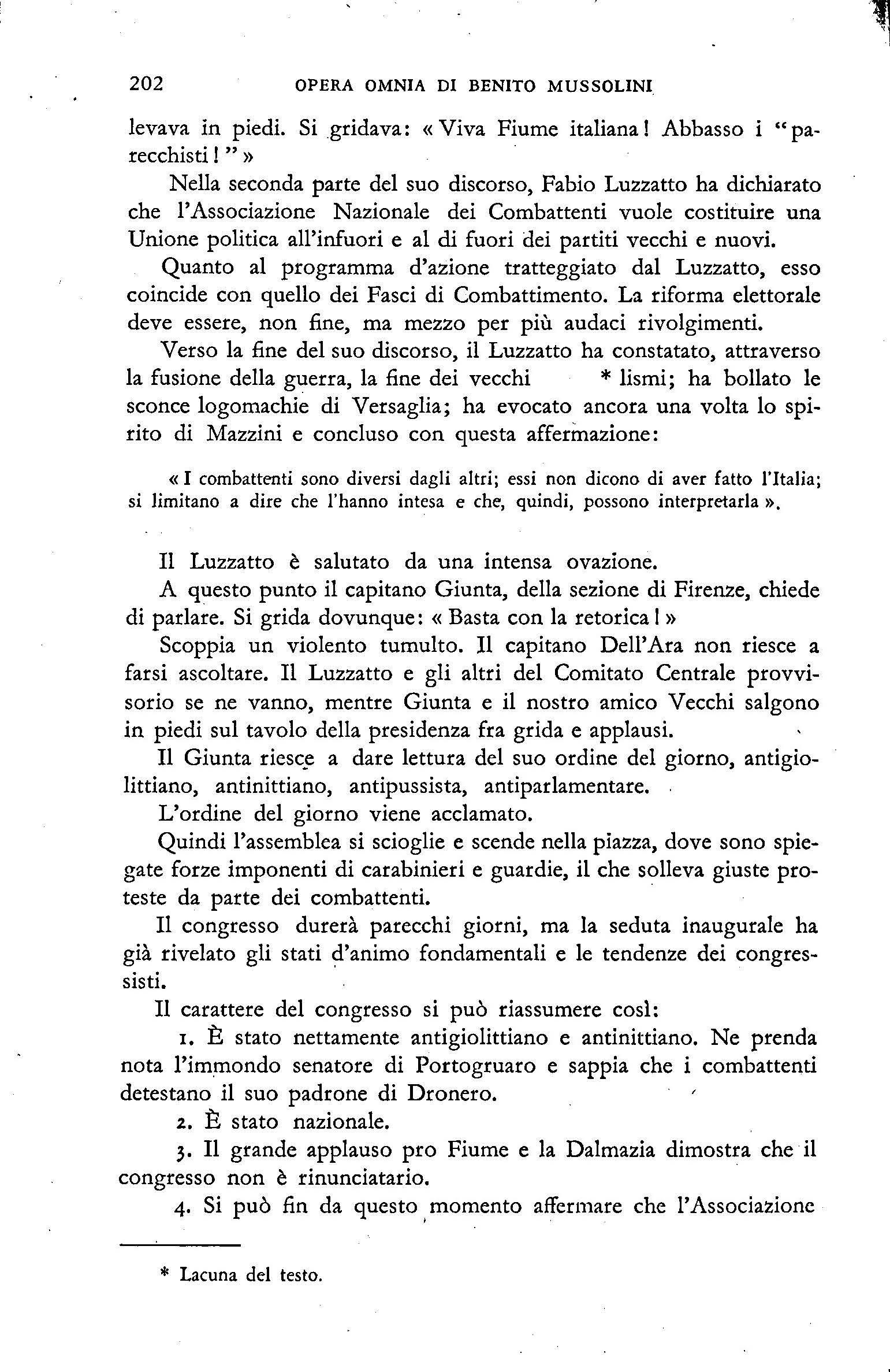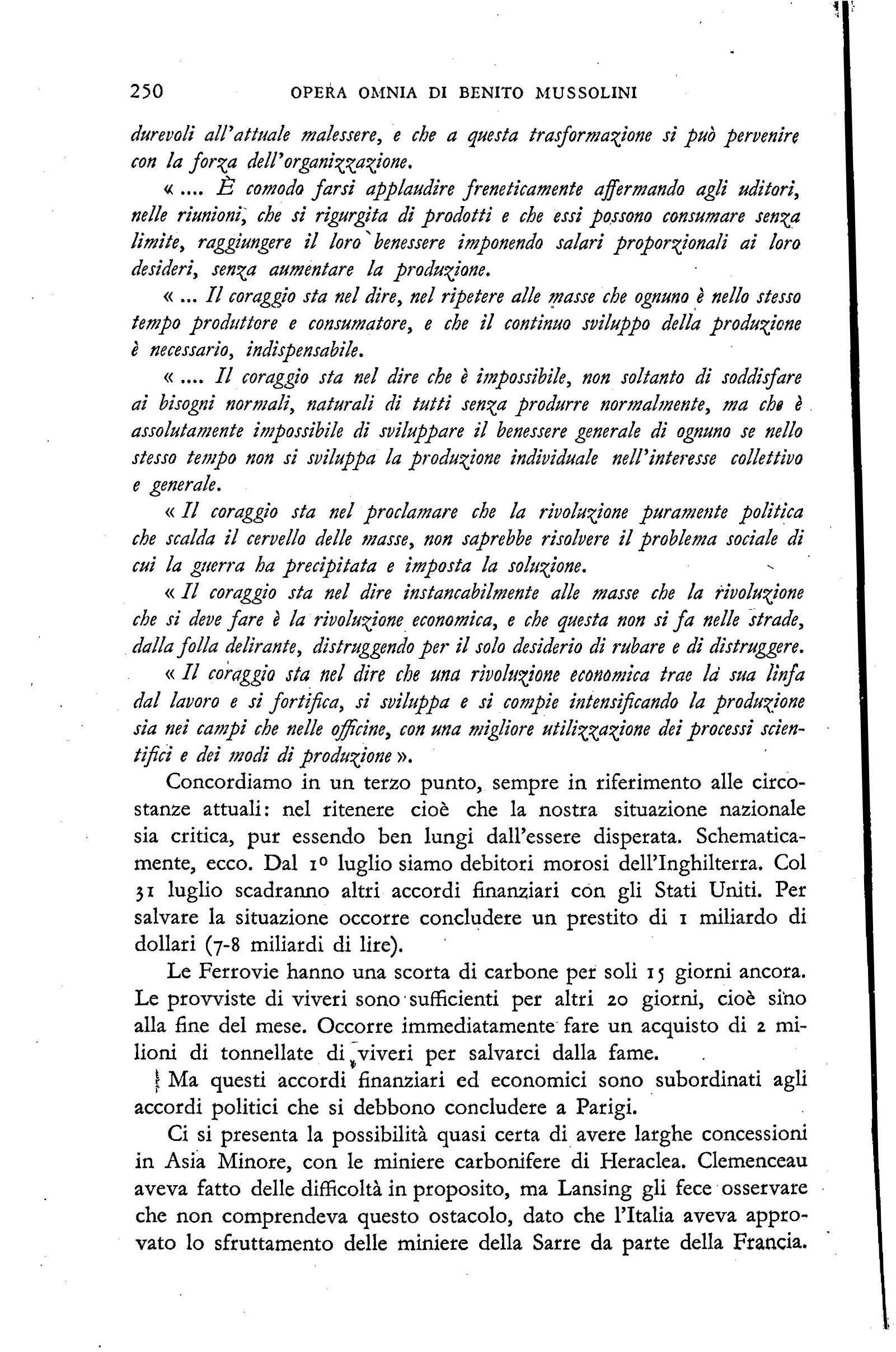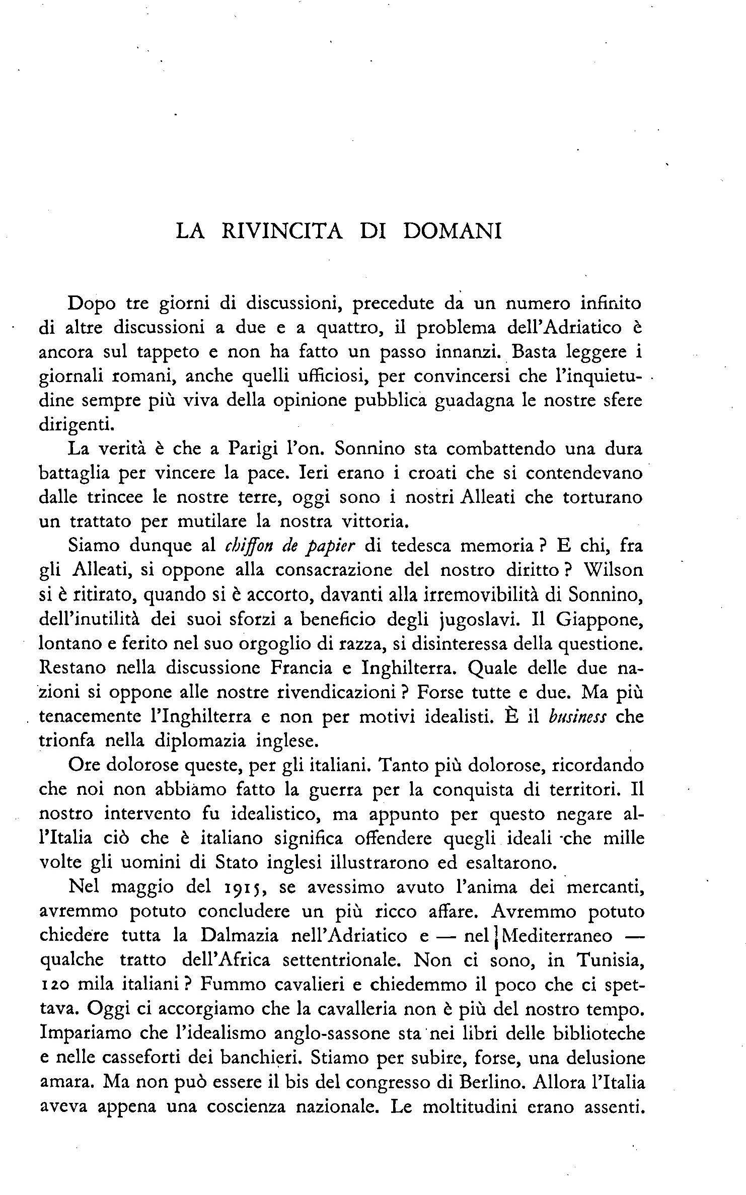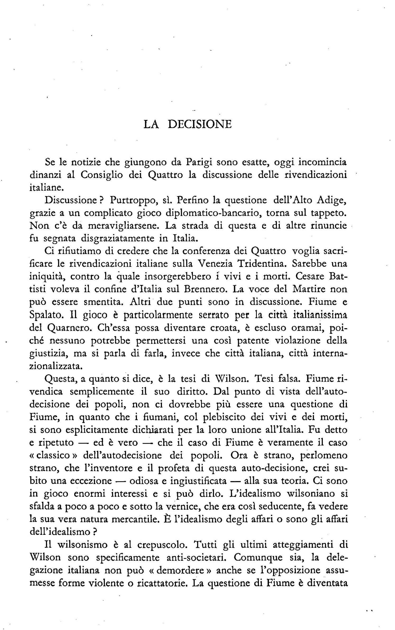 Durante questo peri<Xlo, Mussolini scrive contro il leninismo ( S); sugli avvenimenti ungheresi del 22, 23, 24 mano (10}; su un convegno.sindacalista che si terrà a Milano il 30 marzo ( 12); sulle basi essenziali e sui postulati dei fasci italiani di combattimento, sorti con l'adunata del 23 marzo 1919 (XII , 160; 14, 17, 47, 48, 117); sulle prossime elezioni generali politiche (26); sui manifesti lanciati il 4 aprile dall'unipne socialista italiana, dal partito repubblicano e dal gruppo parlamentare socialista {31, 35); su ll'associazione nazionale dei combattenti ( 37); sulla costitu:zlone, avvenuta a Milano, d i una « commissione provinciale d i avviaÌnento al lavoro» ( 40) ; sullo sciopero generale di Roma del 10 aprile (proclamato dalla camera confederale del lavoro, di t enden.ca bolscevica, col p retesto di una manifestnione proibita per Lenin), che, avversato dalla camera del lavoro, interventista, e da lla maggioranza degli operai, falli sce, gene.rand.o una gra ndiosa dimost razione pat riottica da parte d i tutte Je classi della cittadinanza ( 43, 45); confuta un articolo di Fi lippo Turati (21); p utecipa a varie assemblee del fascio milanese di combattimento ( 25, 52, 73, 105, 11 3, 174, 177) ; ha una breve polemica con· il senatore Alfredo Frassati, direttore della S tampa, nella quale si ritorna a parlare dei fondi che permisero l"uscita del Popolo d ' for{;a e si accenna ad una deposizione notarile fatta. da I da Irene D alser, g ià intima di M ussolini (44, :>S); si occupa delle rivendicazioni i taliane (S 7, 70, 7S); dei fatti di Milano del 13- lS aprile (60, 61, 64, 67, 73); dei congressi socialisti tenutisi a Parigi, Bruxelles e Huderfidd nel · marzoaprile (77); degli avvenimenti del 23-24 aprile: mentre alla conferenza della pace di Parigi continuano ancora le trattative fra le d elegazioni italiana ed all~ata per la risoluzione delle nostre questioni territoriali, il presidente W i lson dirige · un messaggio al popo lo americano nel quale combatte le a.spiiazioni italiane su Fiume e sulla Dalma-zia, d imostra come q ueste regioni devono appartenere alla J ugos lavia e confuta il patto di Londra come non rispondente più alle mutate condizioni dc-I le tcr re circumadriaticbe; l'on Orlando, con una lettera à Clcmenceau e a Lloyd George, annunéia che, in seguito alle dichiarazioni di Wi lson, la delegazione italiana lascia. Parig i ; CJemenccau, rispondendo ad un telegramma inviatogli dall'on. Luzzatti, che chi~e l' appoggio della Francia, af; fenna che nori è all'ora della fi rma della pace che si possono misconoscere gJi obblighi reciproci e che la politica francese non è quella degli stracci di carta; Orlando risponde al messaggio di Wilson; in tutta Italia h~no luogo grandi dimostrazioni di protesta contro i l mcs.saggio del presidente americano; il g overno fra ncese separa formalmente " la propria responsabilità dalriniziativa isolata e spontanea di Wilson ( 80, 82, 8'.'.i, 88, 91) ·