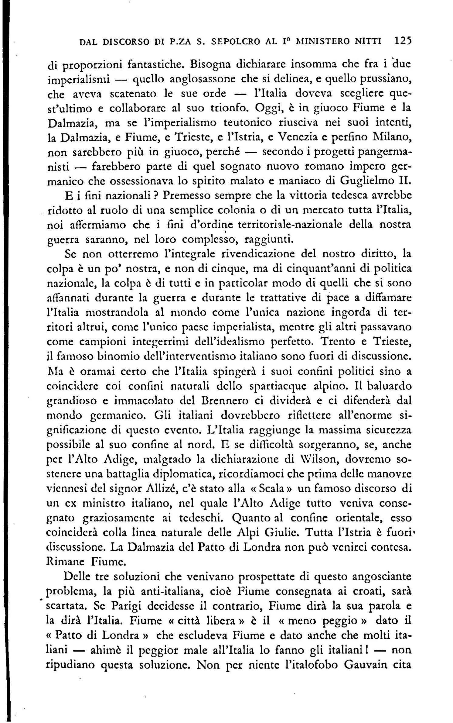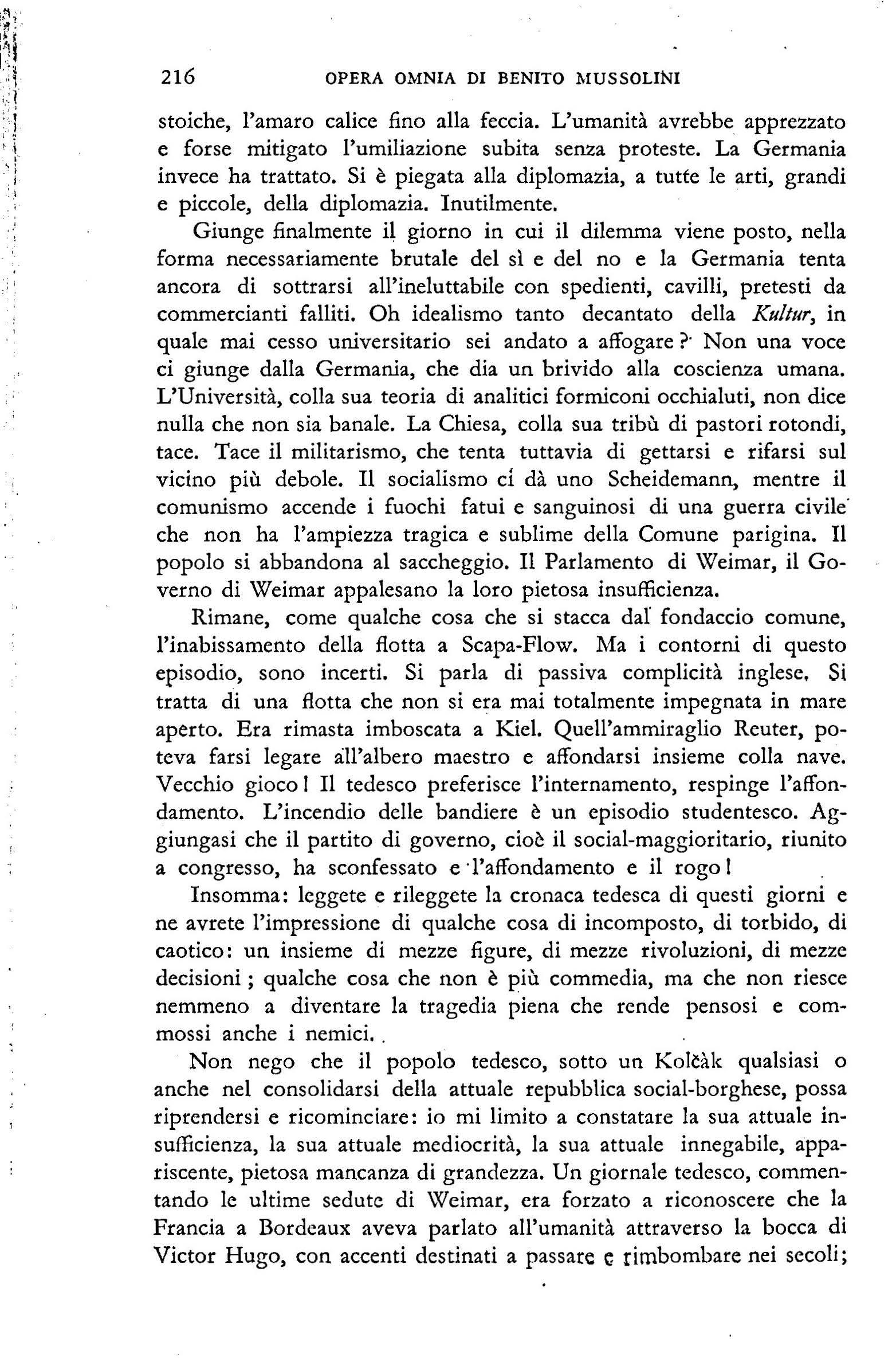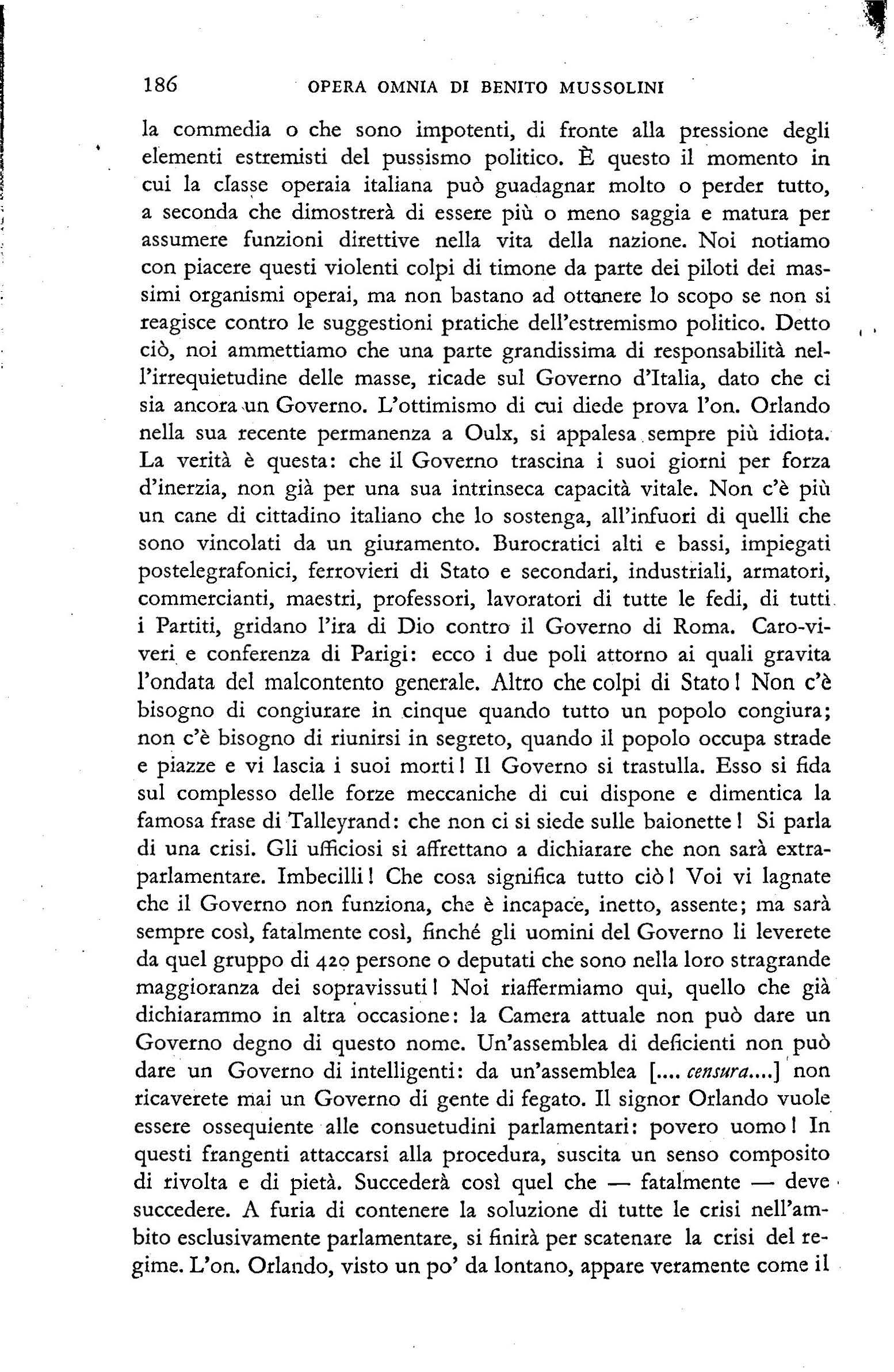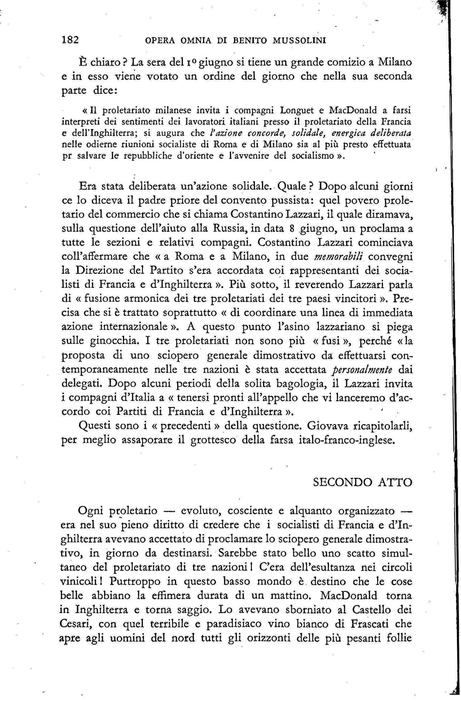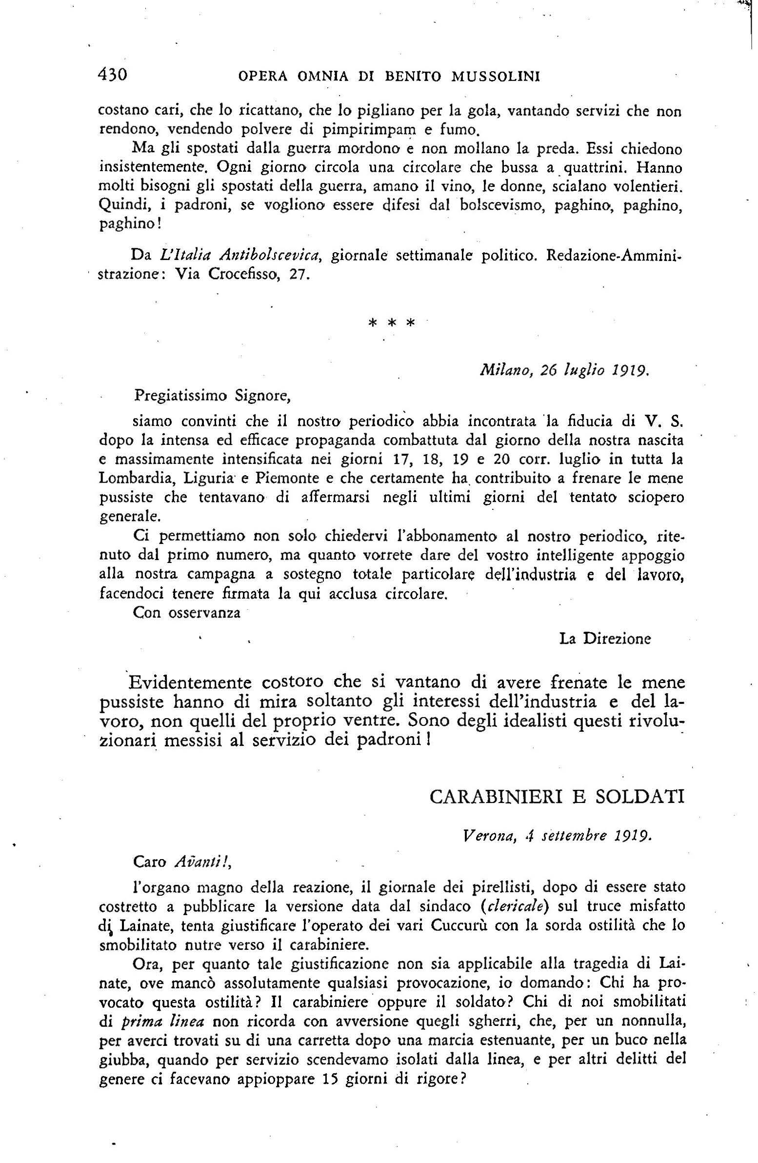 Durante questo peri<Xlo, Mussolini scrive contro il leninismo ( S); sugli avvenimenti ungheresi del 22, 23, 24 mano (10}; su un convegno.sindacalista che si terrà a Milano il 30 marzo ( 12); sulle basi essenziali e sui postulati dei fasci italiani di combattimento, sorti con l'adunata del 23 marzo 1919 (XII , 160; 14, 17, 47, 48, 117); sulle prossime elezioni generali politiche (26); sui manifesti lanciati il 4 aprile dall'unipne socialista italiana, dal partito repubblicano e dal gruppo parlamentare socialista {31, 35); su ll'associazione nazionale dei combattenti ( 37); sulla costitu:zlone, avvenuta a Milano, d i una « commissione provinciale d i avviaÌnento al lavoro» ( 40) ; sullo sciopero generale di Roma del 10 aprile (proclamato dalla camera confederale del lavoro, di t enden.ca bolscevica, col p retesto di una manifestnione proibita per Lenin), che, avversato dalla camera del lavoro, interventista, e da lla maggioranza degli operai, falli sce, gene.rand.o una gra ndiosa dimost razione pat riottica da parte d i tutte Je classi della cittadinanza ( 43, 45); confuta un articolo di Fi lippo Turati (21); p utecipa a varie assemblee del fascio milanese di combattimento ( 25, 52, 73, 105, 11 3, 174, 177) ; ha una breve polemica con· il senatore Alfredo Frassati, direttore della S tampa, nella quale si ritorna a parlare dei fondi che permisero l"uscita del Popolo d ' for{;a e si accenna ad una deposizione notarile fatta. da I da Irene D alser, g ià intima di M ussolini (44, :>S); si occupa delle rivendicazioni i taliane (S 7, 70, 7S); dei fatti di Milano del 13- lS aprile (60, 61, 64, 67, 73); dei congressi socialisti tenutisi a Parigi, Bruxelles e Huderfidd nel · marzoaprile (77); degli avvenimenti del 23-24 aprile: mentre alla conferenza della pace di Parigi continuano ancora le trattative fra le d elegazioni italiana ed all~ata per la risoluzione delle nostre questioni territoriali, il presidente W i lson dirige · un messaggio al popo lo americano nel quale combatte le a.spiiazioni italiane su Fiume e sulla Dalma-zia, d imostra come q ueste regioni devono appartenere alla J ugos lavia e confuta il patto di Londra come non rispondente più alle mutate condizioni dc-I le tcr re circumadriaticbe; l'on Orlando, con una lettera à Clcmenceau e a Lloyd George, annunéia che, in seguito alle dichiarazioni di Wi lson, la delegazione italiana lascia. Parig i ; CJemenccau, rispondendo ad un telegramma inviatogli dall'on. Luzzatti, che chi~e l' appoggio della Francia, af; fenna che nori è all'ora della fi rma della pace che si possono misconoscere gJi obblighi reciproci e che la politica francese non è quella degli stracci di carta; Orlando risponde al messaggio di Wilson; in tutta Italia h~no luogo grandi dimostrazioni di protesta contro i l mcs.saggio del presidente americano; il g overno fra ncese separa formalmente " la propria responsabilità dalriniziativa isolata e spontanea di Wilson ( 80, 82, 8'.'.i, 88, 91) ·