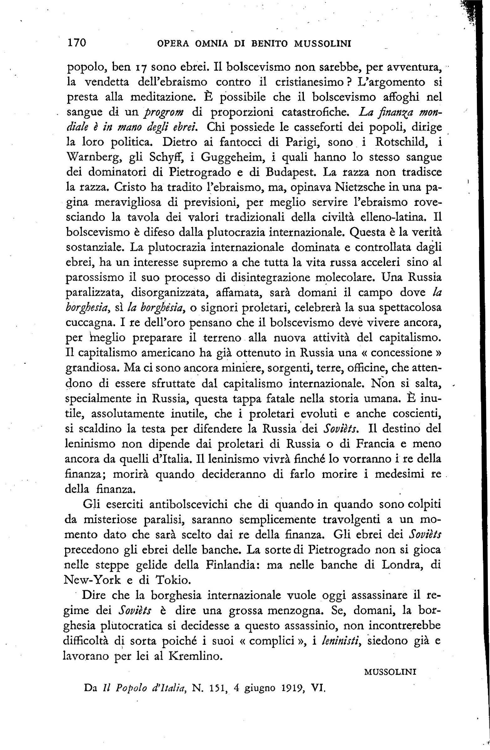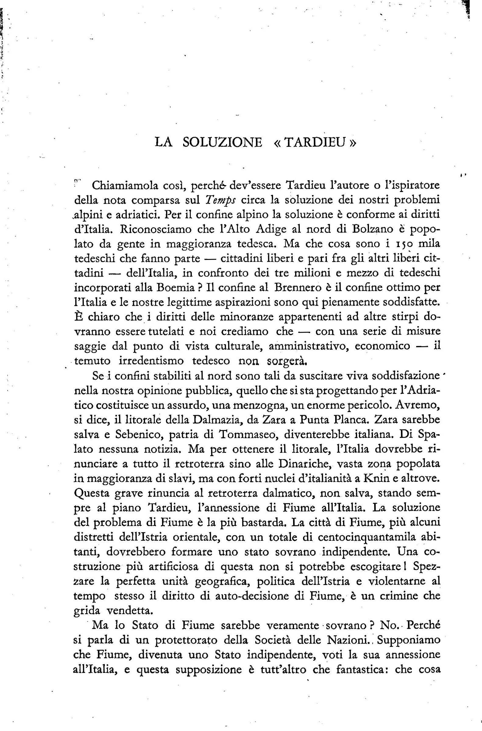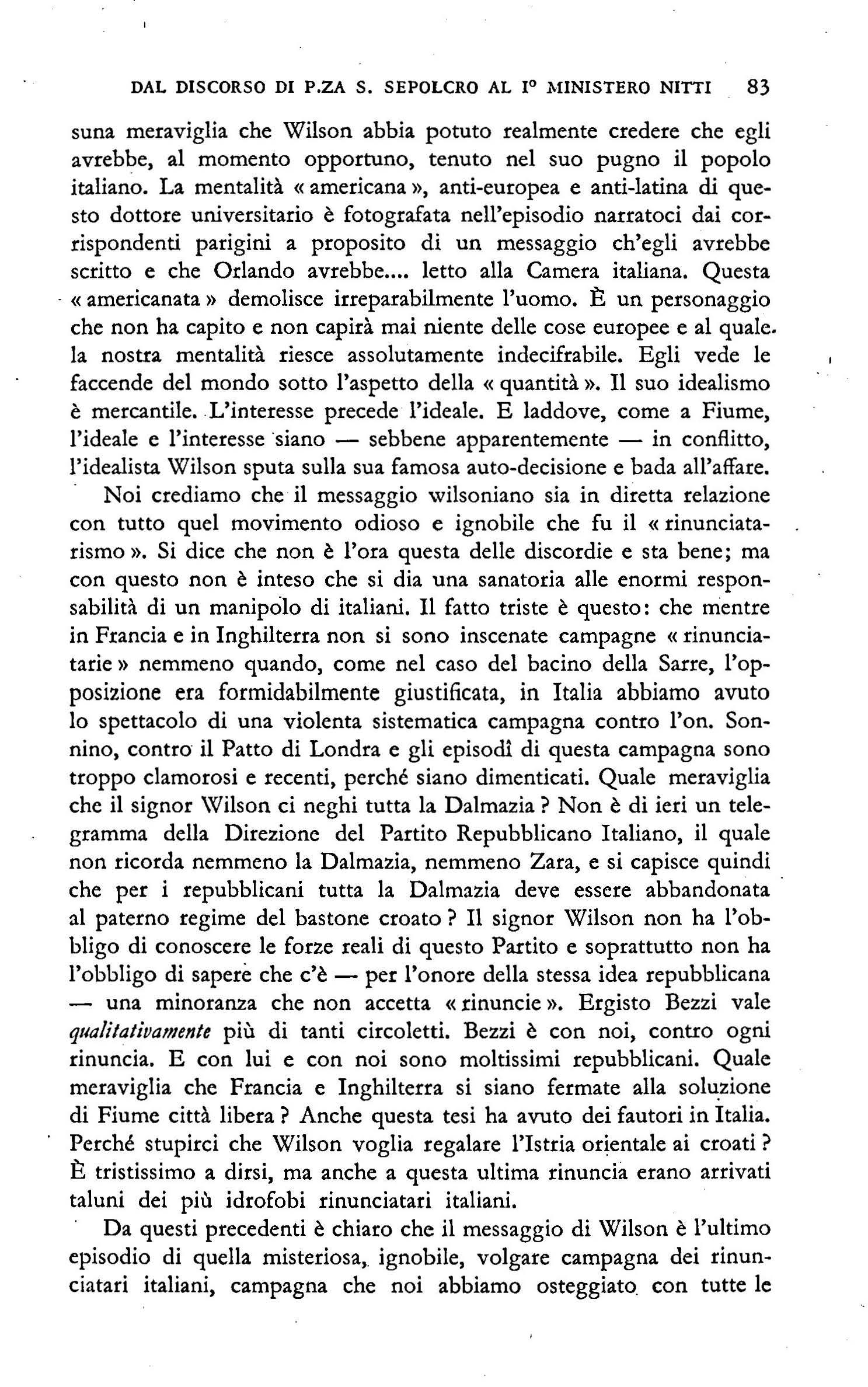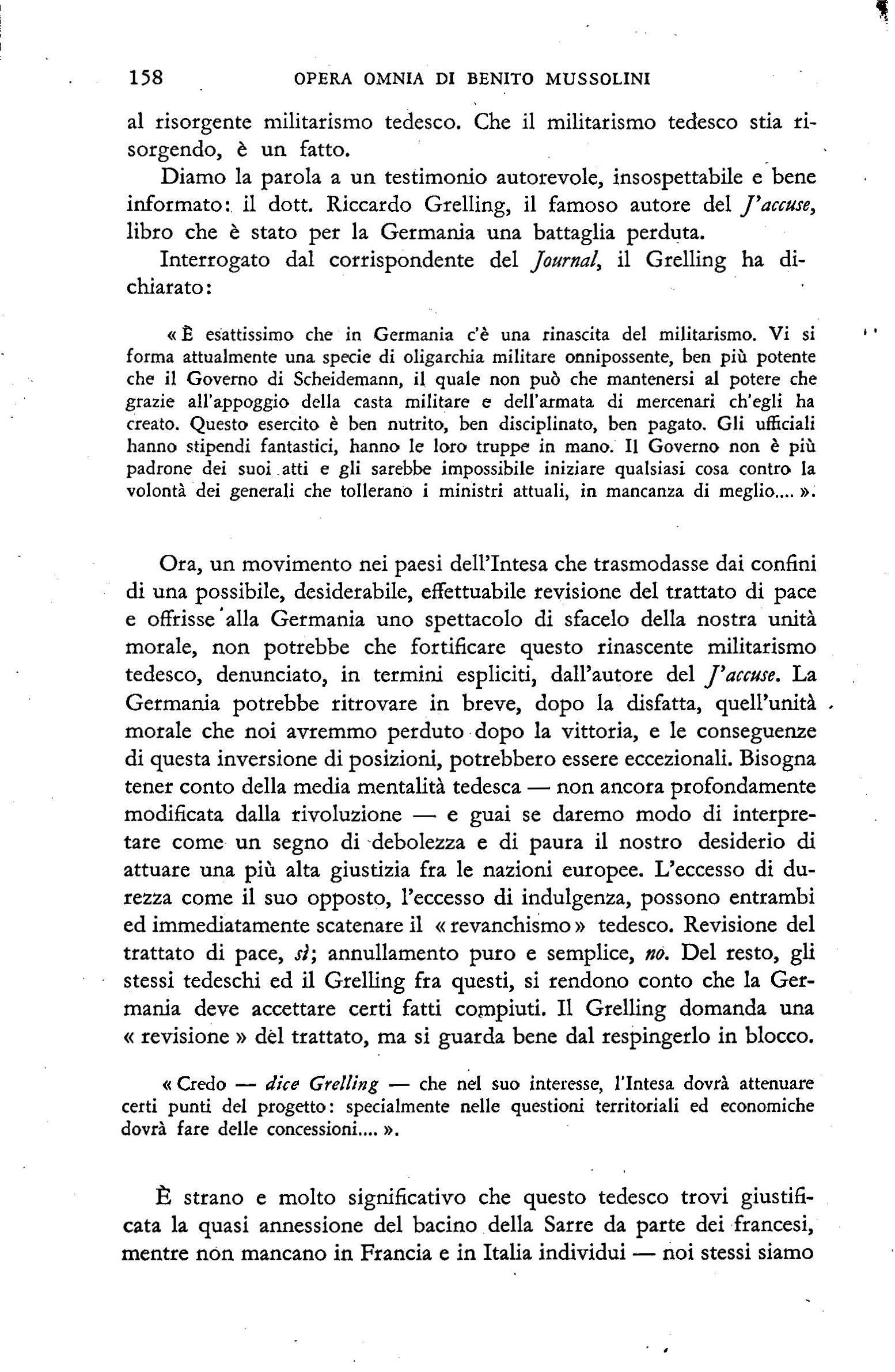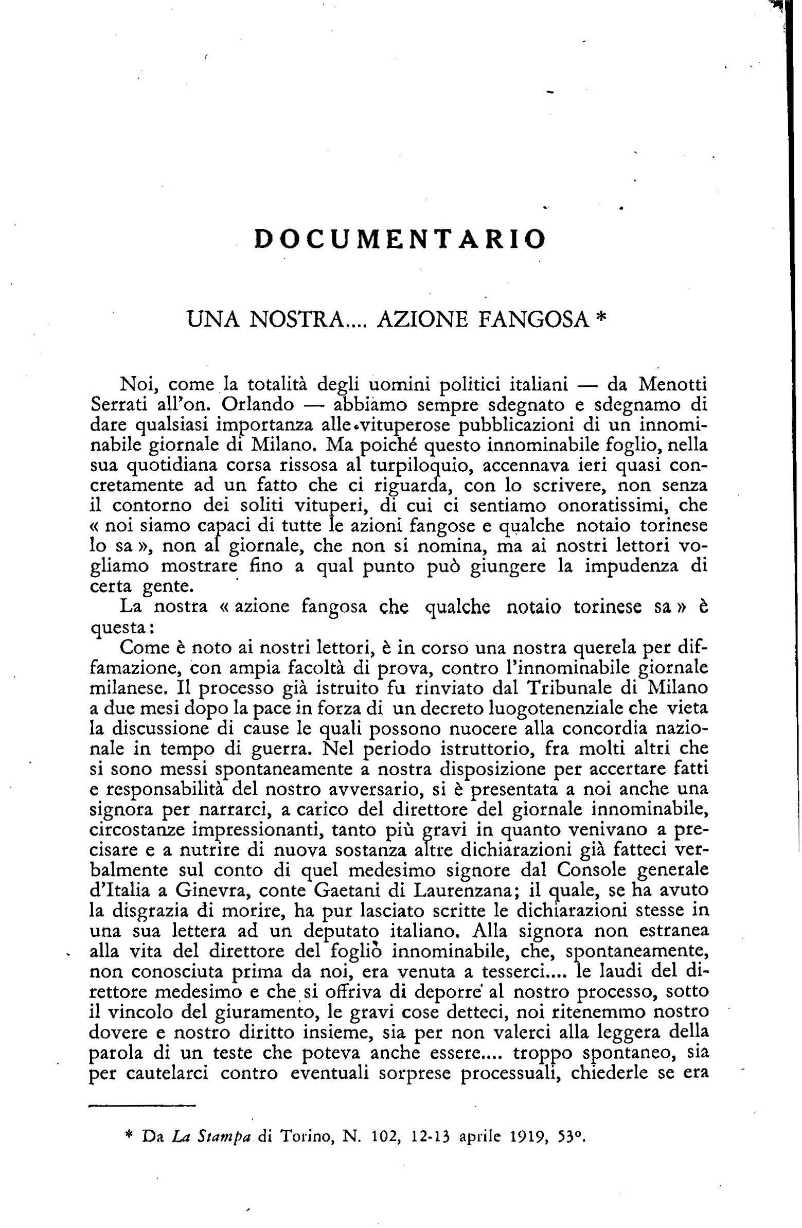Durante questo peri<Xlo, Mussolini scrive contro il leninismo ( S); sugli avvenimenti ungheresi del 22, 23, 24 mano (10}; su un convegno.sindacalista che si terrà a Milano il 30 marzo ( 12); sulle basi essenziali e sui postulati dei fasci italiani di combattimento, sorti con l'adunata del 23 marzo 1919 (XII , 160; 14, 17, 47, 48, 117); sulle prossime elezioni generali politiche (26); sui manifesti lanciati il 4 aprile dall'unipne socialista italiana, dal partito repubblicano e dal gruppo parlamentare socialista {31, 35); su ll'associazione nazionale dei combattenti ( 37); sulla costitu:zlone, avvenuta a Milano, d i una « commissione provinciale d i avviaÌnento al lavoro» ( 40) ; sullo sciopero generale di Roma del 10 aprile (proclamato dalla camera confederale del lavoro, di t enden.ca bolscevica, col p retesto di una manifestnione proibita per Lenin), che, avversato dalla camera del lavoro, interventista, e da lla maggioranza degli operai, falli sce, gene.rand.o una gra ndiosa dimost razione pat riottica da parte d i tutte Je classi della cittadinanza ( 43, 45); confuta un articolo di Fi lippo Turati (21); p utecipa a varie assemblee del fascio milanese di combattimento ( 25, 52, 73, 105, 11 3, 174, 177) ; ha una breve polemica con· il senatore Alfredo Frassati, direttore della S tampa, nella quale si ritorna a parlare dei fondi che permisero l"uscita del Popolo d ' for{;a e si accenna ad una deposizione notarile fatta. da I da Irene D alser, g ià intima di M ussolini (44, :>S); si occupa delle rivendicazioni i taliane (S 7, 70, 7S); dei fatti di Milano del 13- lS aprile (60, 61, 64, 67, 73); dei congressi socialisti tenutisi a Parigi, Bruxelles e Huderfidd nel · marzoaprile (77); degli avvenimenti del 23-24 aprile: mentre alla conferenza della pace di Parigi continuano ancora le trattative fra le d elegazioni italiana ed all~ata per la risoluzione delle nostre questioni territoriali, il presidente W i lson dirige · un messaggio al popo lo americano nel quale combatte le a.spiiazioni italiane su Fiume e sulla Dalma-zia, d imostra come q ueste regioni devono appartenere alla J ugos lavia e confuta il patto di Londra come non rispondente più alle mutate condizioni dc-I le tcr re circumadriaticbe; l'on Orlando, con una lettera à Clcmenceau e a Lloyd George, annunéia che, in seguito alle dichiarazioni di Wi lson, la delegazione italiana lascia. Parig i ; CJemenccau, rispondendo ad un telegramma inviatogli dall'on. Luzzatti, che chi~e l' appoggio della Francia, af; fenna che nori è all'ora della fi rma della pace che si possono misconoscere gJi obblighi reciproci e che la politica francese non è quella degli stracci di carta; Orlando risponde al messaggio di Wilson; in tutta Italia h~no luogo grandi dimostrazioni di protesta contro i l mcs.saggio del presidente americano; il g overno fra ncese separa formalmente " la propria responsabilità dalriniziativa isolata e spontanea di Wilson ( 80, 82, 8'.'.i, 88, 91) ·