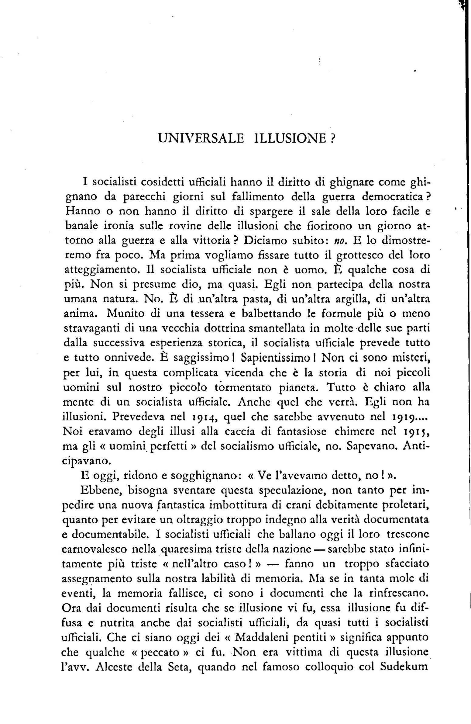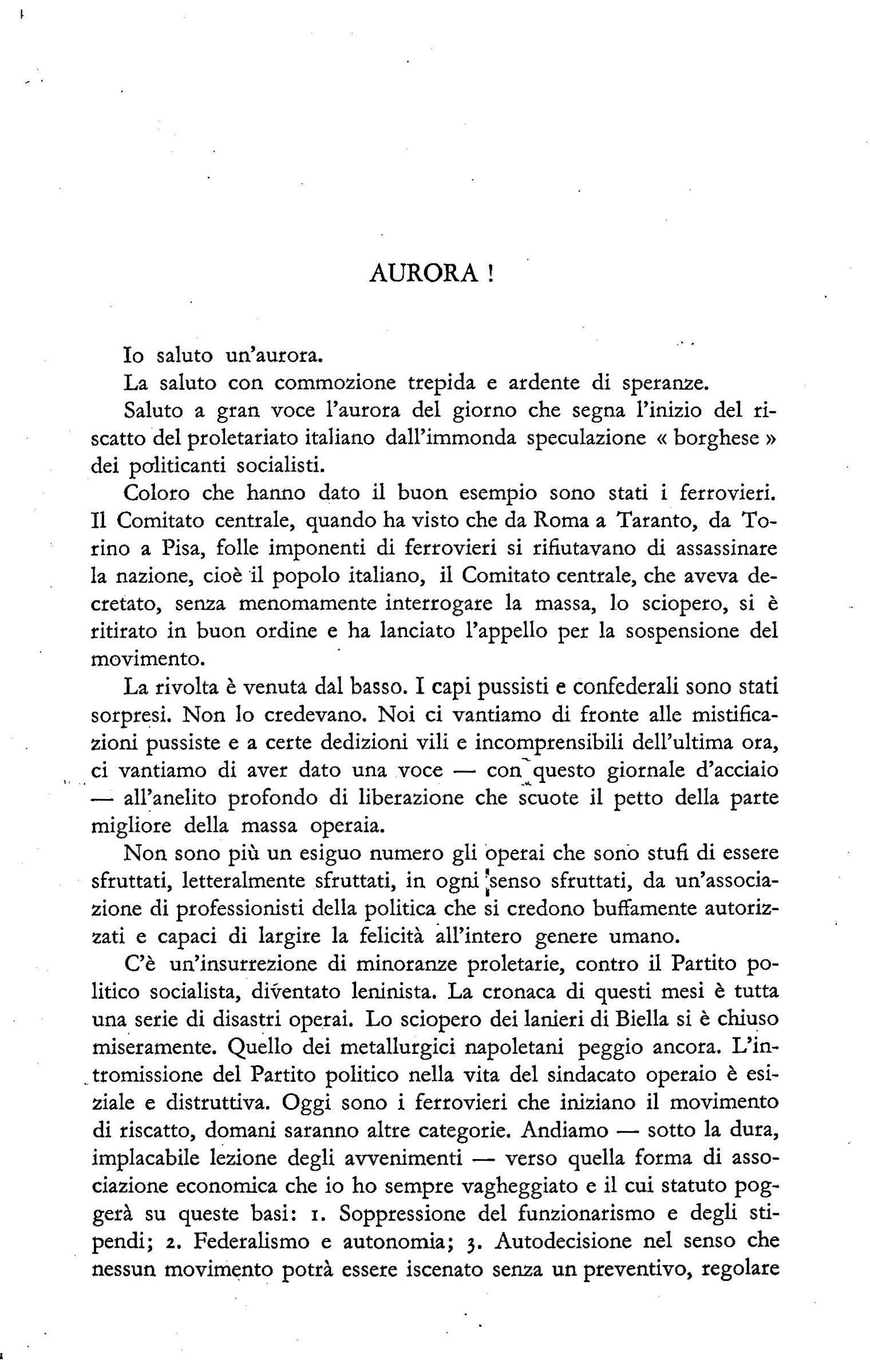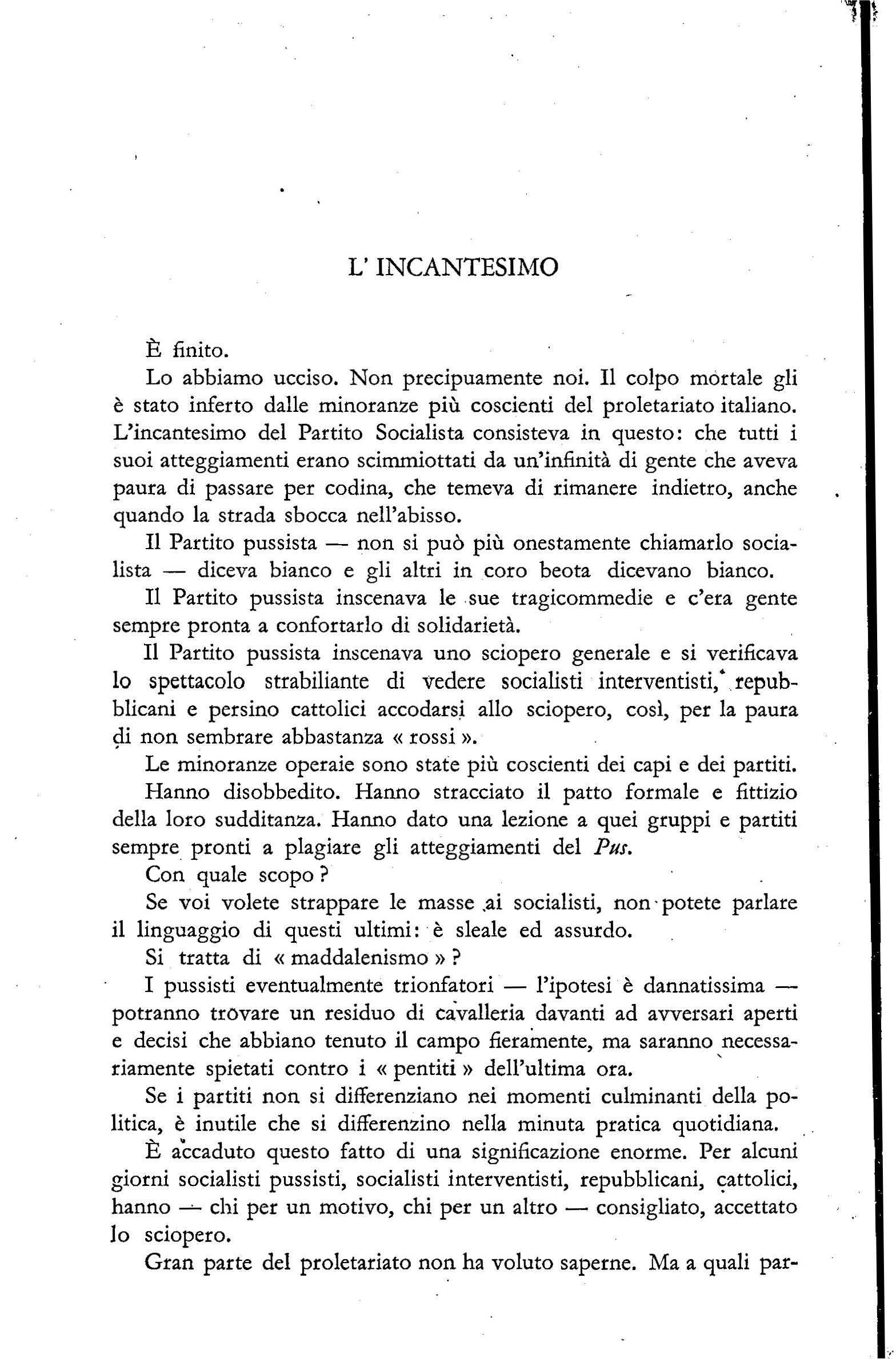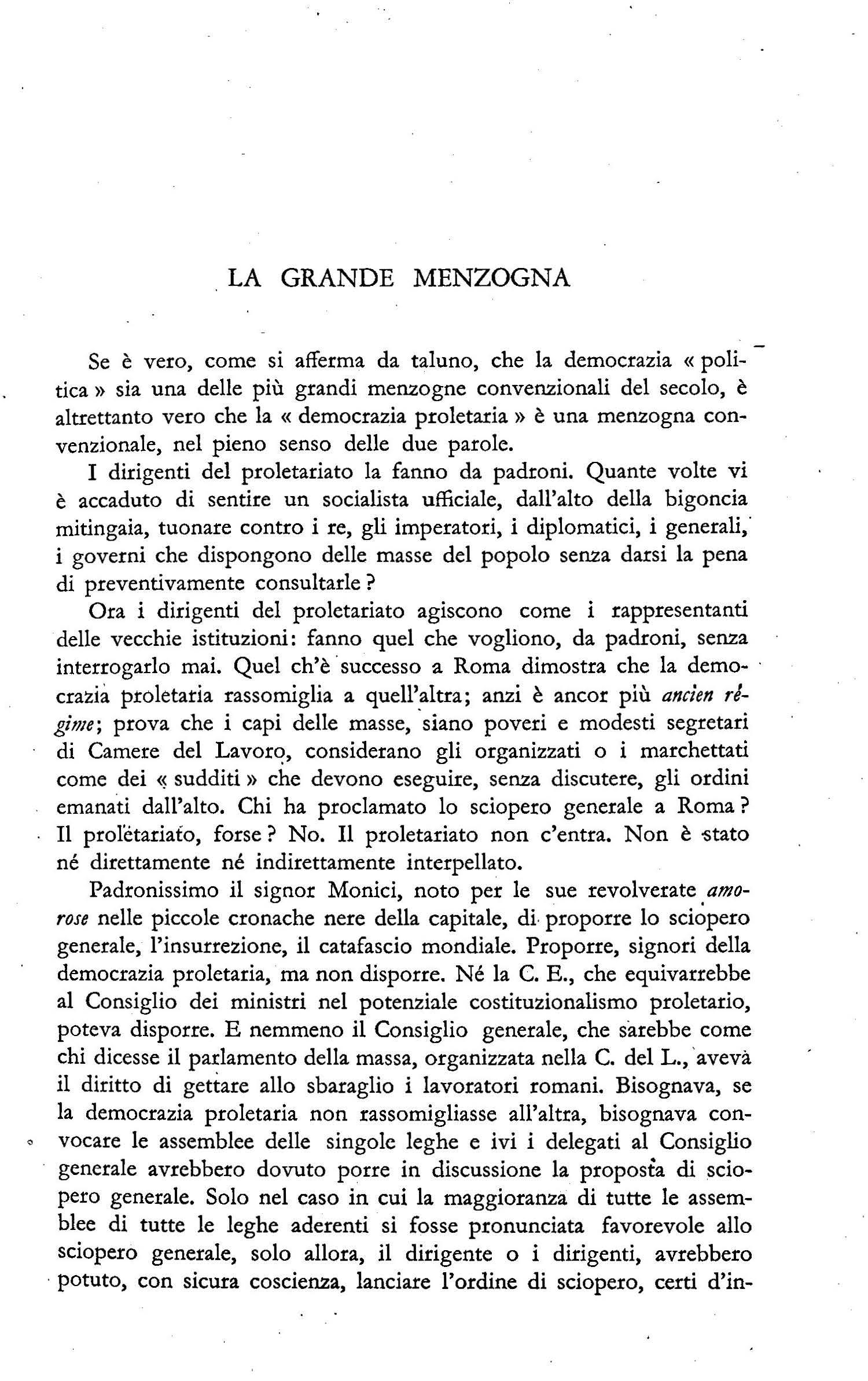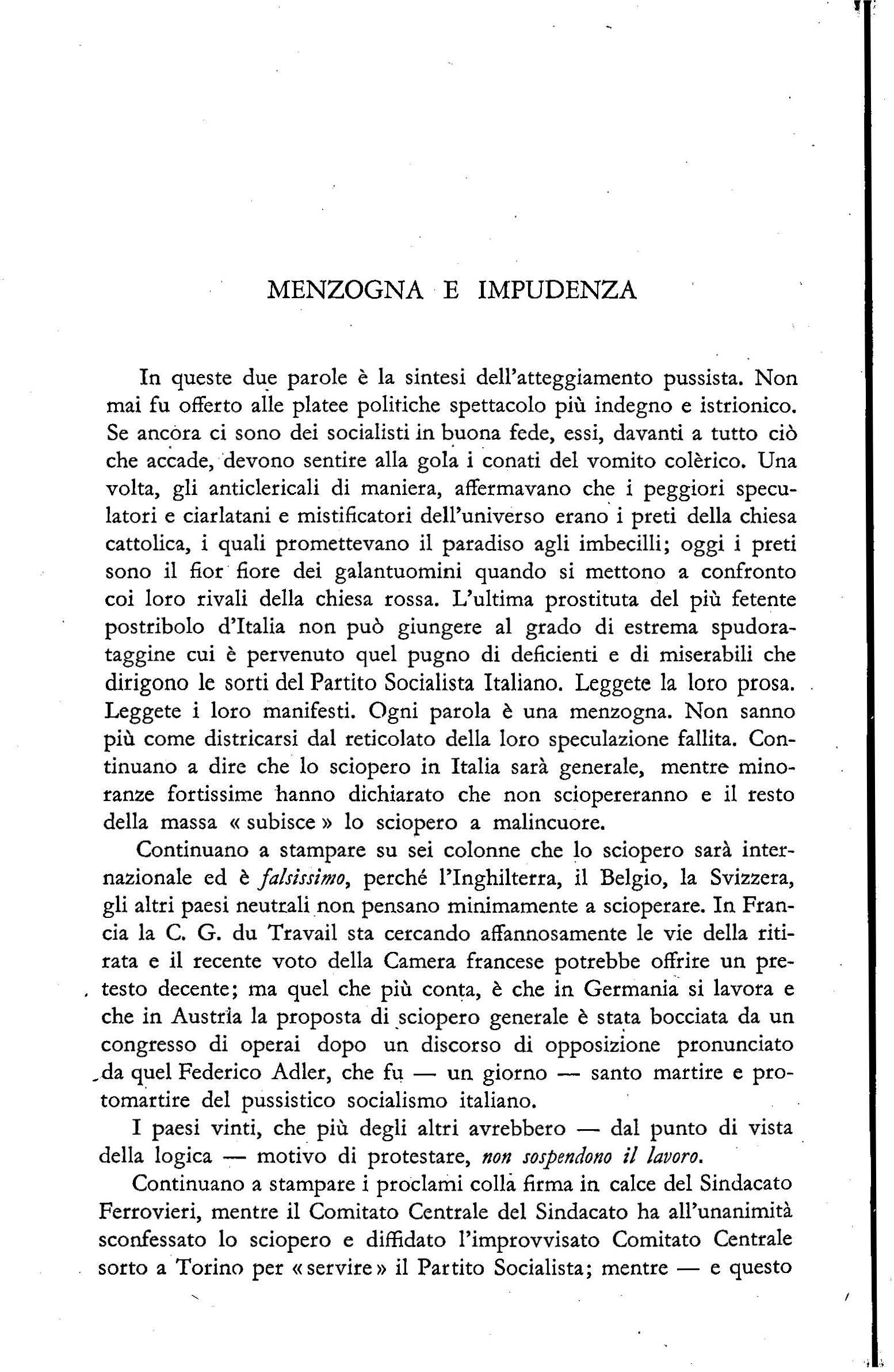 3. La nost ra opposizione dichiarat a al Partico Socialista Ufficiale e aì suoi eve ntuali colpi di testa d ittatoriali, non è suffice nte, per qua nti sforzi si facciano da p art e dei soliti mistificato.ri, a p resentarci come nemici delle classi lavoratrici. La collezione del nostto giornale è· la testimonianza irrefutabile del nostro atteggiamento cli simpatia v erso le màsse lavoratrici, non escluse quelle confederaH, Ma n oi ci siamo sempre rifiutati e ci rifiutiamo di identificare il proleta.riato, con quella speciale o rganizzazione politico-ecclesiastica che si chiama il Partito Socialista. Noi ci siamo sempre rifiutati e ci rifiutiamo cli riconoscere il diritto del Partito Socialista alla tutela delle m asse lavocat dci. Di questa opinìone è anche l'on. Rigola e non è so lo. D al momento che il proletariato stesso, attraverso le sue manifcstazionì di classe, ripugna dalla dittatura, è semplicemente gro ttesco che q~esta dittatura diventi programma d' azione d i u na associazione che !accoglie un numero assolutamente insignifican te di proletari autentici, Ostilità, dunque, al Pa.rtito Socialista Ufficiale, per il suo atteggiamento che ha fatto correre u n rischio spaven tevole a lla nostra nazione e al mondo e· pet i suoi odierni propositi liberticidi, ma n ess una ostilità contro le masse lavoratrici, d elle quali riconosciamo i postulati e per le quali siamo disposti a lottare. Sarebbe un errore ·grosso, sciocco e pericoloso, mettere nello stesso fascio e giudicare alla stessa stregua Partito Socialista e m assa lavoratrice. Tra l'uno e l'altra corrono d ifferenze essen2iali. Il primo non può dare che una. rivolta distrut tiva, di pura e semplice rappresaglia ; la massa operaia, affinata e raffinata, nelle sue tipiche organizzazioni, può v eramente iniziare un'e poca nu ova nella stotia umana. Insomma il Partito è parassitario ed eser cite_reb be ciuindi il pot~.re a totale b eneficio materiale e m o rale dei tesserati, il proletariato invece p r oduttore e straccerebbe la tessera e confonderebbe le classi