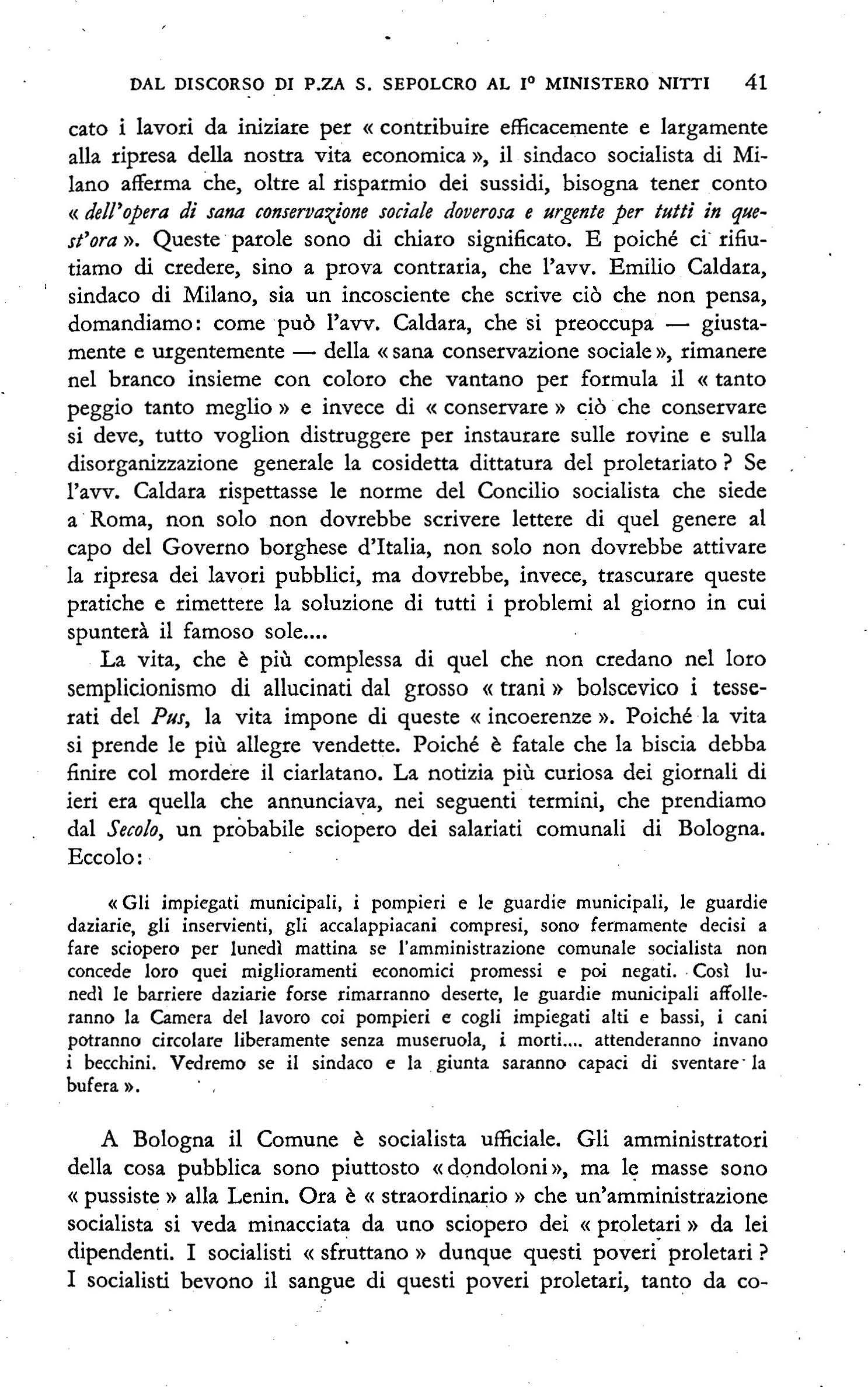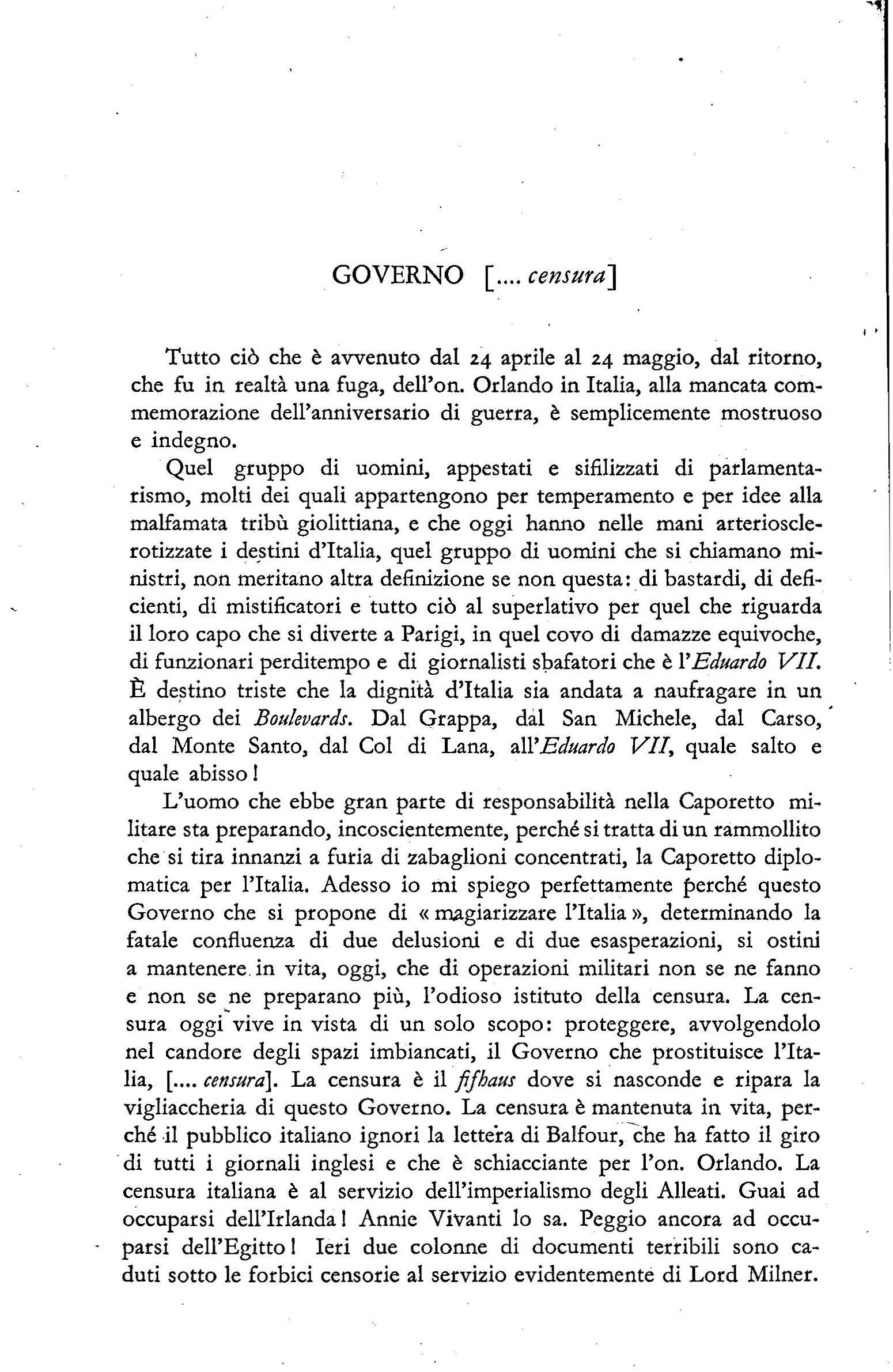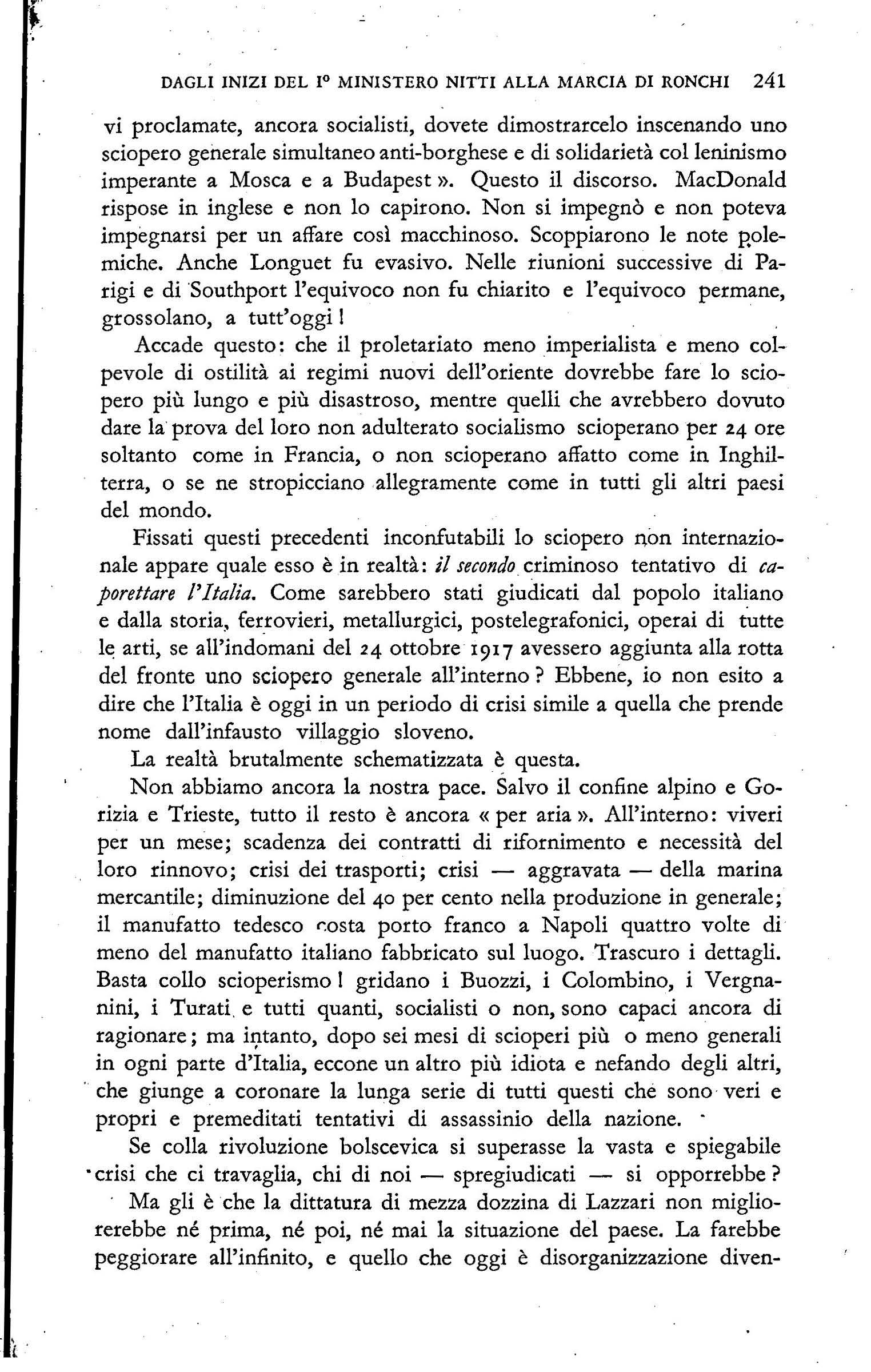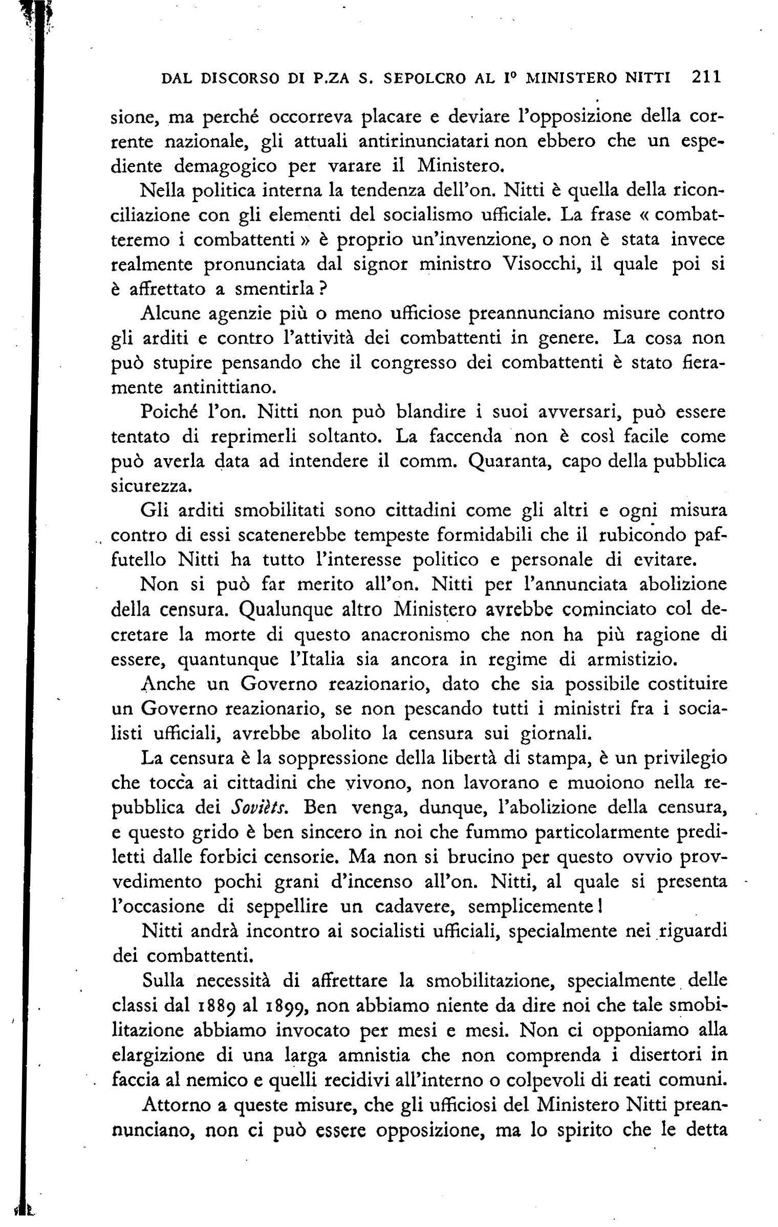 Nei giorni seguenti, attacca il sen atore Frassati (150); illveis,e contro O rlando e la sua politica ( 154, 160); si occupa d ella revisi one dd trattato di Versag lia (157, 171) e del progetto del ministro francese 'l'ardieu ( 16 2); commenta un telegramma tliretto dal coru;iglio nazionale di Fiume a ll'on Orlando (164) e u n mess~ggio inviato dal medesimo cons ig lio al senato americano e alla conferenza della pace (166); scri ve su l regime russo ( 168); su lla crisi interna provocata dal caroviveri (175, 179); su una missione in Italia di socialisti franct"Si ed inglesi (18 1); su alcune dichiarazioni d i Brun o Buozzi in merito a llo sciopero g enerale di N apoli d eU-8, 9, 10 g iugno, effettuato per solida.rietà con i rnetaJlurgici, i quali sono in agitazione da cinquanta g iomi (1 ~5); sulle ostilità da palle dd governo ungh erese di Be la Kun ( 188); su llo sciopero dei trasporti svoltosi a Parigi dal 13 al 14 giugno (19 1); su un d iscorso che !'on. Orlando dovrebbè pronunciare ·alla riapertura di Montecitorio ( 192); su!repisodio di Noisy le Roi del 16 siugno (19,).