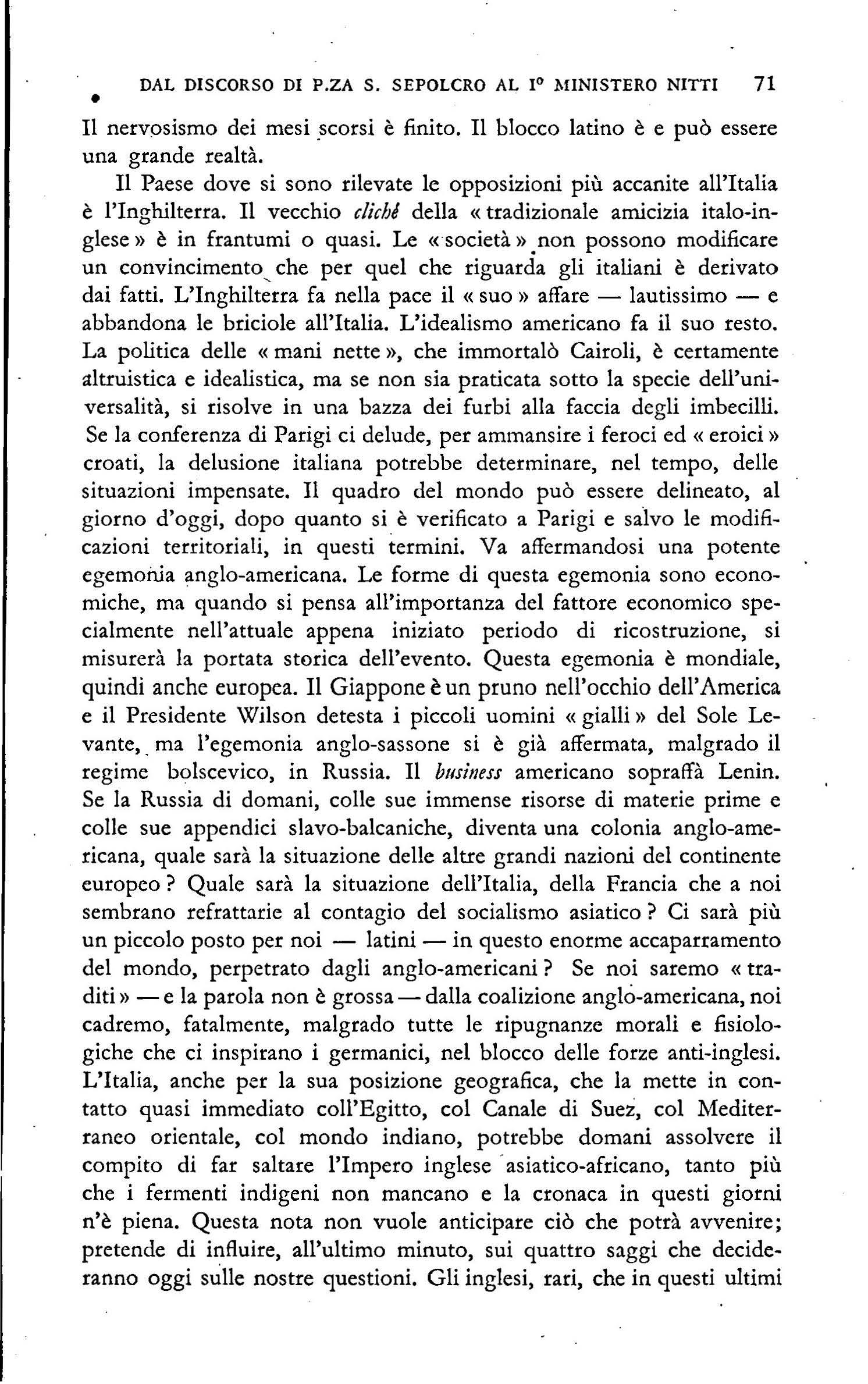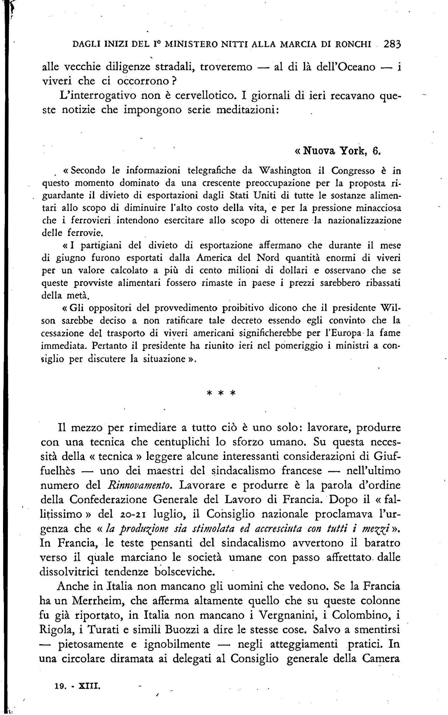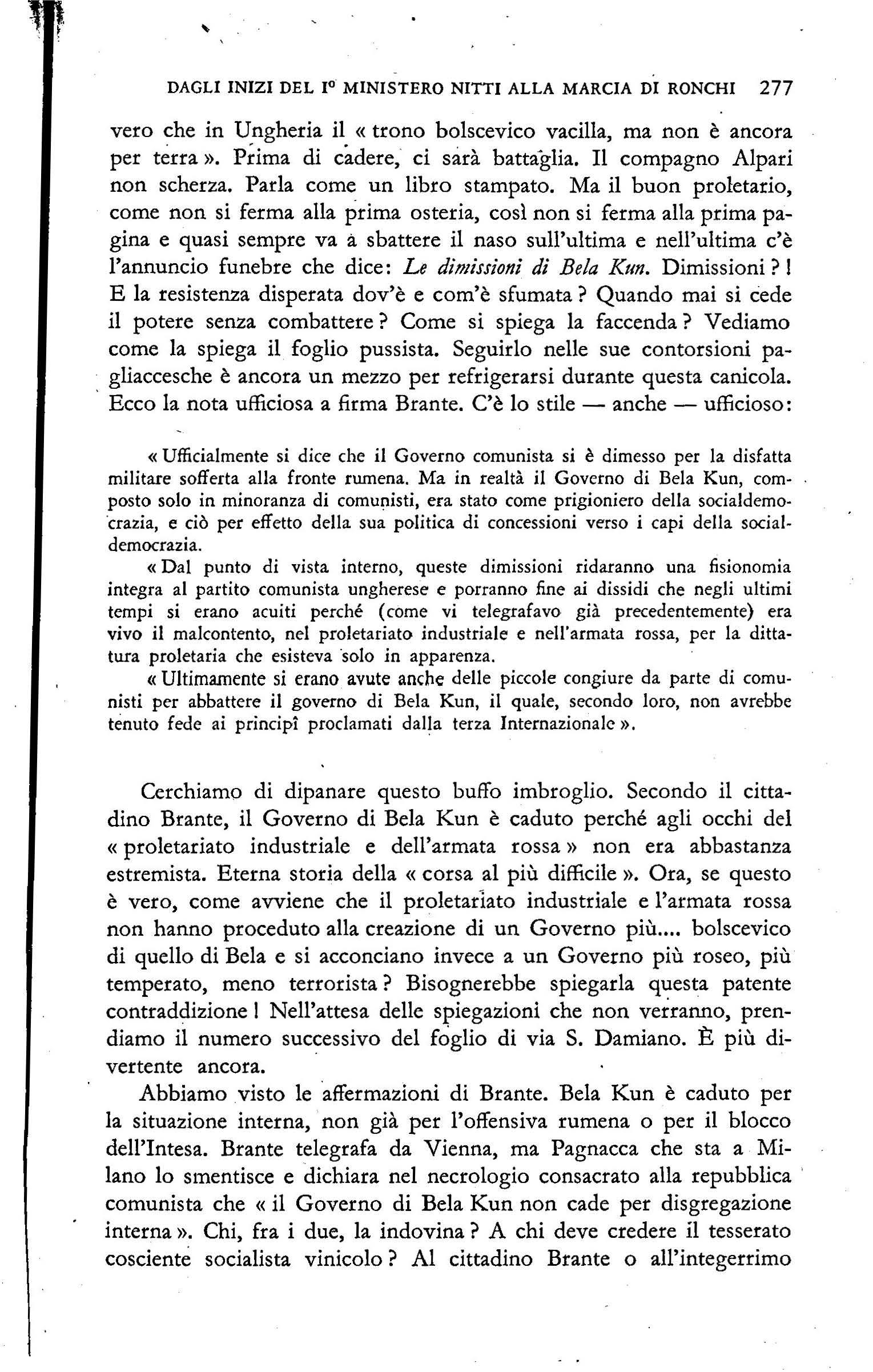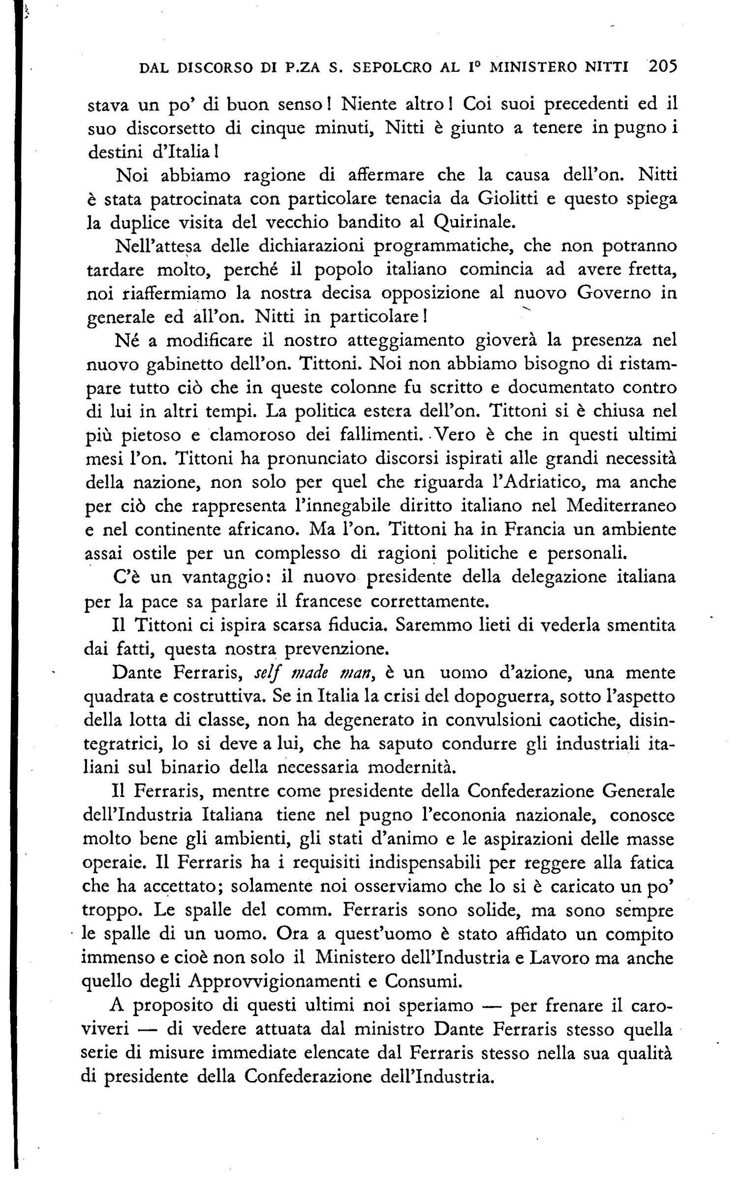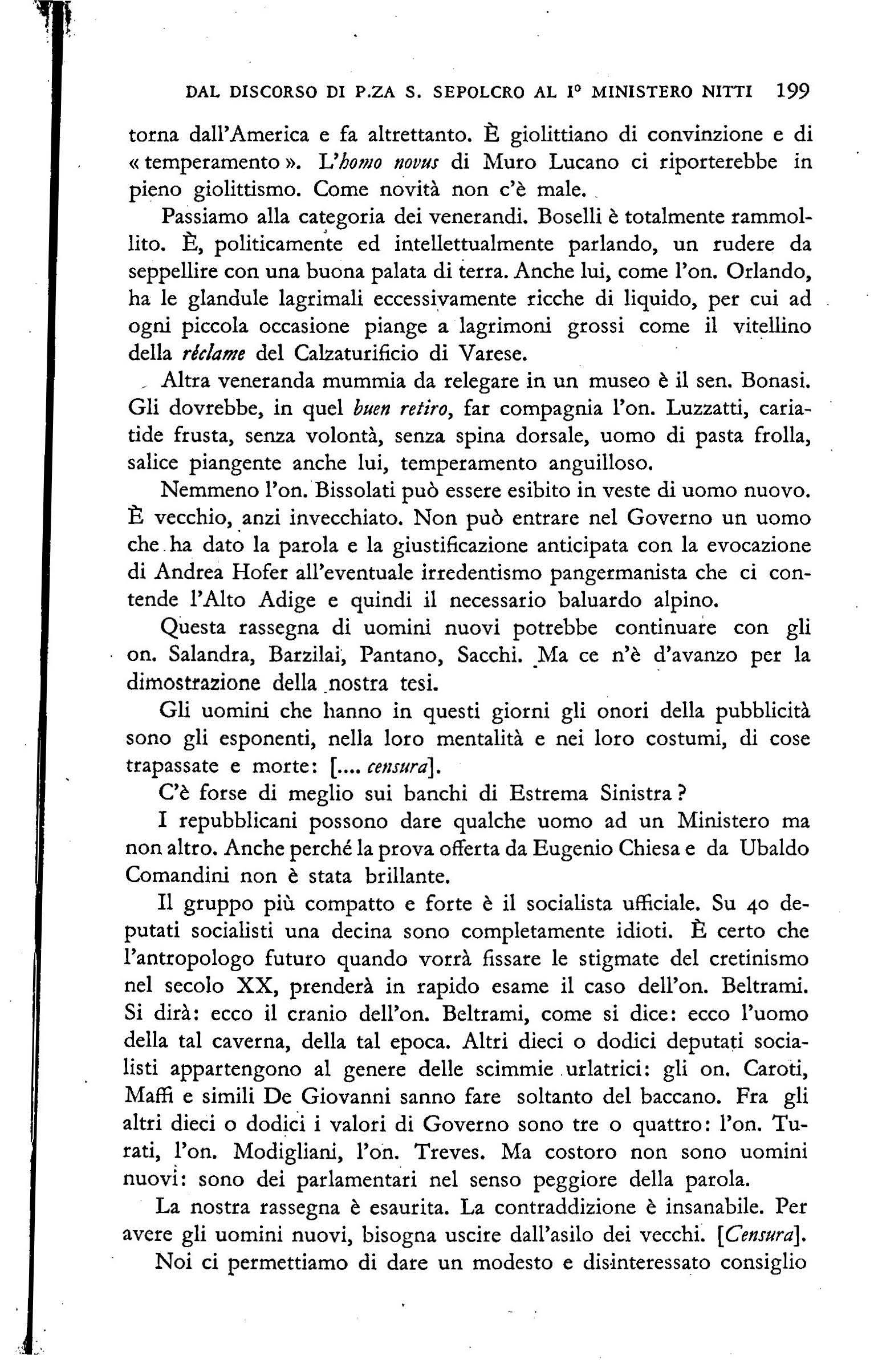 Nei giorni seguenti, attacca il sen atore Frassati (150); illveis,e contro O rlando e la sua politica ( 154, 160); si occupa d ella revisi one dd trattato di Versag lia (157, 171) e del progetto del ministro francese 'l'ardieu ( 16 2); commenta un telegramma tliretto dal coru;iglio nazionale di Fiume a ll'on Orlando (164) e u n mess~ggio inviato dal medesimo cons ig lio al senato americano e alla conferenza della pace (166); scri ve su l regime russo ( 168); su lla crisi interna provocata dal caroviveri (175, 179); su una missione in Italia di socialisti franct"Si ed inglesi (18 1); su alcune dichiarazioni d i Brun o Buozzi in merito a llo sciopero g enerale di N apoli d eU-8, 9, 10 g iugno, effettuato per solida.rietà con i rnetaJlurgici, i quali sono in agitazione da cinquanta g iomi (1 ~5); sulle ostilità da palle dd governo ungh erese di Be la Kun ( 188); su llo sciopero dei trasporti svoltosi a Parigi dal 13 al 14 giugno (19 1); su un d iscorso che !'on. Orlando dovrebbè pronunciare ·alla riapertura di Montecitorio ( 192); su!repisodio di Noisy le Roi del 16 siugno (19,).