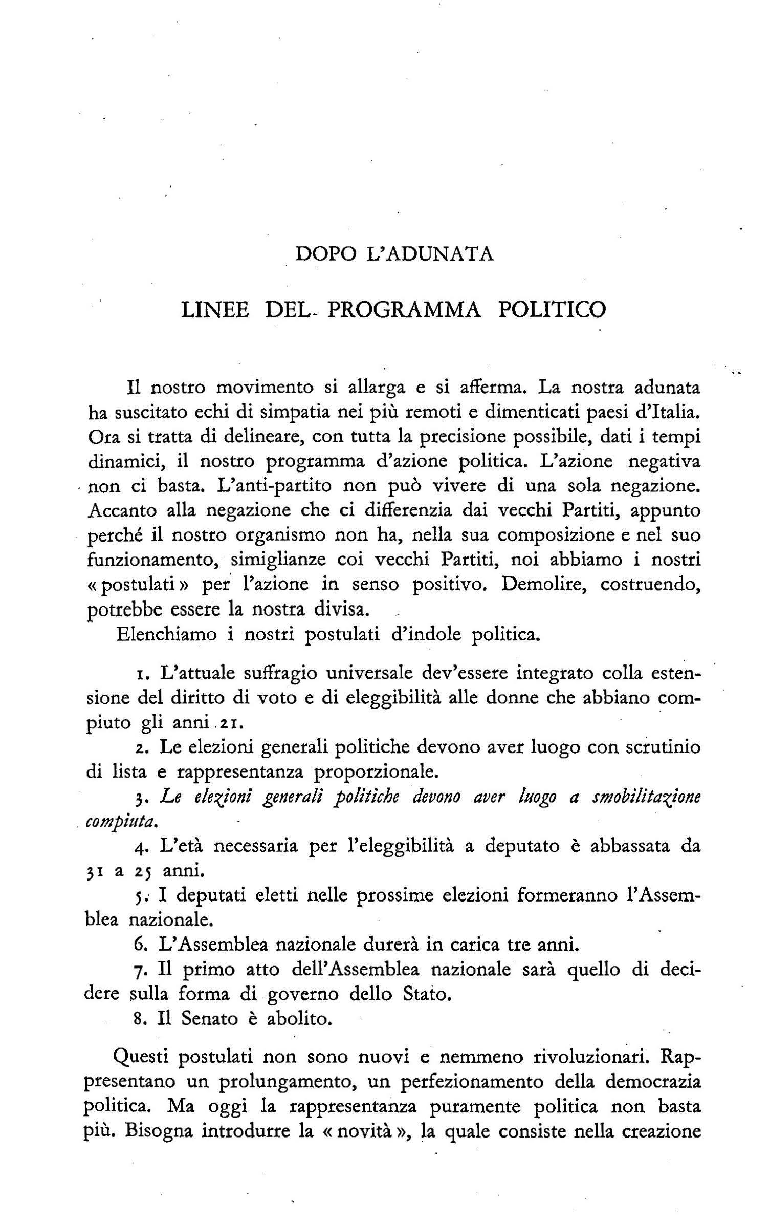 Il nostro movimento si allarga e si afferma. La nostra adunata ha suscitato echi di simpatia nei più remoti e dimenticati paesi d'Italia. Ora si tratta di delineare, con tutta la precisione possibile, dati i tempi dinamici, il nostro programma d'azione p olitica, L'azione negativa non ci b asta. L 'anti-pa.ctito non può vivere di una sola negazione. Accanto alla negazione c he ci differenzia dai vecchi Partiti, appunto perché il nostro organismo non h a, n ella sua composizione e nel suo funzionamento, simiglianze coi vecchi Partiti, noi abbiamo i nostri «postulati» per' l'azione in senso positivo. Demolire, costruendo, potrebbe essere la nostra divisa.