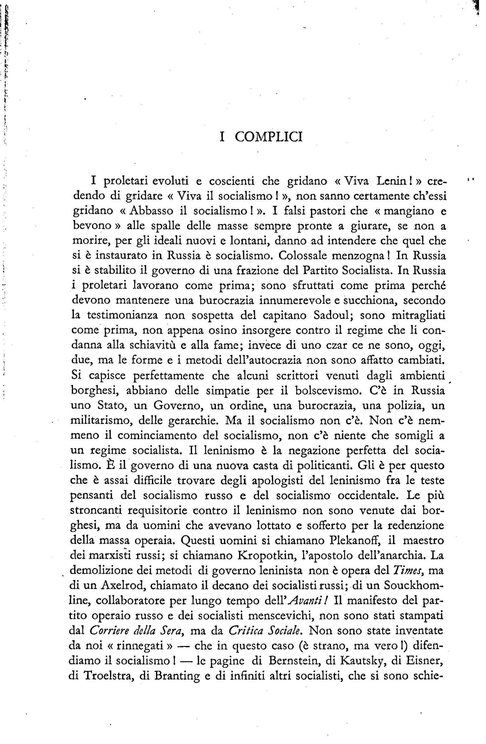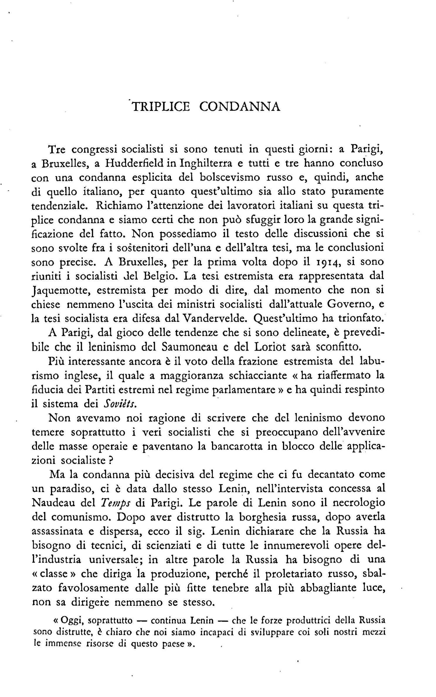 Noi sottoponiamo queste voci e queste testimonianze di autentici socialisti agli operai italiani, per indurli a riflettere, primi di avventurarsi in un esperimento catastrofico, i cui eventuali benefici ricadrebbero su una cricca di politicanti « professionali » del socialismo. Davanti a certe <( sospette » ammissioni borghesi, la voce di questi socialisti russi1 norvegesi, francesi acquista ancor magg ior valore e più acuta risonanza. Noi crediamo nostro dovere mettere in g uardia la classe operaia italiana contro le facili suggestioni che vengono dall'or iente slavo. Se domani si avvererà il disastro, non n e porter emo le dure responsabilità.