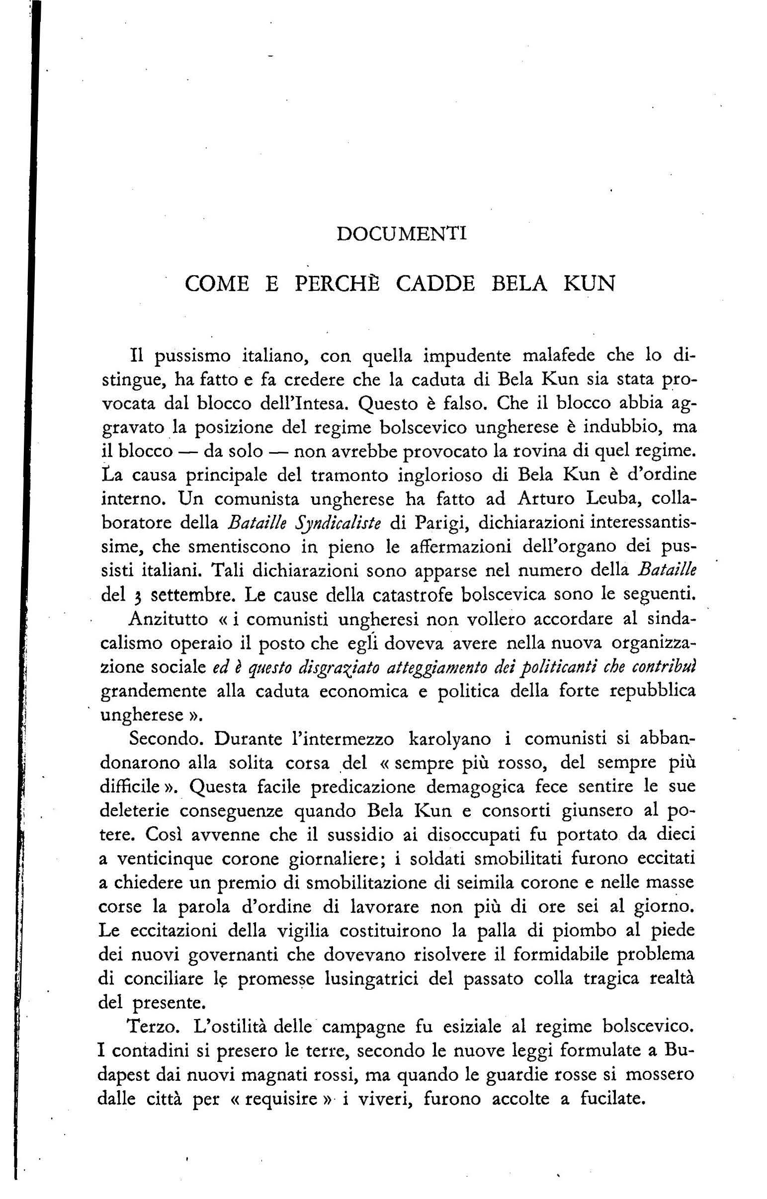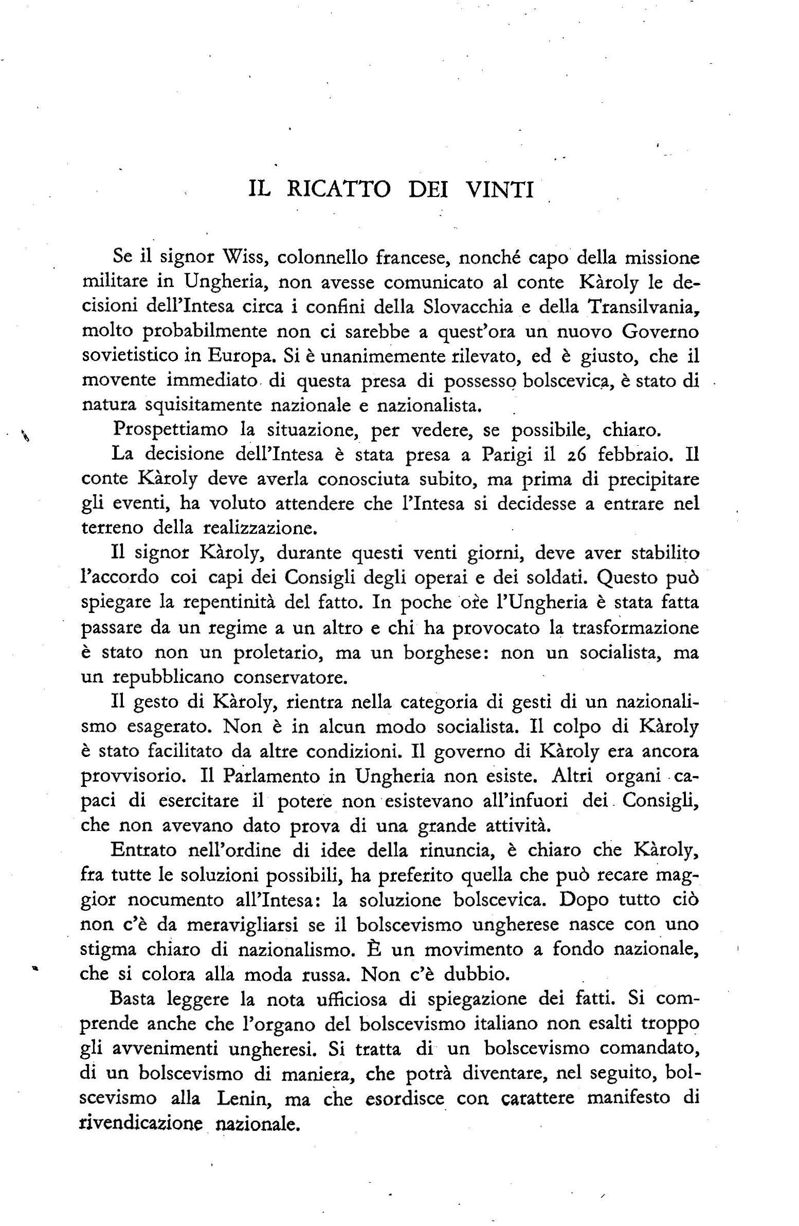 Basta leggere la nota ufficiosa di spiegazione dei fatti. Si comprende anche che l' organo del bolscevismo italiano non esalti troppo gli avvenimenti ungheresi Si tratta di un bolscevismo comandato, dJ un bolscevismo di maniera, che potrà diventare, nel seguito, bolscevismo alla Lenin, ma che esordisce con carattere manifesto di rivendicazjonc nazionale.