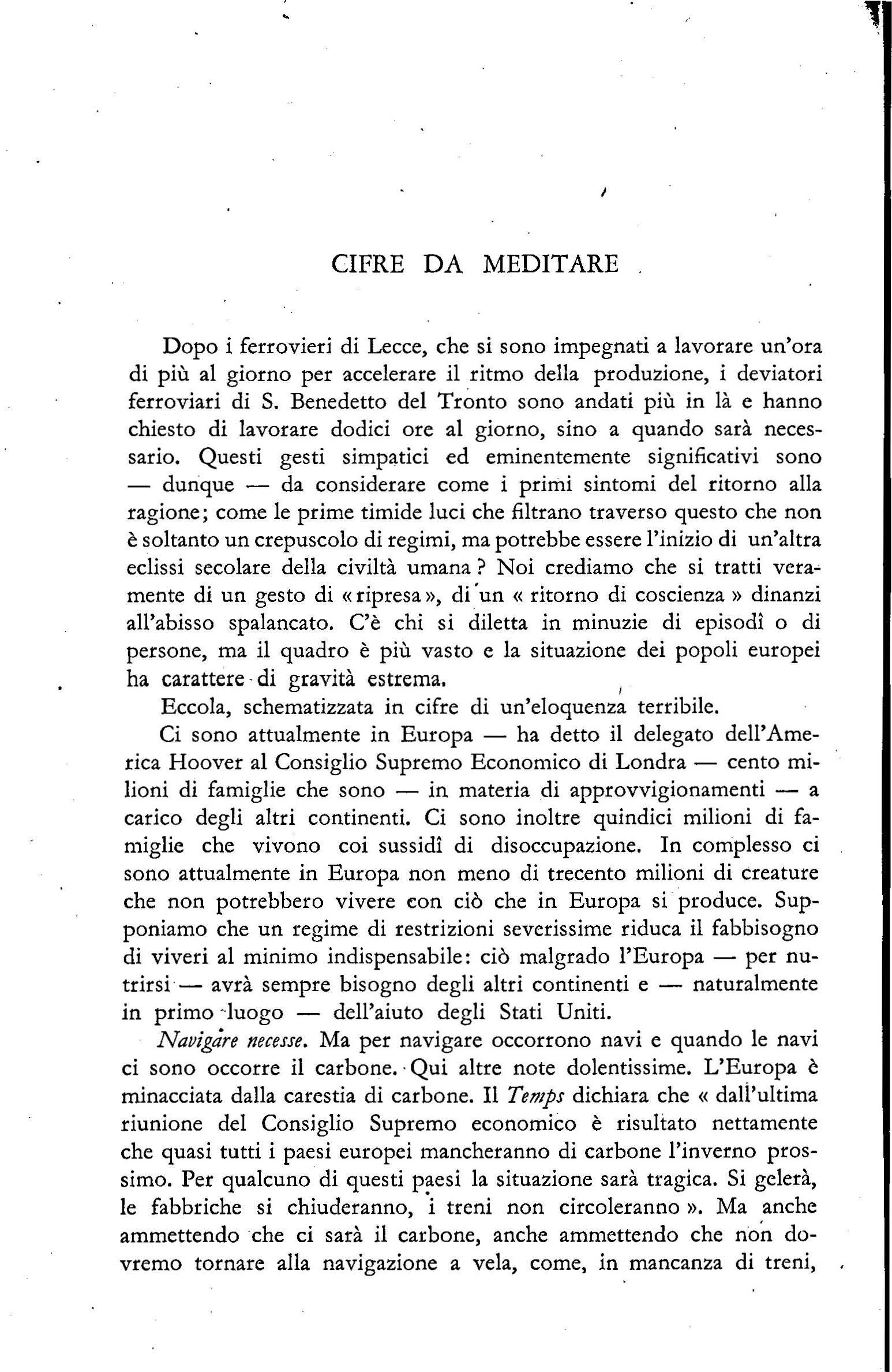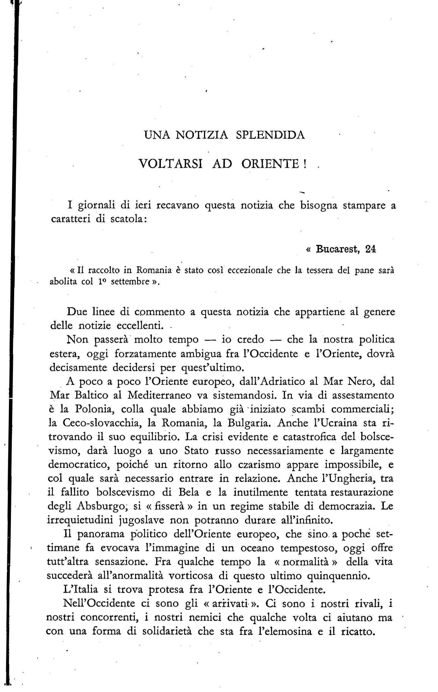 ·In s intesi, si può condivide re l'opinione generale che il comunismo ung herese sia una truffa e un rica tto. Non ci avventuriamo sul terreno sdruccio levole del.le ipotesi. Ci limitiamo ad affermare che se la conferenza di Parigi, invece di menare il can pe r l'aia societaria, avesse agito con magg ior sollecitudine, il grosso incidente mag iaro non ci sarebbe stato. È rigidamente esatto. affermare che l'Intesa fa nella pace, quello che faceva durante la g uerra. Si trastulla nel dett aglio e si ·r iprende soltanto quando le piombano sul capo le tegole duris sime della realtà. Se la pace « perfetta » è i mpossibile, ci diano u na p ace u mana. Se i diplomatici non districano la matassa, ci pensìno i generali. Meglio anticipare che rinviare all'infinit o