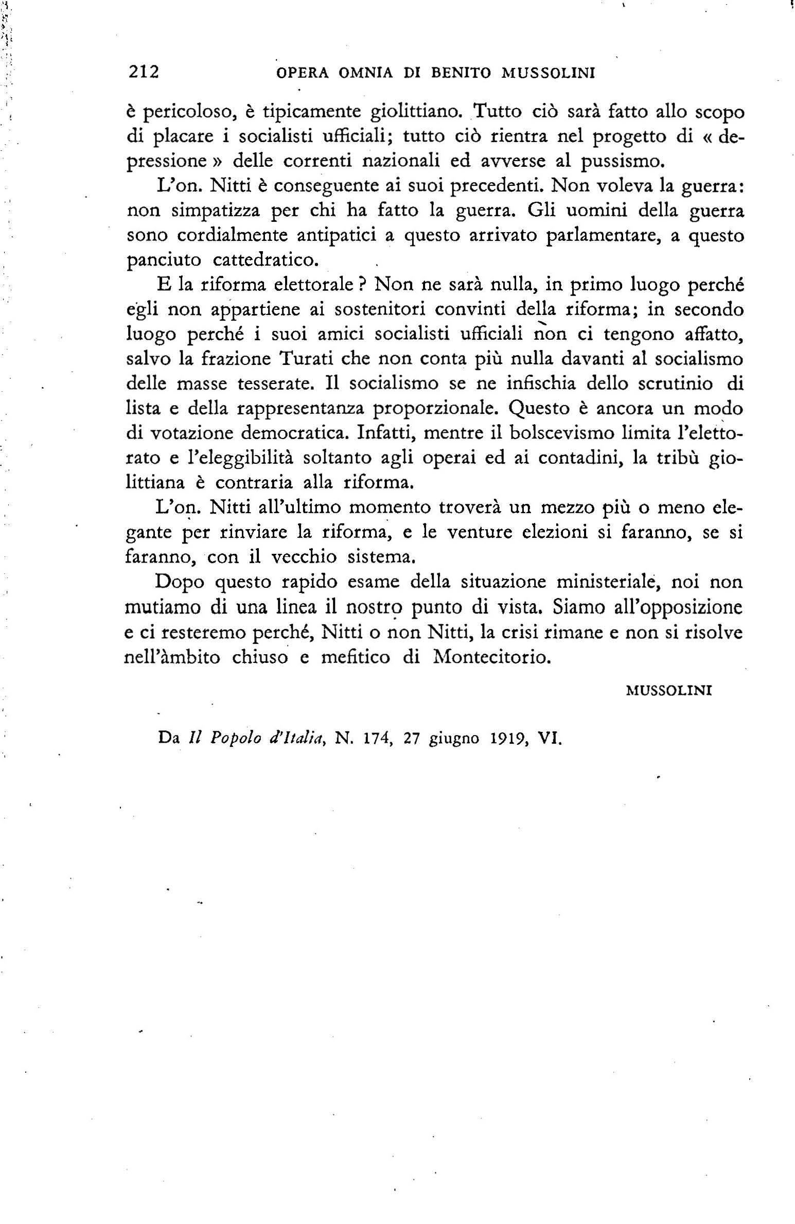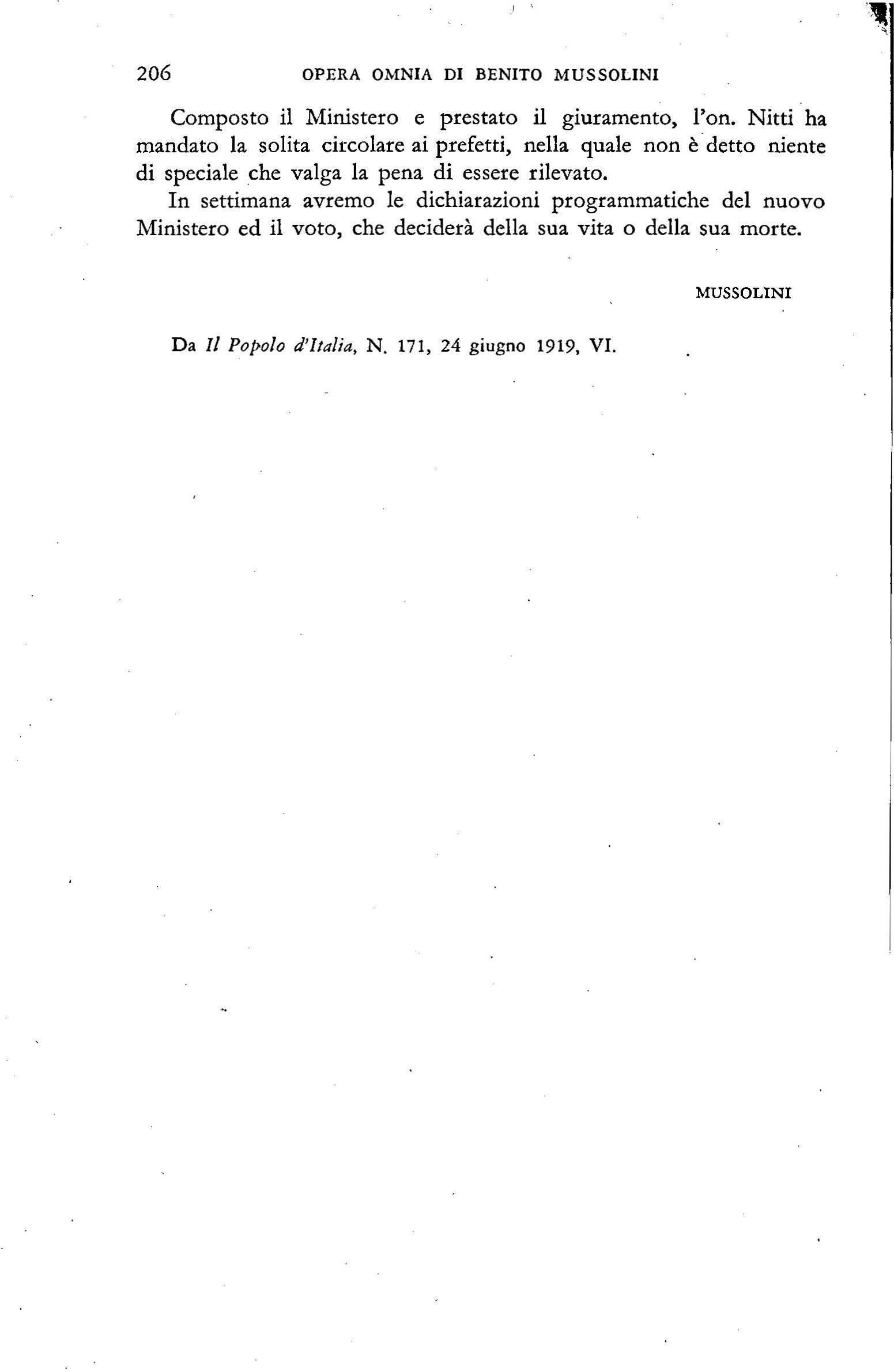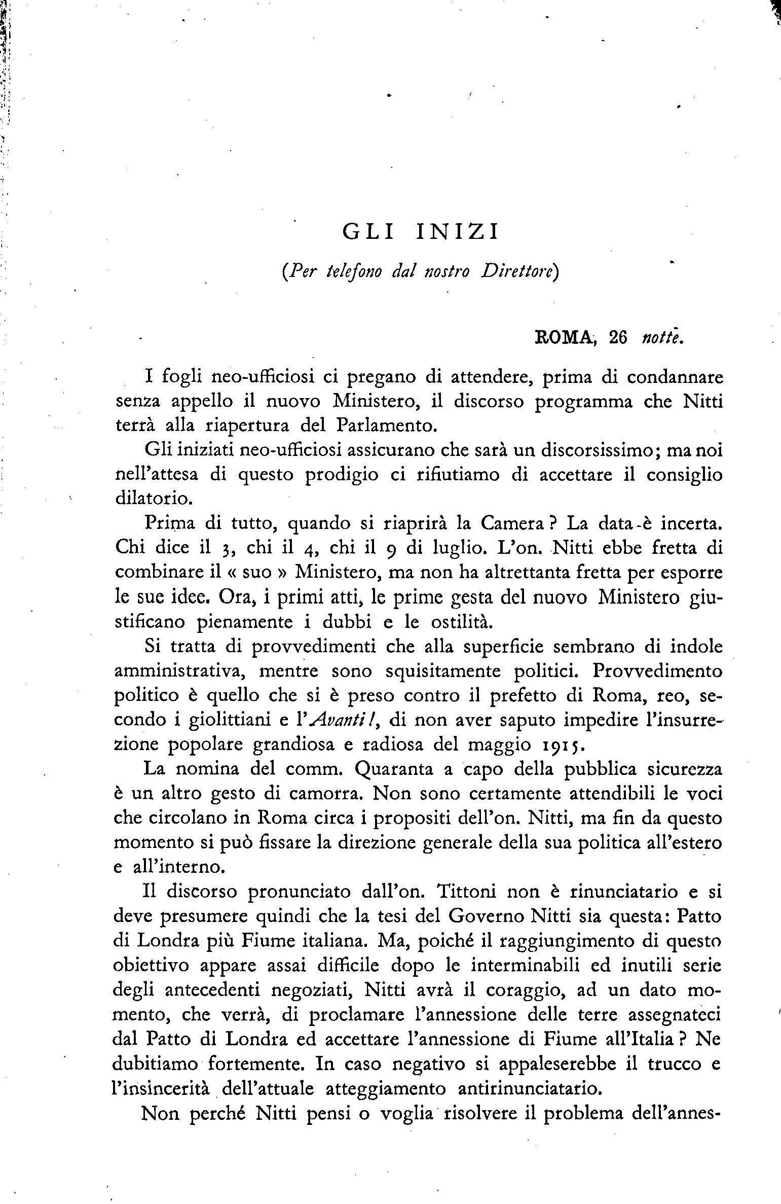 Il 19 g iugno si riapre la Cameri· d ei deputati, che, udite le comunicazioni de[l'on. O rla ndo, respinge la sua proposta di riunirsi in comitato segreto. 11 ministero dichiara di dimettersi e la Camera respinge la p ropos ta dell'on. Turati di continua re i lavori per discutere il p rogetto d i riforma de lla legge elettorale anche nelle vacanze del ministero, mentre approva la sospensiva con voti 299 contro 8 1. Il 2 1 giugn o la Camera s i aggiorna per essere r iconvocata a domicilio, dop<l ave r votato l'ese rcizio provvisorio per un mese. La ser a dd 21 , Mus· solini, provenien te dalla Romagna, è a Roma, dove, dopo ave r partecipato ad un'assemblea del fascio romano di combattimento (369}, telefona al gi ornale un articolo, scritto in treno ( 387), sulla cris i ministeriale ( 198). Il 22 giugno è formato il n uo,•o ministero, che è presieduto dalron. Francesco Saverio Nitti (204).