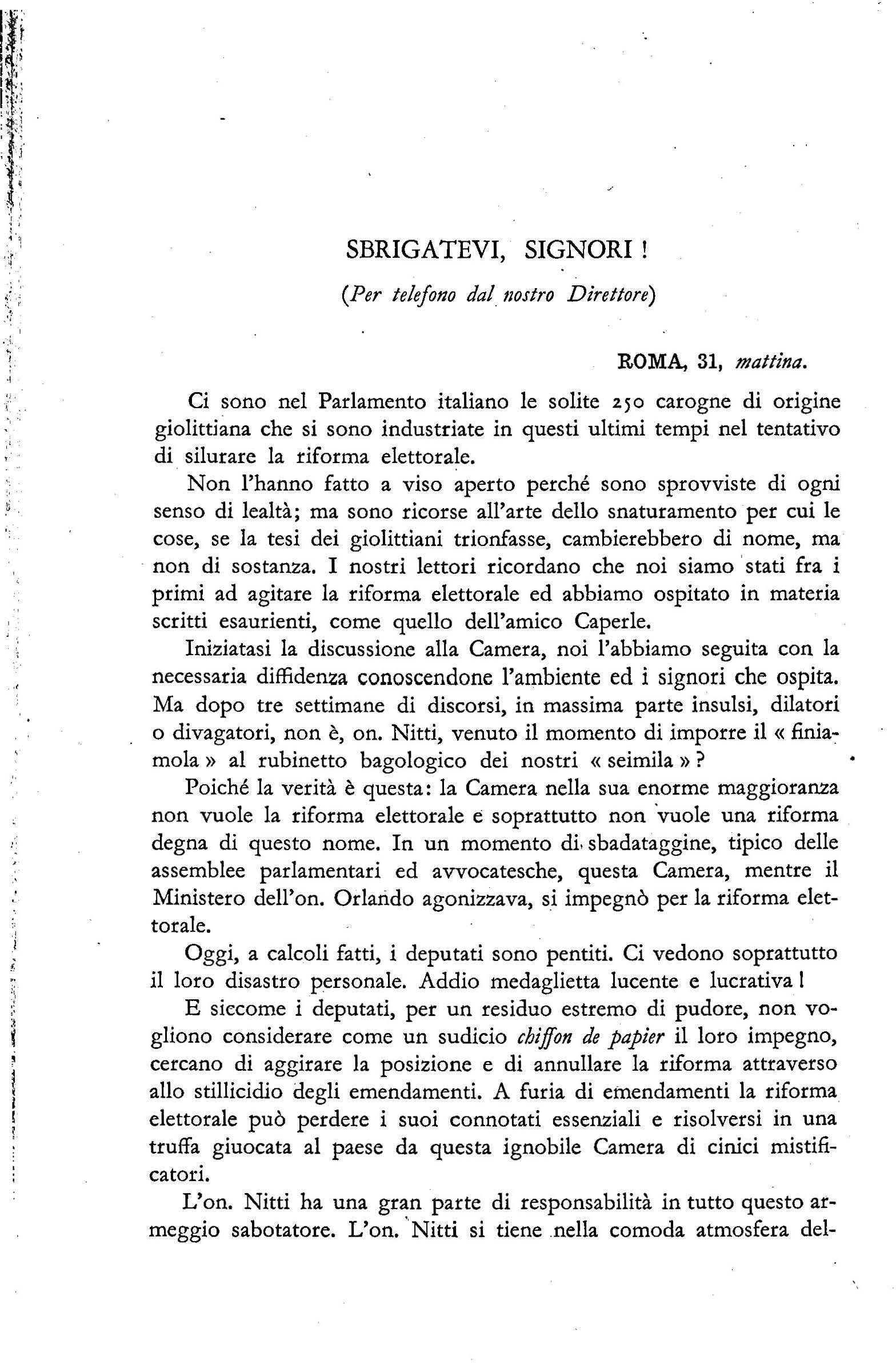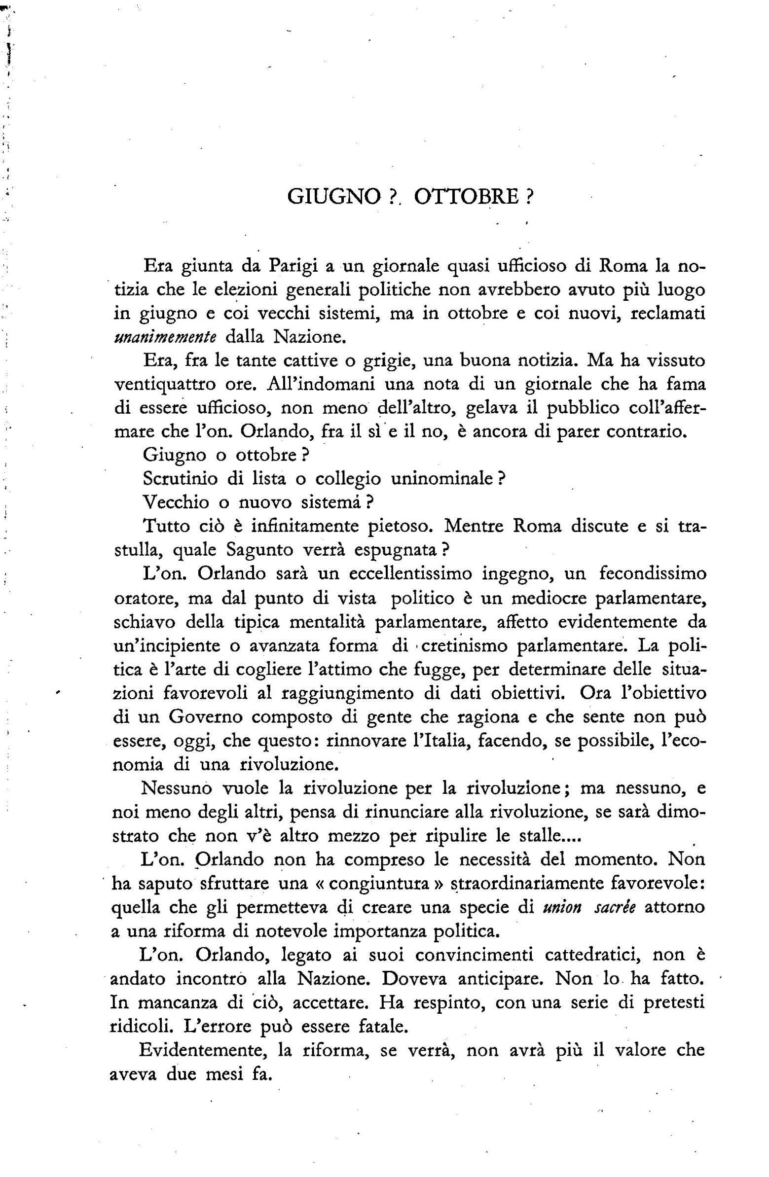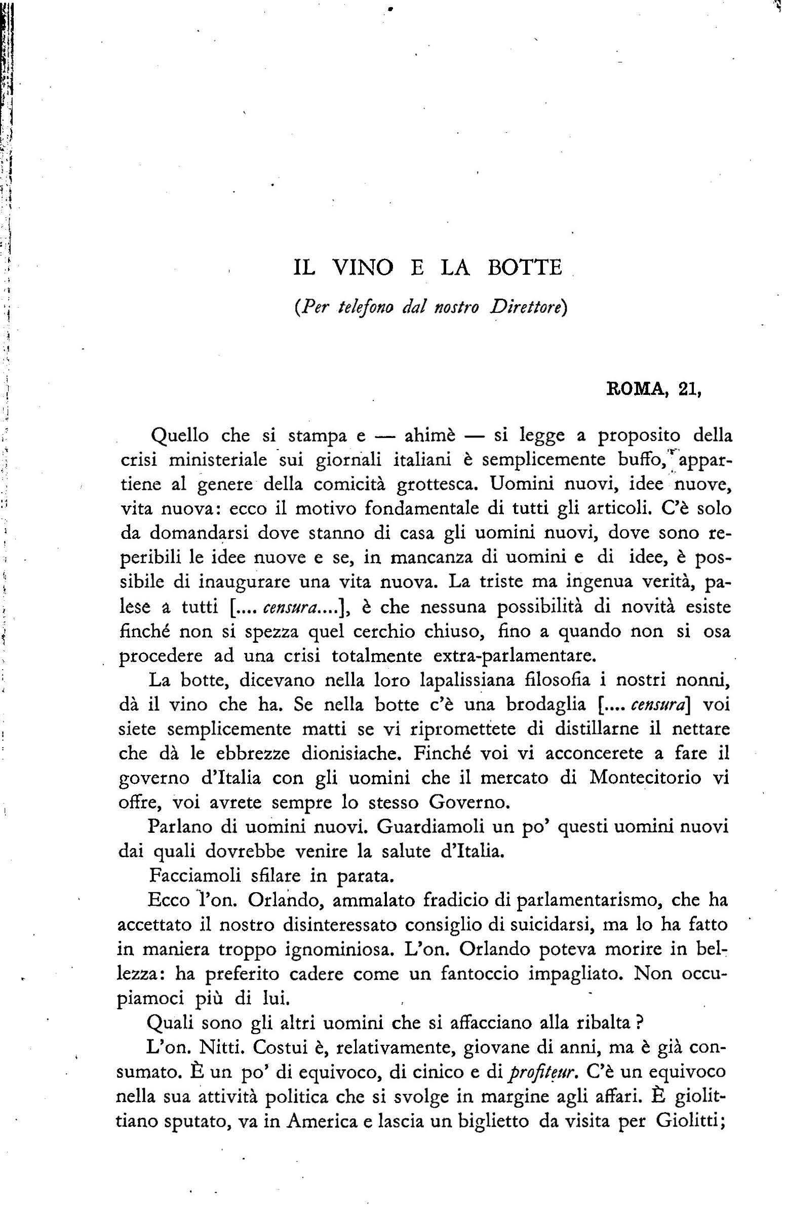 Il 19 g iugno si riapre la Cameri· d ei deputati, che, udite le comunicazioni de[l'on. O rla ndo, respinge la sua proposta di riunirsi in comitato segreto. 11 ministero dichiara di dimettersi e la Camera respinge la p ropos ta dell'on. Turati di continua re i lavori per discutere il p rogetto d i riforma de lla legge elettorale anche nelle vacanze del ministero, mentre approva la sospensiva con voti 299 contro 8 1. Il 2 1 giugn o la Camera s i aggiorna per essere r iconvocata a domicilio, dop<l ave r votato l'ese rcizio provvisorio per un mese. La ser a dd 21 , Mus· solini, provenien te dalla Romagna, è a Roma, dove, dopo ave r partecipato ad un'assemblea del fascio romano di combattimento (369}, telefona al gi ornale un articolo, scritto in treno ( 387), sulla cris i ministeriale ( 198). Il 22 giugno è formato il n uo,•o ministero, che è presieduto dalron. Francesco Saverio Nitti (204).