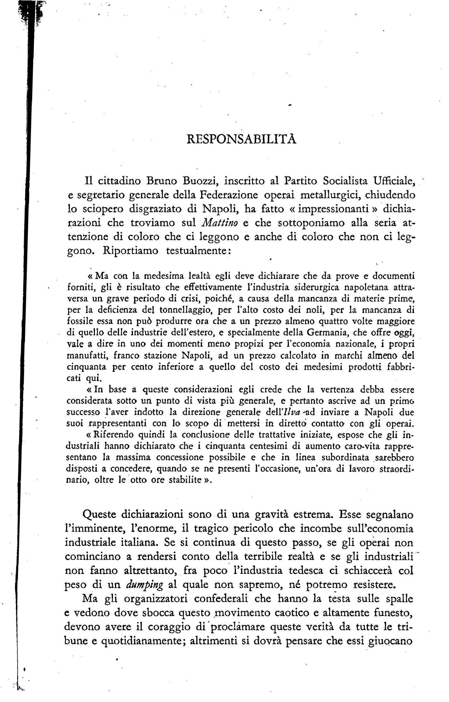 s ciope ro generale, che cosa farà l' U . I. del Lavoro ? Che cosa ordinerà ai suo i orga nizzati ? Li accoderà a l Pai:tito Socialista, per fame g li str ume nti passiv i delle sue specul azioni, o li dissocierà dal m ovimento , anche se, per avventura, fosse geneule ? A questi interro gativ i bisog na ri spondere in tempo, per non farsi sorpren dere e sorpassare dagli avvenimenti. .D'altra p_arte, p erché l'U, I. del Lavoro n o n p re p arerebbe un suo movimento p er raggiungere una vasta rinno vazione d ei no stri istituti p olitici ed ec onomici? I mOtivi per cui il Pu.r vuole s catenare uno sciopero gene ra1e sono inconsist_enti e r idicoli, ma ci so no dei postulati ch e- meritano ·u no sciopero generale, se le classi d irigenti non lo p re vengono .