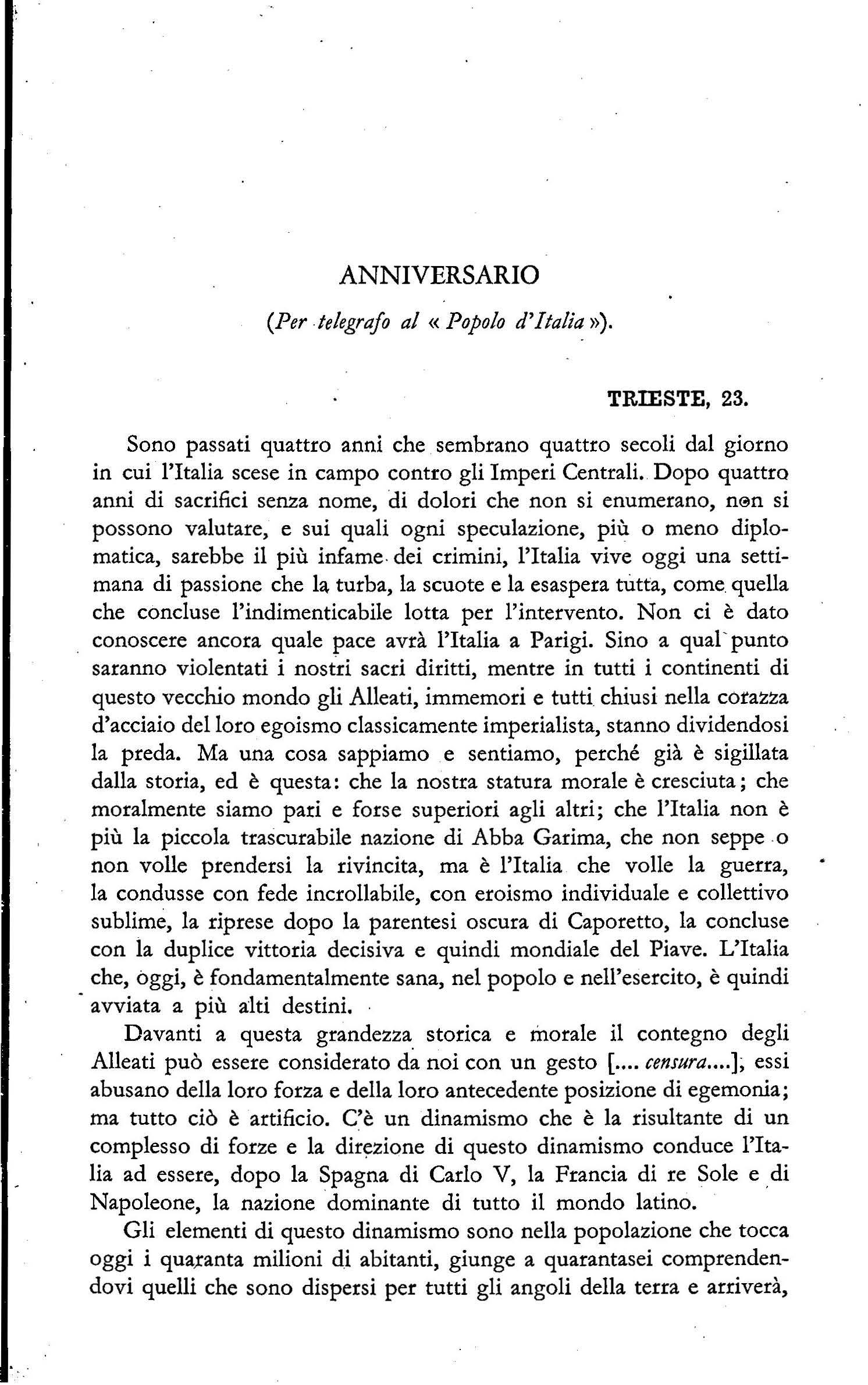 li 21 maggio pa rte per la V en ezia Giulia (381). La sera d el 22 parla a Fiume (142); il ·23 è a Trieste, dove s tende l'articolo di commemorazione del quarto anniversirici della nostra entrata io guerra ( 147) La sera <lei 24 maggio è di ritorno a Mi lano.