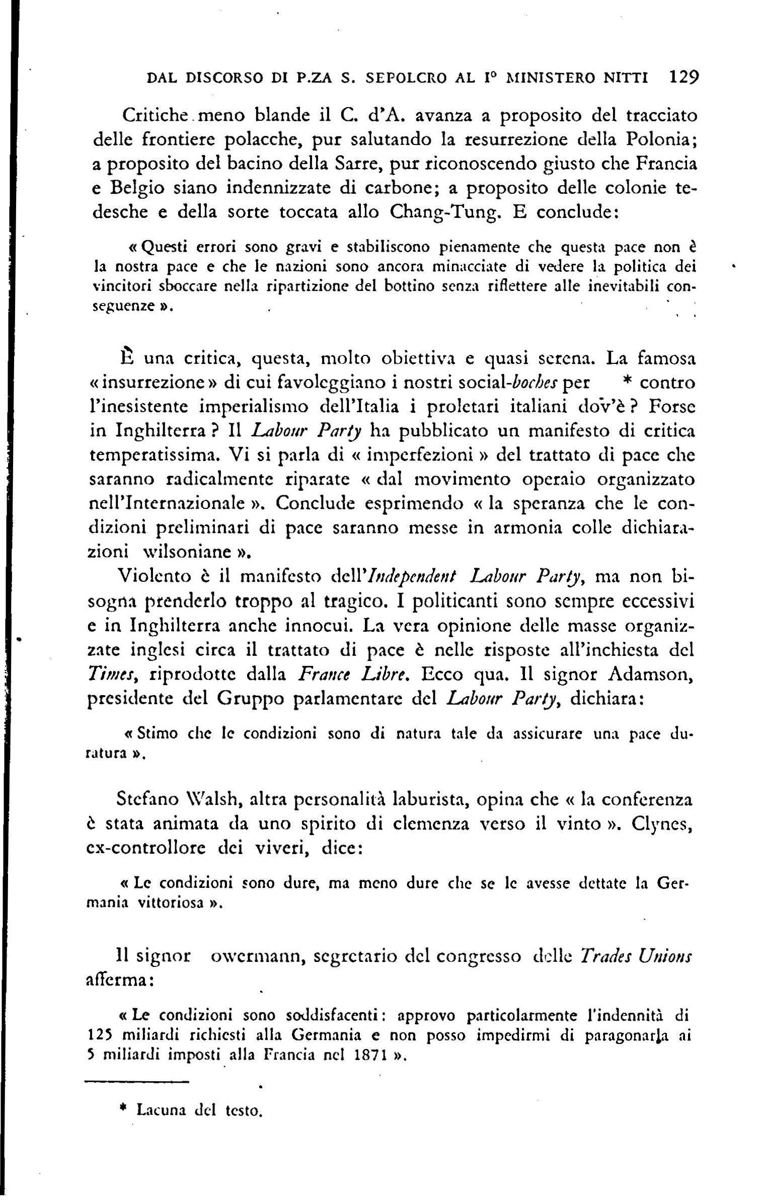 L'Italia d 6l Popolo (100). Poi seguita ad ~g itare la questione adriatica (il 5 magg io gli onorevoli Orland o e Sonnino eran o ripartiti per Parigi) ( 10 1, 104); scri ve su l trattato di pace consegnato il 7 maggio al « Trianon Palace » di V ersag.lia dagli a lleati a i delegati tedeschi (107, 11 ~) ; s u una polemica sorta fra l'uni on e ita lia na d el lavoro ed il partito sociaJista francese; redige gli articoli : Uni1Jer1ale Ult1sion el (1 20), Rirhiamo alla miH1YtÌ (. 124), Im bo1tit11re (1 28), D editalG ai frdnceri (131), Il JOgno di Pinon (13 4); invoca il ritorno immediato da Parigi dei nostri delegati (137) e la revisione del trattato di V ersaglia (140).