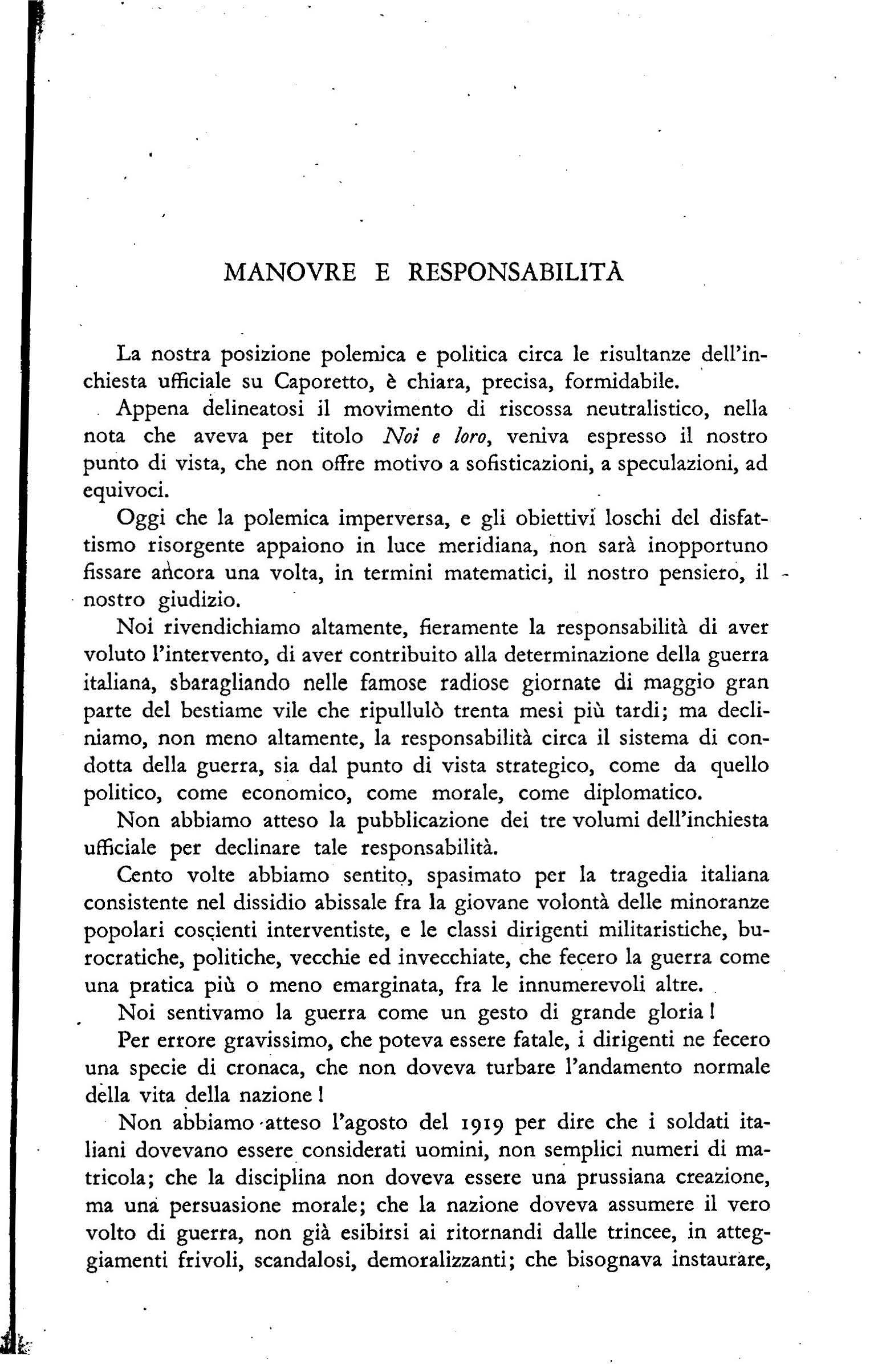 2. Gli interventisti, venuti o n orl. dalle scuole sovversive, de:vono accettate i pesi, i pericoli, le incognite della situazione e, se problemi fondamentali esistono, spetta agli interventisti assumere l ' iniziativa d ella lOlo soluzione. Nel maggio 1915 · si rese necessaria una rivoluzione p er fare _la guerra. D'allora, noi ci siamo, per fatalità d i cose e non solo per volontà di uomini, tenuti sul terceno rivoluzionario. Che la g uerra da noi acclamata e imposta sia stata una grande rivolozione, è luminosamente provato dagli avvenimenti. Può _ darsi che sia necessaria un'altra rivoluzione per «fare» la pace. Cioè per trasformare e rinnovare tutto ciò che, dalle istituzioni ag li uomini, non è più dd n ostro tempo. Siamo noi che avendo ~<incominciato » n el 1915 abbiamo il diritto e il do vere di «·concludere>> t:1el 19 19.