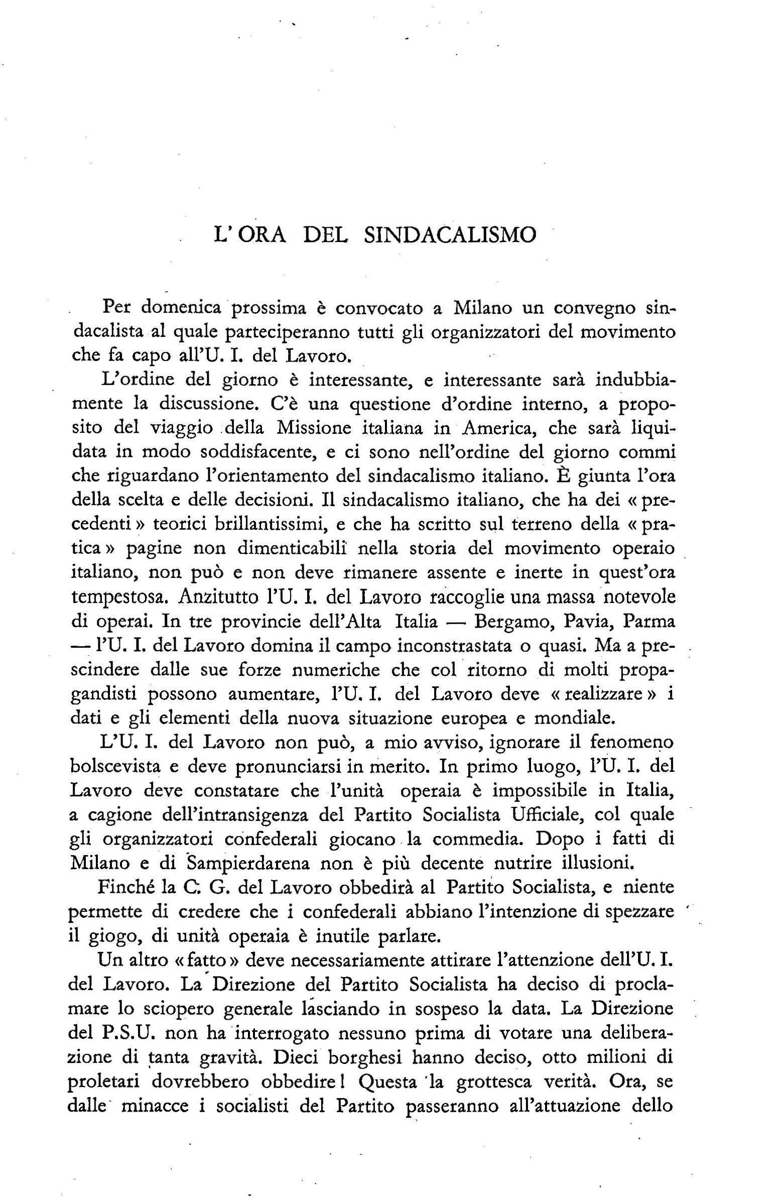 L'U I. del Lavoro n on può , a mio avviso, ignorare il fenomeqo bolscevista e deve pronunciarsi in tnerito. In primo luogo, l 'U. I. del Lavoro deve constatare che l'unità operaia è impossibile in I talia, a cagione d ell' intransigenza del Partito Socialista Ufficiale, col quale gli organizzatori crinfederali g iocano la commedia. Dopo i fatti di Milano e di Sampierdarena non è p iù decente nutrire illusioni.
