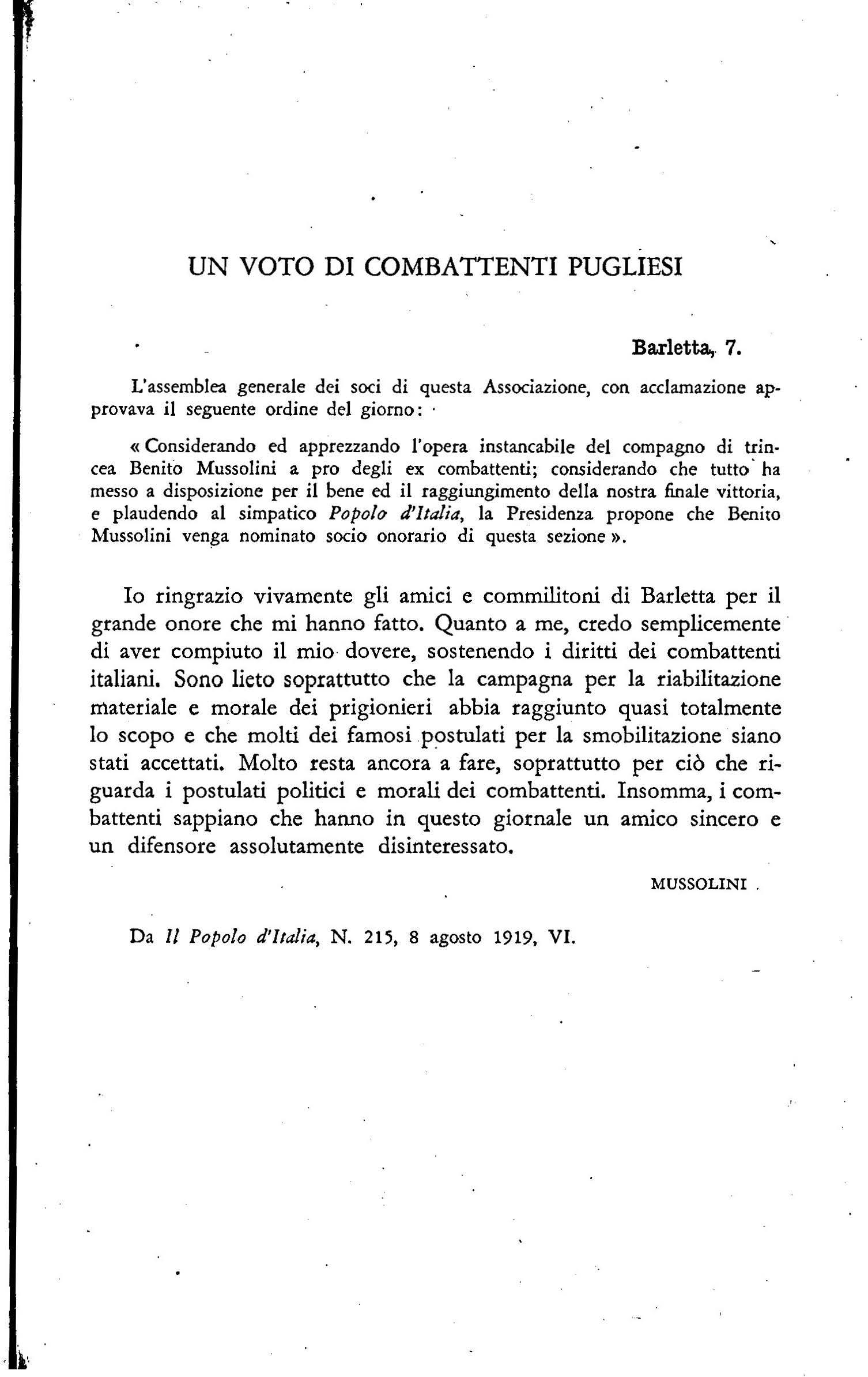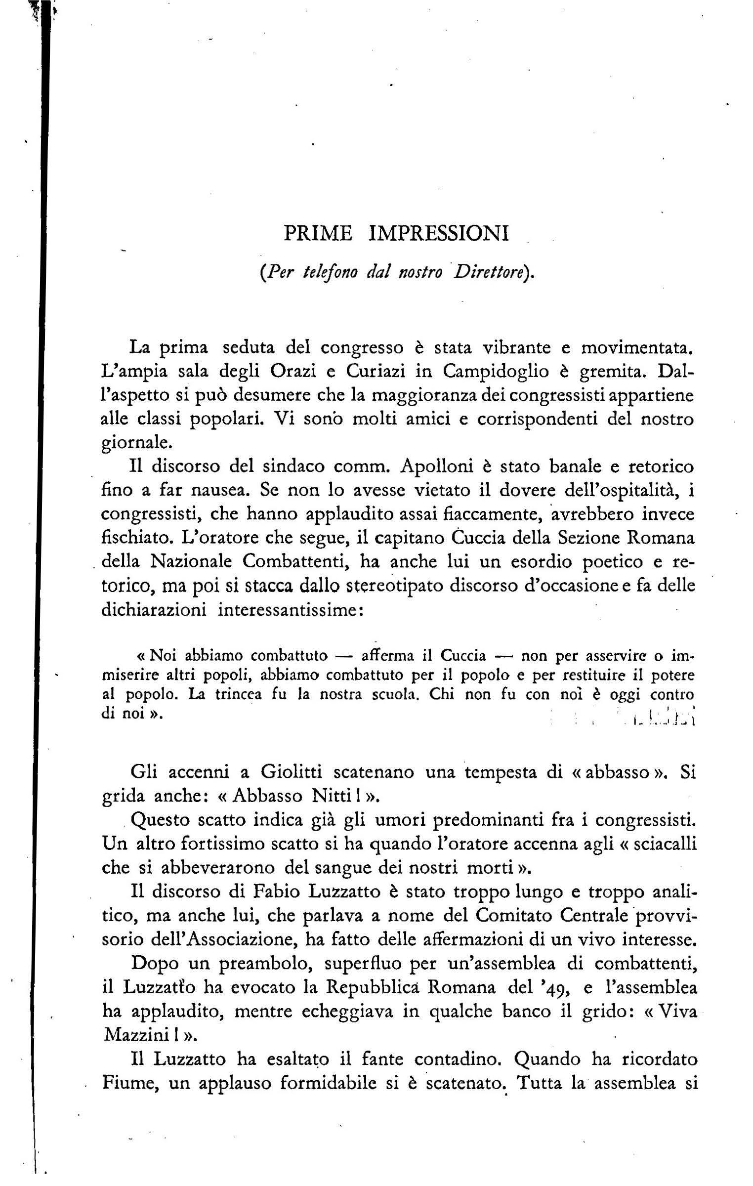 Nello stesso giorno, Mussolini partecipa alla seduta inaugurale del primo cong resso dell'associazione nazionale dei comb;itte nti (201) e il 24 giugno è presente ad una successiva seduta (207). Il 26 giugno, infine, scrive sugli inizi del nuovo minis tero ( 210).