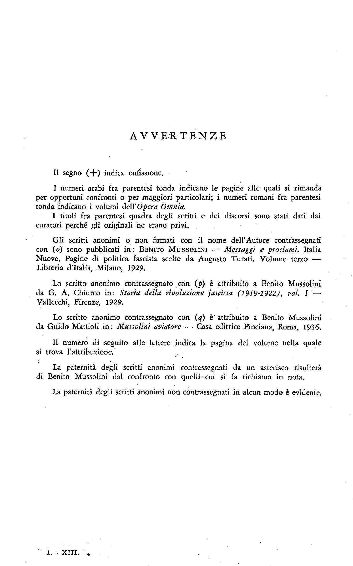 G li scri tti anonimi o non firmati con iJ nome dell'Autore contrassegnati con ( o) :wno pubblicati in: BENITO MUSSOLINI - Messaggi fl proclami. It alia Nuova. Pagine di politica fascista scelte da Augusto Tu.tali. Volume terzoLibreria d'Italia, Milano, 1929.