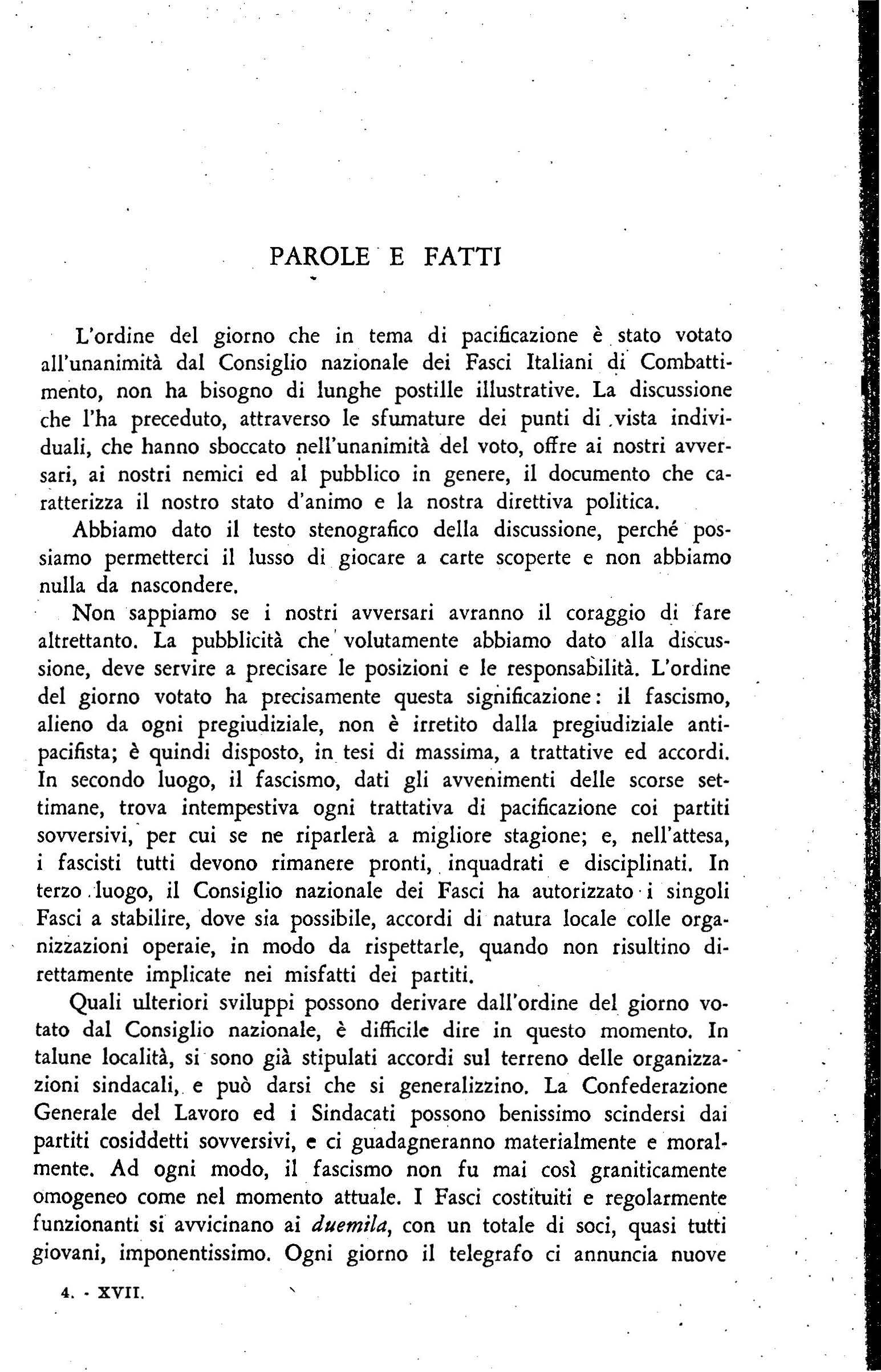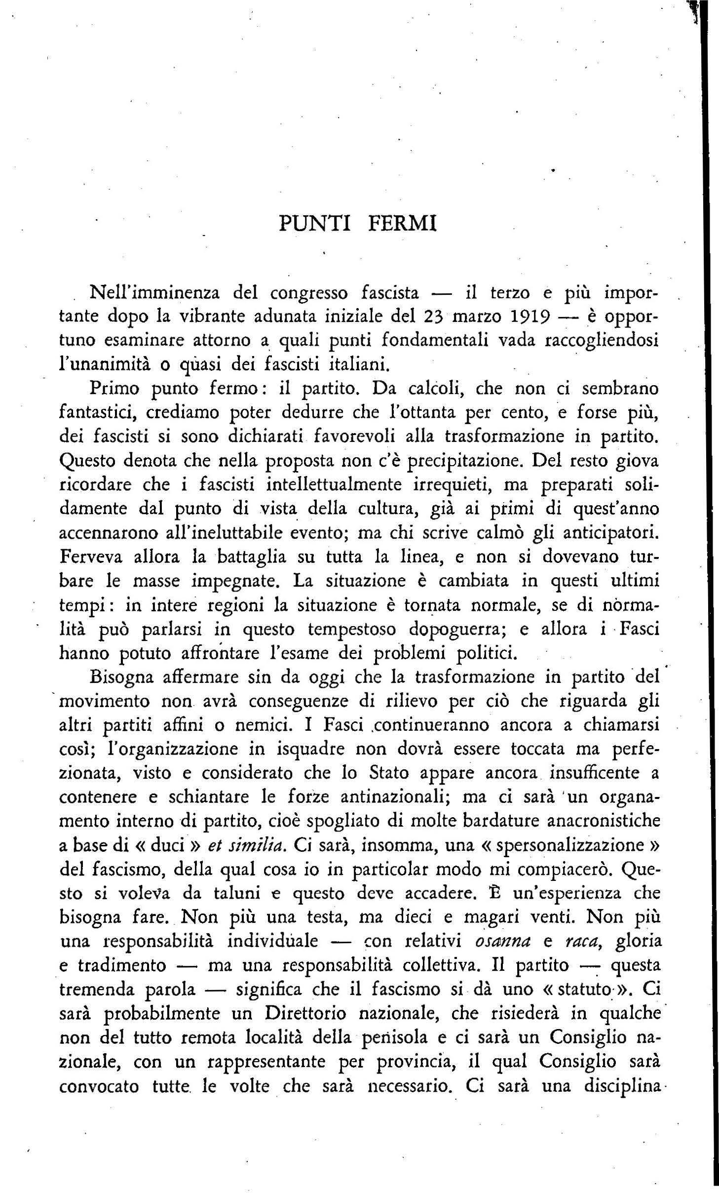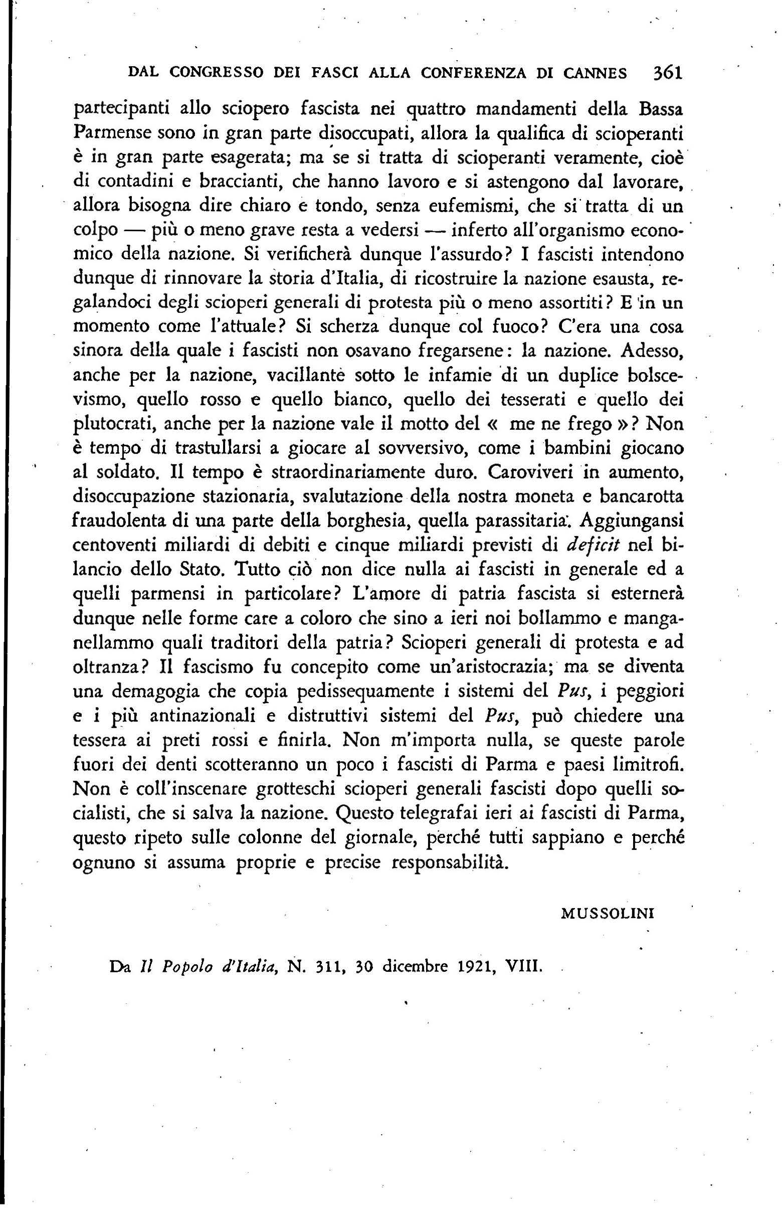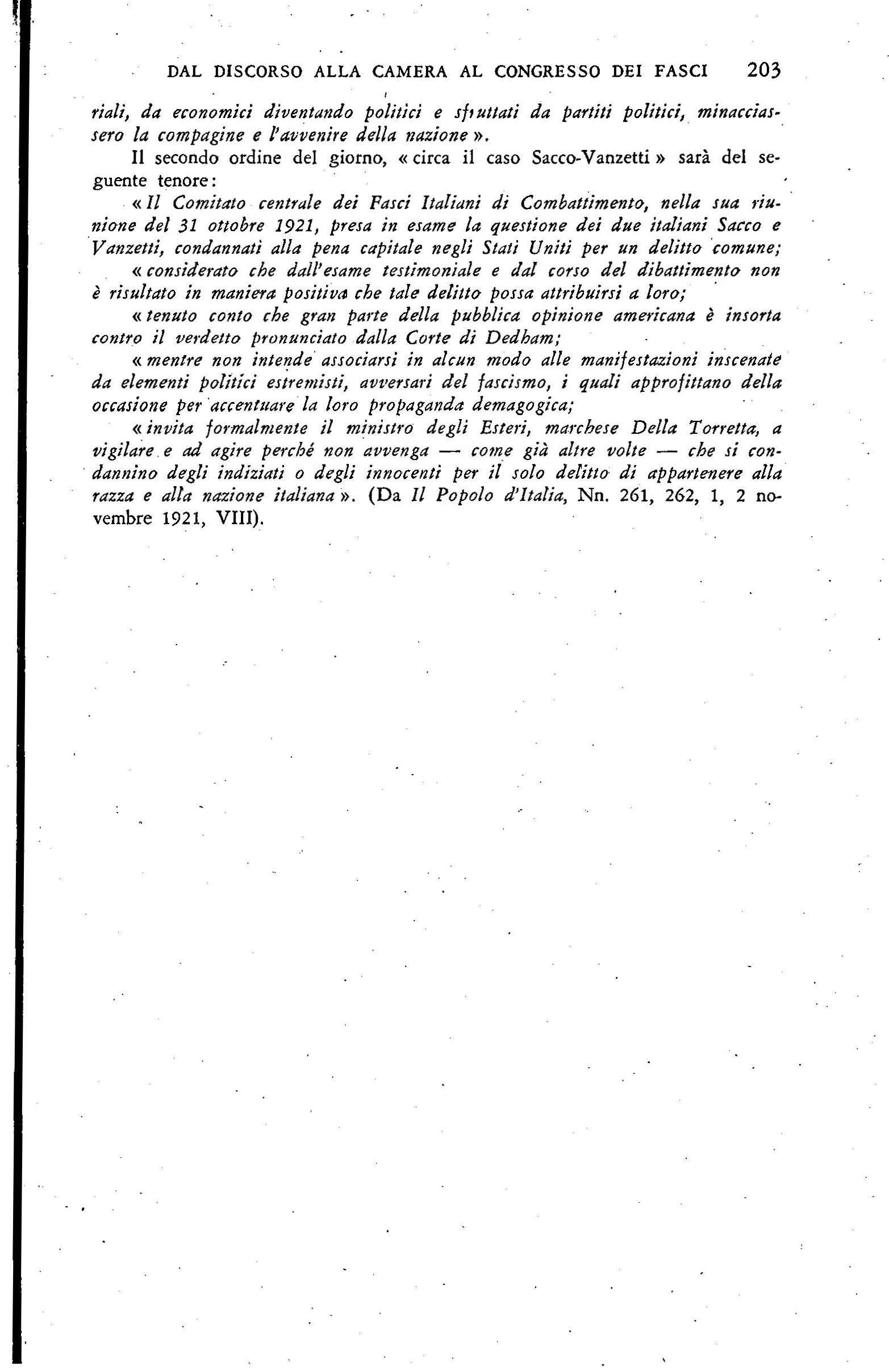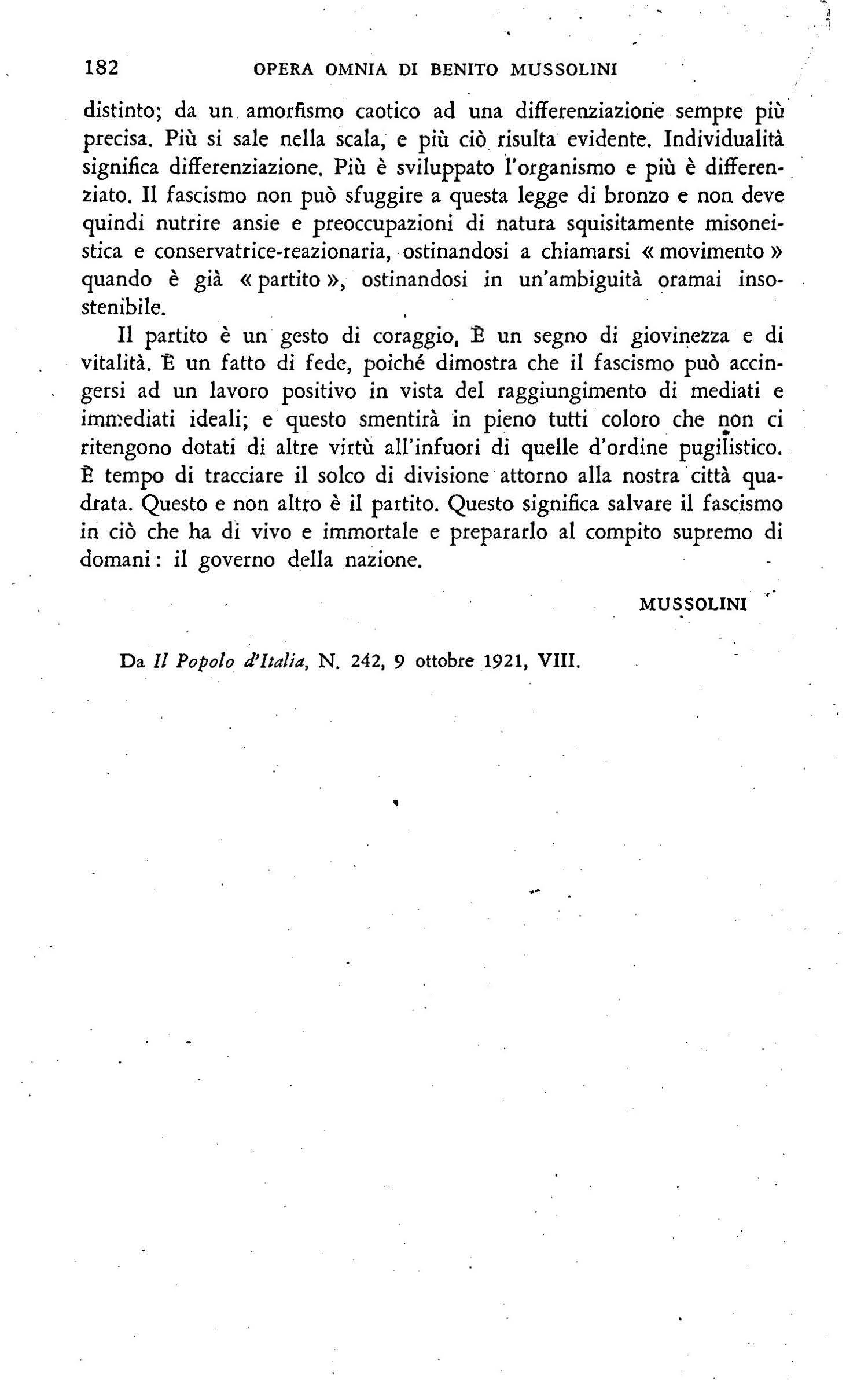 Negli ultimi giorni di settembre, scrive sulla crisi dd fa scismo ferrarese (147); sull'accoglienza poc:o amichevole fatta .in alcune città d'Italia ad WJa missione militare francese ( 150); sull'assassinio del deputato socialista Di Vagno avvenuto a Mofa (Bari) il 25 settembre e sul sanguinoso conflitto r egistratosi a Modena il 26 settembre tra for:ta pubblica e fascisti (154, 159); r 11 rte<ipa ad una riunione della commissione incaricata di diKuterc la proposta di. trasformazione d ei fasci di combattimento in partito politico (157). Il 29 settembre, parla a M odena, durante i funerali dei fascisti cad\lti nel conflitto dei 26 ( 160); il 2 ottobre, a Milano, nel corso di una manifestazione fascista di cordoglio e di protesta per i caduti nd conflitto di Modena (163).