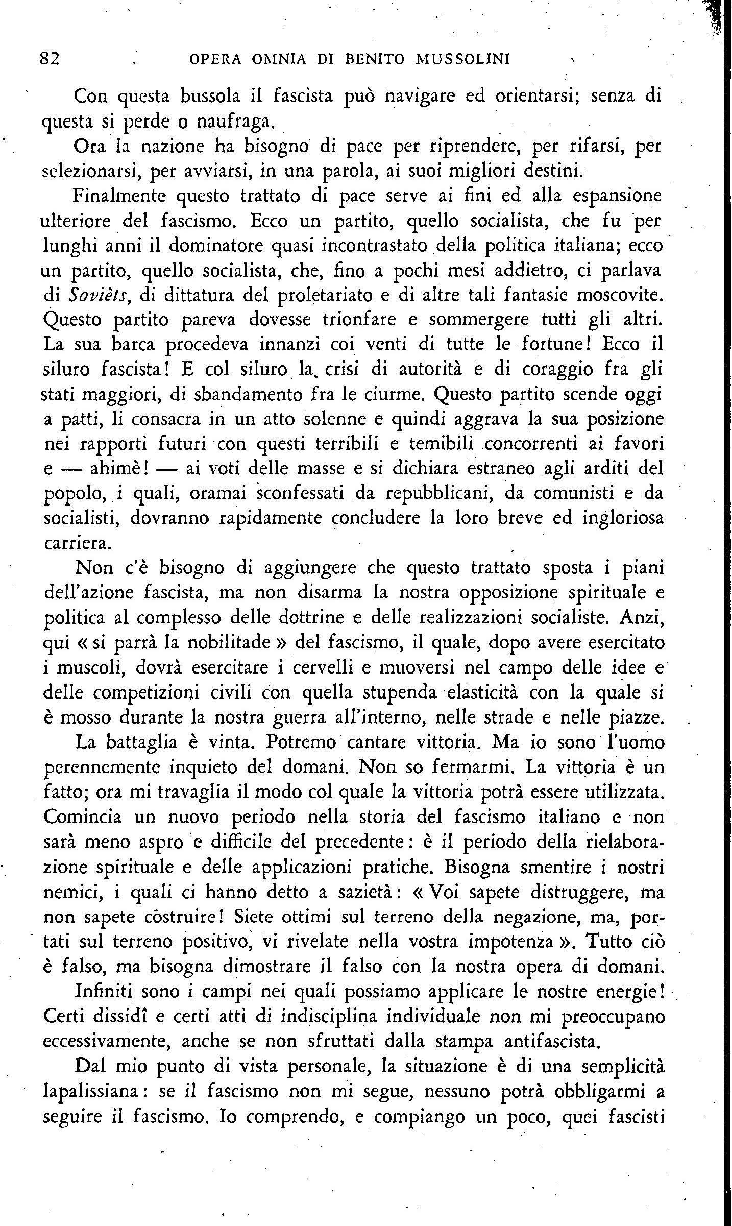 ad ogni collaborazione coi socialisti. Ma a p roposito di collaborazioni o coaliziotli, non bisogna tenec co nto soltanto de~ due partiti organizzati . e dei frammenti di democrazia più o meno sociale; ma bisogna ben pianta!'si in testa· che non si può p rescinde re dalla presenza alla Camera di trentacinque deputati fascisti e che soprattutto non si può non tener·conto della formidabile organizzazioi;ie che ·i fasèisti hanno nel . paese L'on. Giolitti ha parlato ieri di 186 mila iscritti ai fasci. Posso garantire che sono molti di più: forse il triplo; e; quel che più conta, si tratta di forze perfettamente inquadrate, è che perciò rappresentano la forza politica più . potentemente organizzata che ci sia oggi nella nazione italiana.