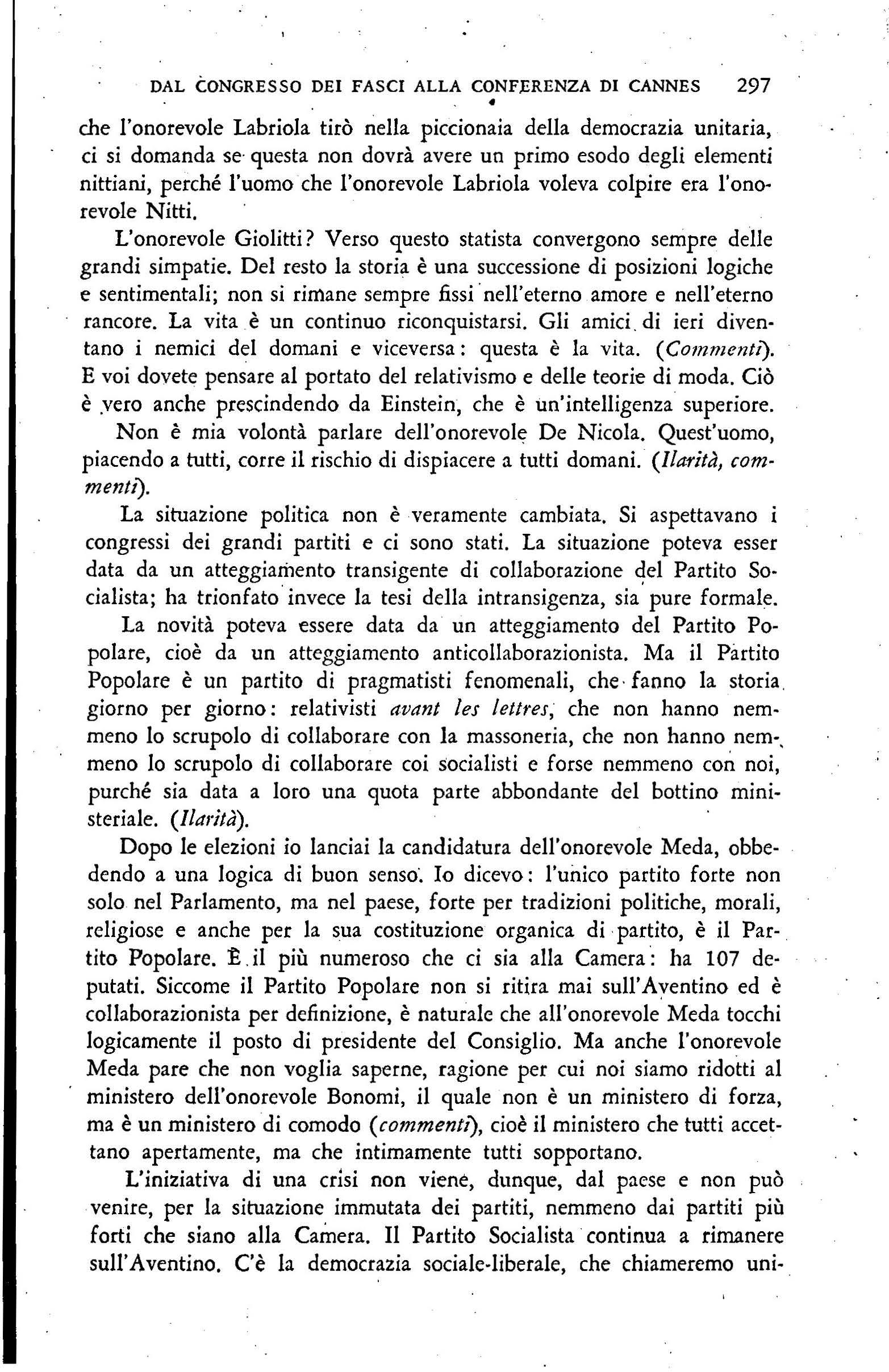 - Senza peccare di superbia, si può dire che la crisi è stat·a provocata dal Gruppo parlamentare fascista, ed in tema di politica estera. La manovra dei socialisti è. stata evidente. Il discorso d i Treves è stato un camo11flage; in.a in realtà i socialisti hanno \_'·otato contro pèr ragioni d i politica interna. Ma, poiché puntandÒ la carta della politica interna, avrebbero avuto cont raria l'enorme maggioranza della Camera, essi hanno giocato la carta della politica esteia, che ha accumulato coi loro voti i cento voti della coalizione di destra. L'astensione dei fascisti dalla votazione della seconda parte dell'ordine del giorno Turati era abbastanza significativa. Ma i fascisti non potevano, anche a costo di votare con Lenin o col suo piccolo r~ppresentante iri Italia, Nicola Bomba.cci, approvare la politi.ca estera del conte Sforza, che ha barattato nella maniera più scandalosa il Montenegro e che ha ingannato ]a nazione per ben sette mesi a proposito di P_orto Baross . ·De1 resto la stessa democrazia sociale, pur avendo votato a favore, h a parlato contro. E non sono cosl ind iscreto da domandare all 'on. Gasparotto le ragion i della sua tattica. , Circa la successione procediamo per esclusione. Per noi non è nemmeno il caso di parlare di Nitti e di Orlando. L'oca di Salandra non mi sembra ancora venuta (e per qualche tempo non verrà). L'on. De Nicola non è ancora sufficentemente maturo. Se ne potrebbe riparlare in autunno, Con ciò. non voglio negare che l'on. D e Nicola possieda i numeri sufficenti per tenere degnamente la presidenza del Consiglio. Si fa il nome dell'on. Bonomi, ma l'attuale presidente del Consiglio chi ha dietro di sé? Nel paese nessuno o quasi. A meno che non si vogJia considerare come partito la tisicuzza organizzazione politica deJ riformism o italiano. E alla Camera non ha Che ventiquattro o venticinque d eputati, abbastanza melanconici, perché sono tµtti aspi4 ranti o vcdovati insieme del potere. Ni, ·come fascisti, possiamo dimenticare, anché per i vincoli spirituali che ci legano al fiumanesimo