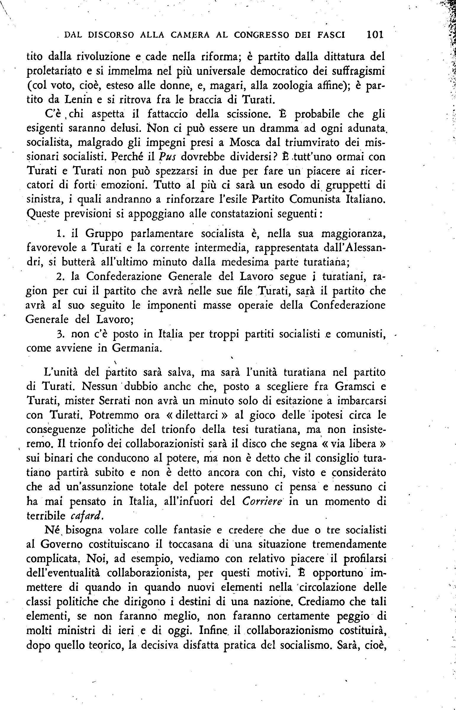 L'ultima parte del discorso Turati rappresenta un indizio o uno stato d 'animo largamente diffuso soltanto nel Gruppo parlamentare ed in taluni ambienti confederali, ma non segna un principio d i applicazione pratica. .