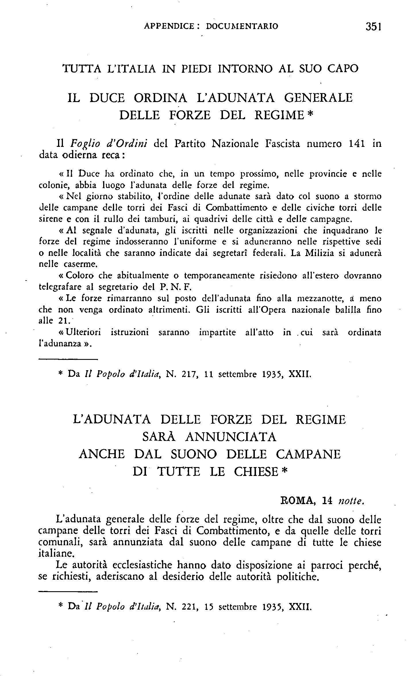 L' adunata: delle forze del regime sarà a nnunciata anche dal suono delle campane d i tutte le chiese (15 settem~re 1935) .