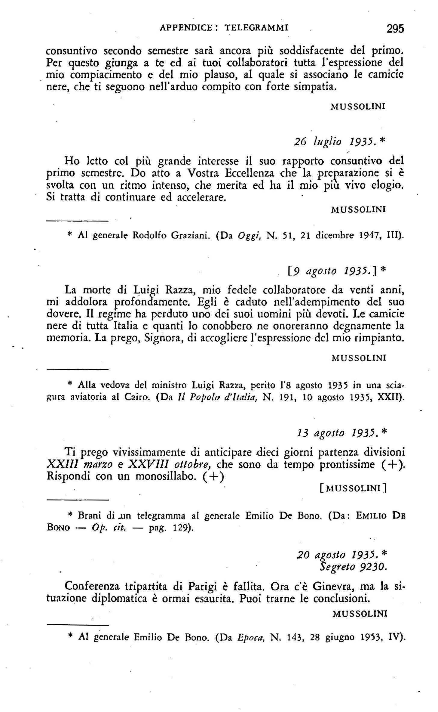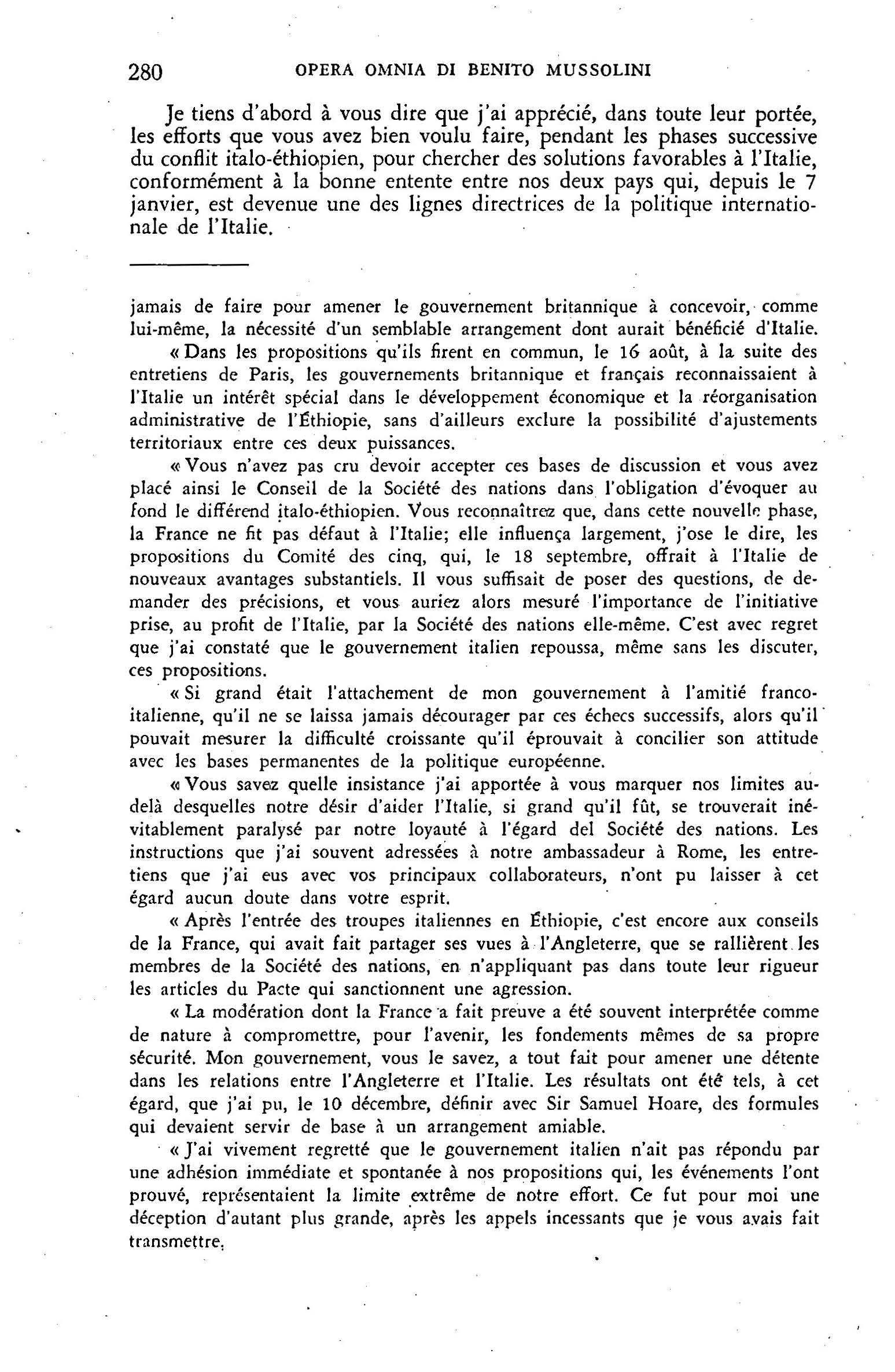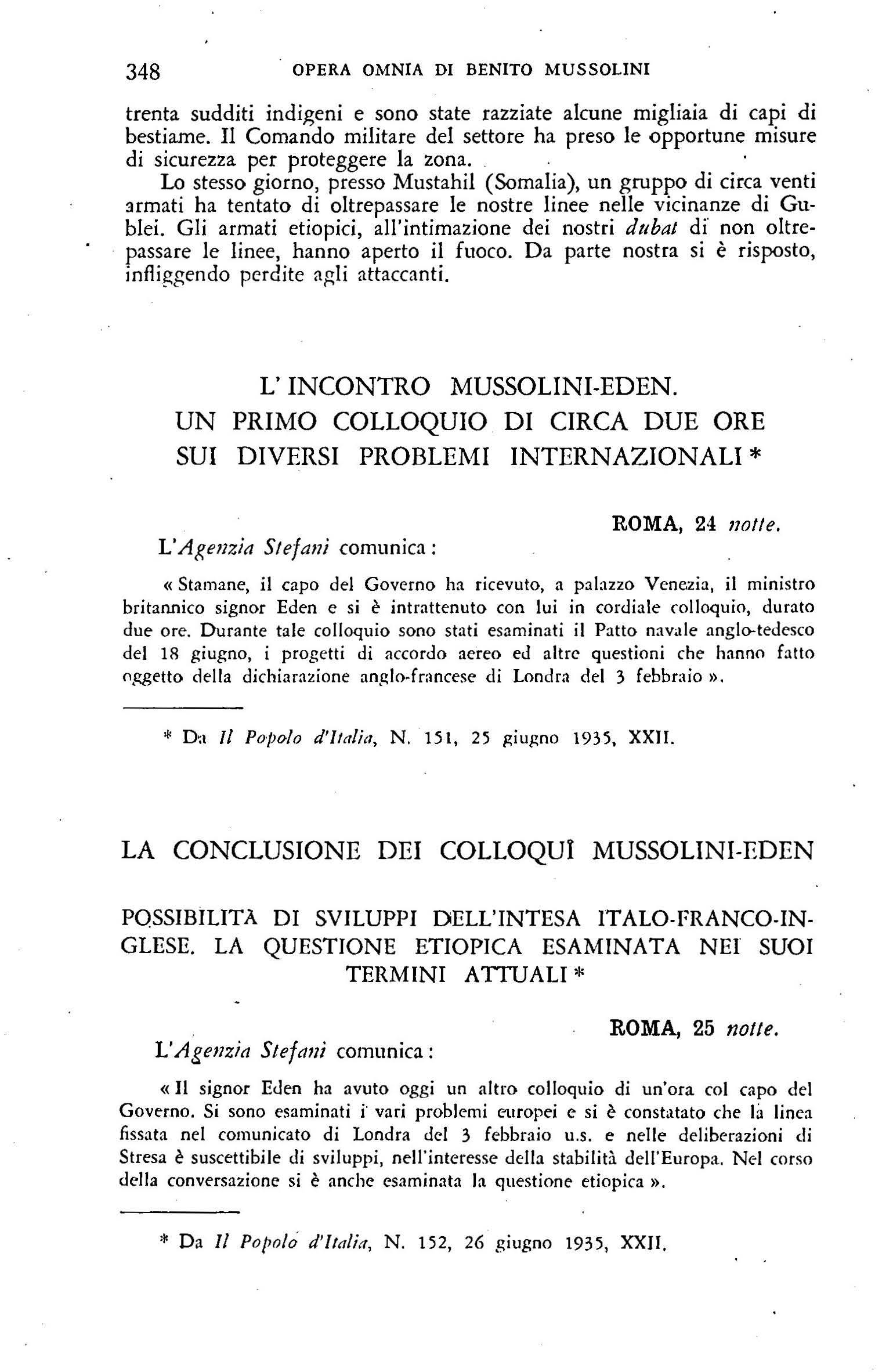 La conclusione dei co lloqui Mussolini-Eden. Possibilità d i sv iluppi d ell 'intesa italo-franco-ing lese. La questione etiopica esaminata nei suoi termini attual i (26 giugno 1935)