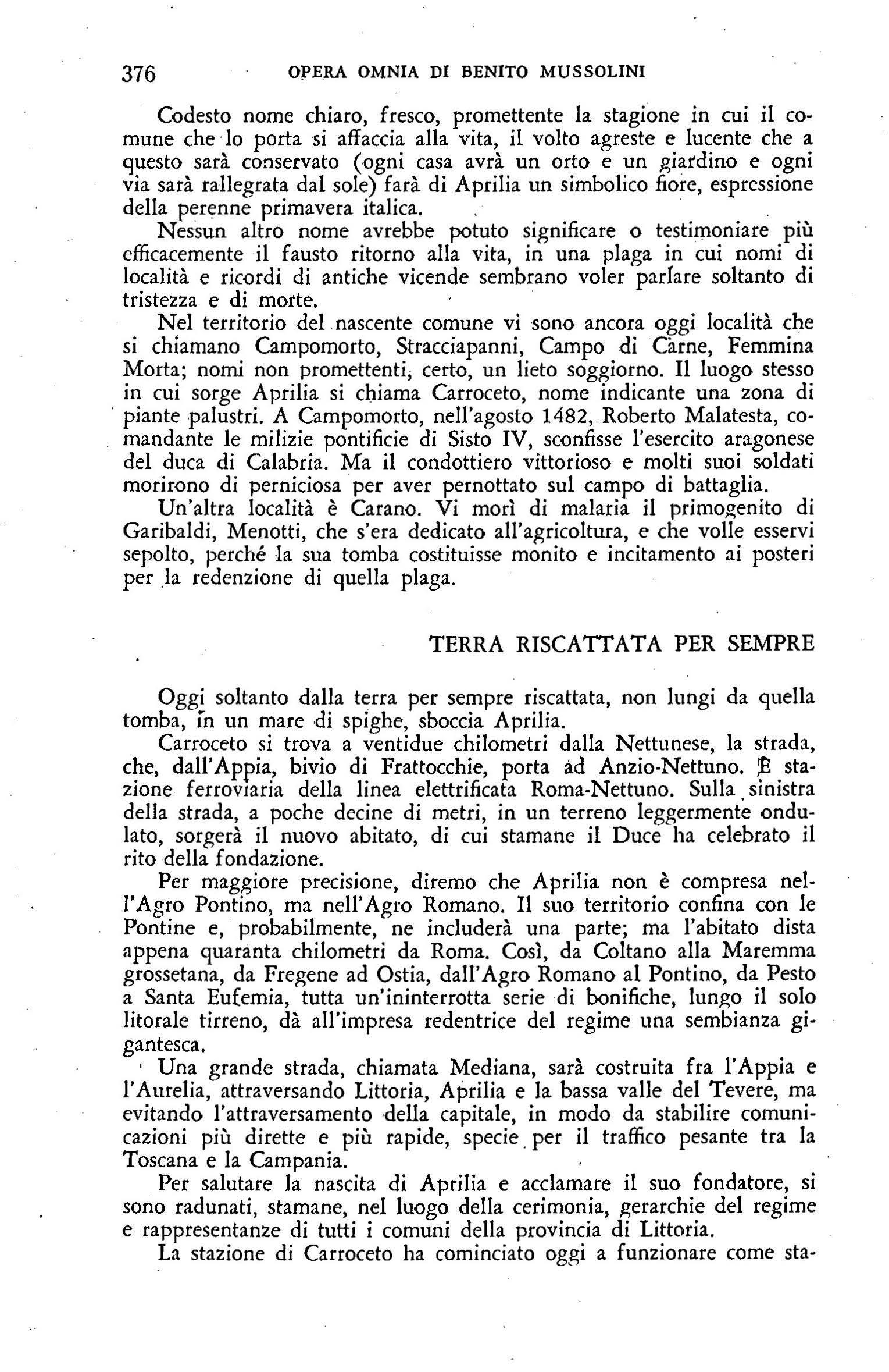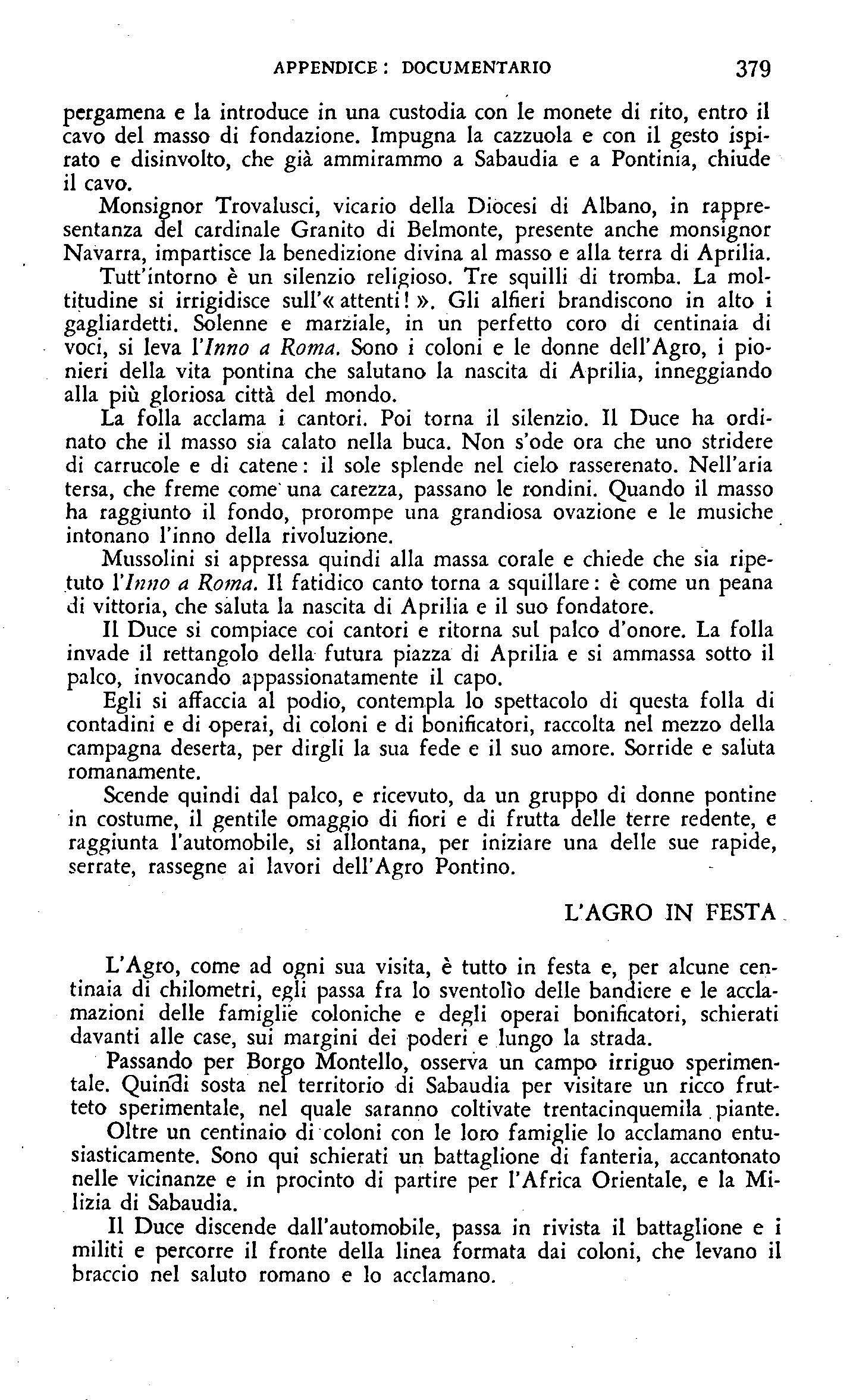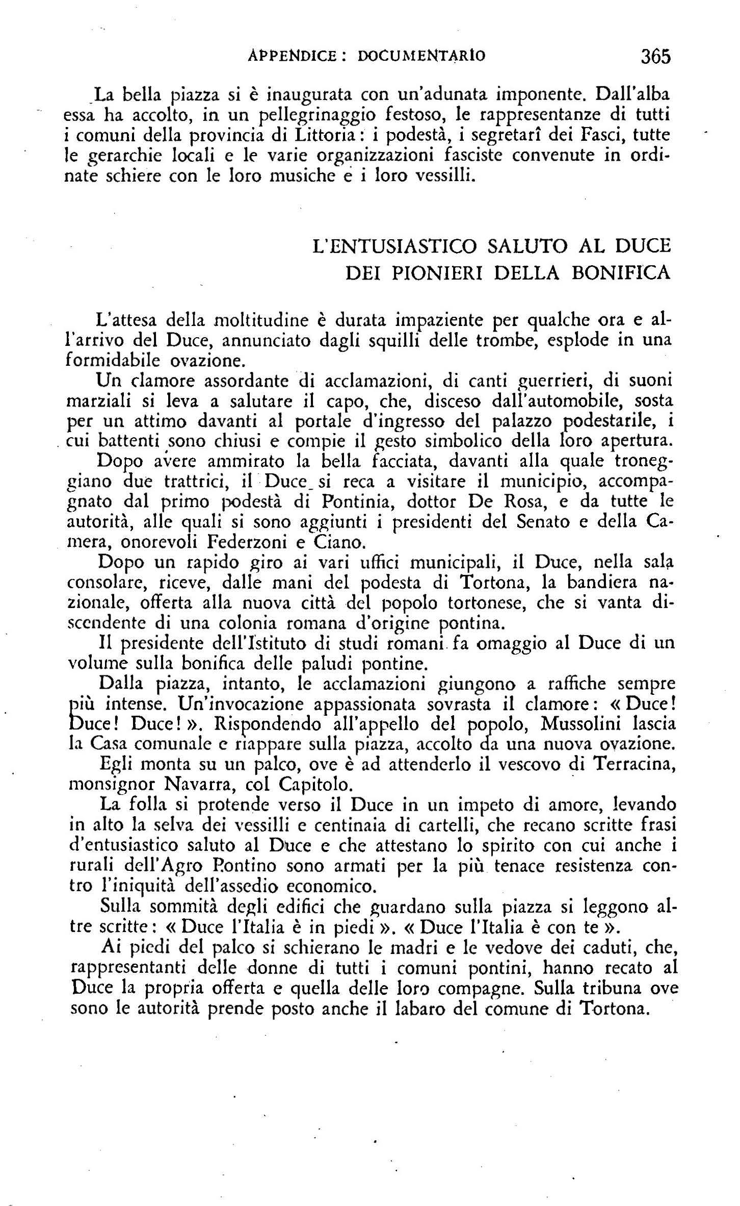 A_i,rilia, quarto comune dell'Agro Pontino, e nell'ondeggiare dei vessilli, a l balenio deile armi, fra indescrivibili manifestazioni d'entusiasmo, annuncia ai bonificatori acclamanti