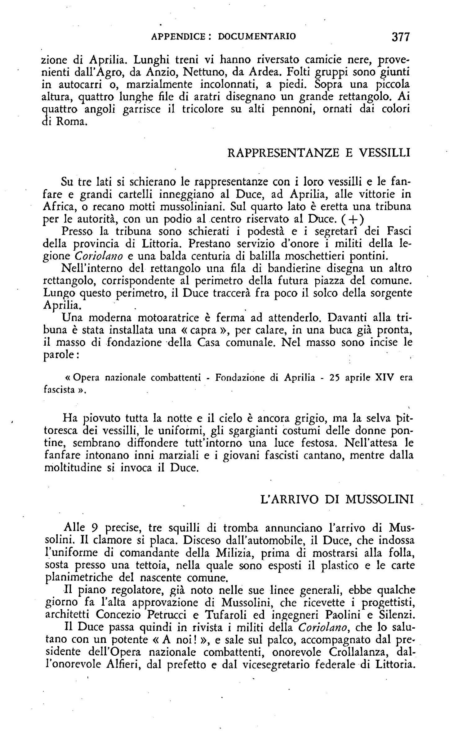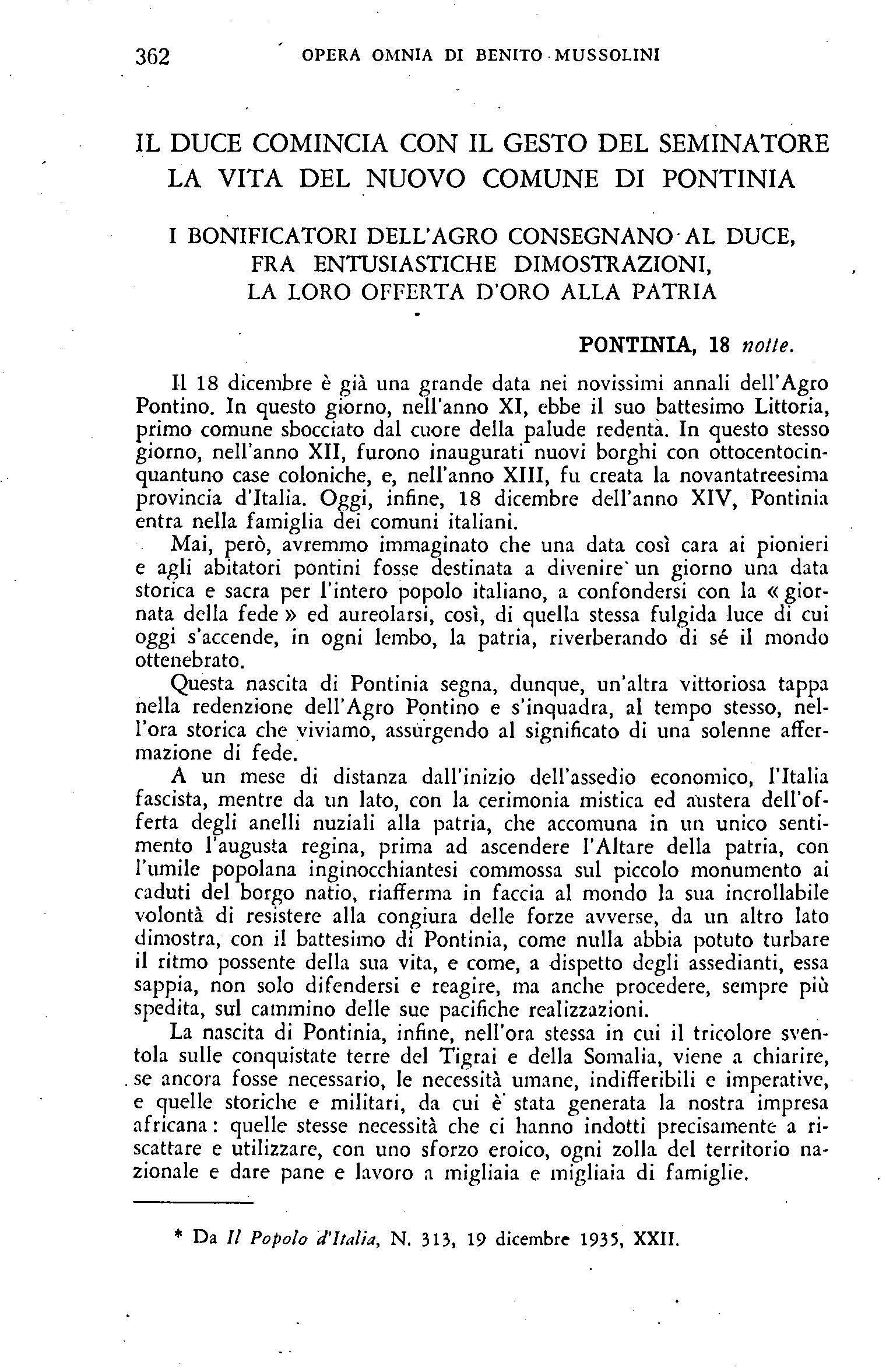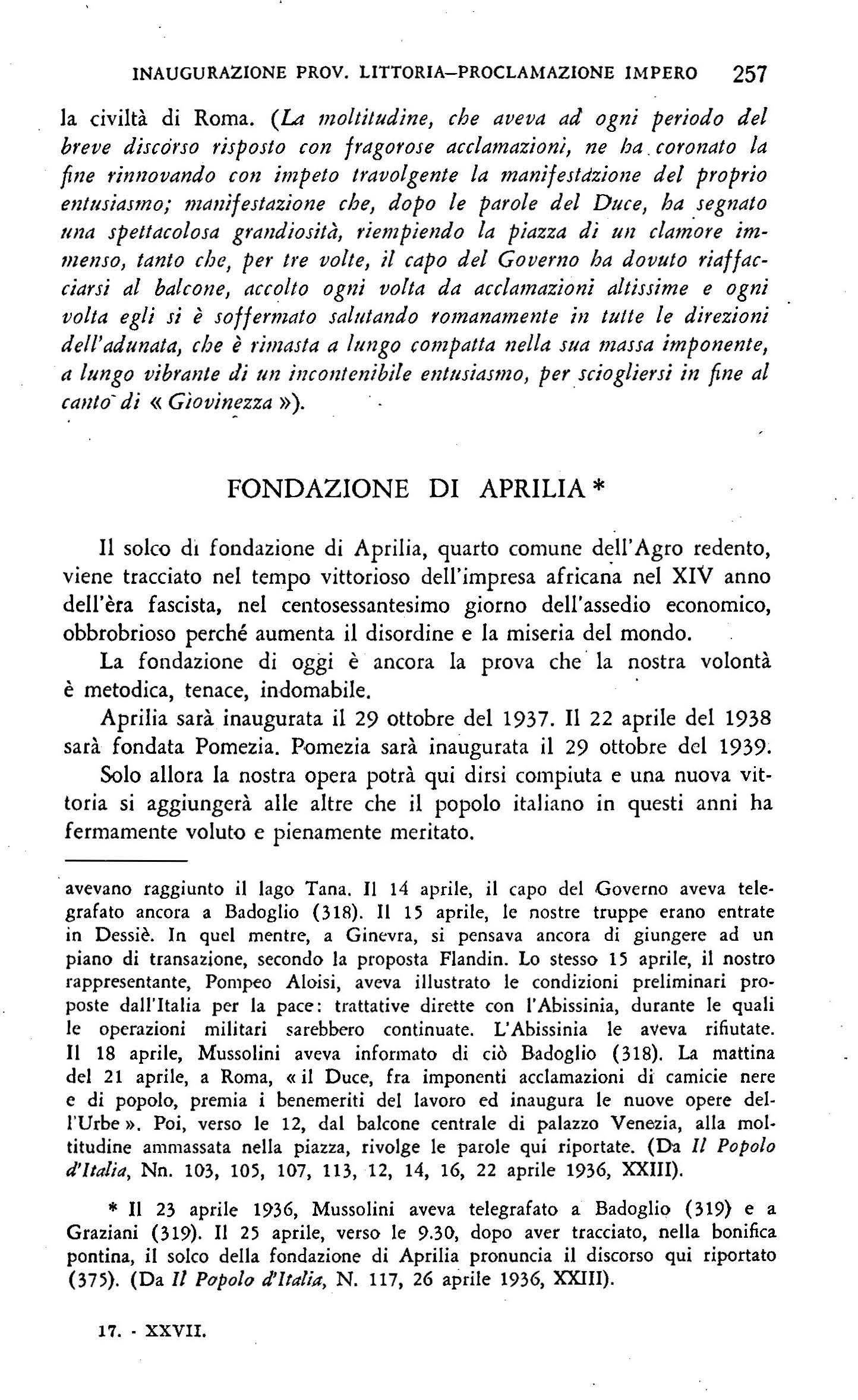 A_i,rilia, quarto comune dell'Agro Pontino, e nell'ondeggiare dei vessilli, a l balenio deile armi, fra indescrivibili manifestazioni d'entusiasmo, annuncia ai bonificatori acclamanti