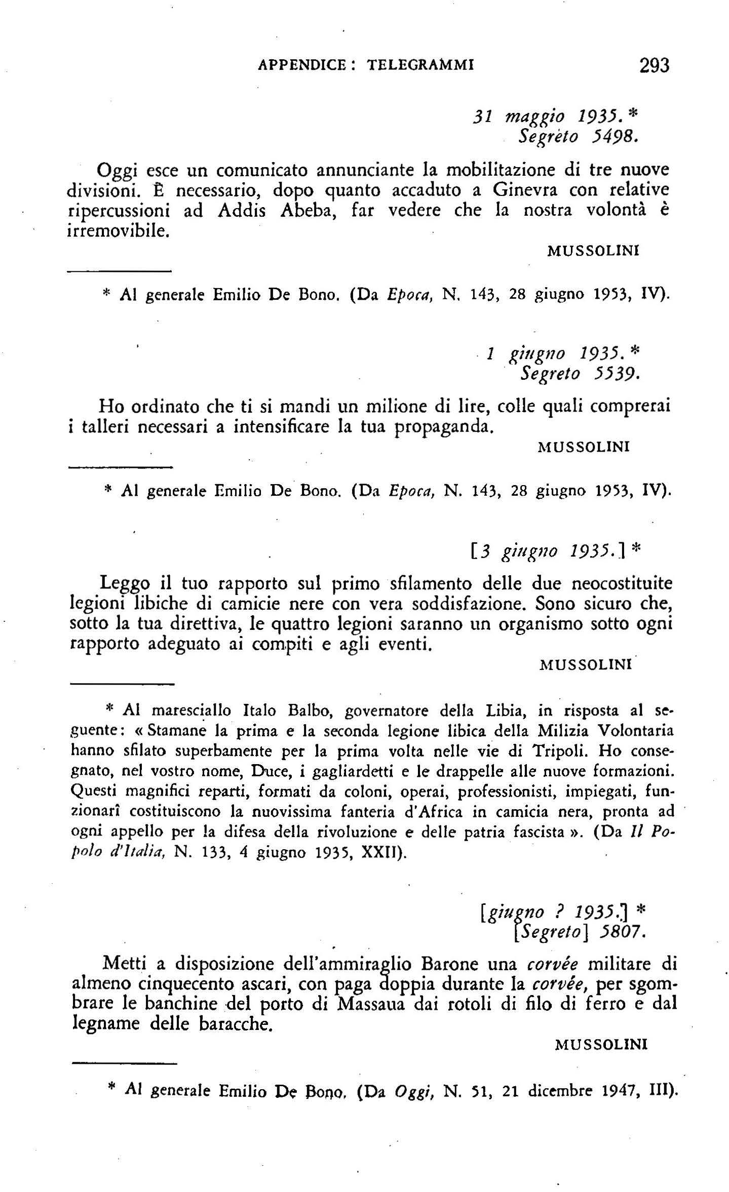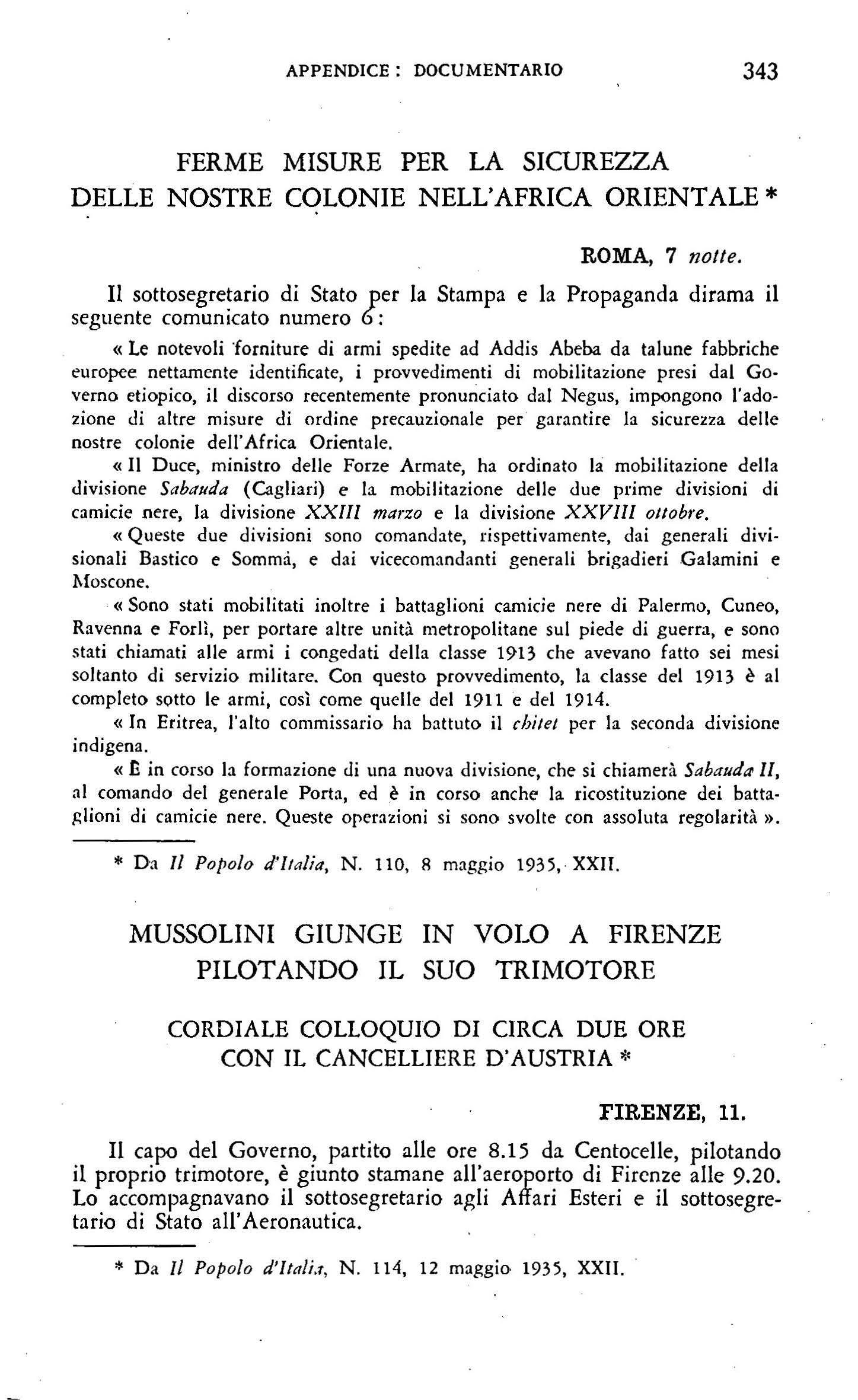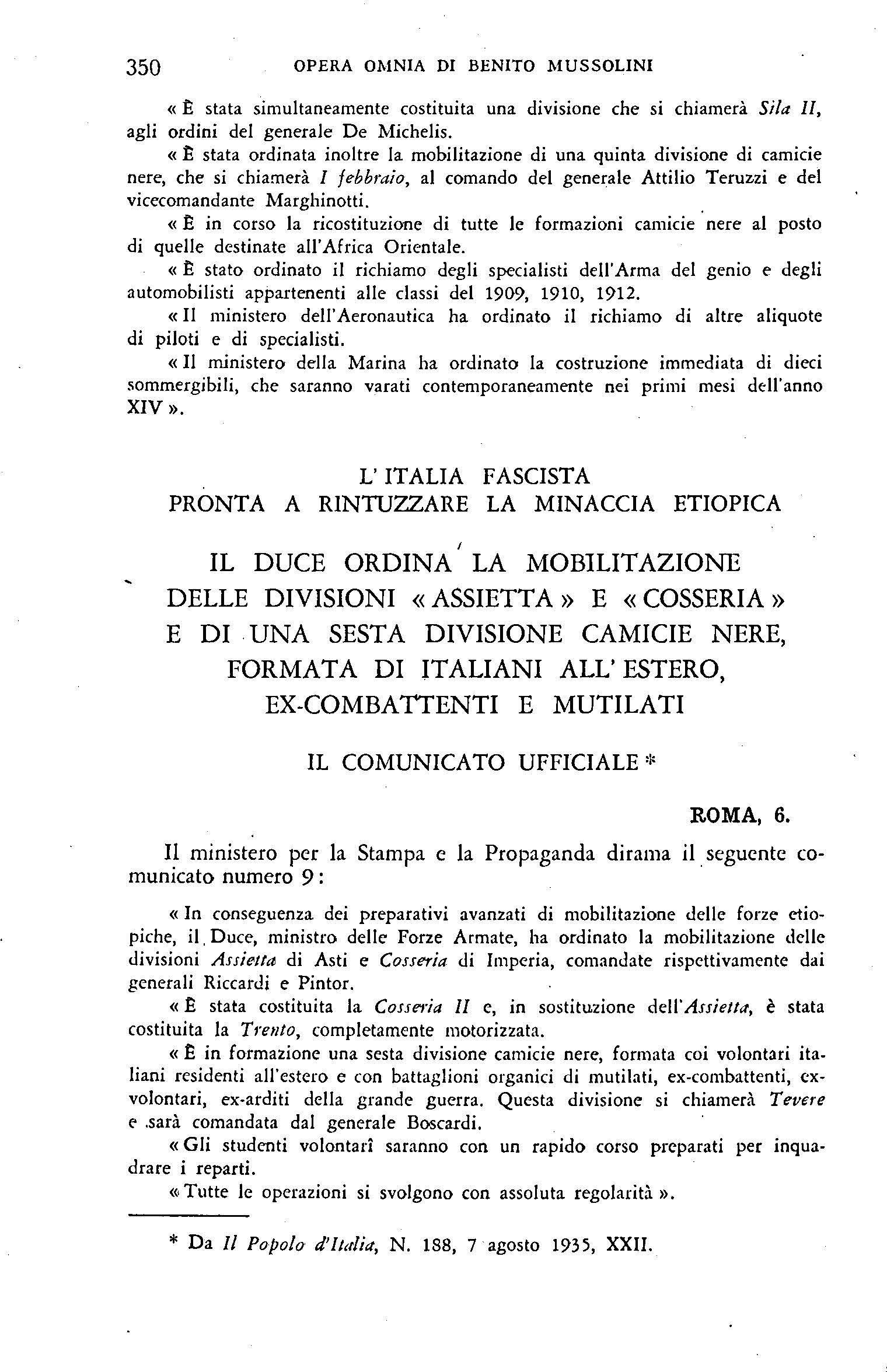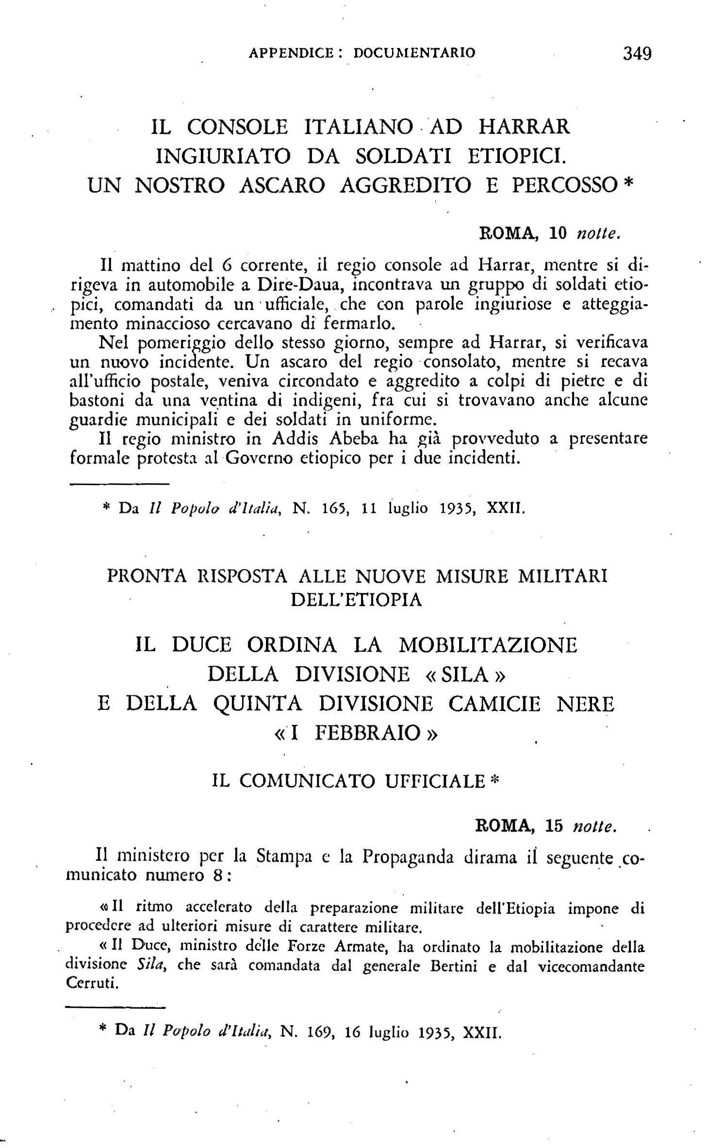 Pronta risposta alle nuove misu re militari d ell'Etiopia. li Duce or, dina la mobilitazione della d ivisione «.Sila» e della quinta divisione camicie nere « I febbraio». Il comunicato ufficiale ( 16 l uglio 1935) . . . . . . . . . . . . . .