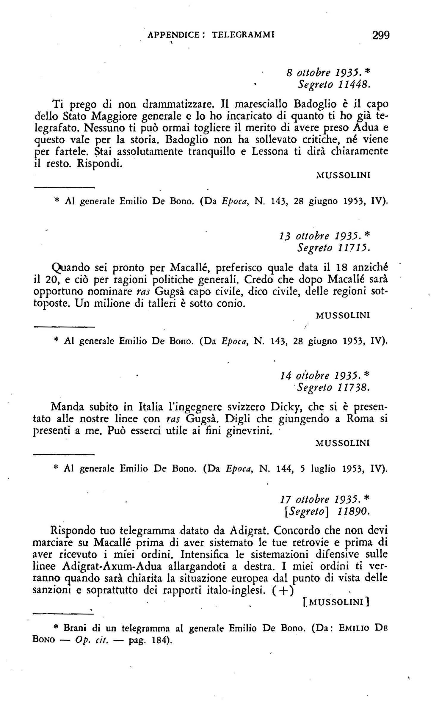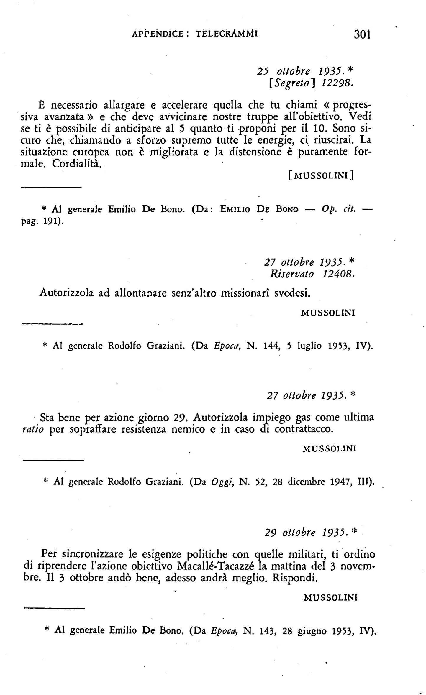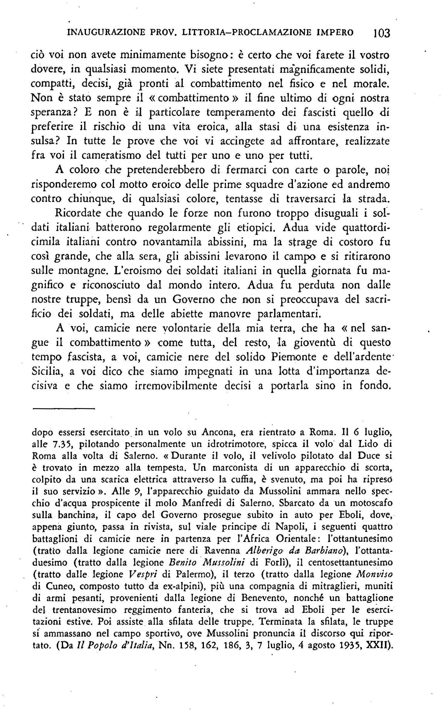 Pronta risposta alle nuove misu re militari d ell'Etiopia. li Duce or, dina la mobilitazione della d ivisione «.Sila» e della quinta divisione camicie nere « I febbraio». Il comunicato ufficiale ( 16 l uglio 1935) . . . . . . . . . . . . . .