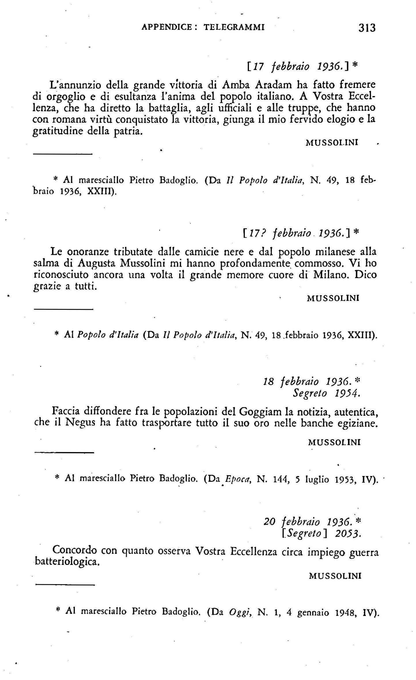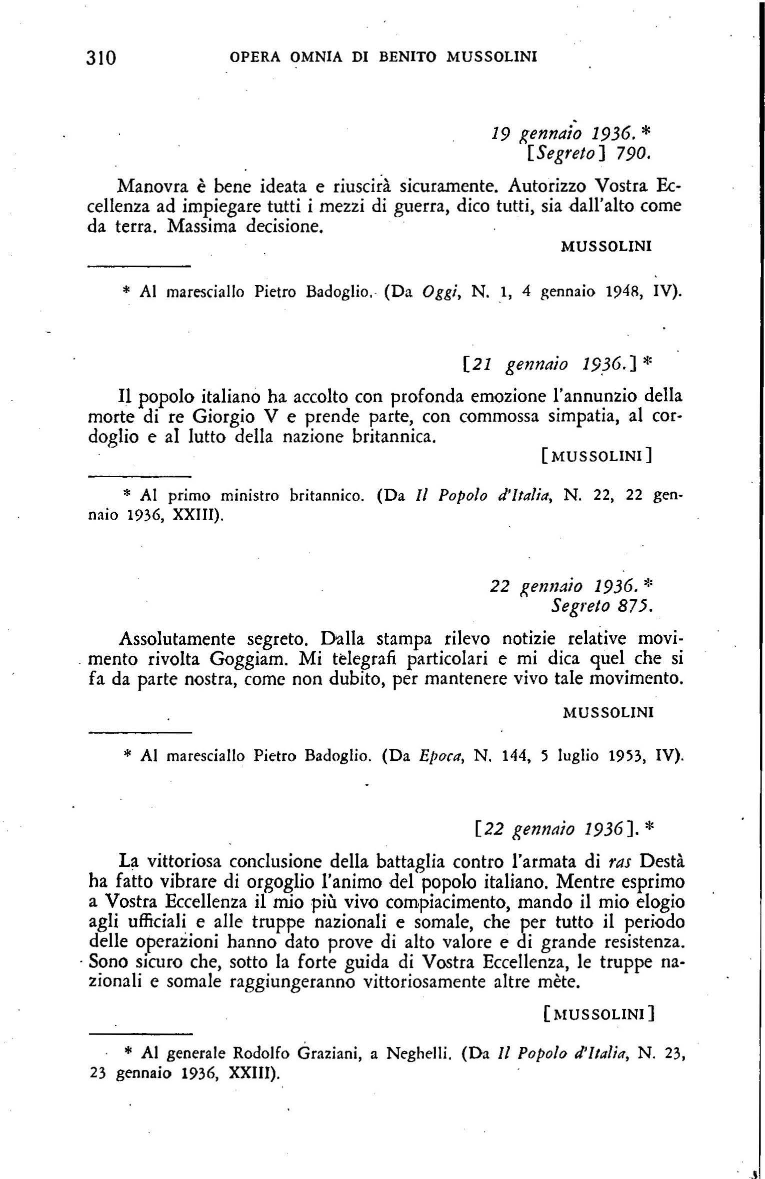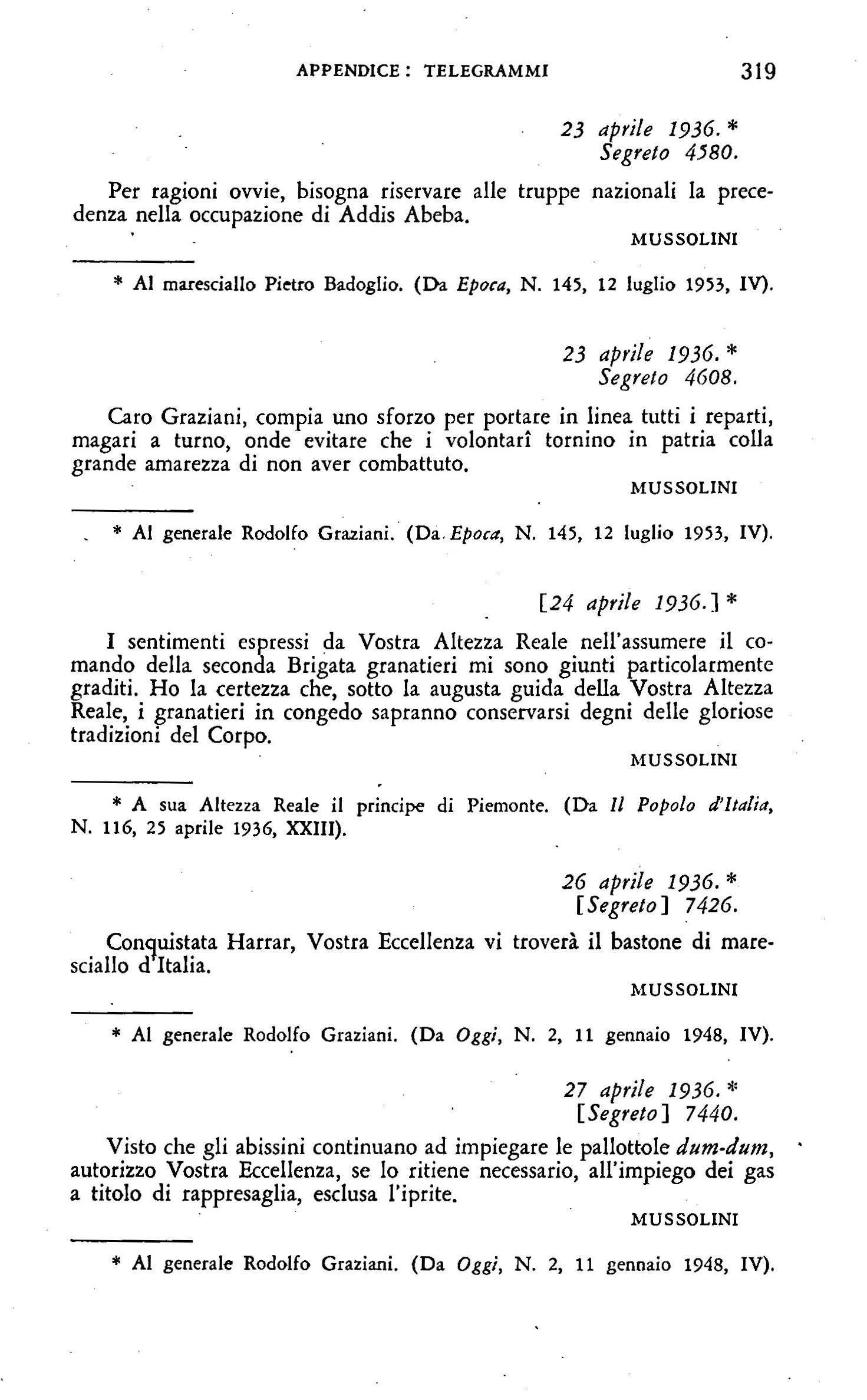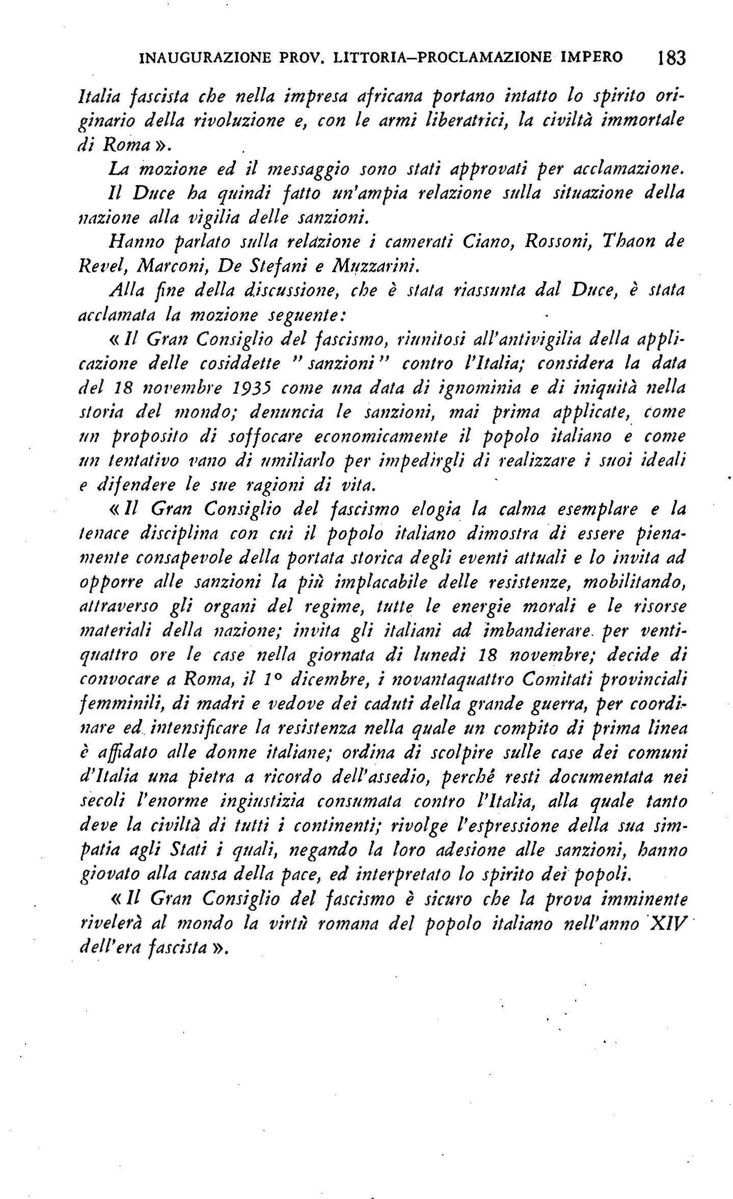 Pronta risposta alle nuove misu re militari d ell'Etiopia. li Duce or, dina la mobilitazione della d ivisione «.Sila» e della quinta divisione camicie nere « I febbraio». Il comunicato ufficiale ( 16 l uglio 1935) . . . . . . . . . . . . . .