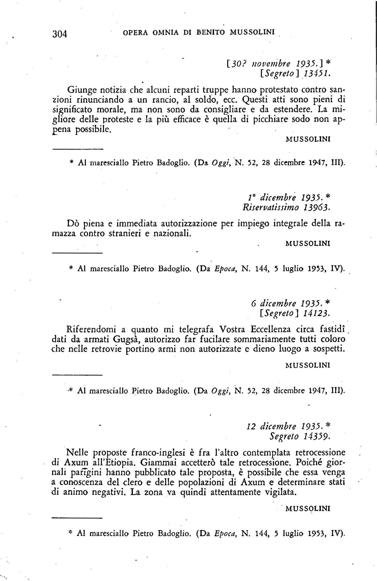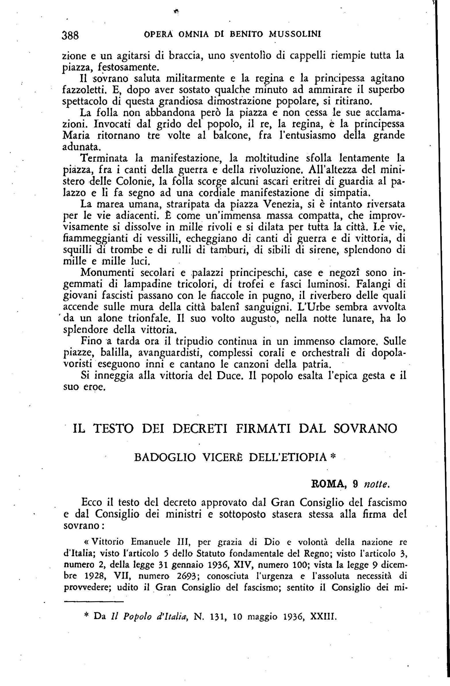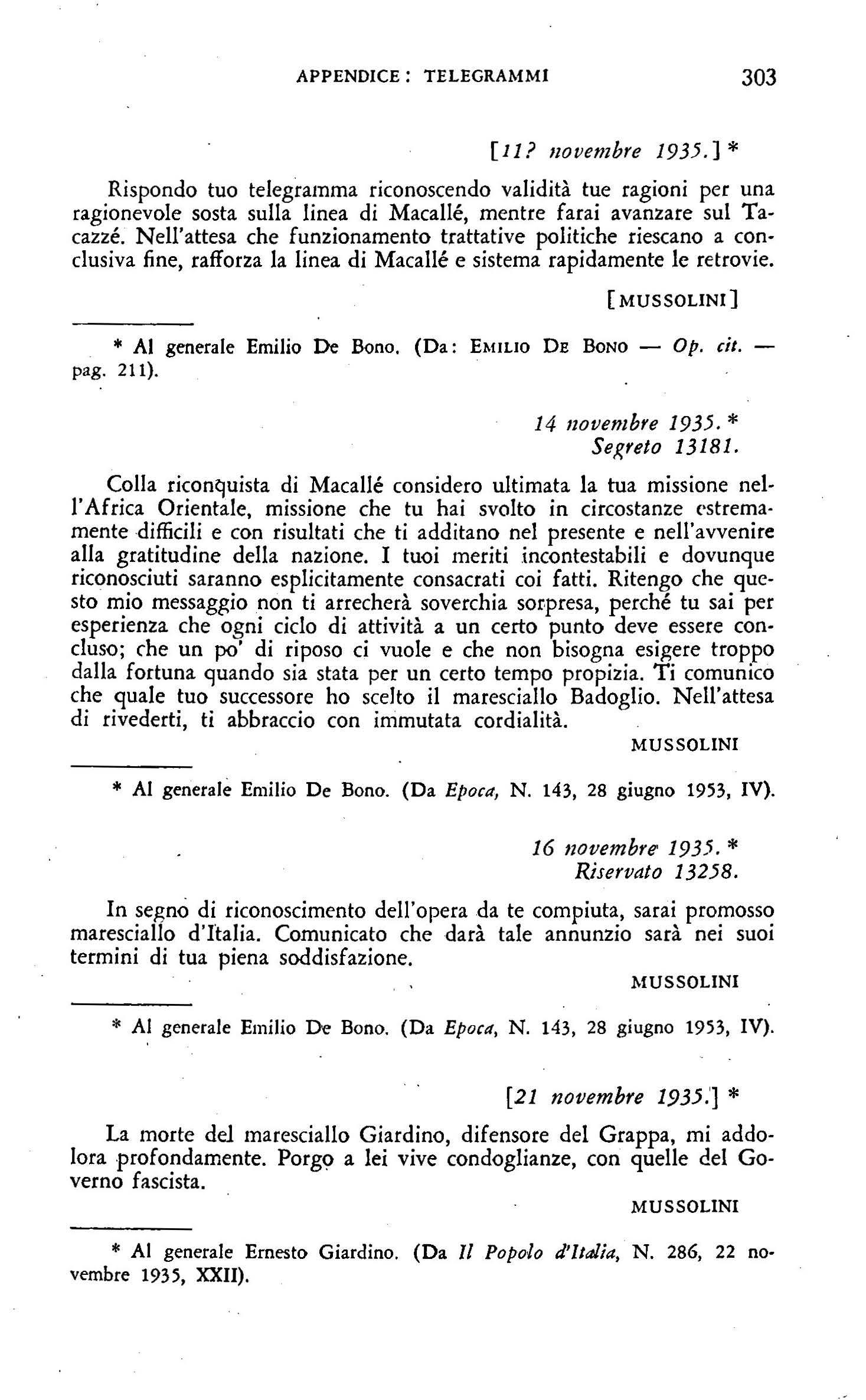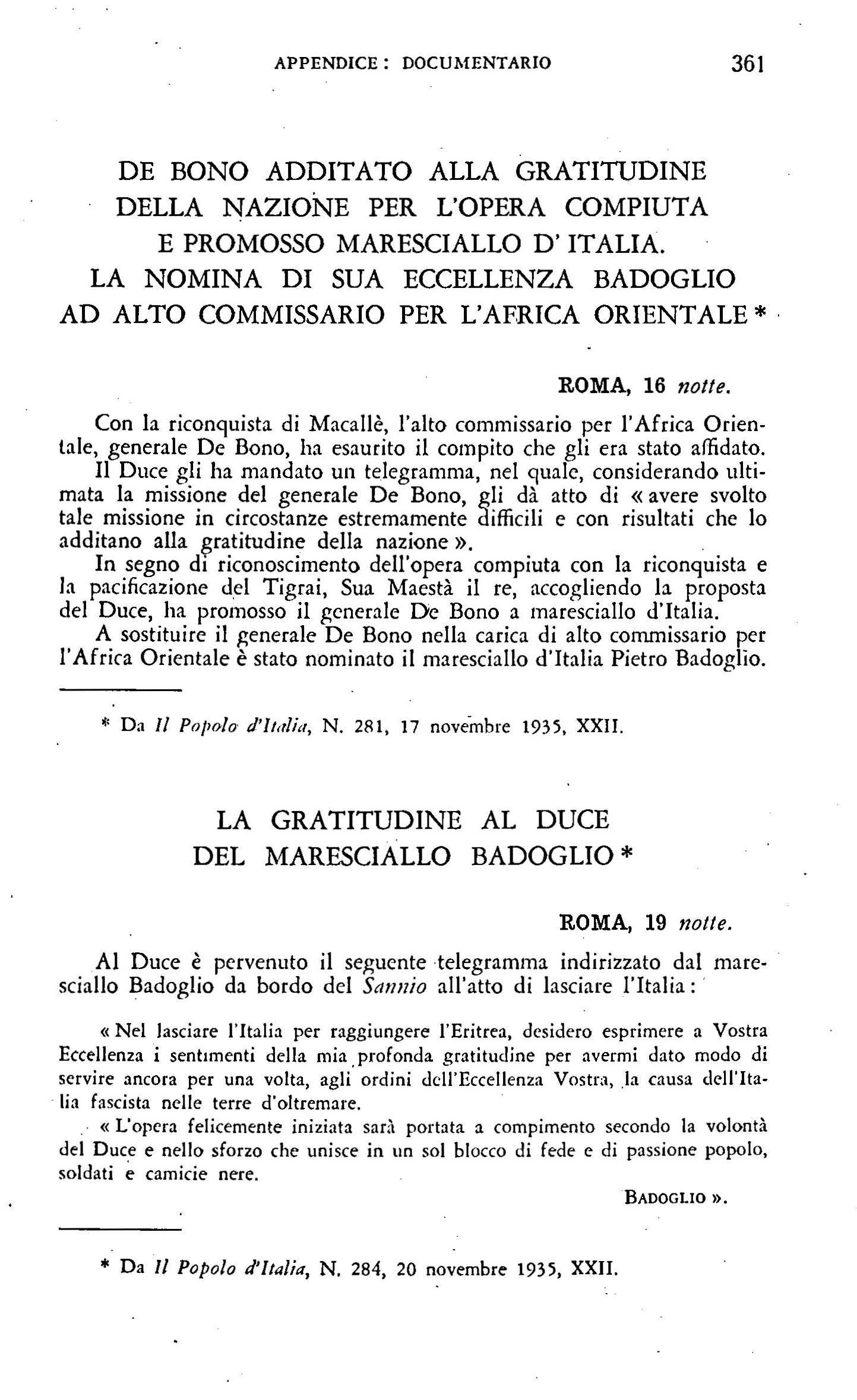 De Bono additato alla g rati tudine della nazione per l'opera compiuta e promosso maresciallo d'Italia. La nomina di Sua Eccellenza Badoglio ad alto comm issario per l'Africa Orienta le ( 17 novembre 1935) ,