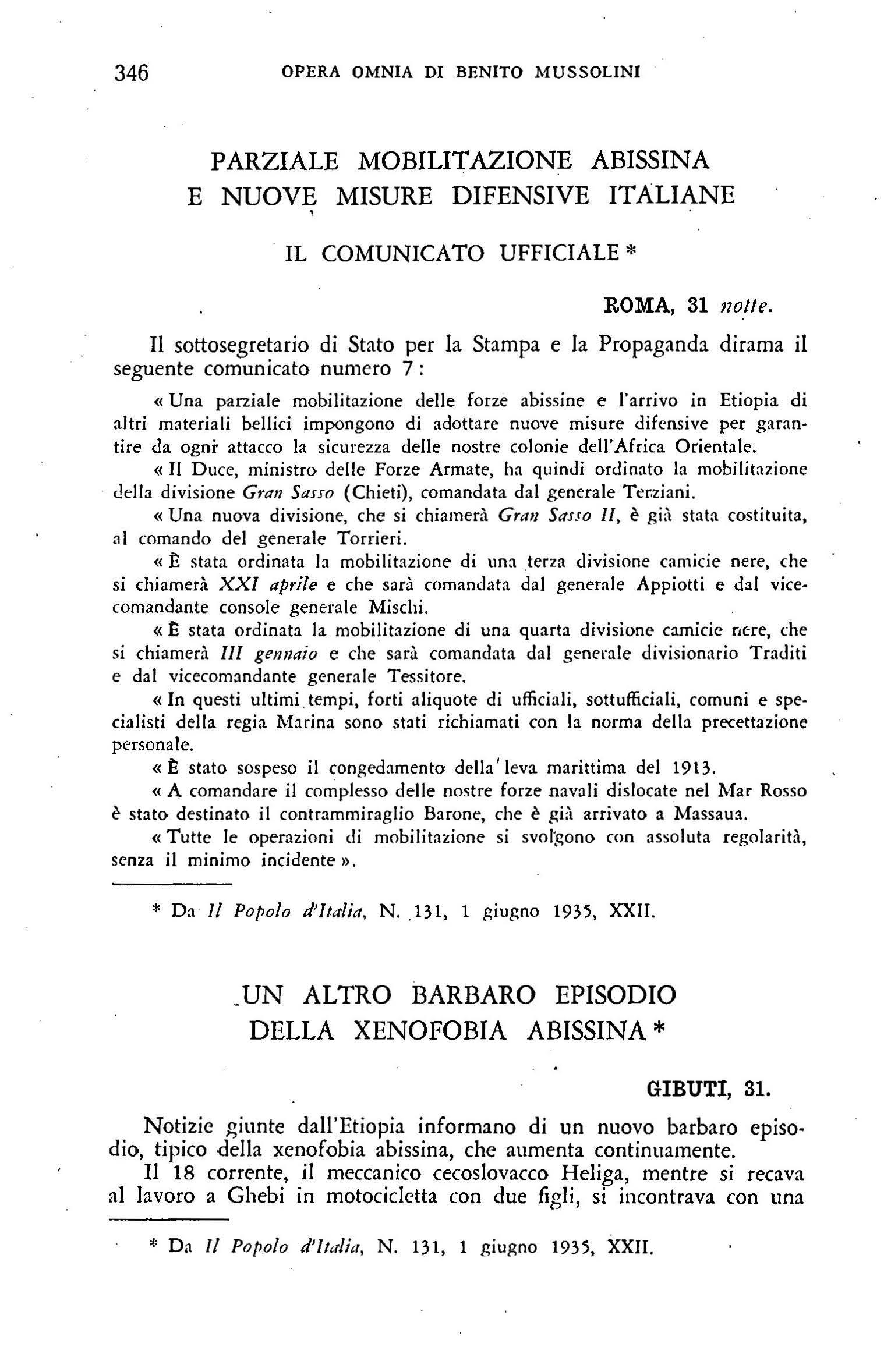 Parziale mobilitazione abissina e nuove misure dife nsive italiane Il comunicato ufficiale (1 giug no 1935) . .
