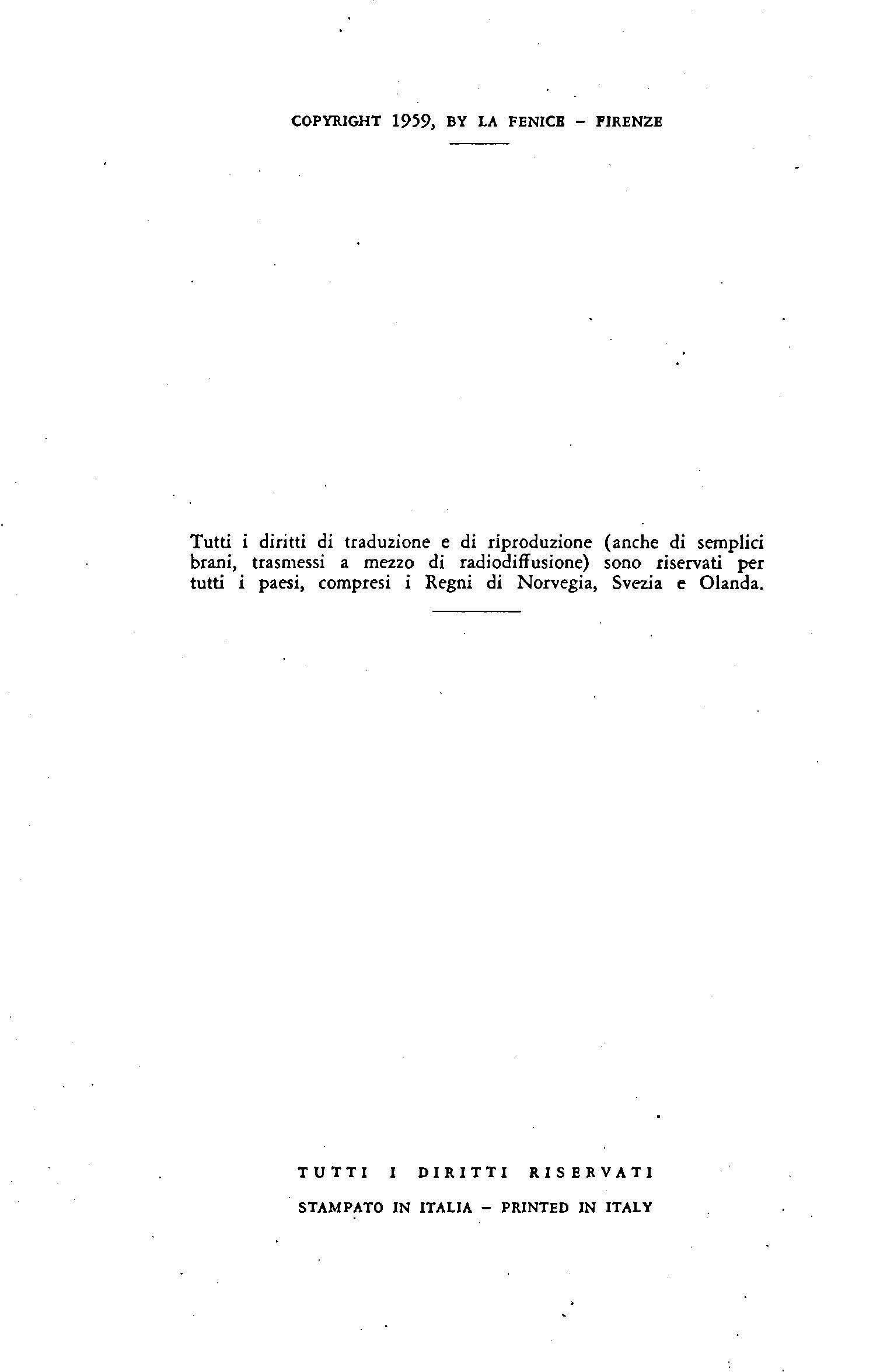 Tutti i di ritti di trad uzione e d i riproduzione (anche di semplici brani, uasmessi a me.:w di radiodi ffusione) sono riservati per tutti i paesi, compresi i Regni di N orvegia, Sve-zia e Olanda.