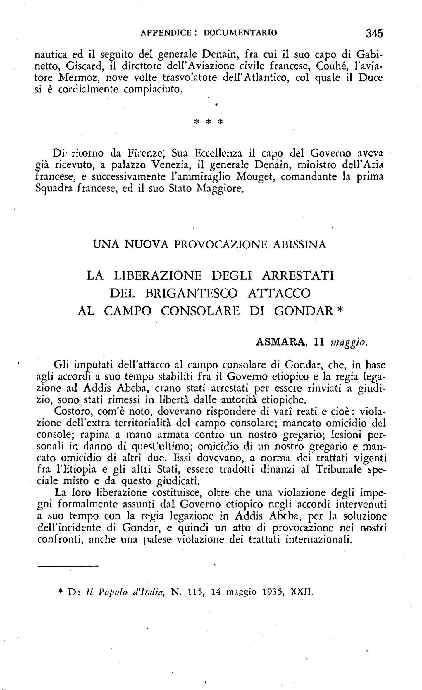 Una nuova provocazione abissina. La liberazione degli arrestati del brigantesco attacco al campo consolare di Gondar (1 4 maggio 1935) . . . . .