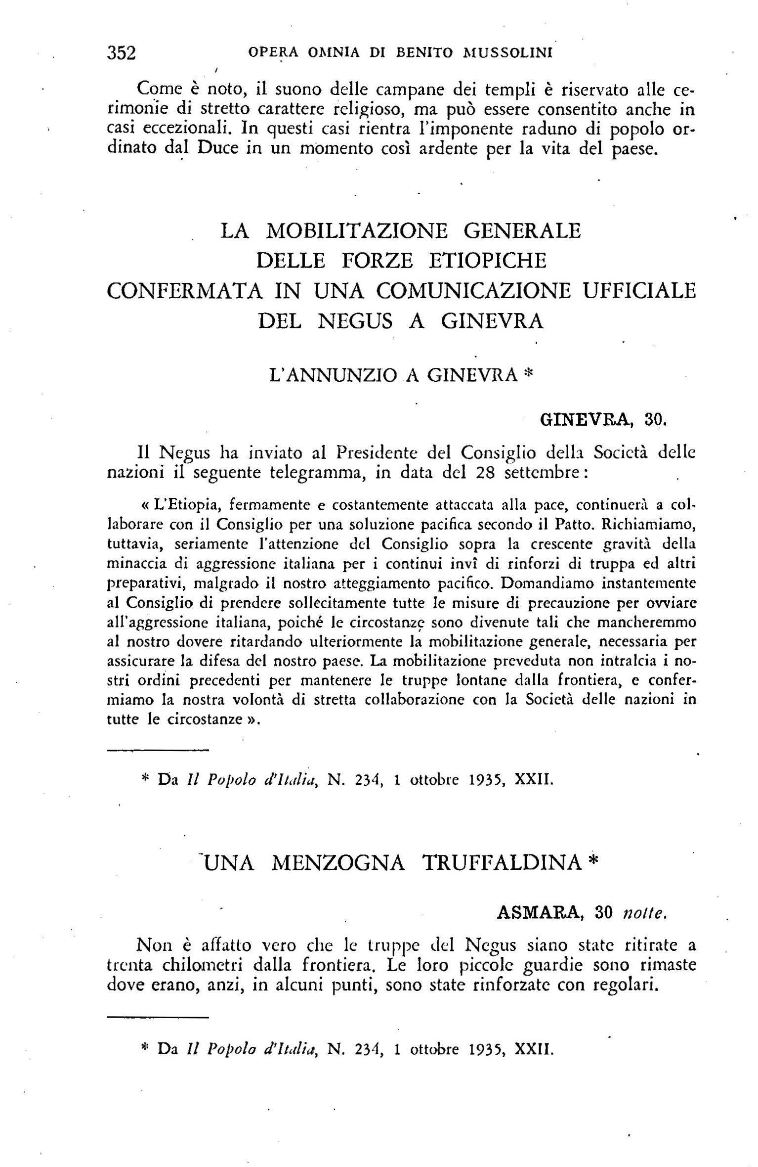 La mobilitazione generale delle forze etiopiche confermata in una comunicaziorie ufficiale del Negus a Gi nevra. L'annunzio a Ginevra ( 1 ottobre 1935) . . . . . . . . . . •