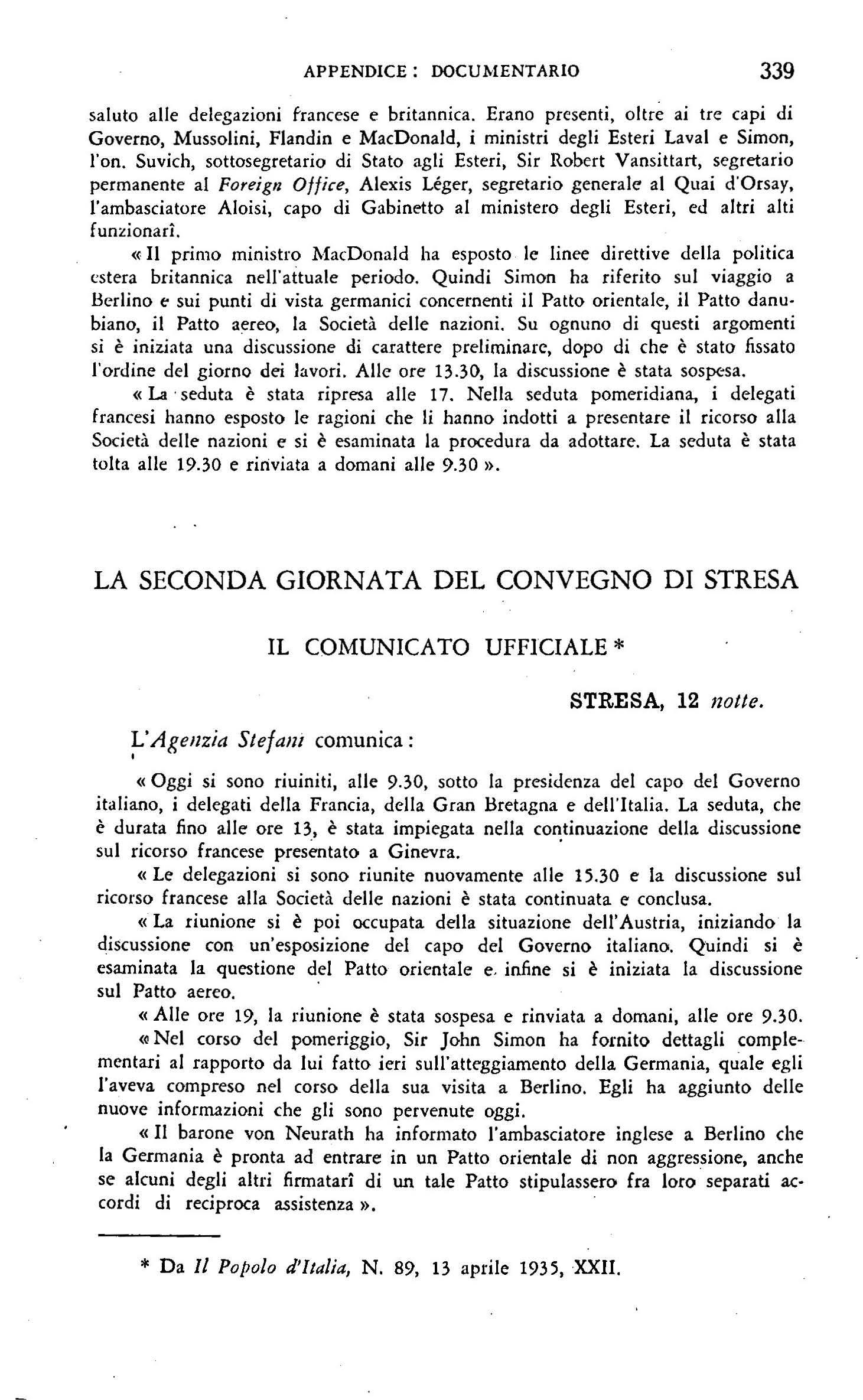 La seconda giornata del convegno di Stresa. Il comunic:ito uffici:ile (I 3 aprile 1935)
