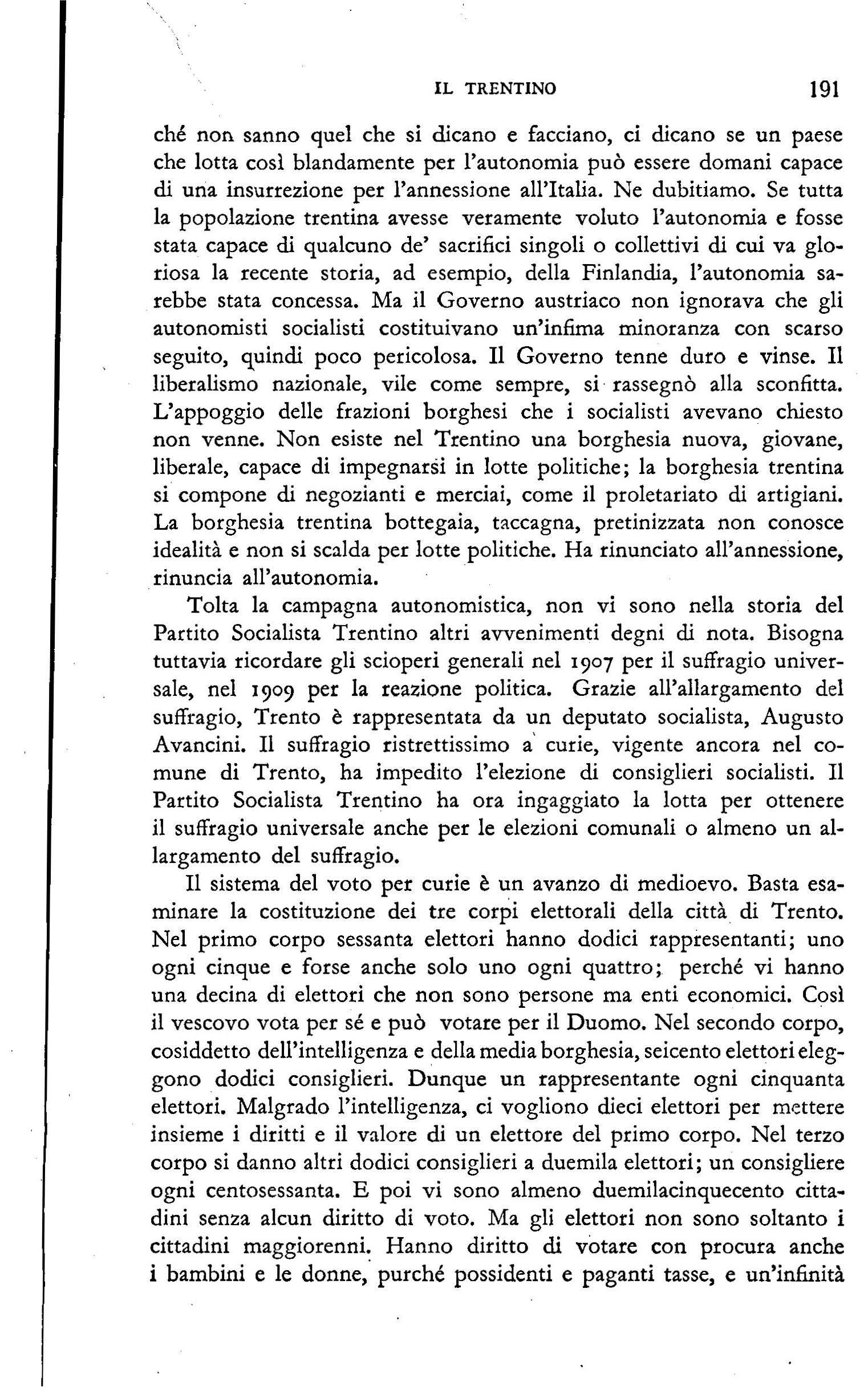 « Una certa severità e forse unilateralità di giudizio sono spiegate d a l fatto che l"autore è militante in un partito ed anc he a Trento visse sempre tra i suoi corre"lig ionari; ciò che può aver infl uito a turbargli alquanto la serenità del giudizio. Ma egli onestamente fa palese già. in testa al volume la sua qoal it;\. di socialist.l. e quindi di osservatore parlig i.ano.