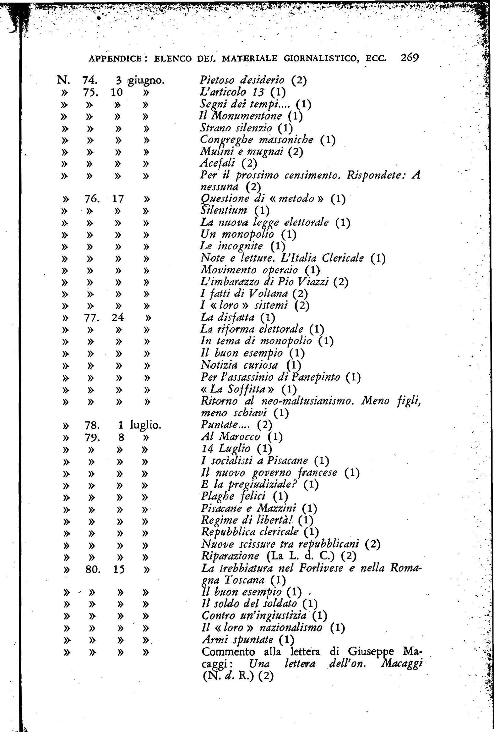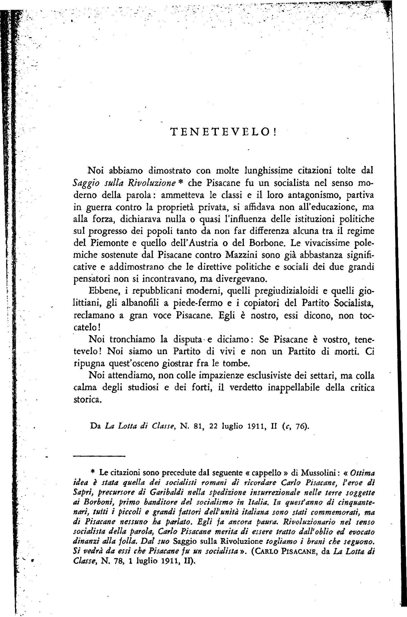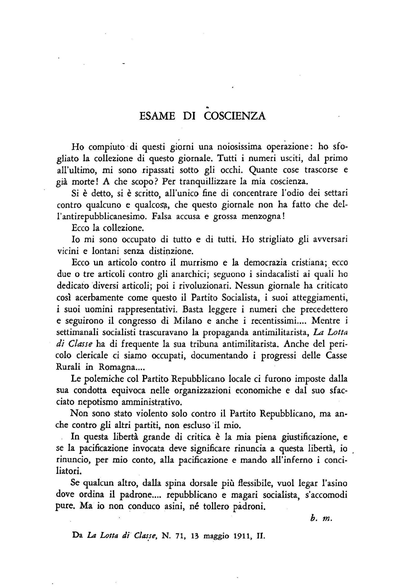 Ecco un articolo contro il monismo e la democrazia cristiana; ecco due o tre articoli contro gli anarchici; seguono i sindacalisti ai q ual i ho dedicato diversi articoli; poi i rivoluzionari. Nessun giornale ha criticato cosl acerbamente come questo il Partito Socialista, i suoi atteggiame nti, i suoi uomini rappresentativi. B asta leggere i numeri che p recedette ro e seguirono il congresso di Milano e anche i recentissimi.... M entre i settimanali socialisti trascuravano la propaganda antimililarista, La Lolla di Cla.ue ha di frequente la sua tribuna antimilitarista. Anche del pericolo clericale ci siamo occupat i, documentando i progress i delle Casse Rurali in Romagna...