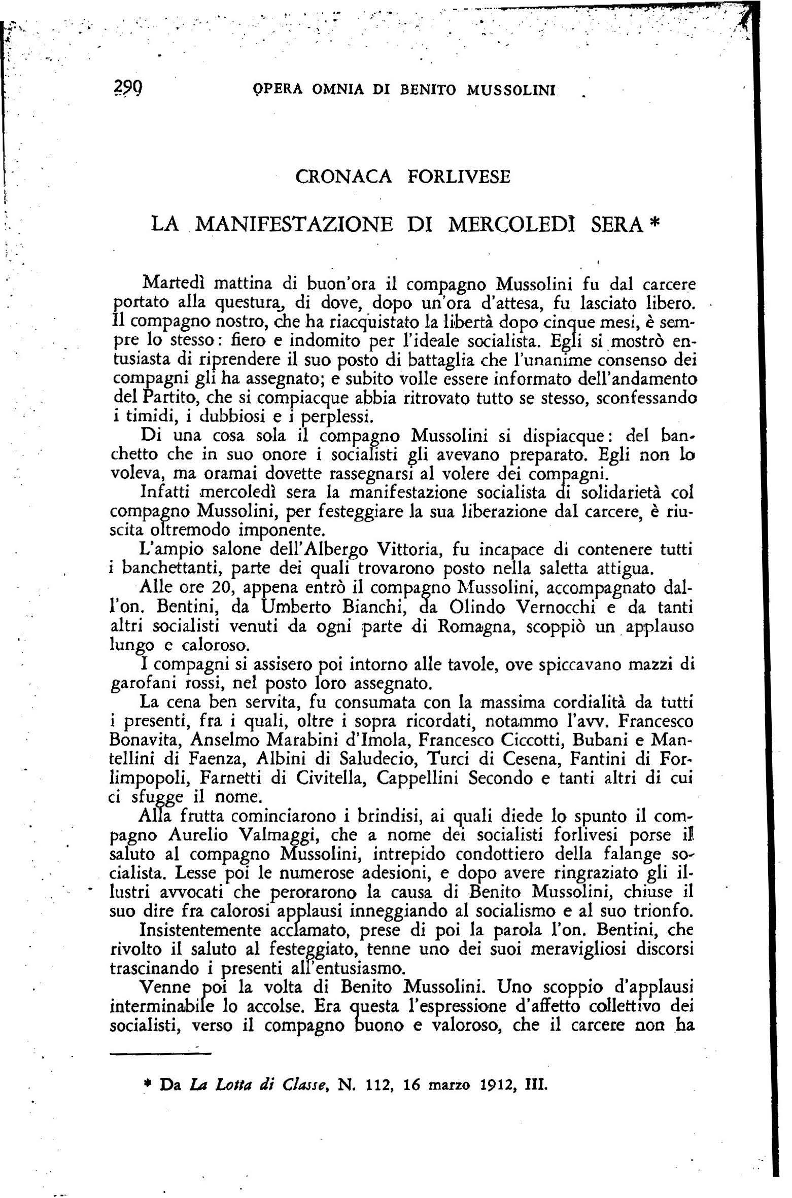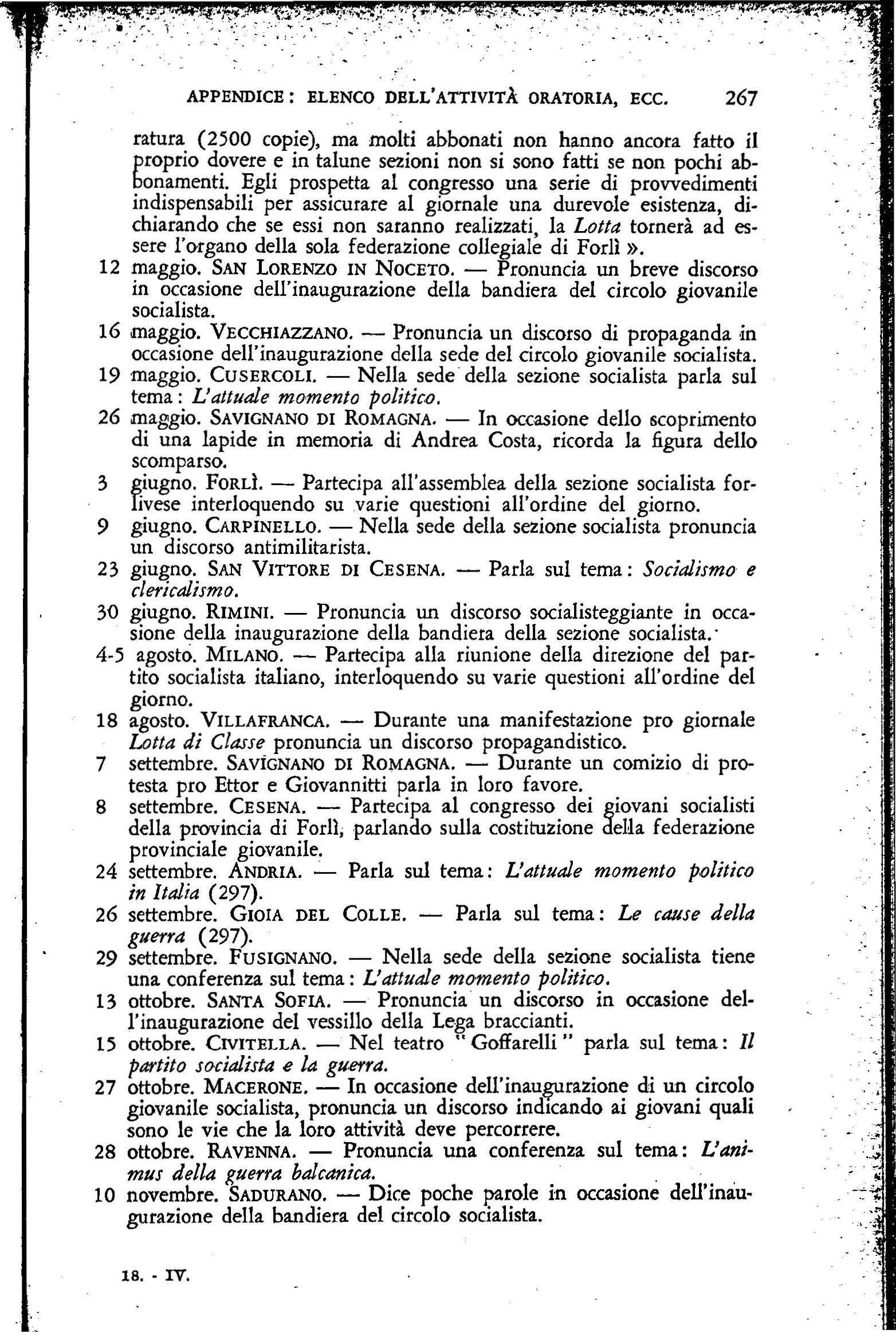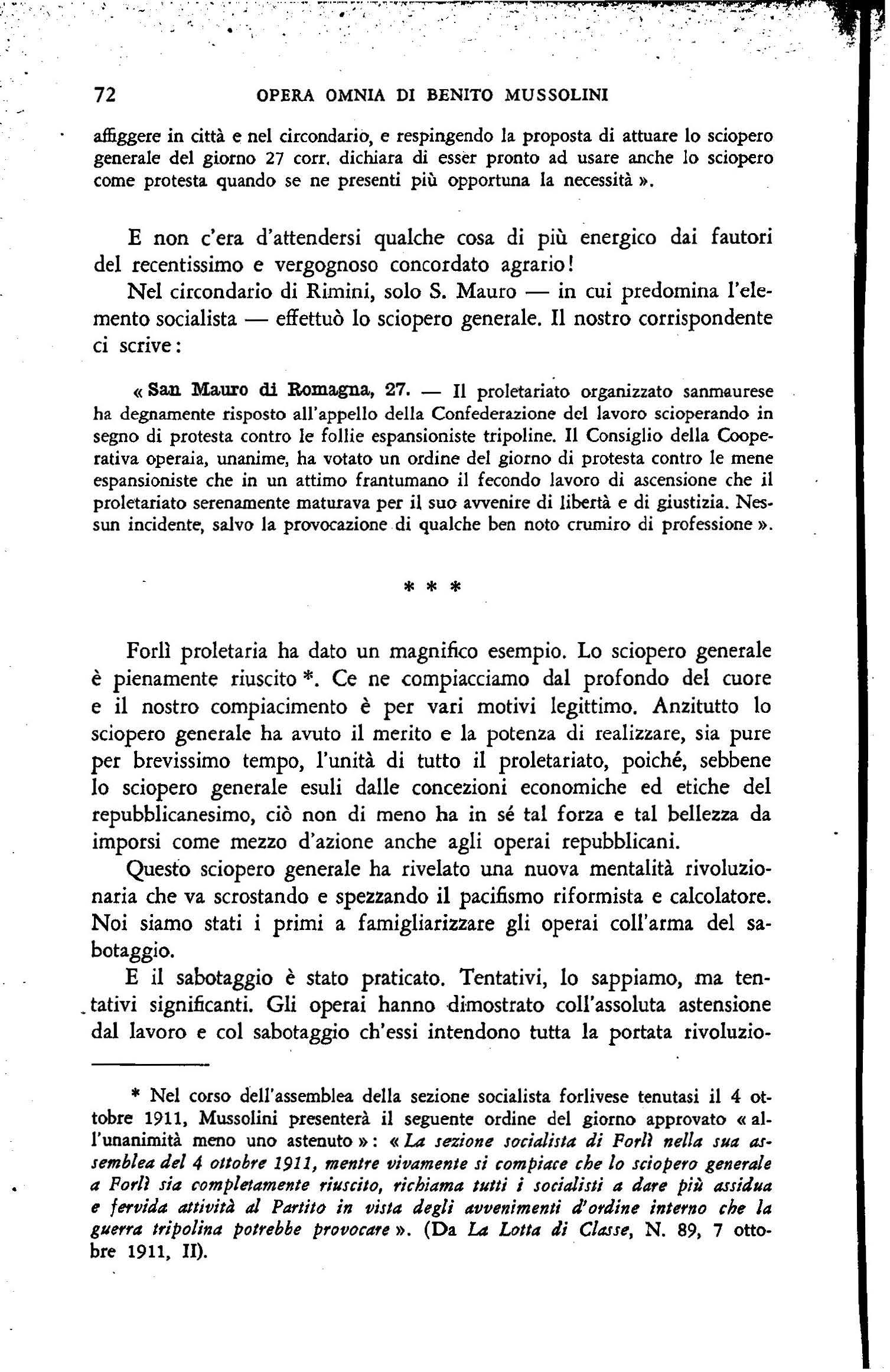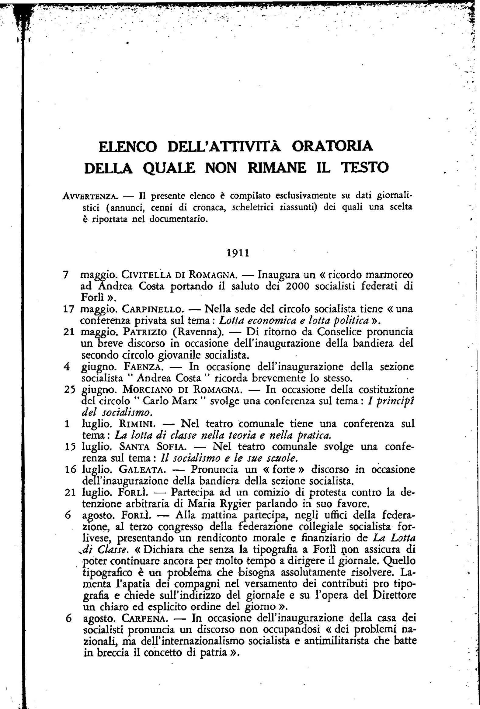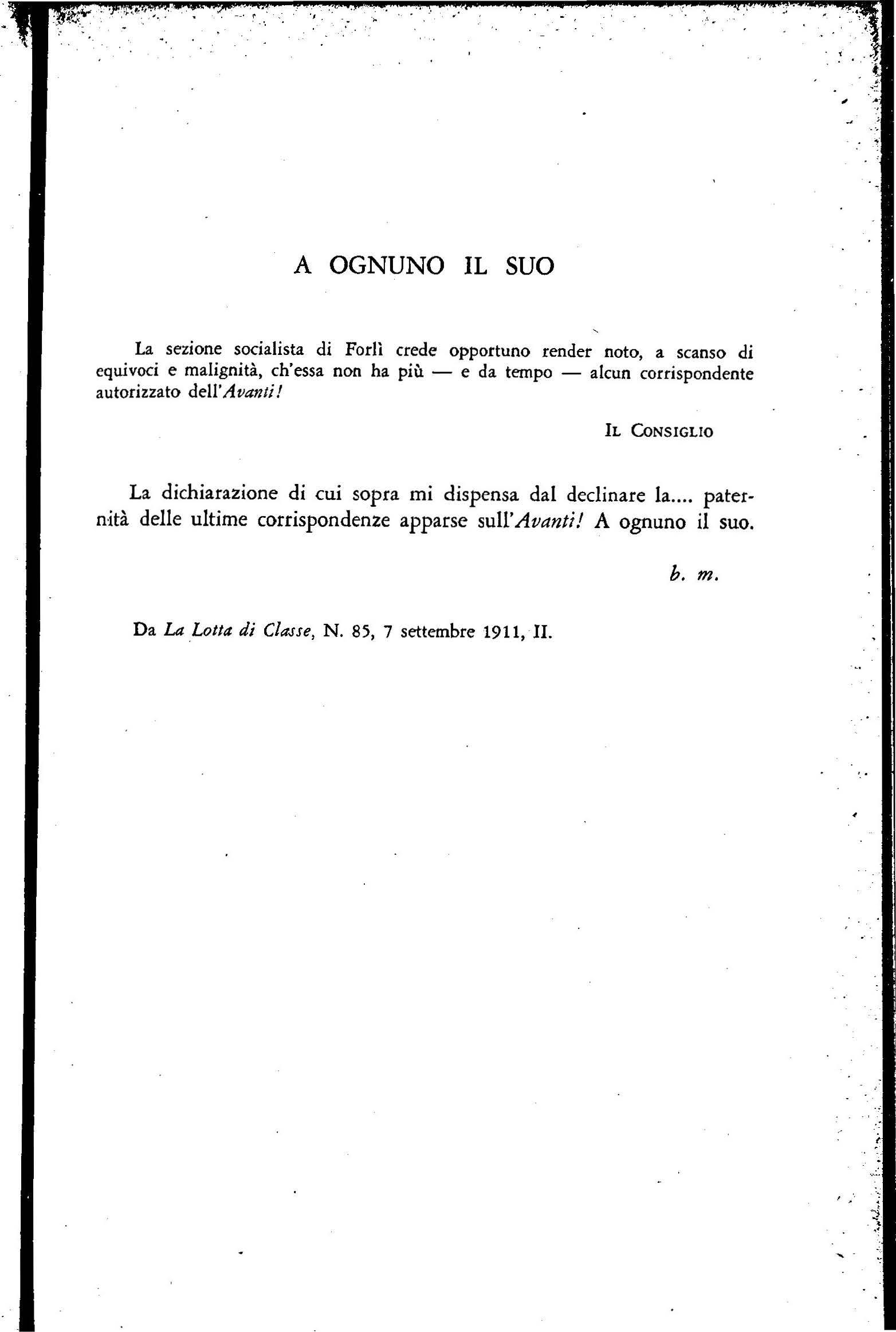 Dal 7 maggio al 23 settembre 19 11 , Mussolini si occupa del rilievo esagen.to d ato dalla. stampa agli incidenti di Vjllafranca del 30 aprile (Ili, 2'51; '5) ; difende L; Lcrt4 di ClaJJt da.ll'accusa di essere stata esclusivamente antirepubb licana (7); esamina l'argomento « i socialisti e la mezzadria» (8) e gli ultimi avvenimenti della vita operaia italiana (10); commenta l'arresto del sindacalista McNamara, imputato, tra l'a ltro, di aver Ì,Osto la. dina.mite nella. sede del Tim e1 di Los Angeles nell'ottobre del 1910 {16); rettifica affermazioni de /:A vvenire d'[Jalia che lo riguardano (17, 4 7); attacca il parlamento (18); redige La federazÙJr, e 10rialista nel collegio di For/J. Noir e noJizi , ( 19 ), Il s11hid11- p,r f4me Elog;o funebre (49) e MeJJaggio di p,ue (:i2); dN.ica quattro articoli al d issidio tra i ma~ tri forl ives.i (23, 28, 37, 43) e uno al convegno degli anarchici romagnoliemiliani tenutosi a Faema verso la fin e di giug no (3'5); rievoca Alesundro Balducci (7 febbraio 18'57-30 giugno 1904), « maesuo e duce dei socia listi forlivesi» (33); scrive nella rubrka Noli! I! Len11r1t (39, 4'5); critica la politica di Giolitti e dei deputati socialisti (41); polcmiu:a con i repubblicani sulla figura di Carlo Pisacane ( 48); prutilla una corrispondenza da Cusercoli ('57); pubblica un trafiletto (H) chi: provuca una smentita di Pietro Neruti 06, 60); invia corrispondenze all'Av,1nli.' sulla lotta agraria di Romagna (80-95), sul movimentc.. socia lista nel for li vese (95, 96) e su un conflitto tra repubblicani e socialisti avvenuto a Meldola il 3 settembre (97) ; prosegue nella propaganda o ra toria (13, 265-266); i l 23 settembre pubblica un articolo dove afferma che nel· l'eventualità di una nostra occupazione di Tripoli « il proletariato ital iano deve · tenersi pronto a effettuare lo sciopero generale» ('59). (L'8 settembre 19 11 le federazioni socialiste dei collegi di Fori!, Cesena, Rimini e Sant'Arcangelo si ·erano unite in un'unica organi zzazione: la federazione socialista inlercollegiale romagnola con sede a Cesena e con seg retuin politico Francesco Gccotti (277)).