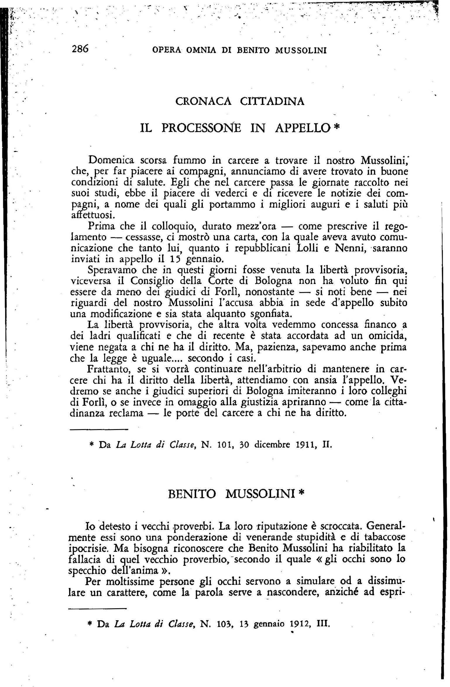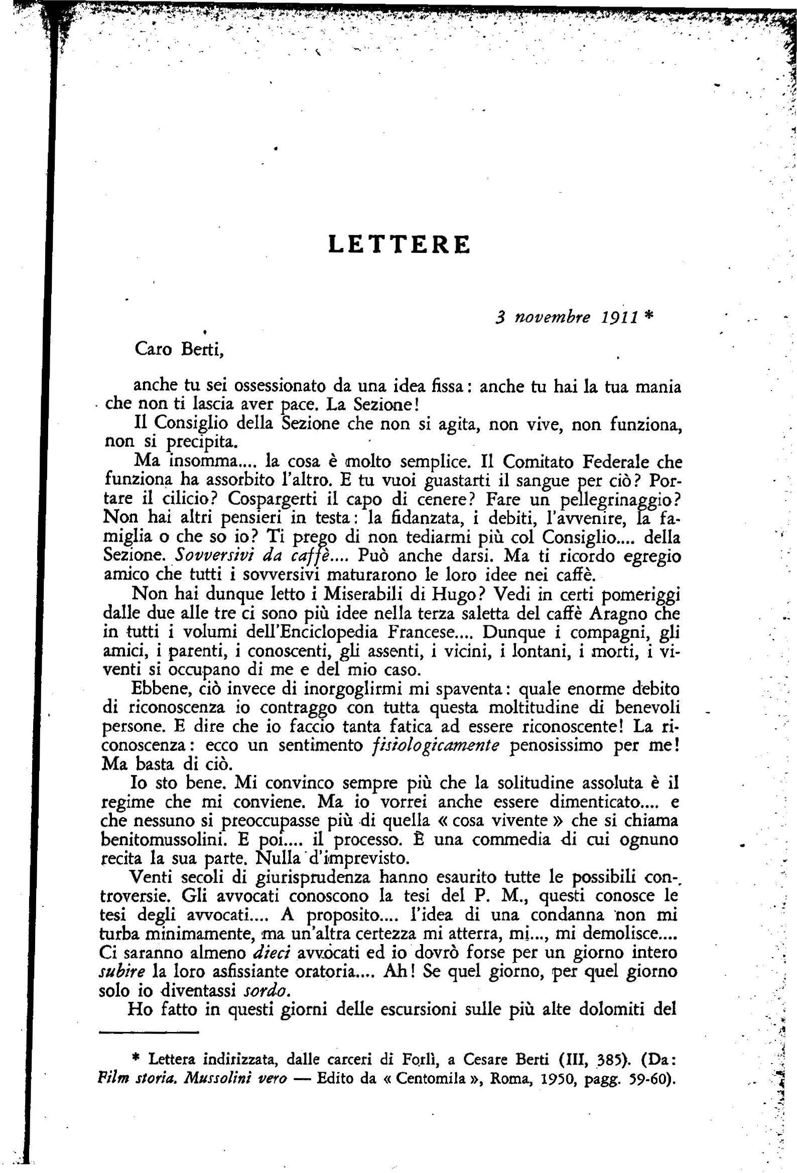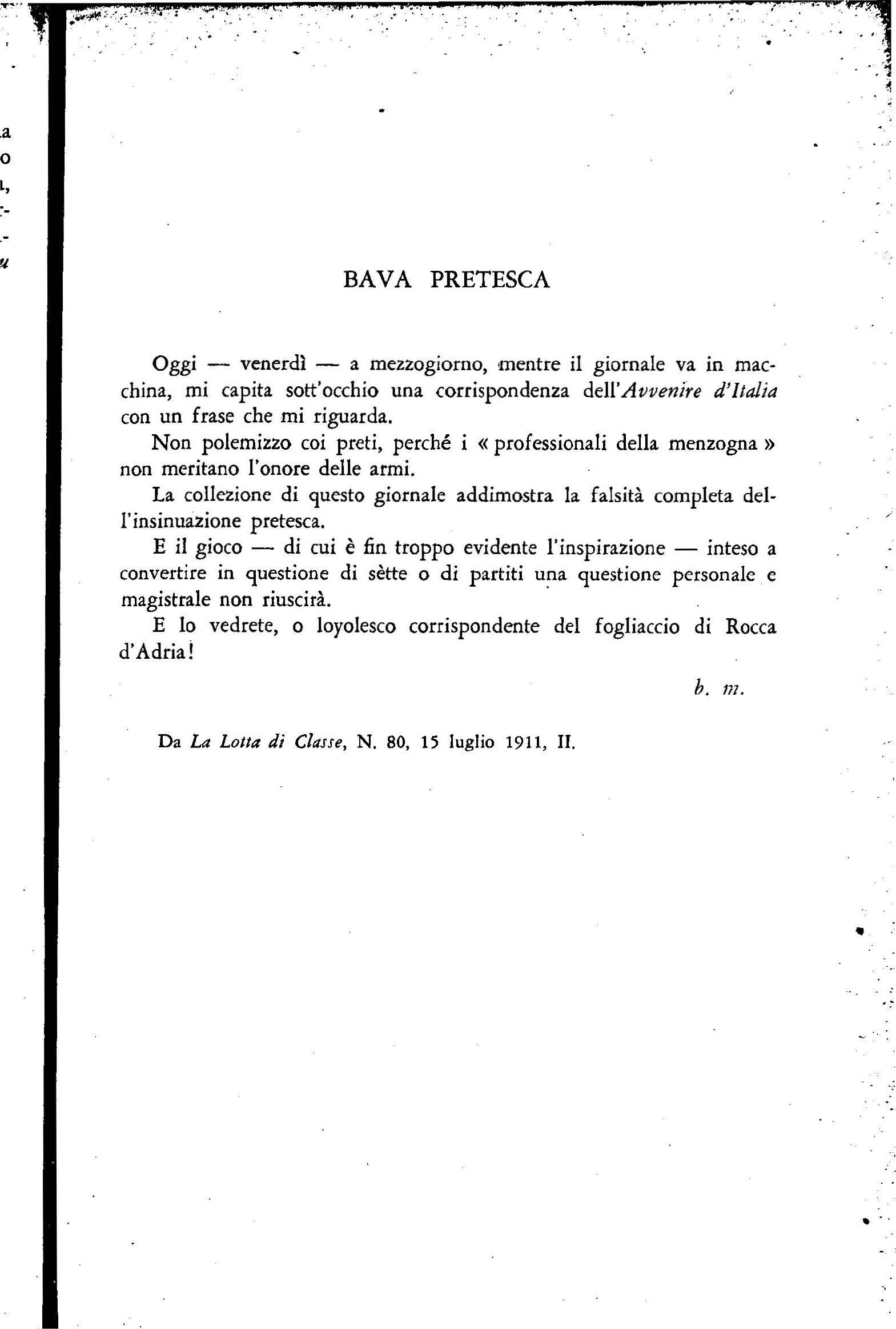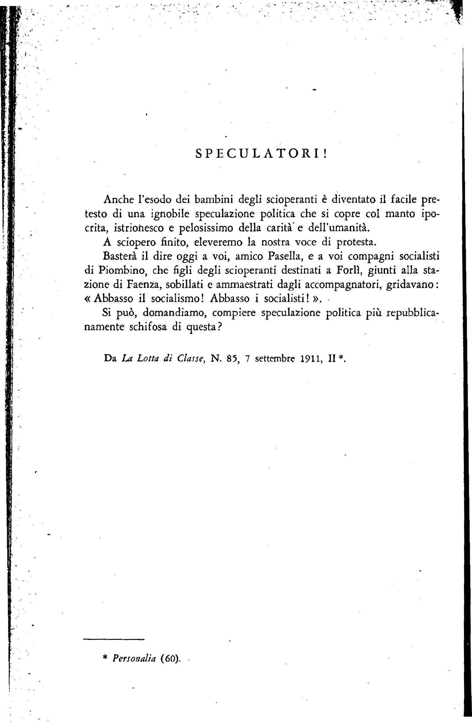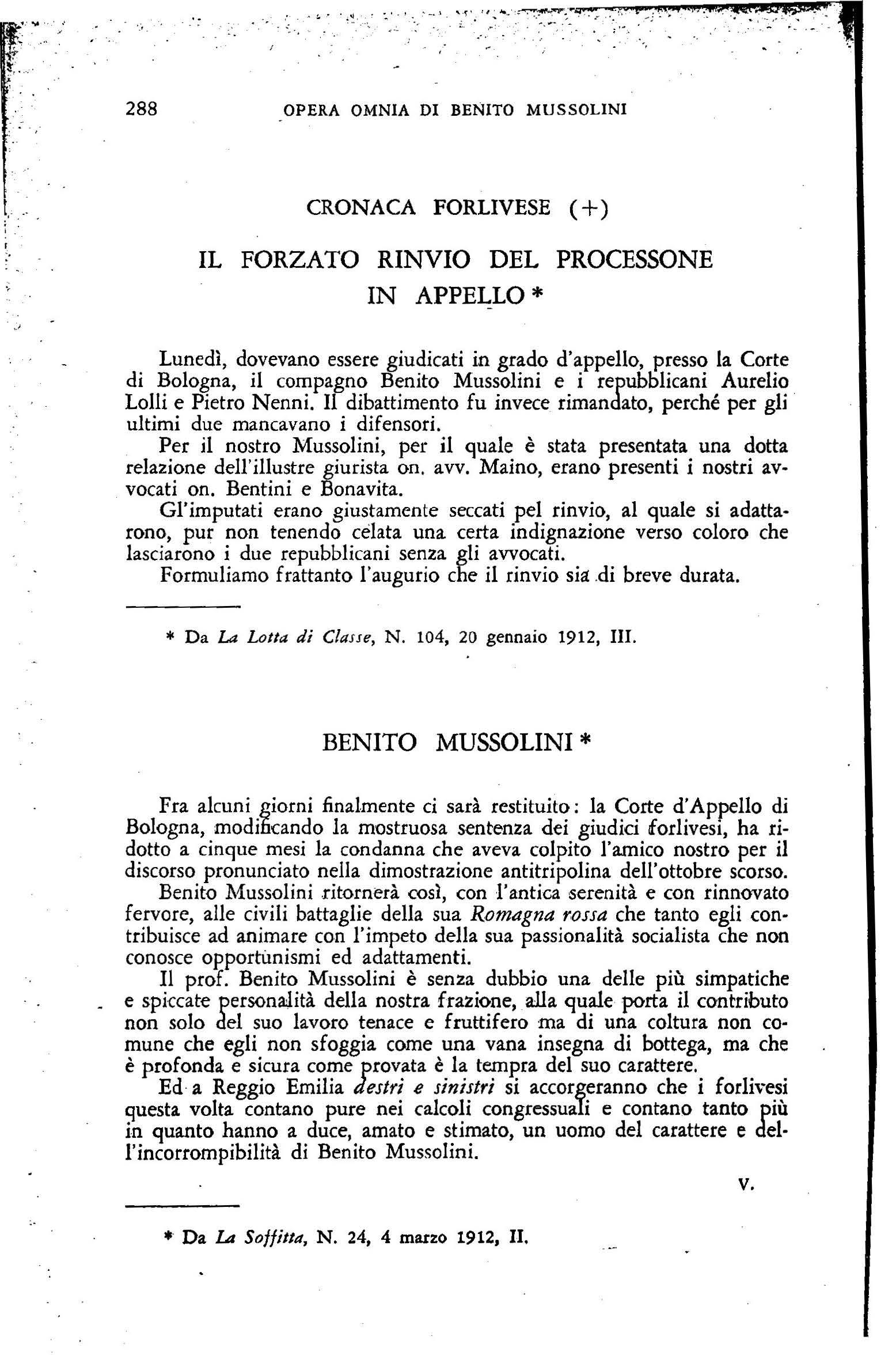 Dal 7 maggio al 23 settembre 19 11 , Mussolini si occupa del rilievo esagen.to d ato dalla. stampa agli incidenti di Vjllafranca del 30 aprile (Ili, 2'51; '5) ; difende L; Lcrt4 di ClaJJt da.ll'accusa di essere stata esclusivamente antirepubb licana (7); esamina l'argomento « i socialisti e la mezzadria» (8) e gli ultimi avvenimenti della vita operaia italiana (10); commenta l'arresto del sindacalista McNamara, imputato, tra l'a ltro, di aver Ì,Osto la. dina.mite nella. sede del Tim e1 di Los Angeles nell'ottobre del 1910 {16); rettifica affermazioni de /:A vvenire d'[Jalia che lo riguardano (17, 4 7); attacca il parlamento (18); redige La federazÙJr, e 10rialista nel collegio di For/J. Noir e noJizi , ( 19 ), Il s11hid11- p,r f4me Elog;o funebre (49) e MeJJaggio di p,ue (:i2); dN.ica quattro articoli al d issidio tra i ma~ tri forl ives.i (23, 28, 37, 43) e uno al convegno degli anarchici romagnoliemiliani tenutosi a Faema verso la fin e di giug no (3'5); rievoca Alesundro Balducci (7 febbraio 18'57-30 giugno 1904), « maesuo e duce dei socia listi forlivesi» (33); scrive nella rubrka Noli! I! Len11r1t (39, 4'5); critica la politica di Giolitti e dei deputati socialisti (41); polcmiu:a con i repubblicani sulla figura di Carlo Pisacane ( 48); prutilla una corrispondenza da Cusercoli ('57); pubblica un trafiletto (H) chi: provuca una smentita di Pietro Neruti 06, 60); invia corrispondenze all'Av,1nli.' sulla lotta agraria di Romagna (80-95), sul movimentc.. socia lista nel for li vese (95, 96) e su un conflitto tra repubblicani e socialisti avvenuto a Meldola il 3 settembre (97) ; prosegue nella propaganda o ra toria (13, 265-266); i l 23 settembre pubblica un articolo dove afferma che nel· l'eventualità di una nostra occupazione di Tripoli « il proletariato ital iano deve · tenersi pronto a effettuare lo sciopero generale» ('59). (L'8 settembre 19 11 le federazioni socialiste dei collegi di Fori!, Cesena, Rimini e Sant'Arcangelo si ·erano unite in un'unica organi zzazione: la federazione socialista inlercollegiale romagnola con sede a Cesena e con seg retuin politico Francesco Gccotti (277)).