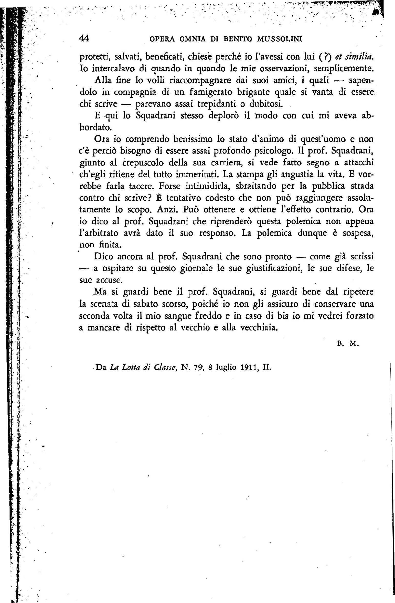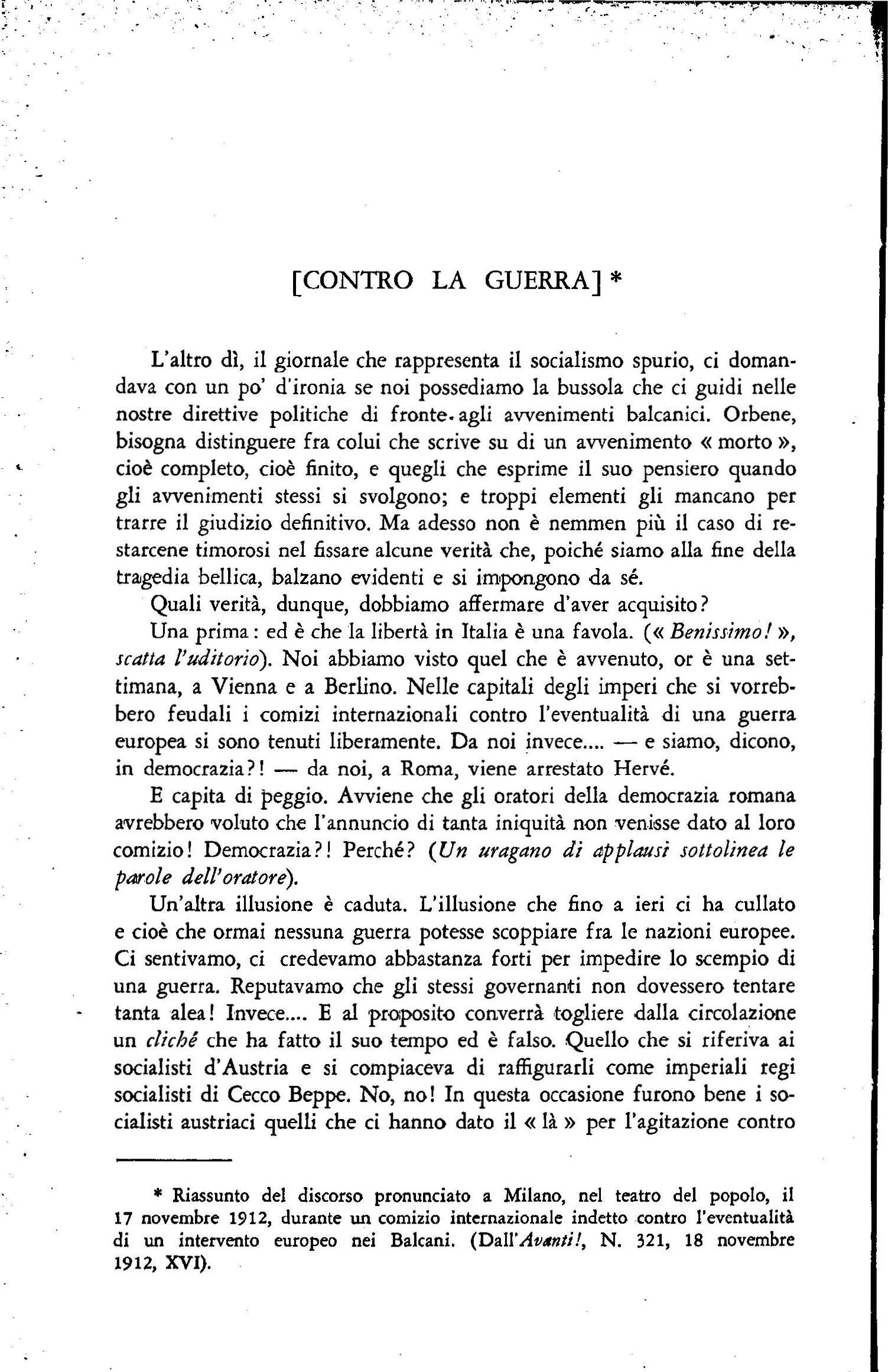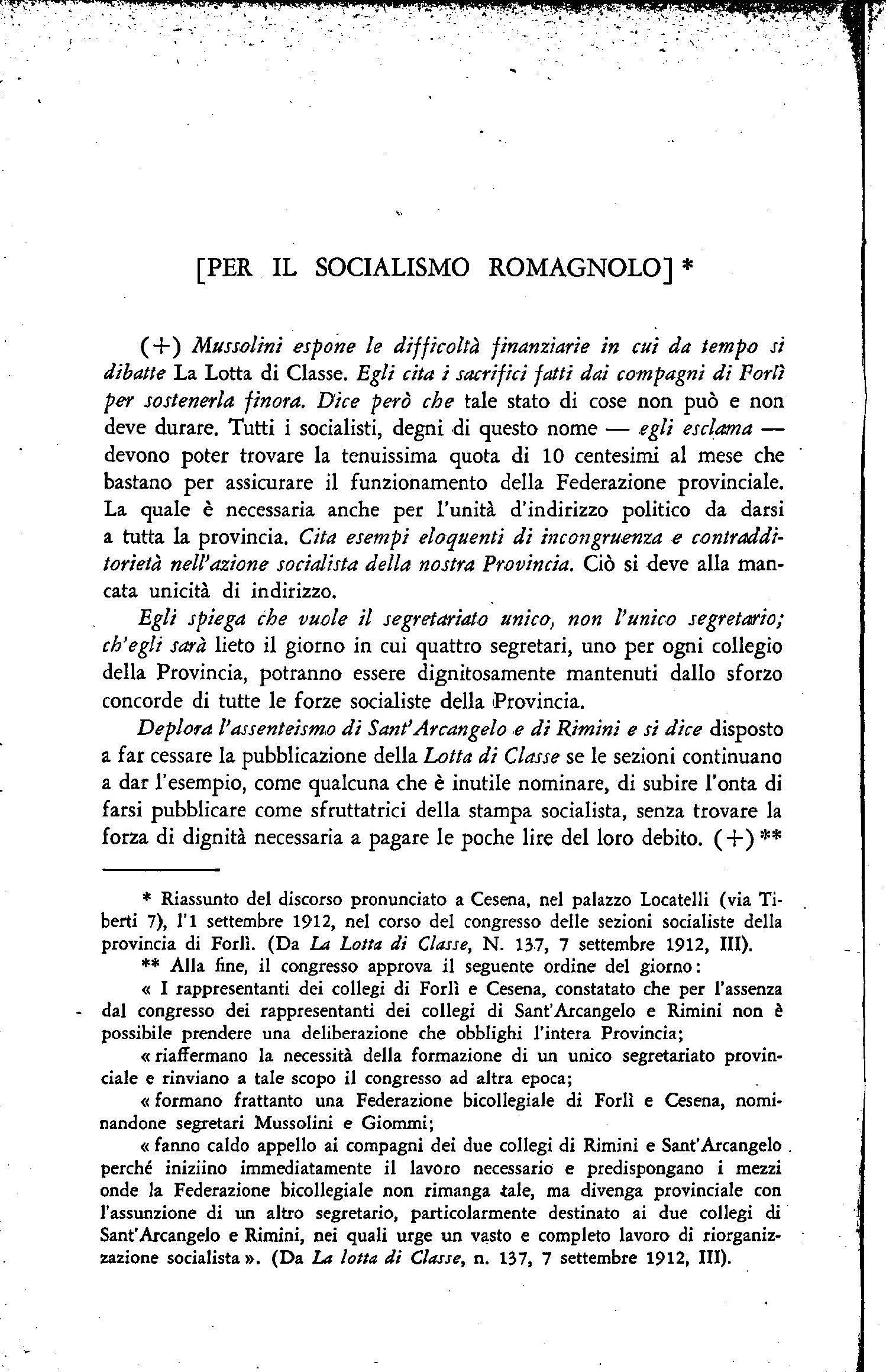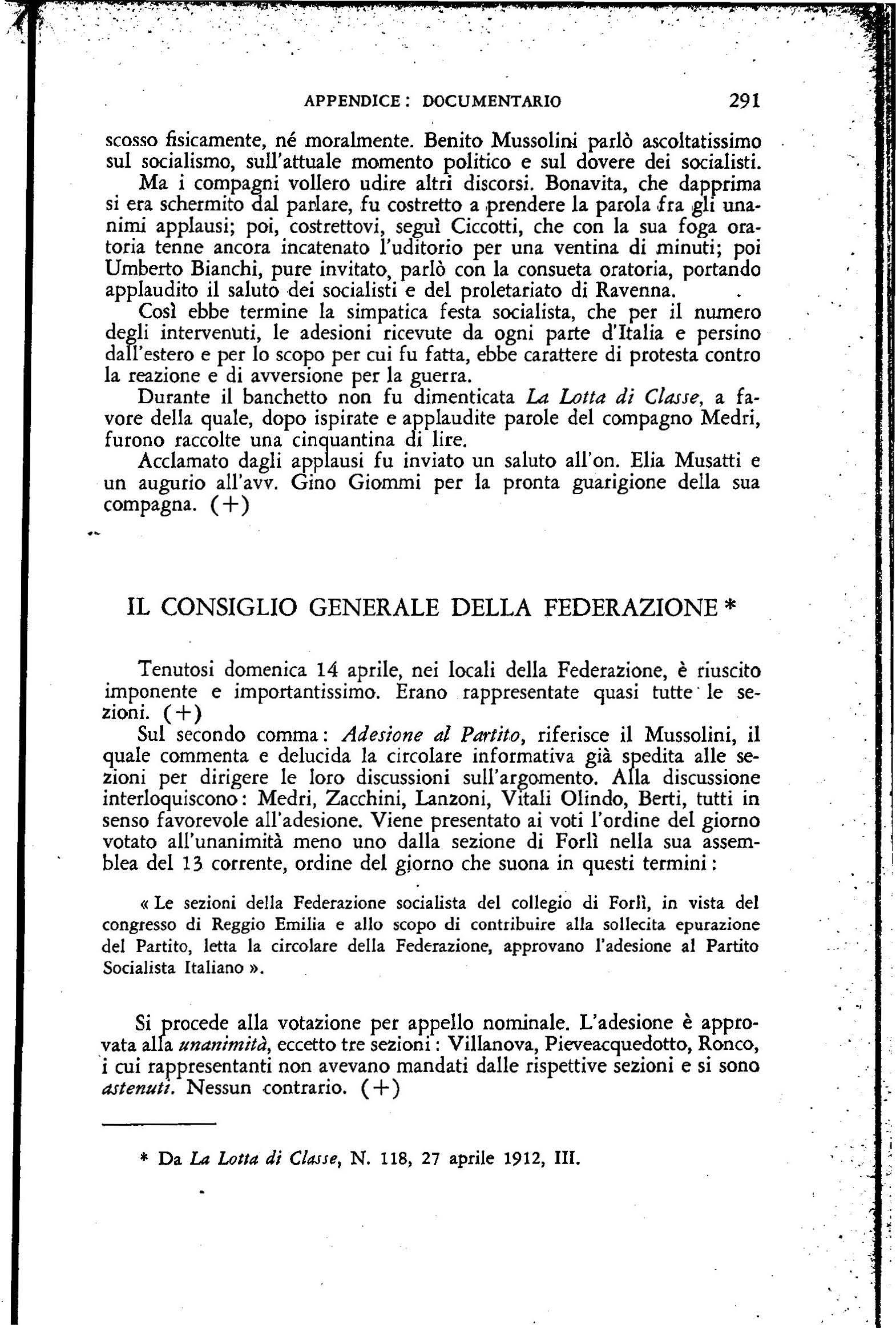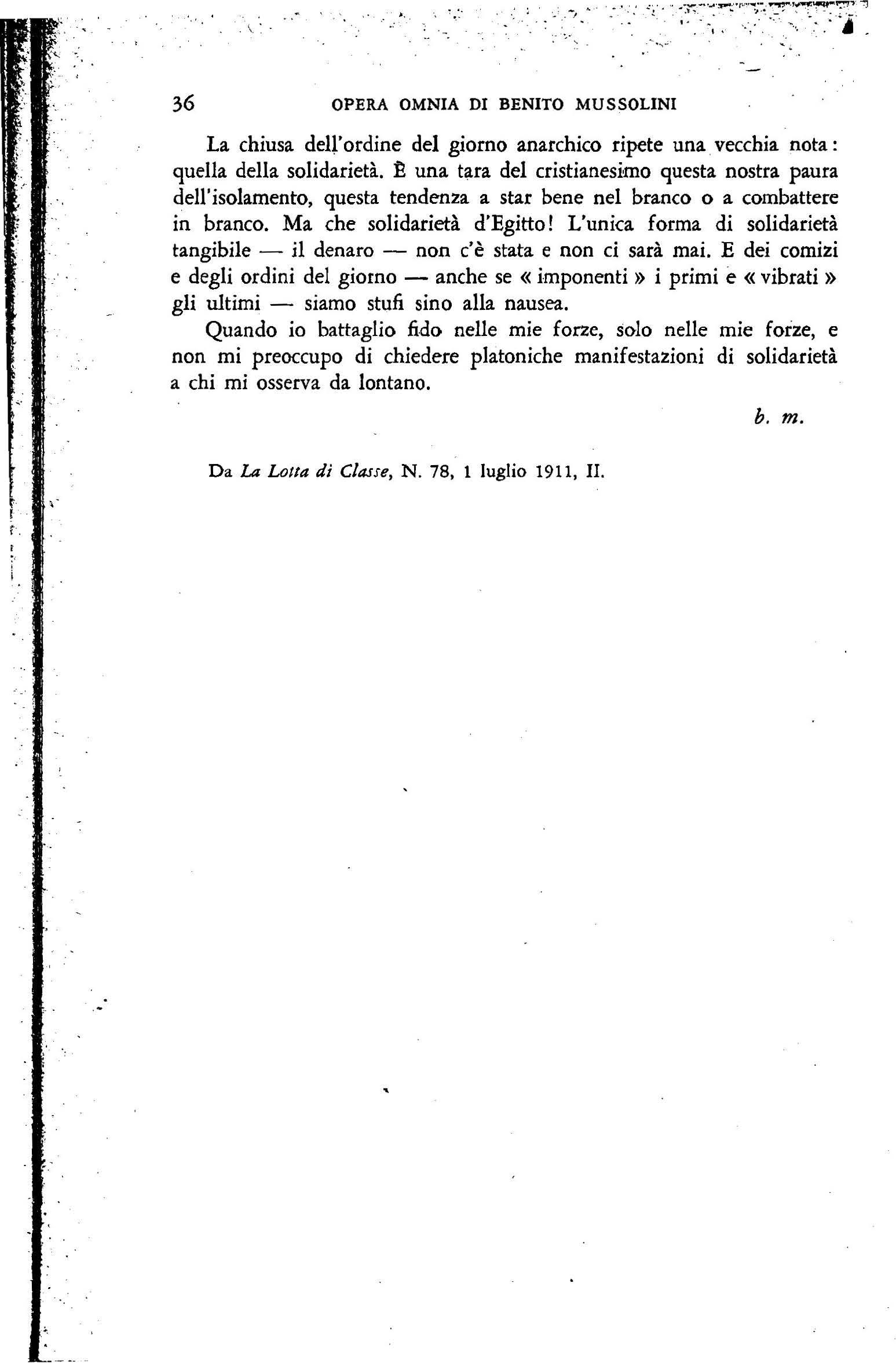 Dal 7 maggio al 23 settembre 19 11 , Mussolini si occupa del rilievo esagen.to d ato dalla. stampa agli incidenti di Vjllafranca del 30 aprile (Ili, 2'51; '5) ; difende L; Lcrt4 di ClaJJt da.ll'accusa di essere stata esclusivamente antirepubb licana (7); esamina l'argomento « i socialisti e la mezzadria» (8) e gli ultimi avvenimenti della vita operaia italiana (10); commenta l'arresto del sindacalista McNamara, imputato, tra l'a ltro, di aver Ì,Osto la. dina.mite nella. sede del Tim e1 di Los Angeles nell'ottobre del 1910 {16); rettifica affermazioni de /:A vvenire d'[Jalia che lo riguardano (17, 4 7); attacca il parlamento (18); redige La federazÙJr, e 10rialista nel collegio di For/J. Noir e noJizi , ( 19 ), Il s11hid11- p,r f4me Elog;o funebre (49) e MeJJaggio di p,ue (:i2); dN.ica quattro articoli al d issidio tra i ma~ tri forl ives.i (23, 28, 37, 43) e uno al convegno degli anarchici romagnoliemiliani tenutosi a Faema verso la fin e di giug no (3'5); rievoca Alesundro Balducci (7 febbraio 18'57-30 giugno 1904), « maesuo e duce dei socia listi forlivesi» (33); scrive nella rubrka Noli! I! Len11r1t (39, 4'5); critica la politica di Giolitti e dei deputati socialisti (41); polcmiu:a con i repubblicani sulla figura di Carlo Pisacane ( 48); prutilla una corrispondenza da Cusercoli ('57); pubblica un trafiletto (H) chi: provuca una smentita di Pietro Neruti 06, 60); invia corrispondenze all'Av,1nli.' sulla lotta agraria di Romagna (80-95), sul movimentc.. socia lista nel for li vese (95, 96) e su un conflitto tra repubblicani e socialisti avvenuto a Meldola il 3 settembre (97) ; prosegue nella propaganda o ra toria (13, 265-266); i l 23 settembre pubblica un articolo dove afferma che nel· l'eventualità di una nostra occupazione di Tripoli « il proletariato ital iano deve · tenersi pronto a effettuare lo sciopero generale» ('59). (L'8 settembre 19 11 le federazioni socialiste dei collegi di Fori!, Cesena, Rimini e Sant'Arcangelo si ·erano unite in un'unica organi zzazione: la federazione socialista inlercollegiale romagnola con sede a Cesena e con seg retuin politico Francesco Gccotti (277)).