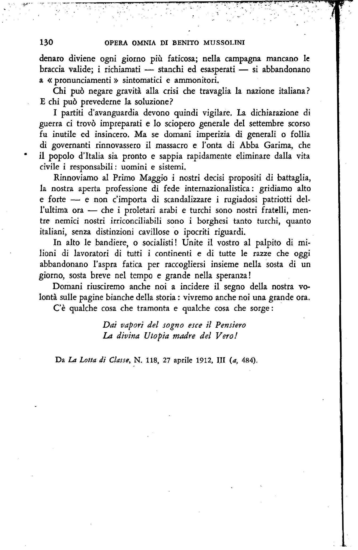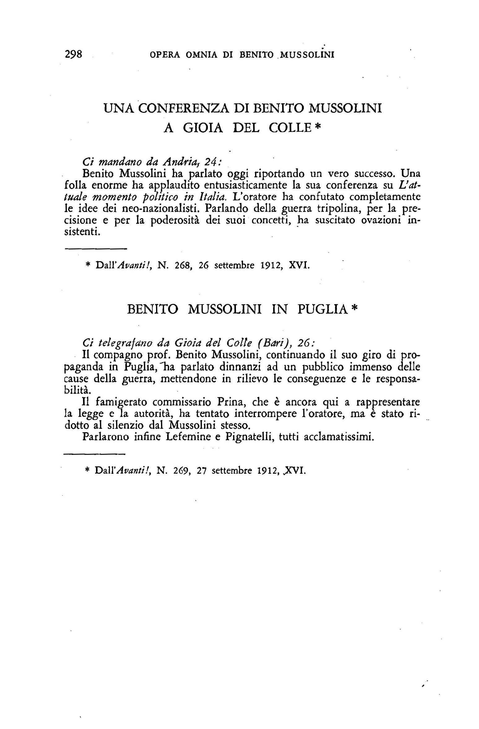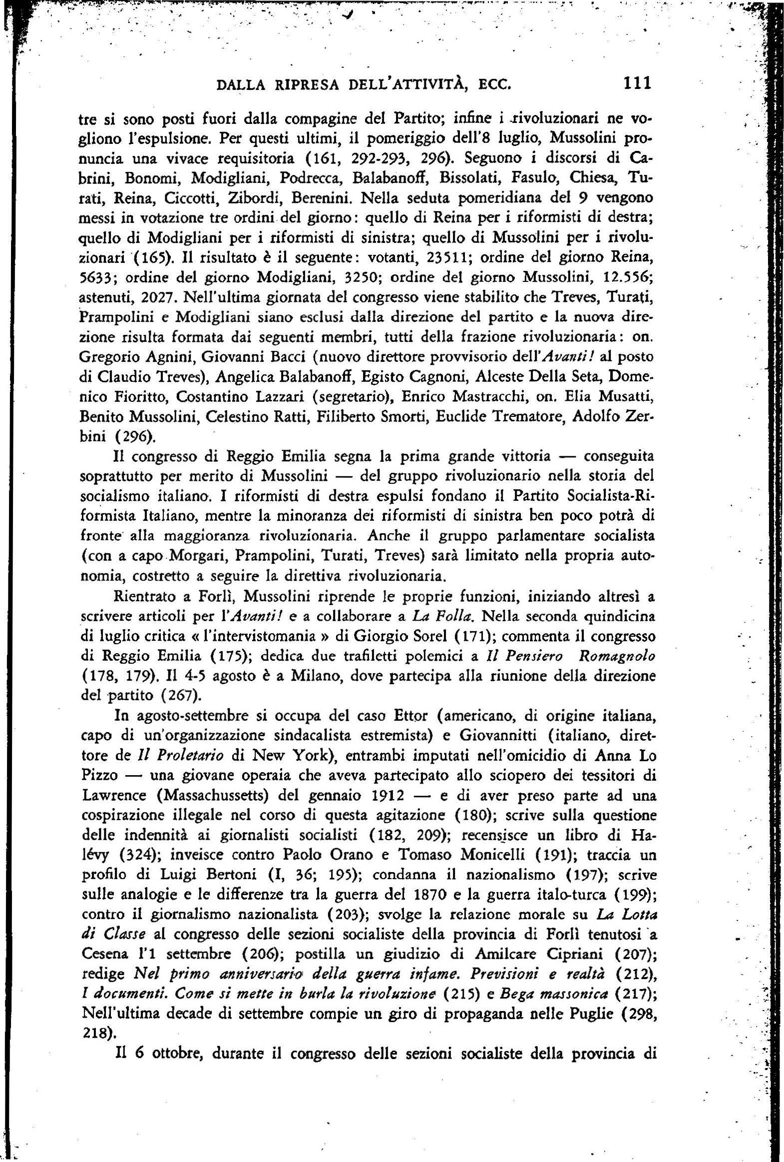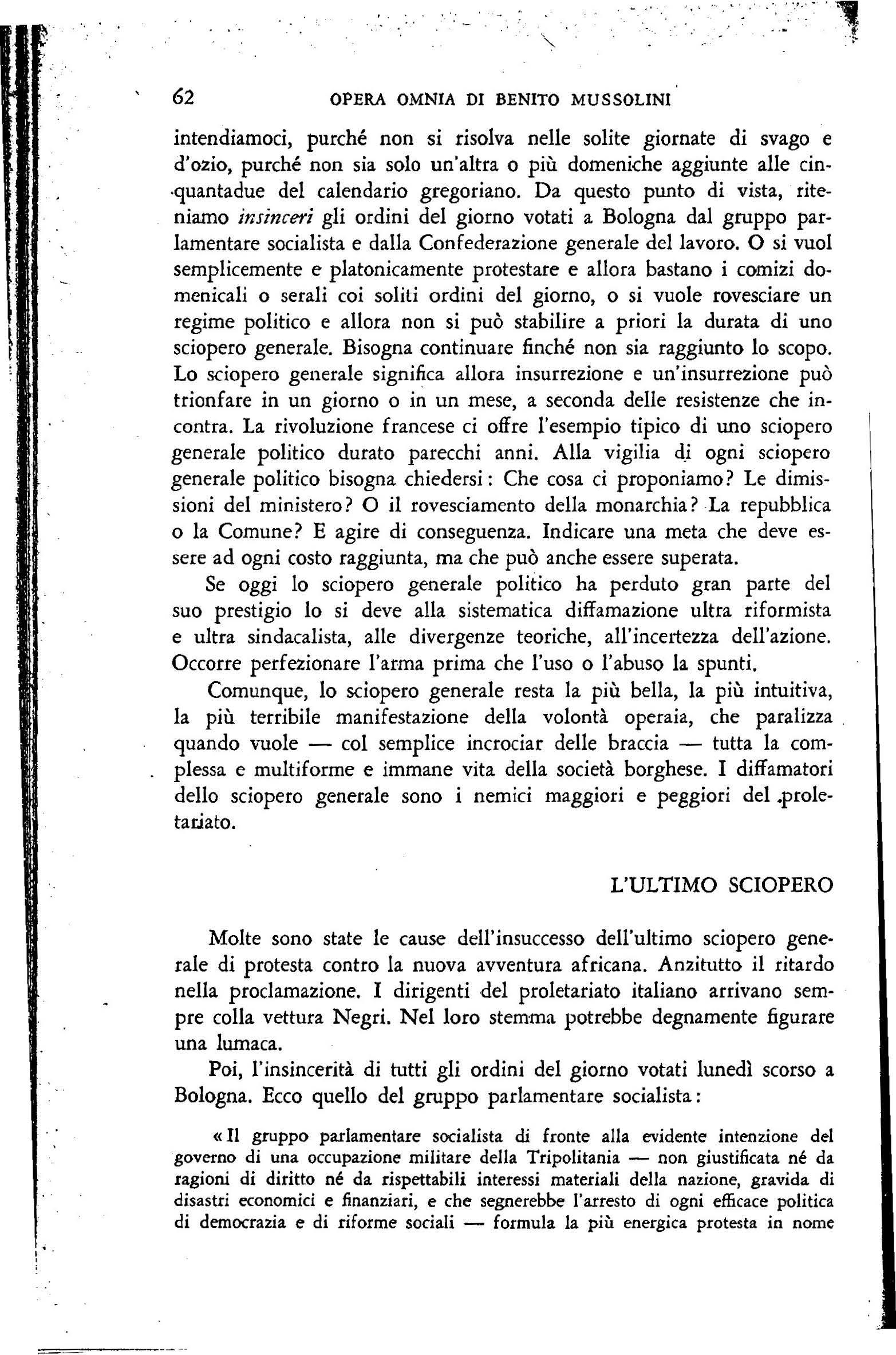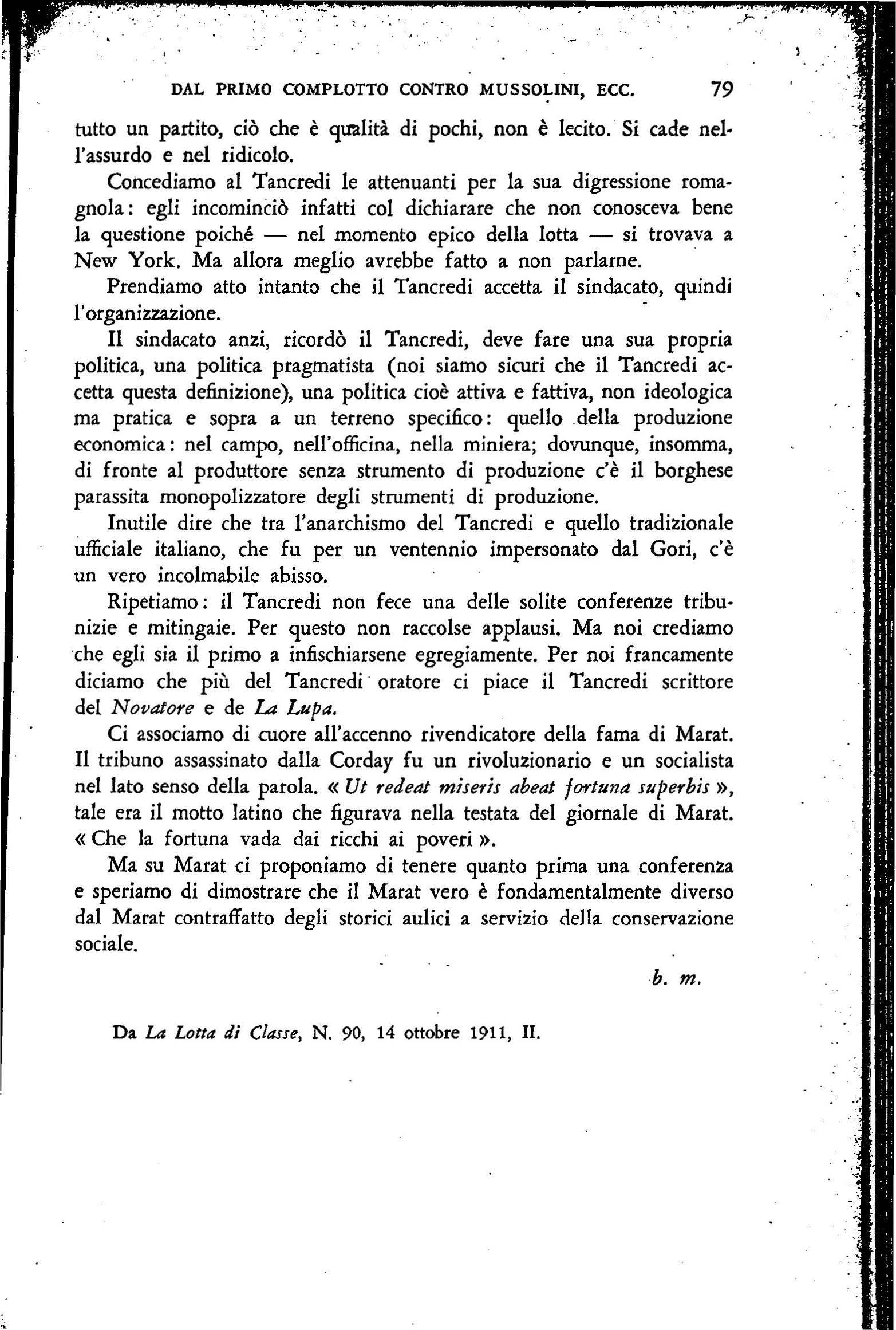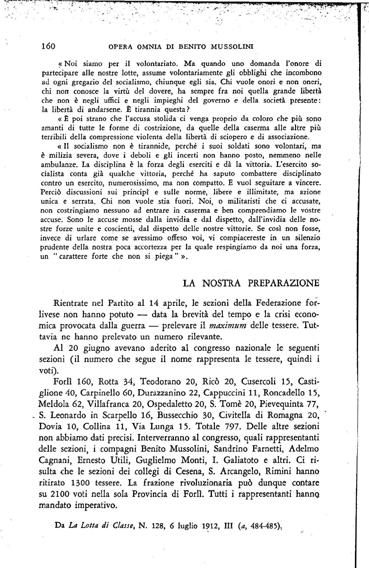 Dal 7 maggio al 23 settembre 19 11 , Mussolini si occupa del rilievo esagen.to d ato dalla. stampa agli incidenti di Vjllafranca del 30 aprile (Ili, 2'51; '5) ; difende L; Lcrt4 di ClaJJt da.ll'accusa di essere stata esclusivamente antirepubb licana (7); esamina l'argomento « i socialisti e la mezzadria» (8) e gli ultimi avvenimenti della vita operaia italiana (10); commenta l'arresto del sindacalista McNamara, imputato, tra l'a ltro, di aver Ì,Osto la. dina.mite nella. sede del Tim e1 di Los Angeles nell'ottobre del 1910 {16); rettifica affermazioni de /:A vvenire d'[Jalia che lo riguardano (17, 4 7); attacca il parlamento (18); redige La federazÙJr, e 10rialista nel collegio di For/J. Noir e noJizi , ( 19 ), Il s11hid11- p,r f4me Elog;o funebre (49) e MeJJaggio di p,ue (:i2); dN.ica quattro articoli al d issidio tra i ma~ tri forl ives.i (23, 28, 37, 43) e uno al convegno degli anarchici romagnoliemiliani tenutosi a Faema verso la fin e di giug no (3'5); rievoca Alesundro Balducci (7 febbraio 18'57-30 giugno 1904), « maesuo e duce dei socia listi forlivesi» (33); scrive nella rubrka Noli! I! Len11r1t (39, 4'5); critica la politica di Giolitti e dei deputati socialisti (41); polcmiu:a con i repubblicani sulla figura di Carlo Pisacane ( 48); prutilla una corrispondenza da Cusercoli ('57); pubblica un trafiletto (H) chi: provuca una smentita di Pietro Neruti 06, 60); invia corrispondenze all'Av,1nli.' sulla lotta agraria di Romagna (80-95), sul movimentc.. socia lista nel for li vese (95, 96) e su un conflitto tra repubblicani e socialisti avvenuto a Meldola il 3 settembre (97) ; prosegue nella propaganda o ra toria (13, 265-266); i l 23 settembre pubblica un articolo dove afferma che nel· l'eventualità di una nostra occupazione di Tripoli « il proletariato ital iano deve · tenersi pronto a effettuare lo sciopero generale» ('59). (L'8 settembre 19 11 le federazioni socialiste dei collegi di Fori!, Cesena, Rimini e Sant'Arcangelo si ·erano unite in un'unica organi zzazione: la federazione socialista inlercollegiale romagnola con sede a Cesena e con seg retuin politico Francesco Gccotti (277)).