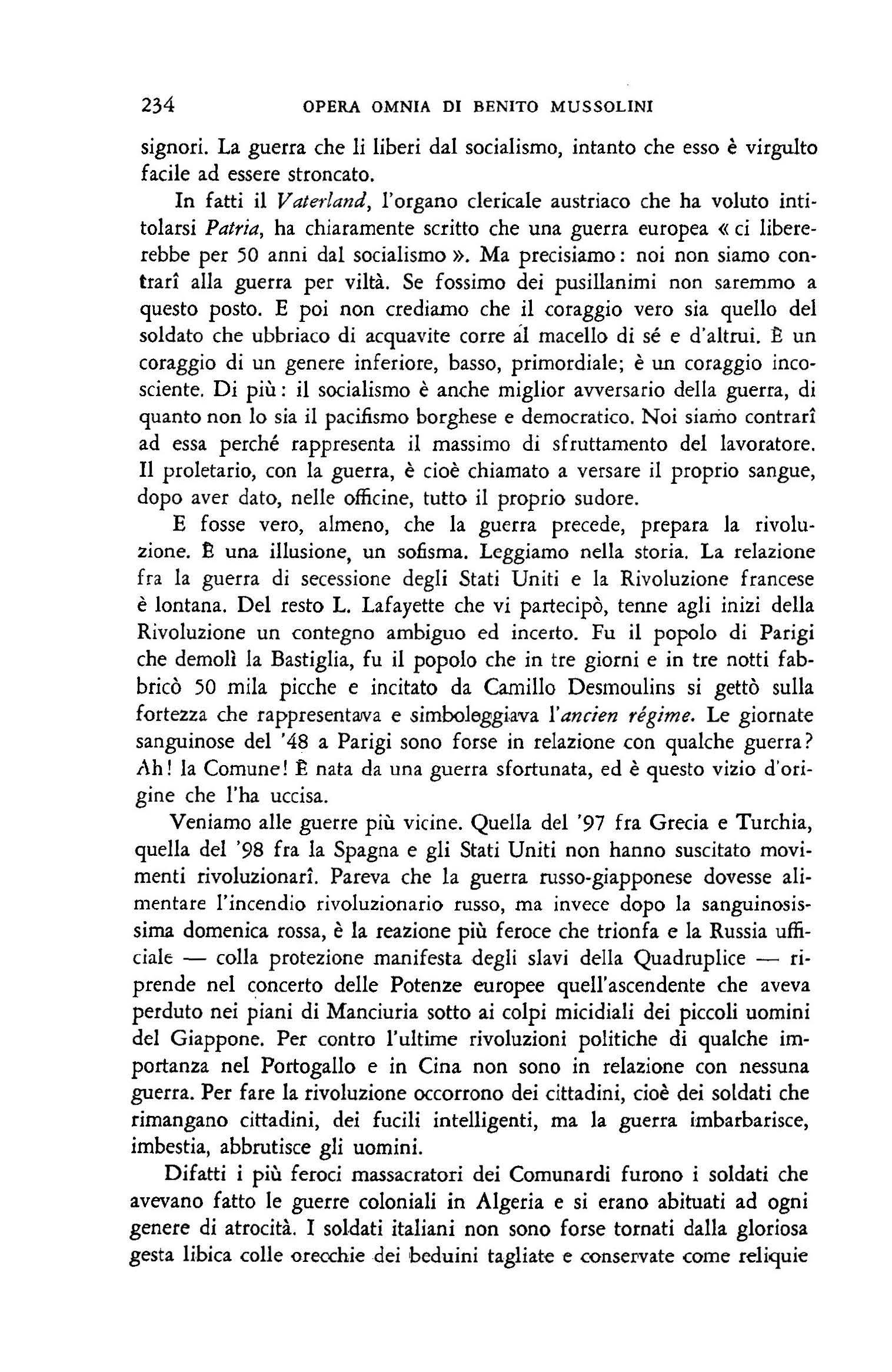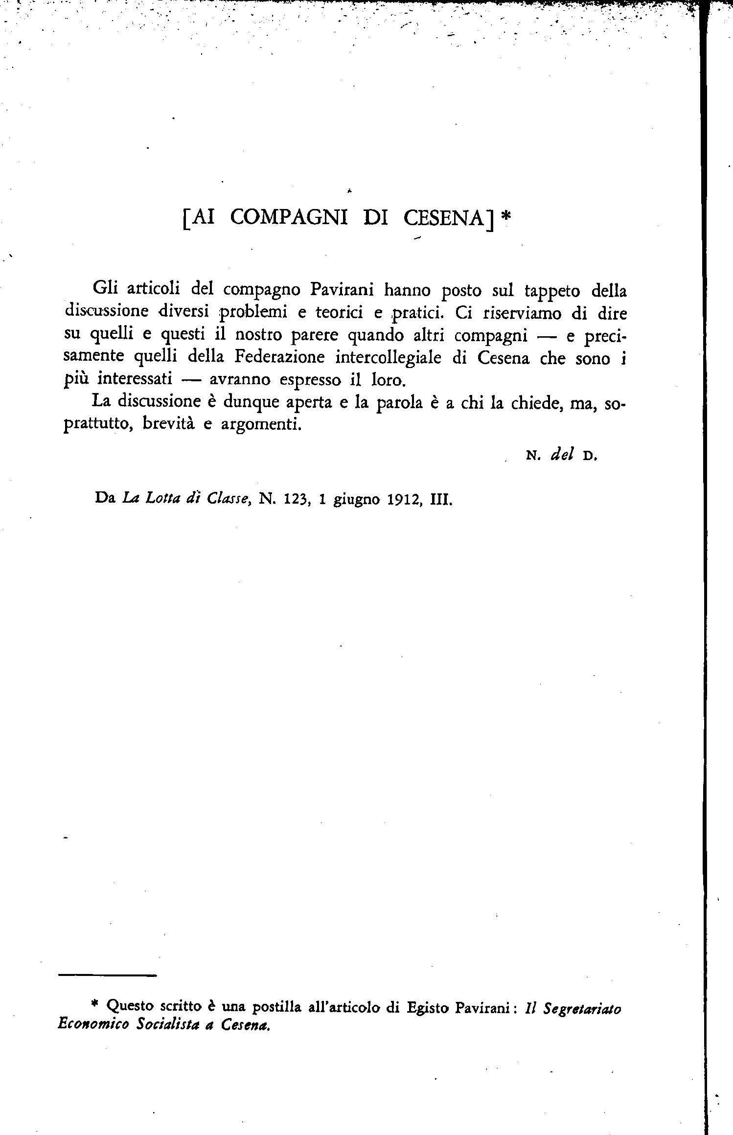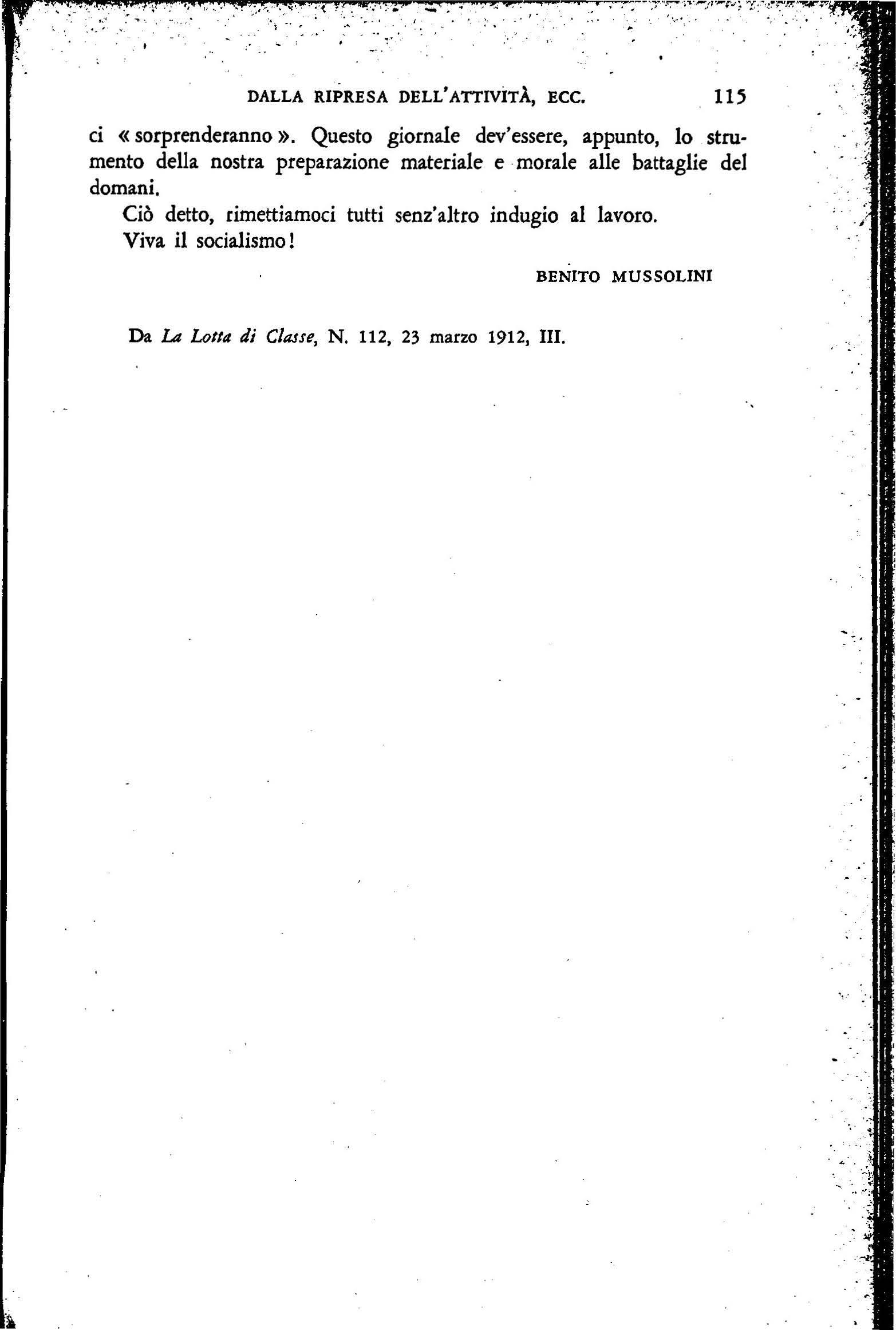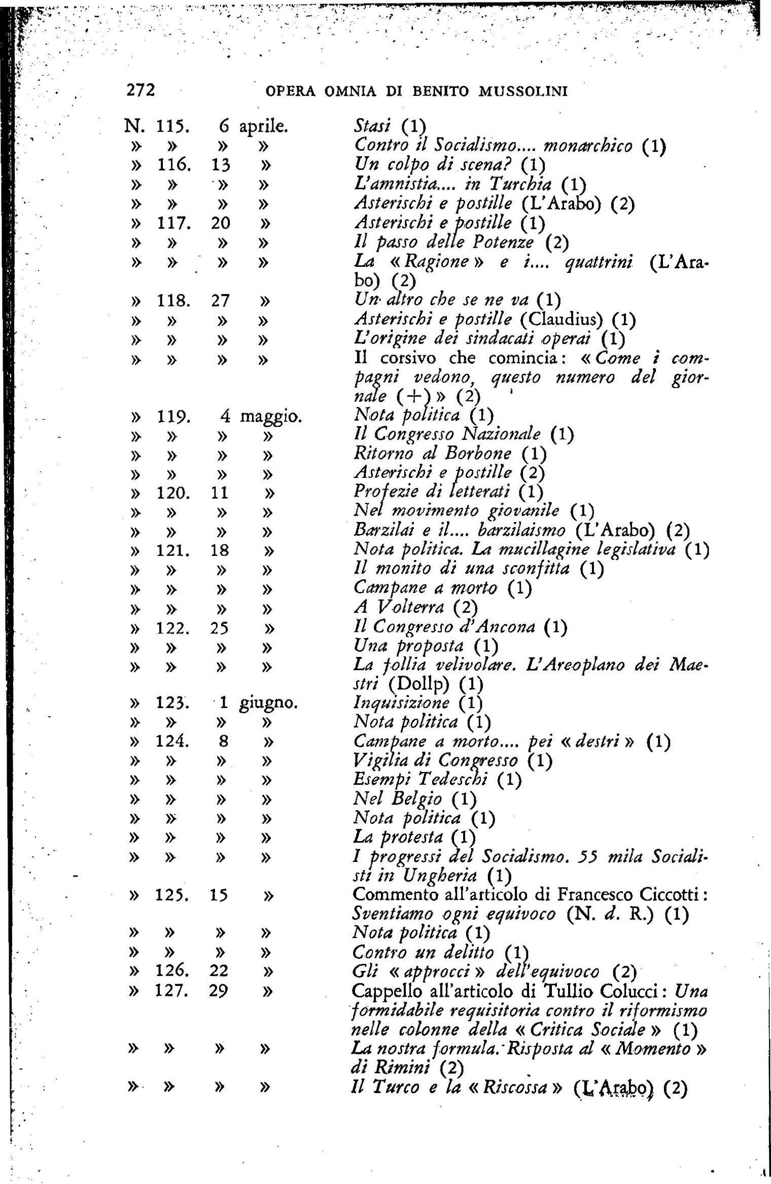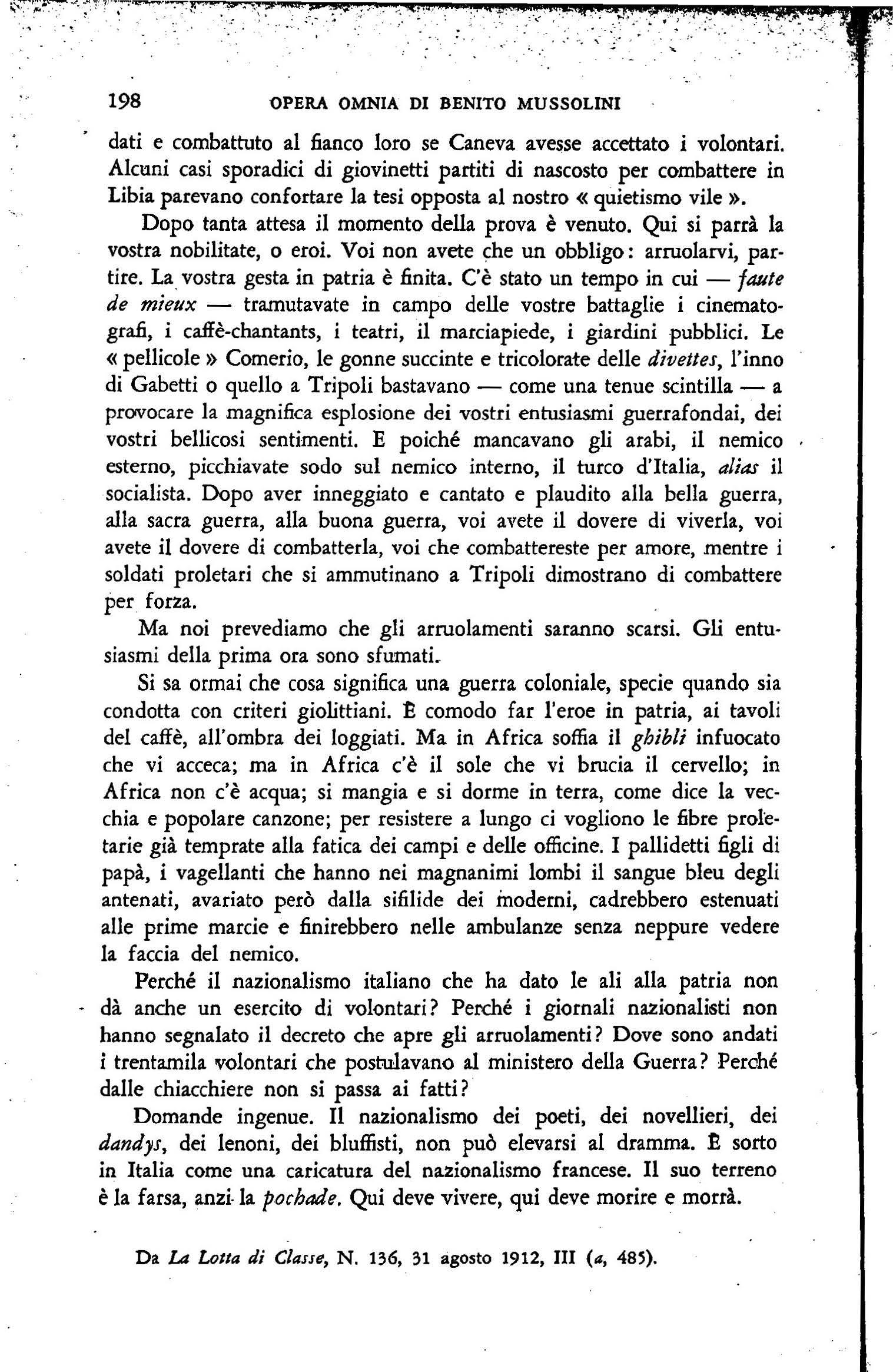 Dal 7 maggio al 23 settembre 19 11 , Mussolini si occupa del rilievo esagen.to d ato dalla. stampa agli incidenti di Vjllafranca del 30 aprile (Ili, 2'51; '5) ; difende L; Lcrt4 di ClaJJt da.ll'accusa di essere stata esclusivamente antirepubb licana (7); esamina l'argomento « i socialisti e la mezzadria» (8) e gli ultimi avvenimenti della vita operaia italiana (10); commenta l'arresto del sindacalista McNamara, imputato, tra l'a ltro, di aver Ì,Osto la. dina.mite nella. sede del Tim e1 di Los Angeles nell'ottobre del 1910 {16); rettifica affermazioni de /:A vvenire d'[Jalia che lo riguardano (17, 4 7); attacca il parlamento (18); redige La federazÙJr, e 10rialista nel collegio di For/J. Noir e noJizi , ( 19 ), Il s11hid11- p,r f4me Elog;o funebre (49) e MeJJaggio di p,ue (:i2); dN.ica quattro articoli al d issidio tra i ma~ tri forl ives.i (23, 28, 37, 43) e uno al convegno degli anarchici romagnoliemiliani tenutosi a Faema verso la fin e di giug no (3'5); rievoca Alesundro Balducci (7 febbraio 18'57-30 giugno 1904), « maesuo e duce dei socia listi forlivesi» (33); scrive nella rubrka Noli! I! Len11r1t (39, 4'5); critica la politica di Giolitti e dei deputati socialisti (41); polcmiu:a con i repubblicani sulla figura di Carlo Pisacane ( 48); prutilla una corrispondenza da Cusercoli ('57); pubblica un trafiletto (H) chi: provuca una smentita di Pietro Neruti 06, 60); invia corrispondenze all'Av,1nli.' sulla lotta agraria di Romagna (80-95), sul movimentc.. socia lista nel for li vese (95, 96) e su un conflitto tra repubblicani e socialisti avvenuto a Meldola il 3 settembre (97) ; prosegue nella propaganda o ra toria (13, 265-266); i l 23 settembre pubblica un articolo dove afferma che nel· l'eventualità di una nostra occupazione di Tripoli « il proletariato ital iano deve · tenersi pronto a effettuare lo sciopero generale» ('59). (L'8 settembre 19 11 le federazioni socialiste dei collegi di Fori!, Cesena, Rimini e Sant'Arcangelo si ·erano unite in un'unica organi zzazione: la federazione socialista inlercollegiale romagnola con sede a Cesena e con seg retuin politico Francesco Gccotti (277)).