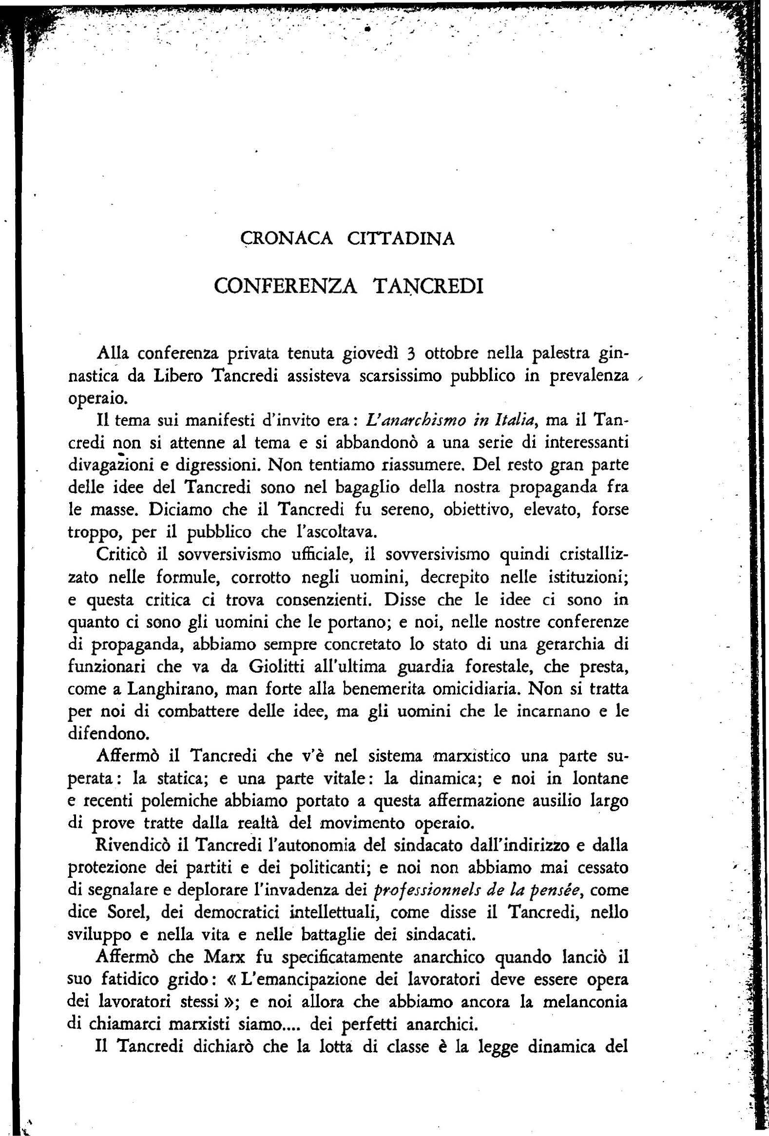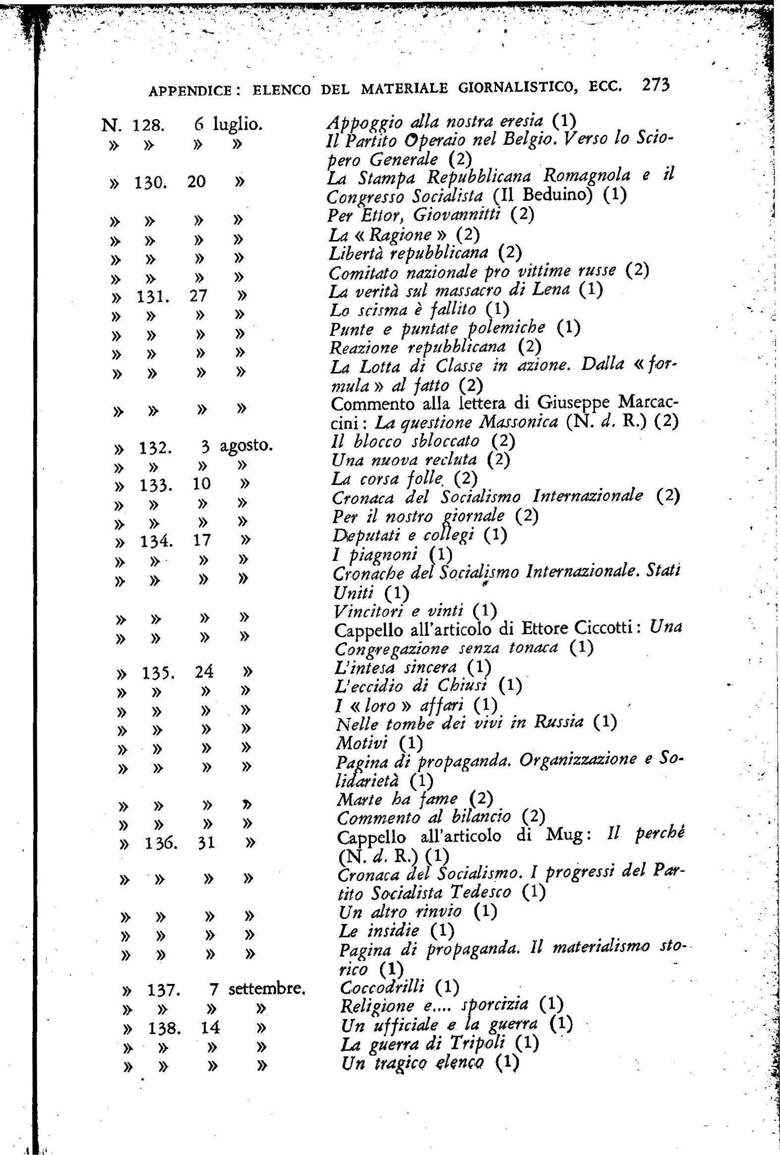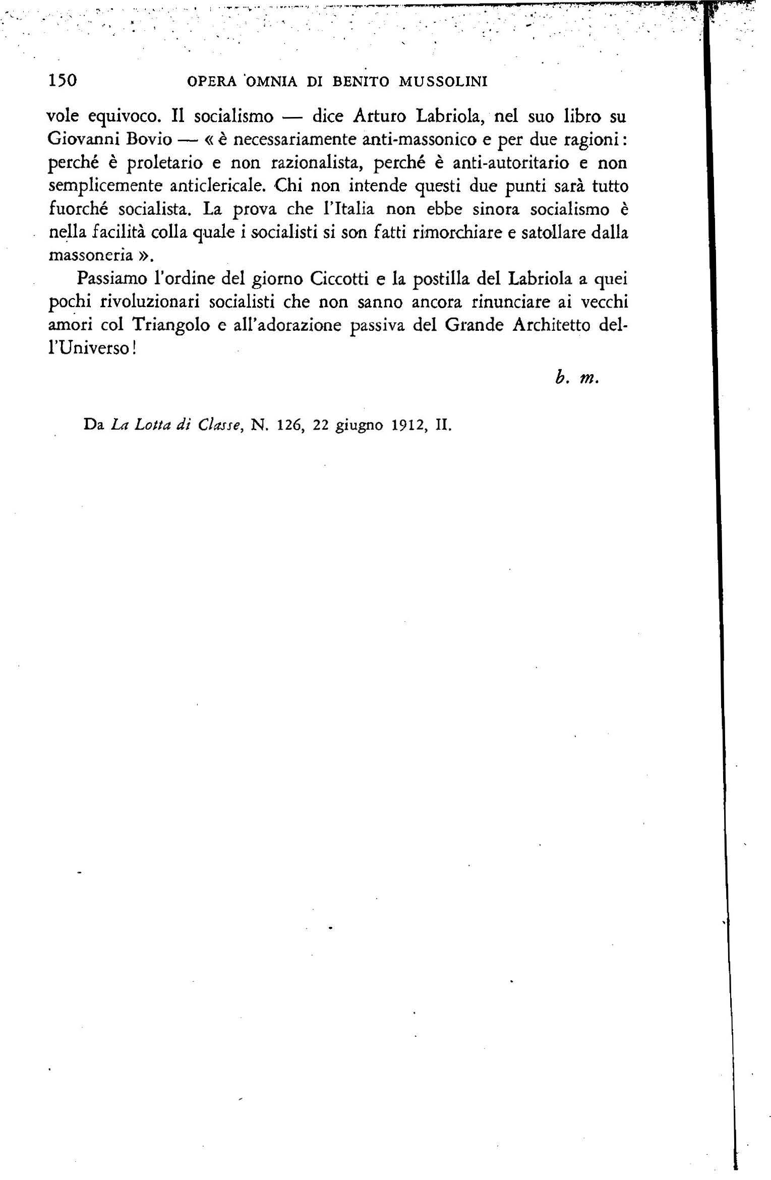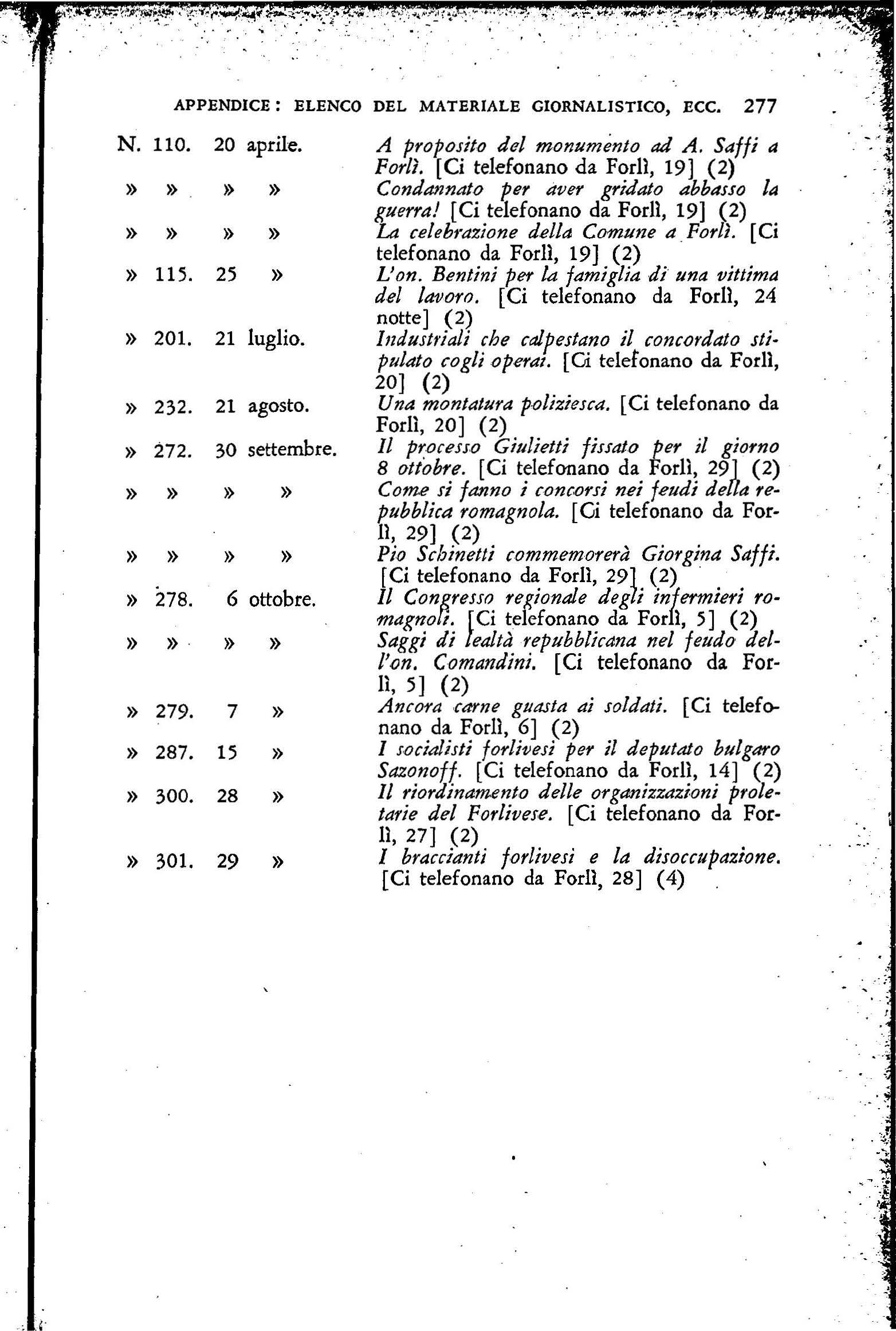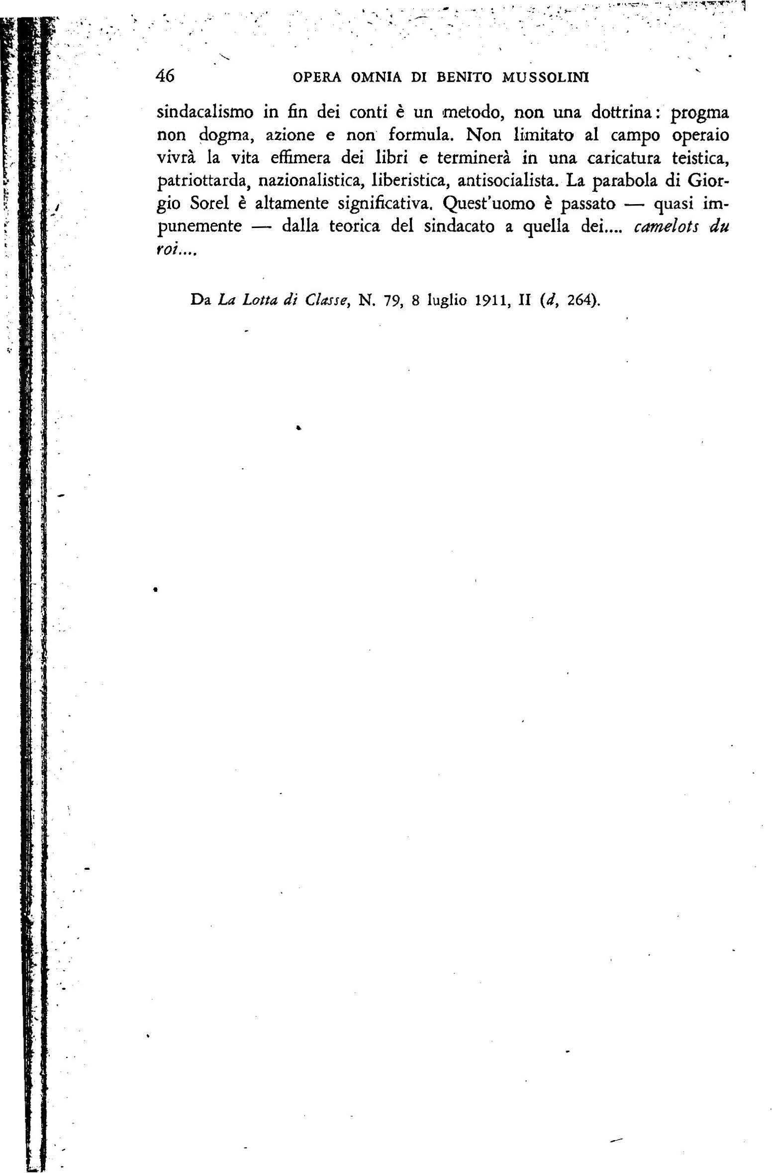 Dal 7 maggio al 23 settembre 19 11 , Mussolini si occupa del rilievo esagen.to d ato dalla. stampa agli incidenti di Vjllafranca del 30 aprile (Ili, 2'51; '5) ; difende L; Lcrt4 di ClaJJt da.ll'accusa di essere stata esclusivamente antirepubb licana (7); esamina l'argomento « i socialisti e la mezzadria» (8) e gli ultimi avvenimenti della vita operaia italiana (10); commenta l'arresto del sindacalista McNamara, imputato, tra l'a ltro, di aver Ì,Osto la. dina.mite nella. sede del Tim e1 di Los Angeles nell'ottobre del 1910 {16); rettifica affermazioni de /:A vvenire d'[Jalia che lo riguardano (17, 4 7); attacca il parlamento (18); redige La federazÙJr, e 10rialista nel collegio di For/J. Noir e noJizi , ( 19 ), Il s11hid11- p,r f4me Elog;o funebre (49) e MeJJaggio di p,ue (:i2); dN.ica quattro articoli al d issidio tra i ma~ tri forl ives.i (23, 28, 37, 43) e uno al convegno degli anarchici romagnoliemiliani tenutosi a Faema verso la fin e di giug no (3'5); rievoca Alesundro Balducci (7 febbraio 18'57-30 giugno 1904), « maesuo e duce dei socia listi forlivesi» (33); scrive nella rubrka Noli! I! Len11r1t (39, 4'5); critica la politica di Giolitti e dei deputati socialisti (41); polcmiu:a con i repubblicani sulla figura di Carlo Pisacane ( 48); prutilla una corrispondenza da Cusercoli ('57); pubblica un trafiletto (H) chi: provuca una smentita di Pietro Neruti 06, 60); invia corrispondenze all'Av,1nli.' sulla lotta agraria di Romagna (80-95), sul movimentc.. socia lista nel for li vese (95, 96) e su un conflitto tra repubblicani e socialisti avvenuto a Meldola il 3 settembre (97) ; prosegue nella propaganda o ra toria (13, 265-266); i l 23 settembre pubblica un articolo dove afferma che nel· l'eventualità di una nostra occupazione di Tripoli « il proletariato ital iano deve · tenersi pronto a effettuare lo sciopero generale» ('59). (L'8 settembre 19 11 le federazioni socialiste dei collegi di Fori!, Cesena, Rimini e Sant'Arcangelo si ·erano unite in un'unica organi zzazione: la federazione socialista inlercollegiale romagnola con sede a Cesena e con seg retuin politico Francesco Gccotti (277)).
